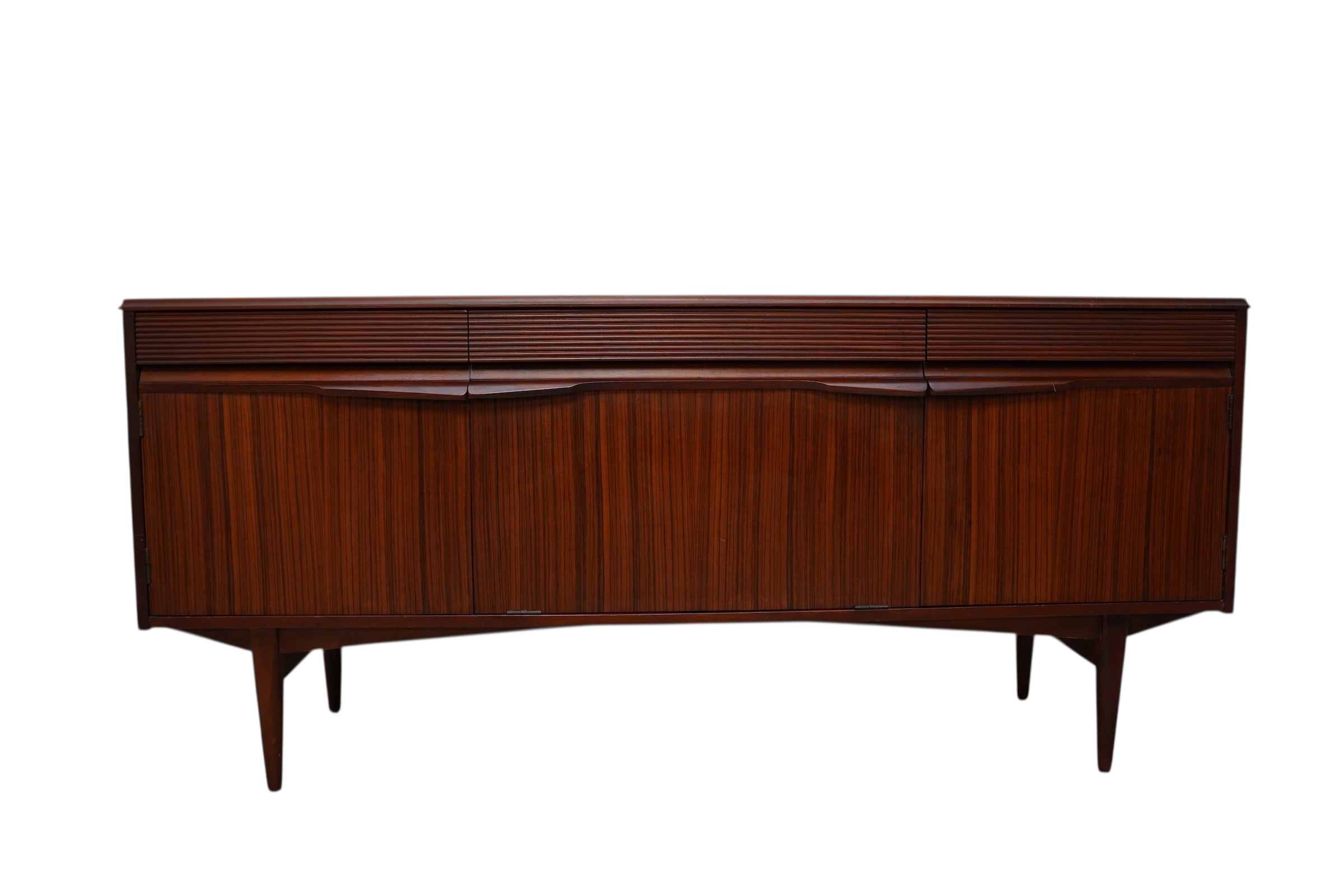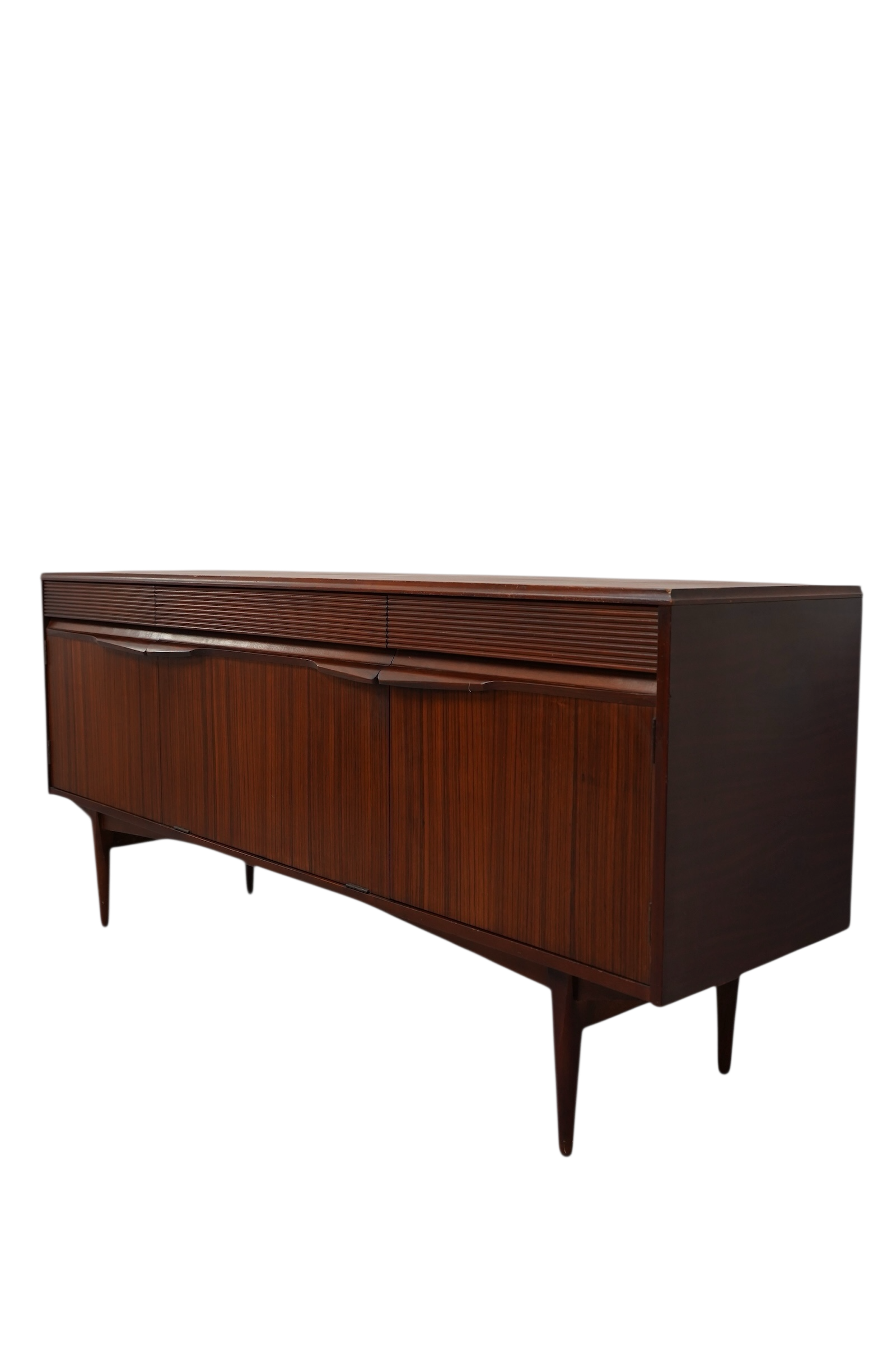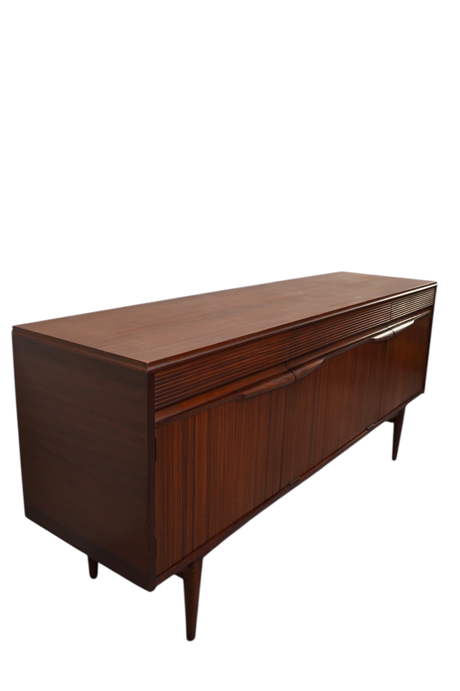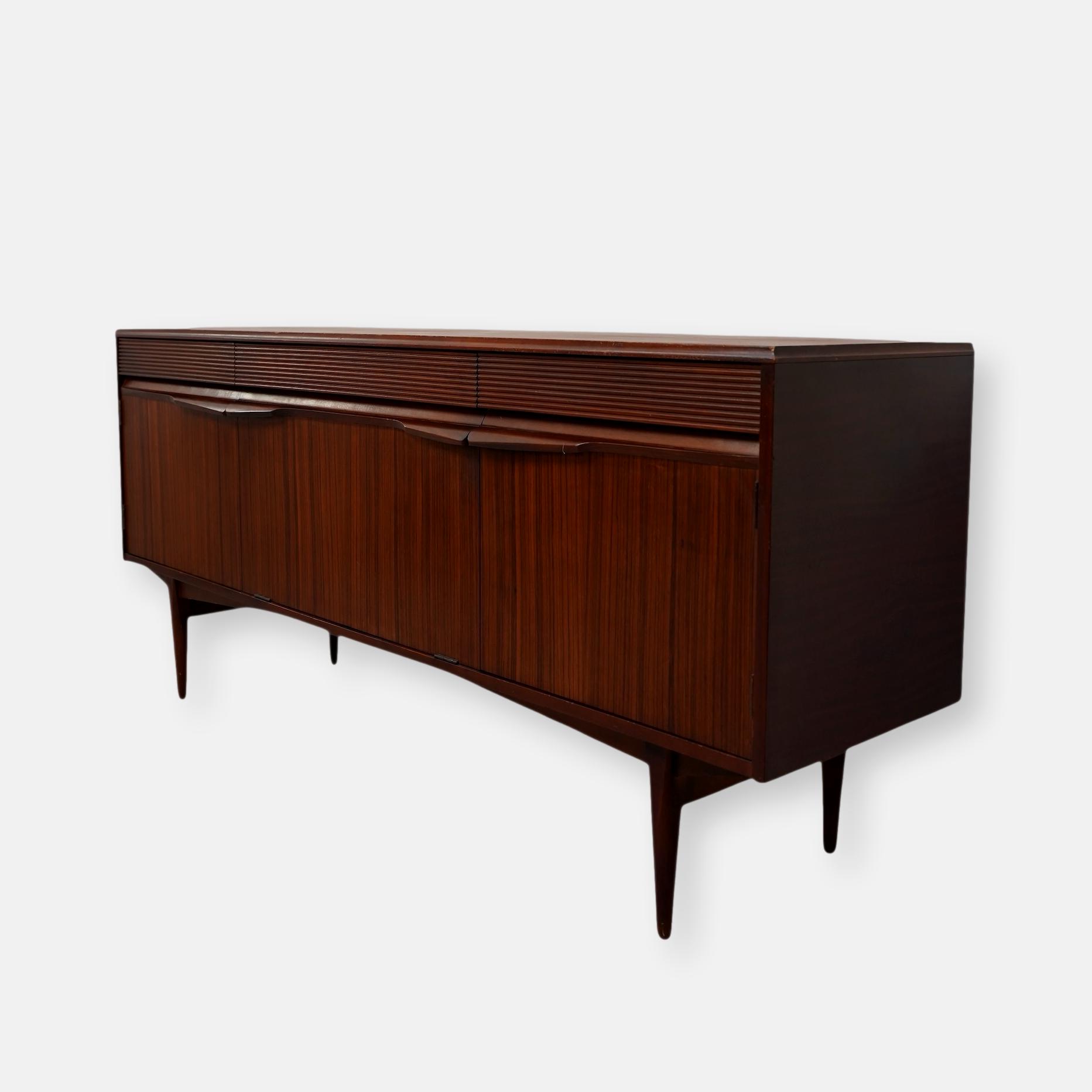 Il s’agit d’une enfilade de style moderne du milieu du siècle, conçue par le fabricant norvégien Elliots of Newbury (EON) vers 1960’s. Ce modèle spécifique se distingue par ses 3 compartiments s’ouvrant chacun par 3 portes habillées de poignets profilées uniques et sculptées en afromosia et de ses tiroirs décorés de section cannelée ou nervurée. Chaque compartiment est munie d’une étagère interne. Ce buffet est conçu en placage de teck de couleur chaude.