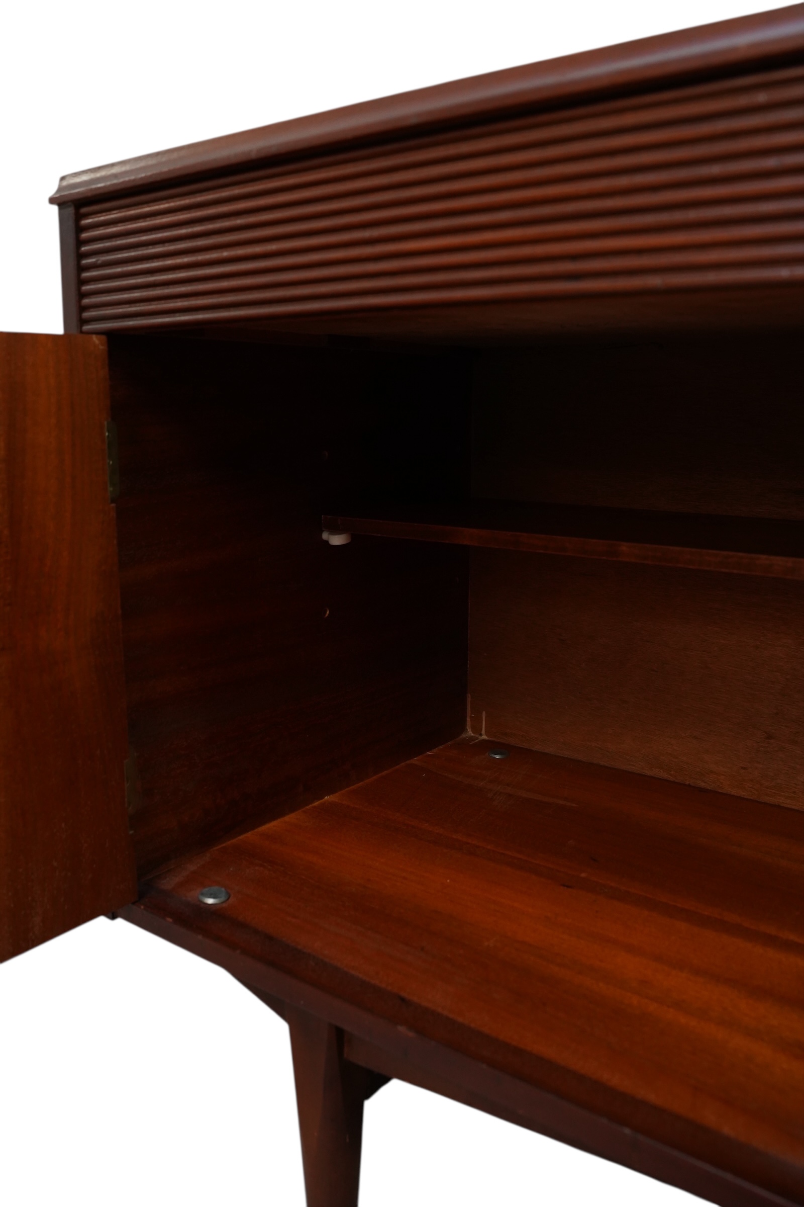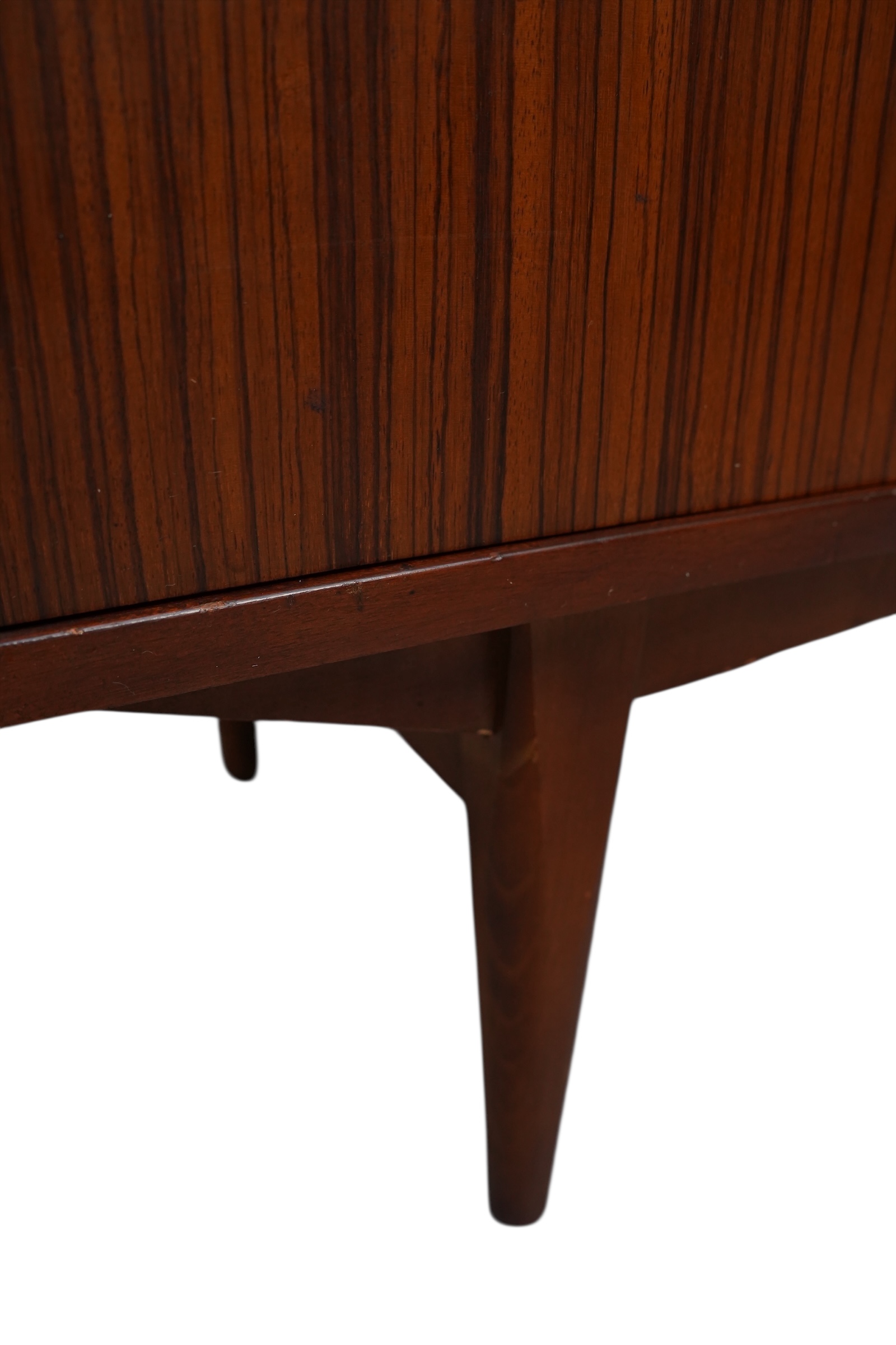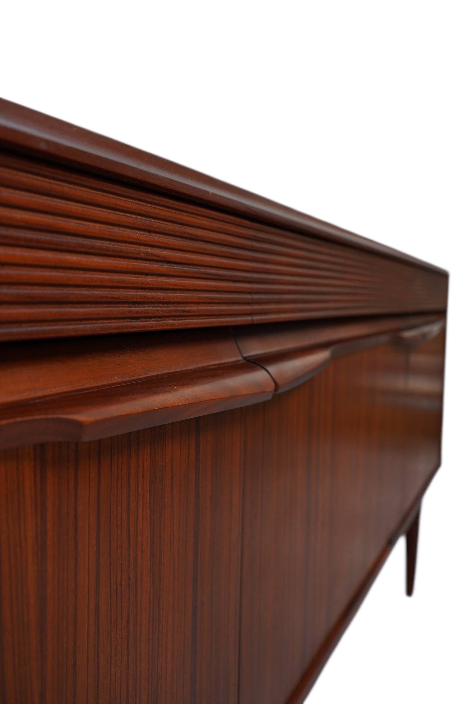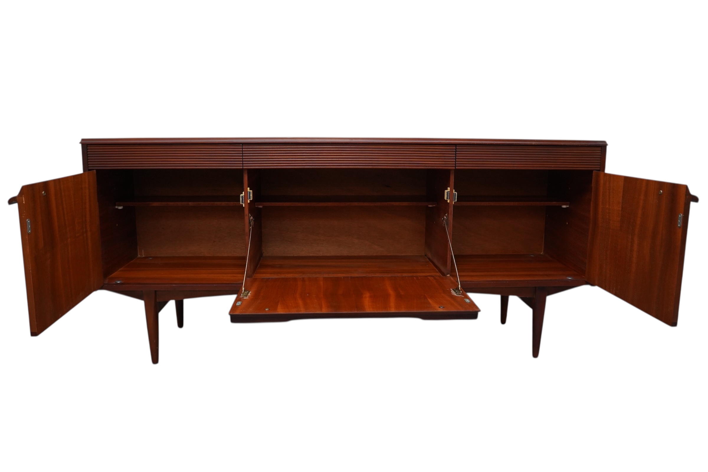 Il s’agit d’une enfilade de style moderne du milieu du siècle, conçue par le fabricant norvégien Elliots of Newbury (EON) vers 1960’s. Ce modèle spécifique se distingue par ses 3 compartiments s’ouvrant chacun par 3 portes habillées de poignets profilées uniques et sculptées en afromosia et de ses tiroirs décorés de section cannelée ou nervurée. Chaque compartiment est munie d’une étagère interne. Ce buffet est conçu en placage de teck de couleur chaude.