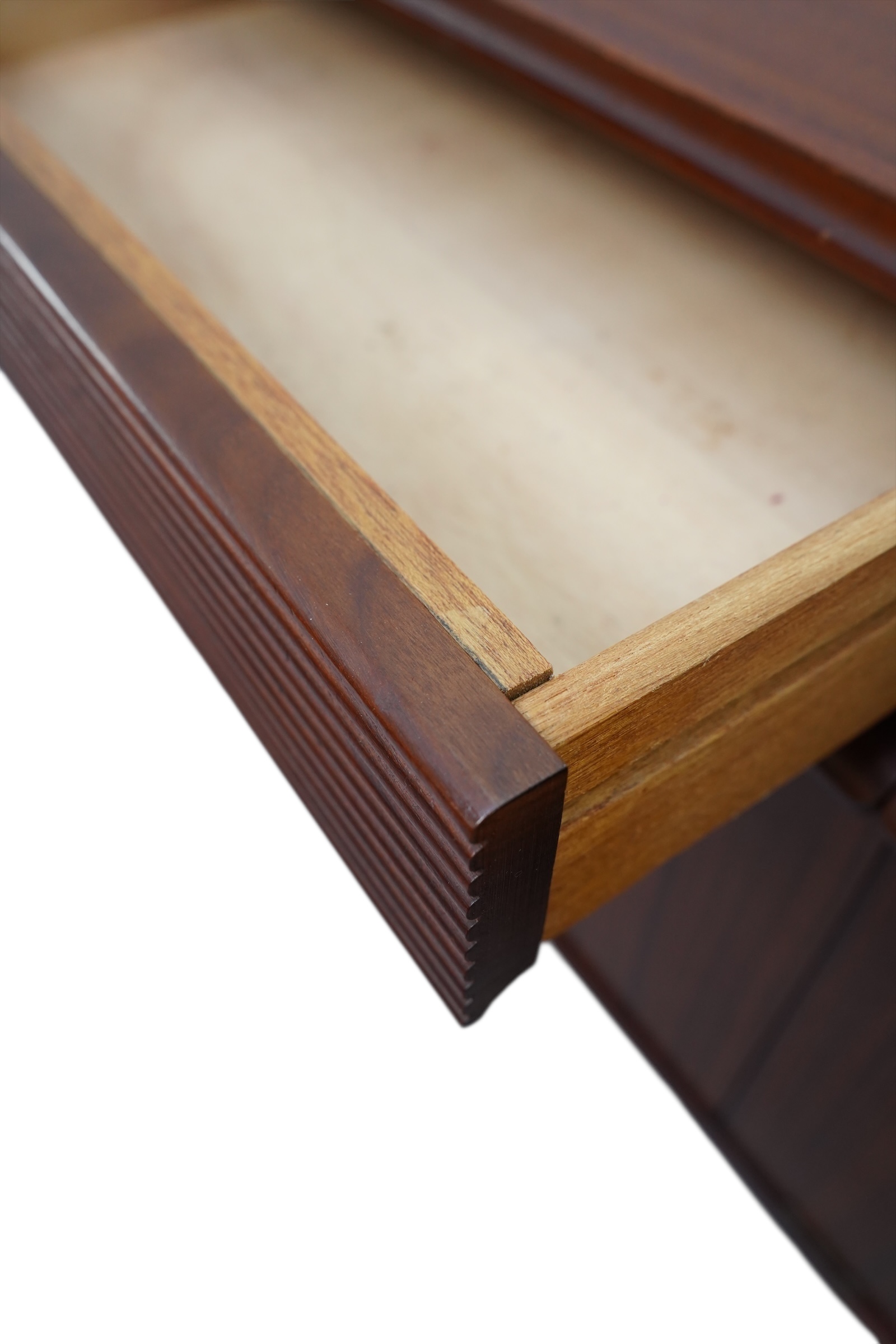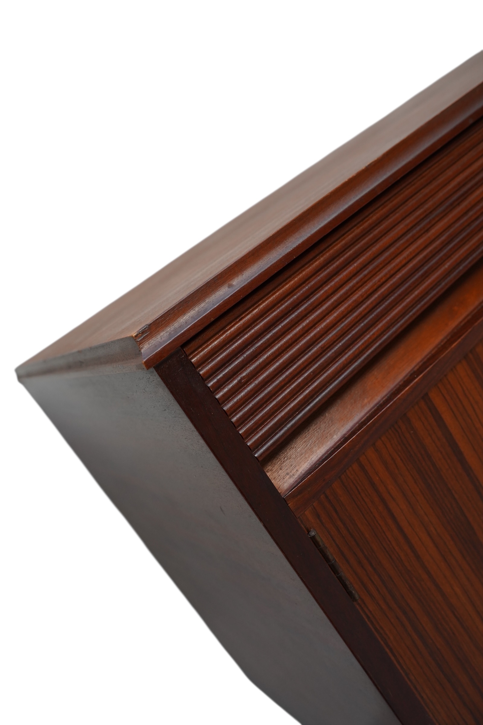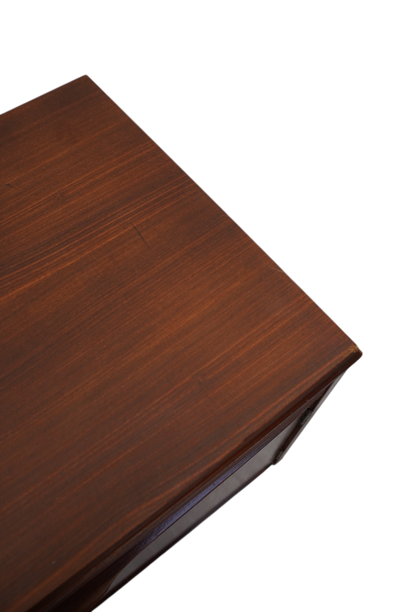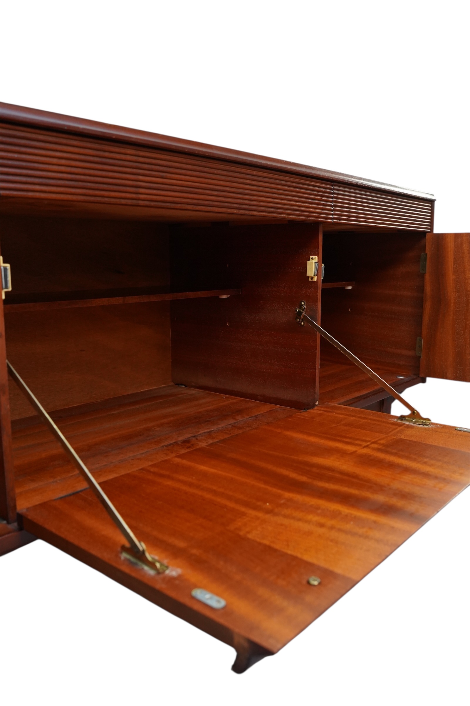 Il s’agit d’une enfilade de style moderne du milieu du siècle, conçue par le fabricant norvégien Elliots of Newbury (EON) vers 1960’s. Ce modèle spécifique se distingue par ses 3 compartiments s’ouvrant chacun par 3 portes habillées de poignets profilées uniques et sculptées en afromosia et de ses tiroirs décorés de section cannelée ou nervurée. Chaque compartiment est munie d’une étagère interne. Ce buffet est conçu en placage de teck de couleur chaude.