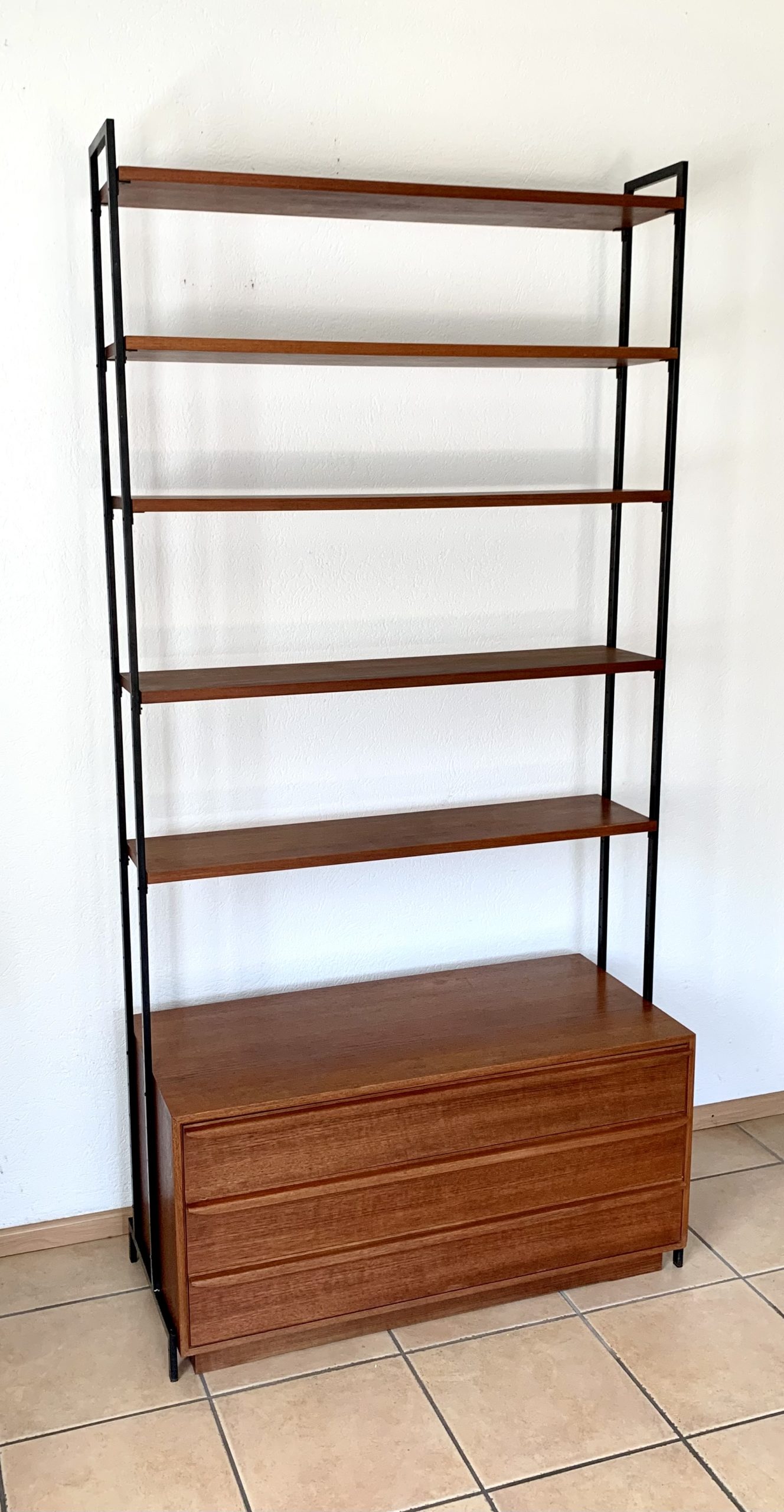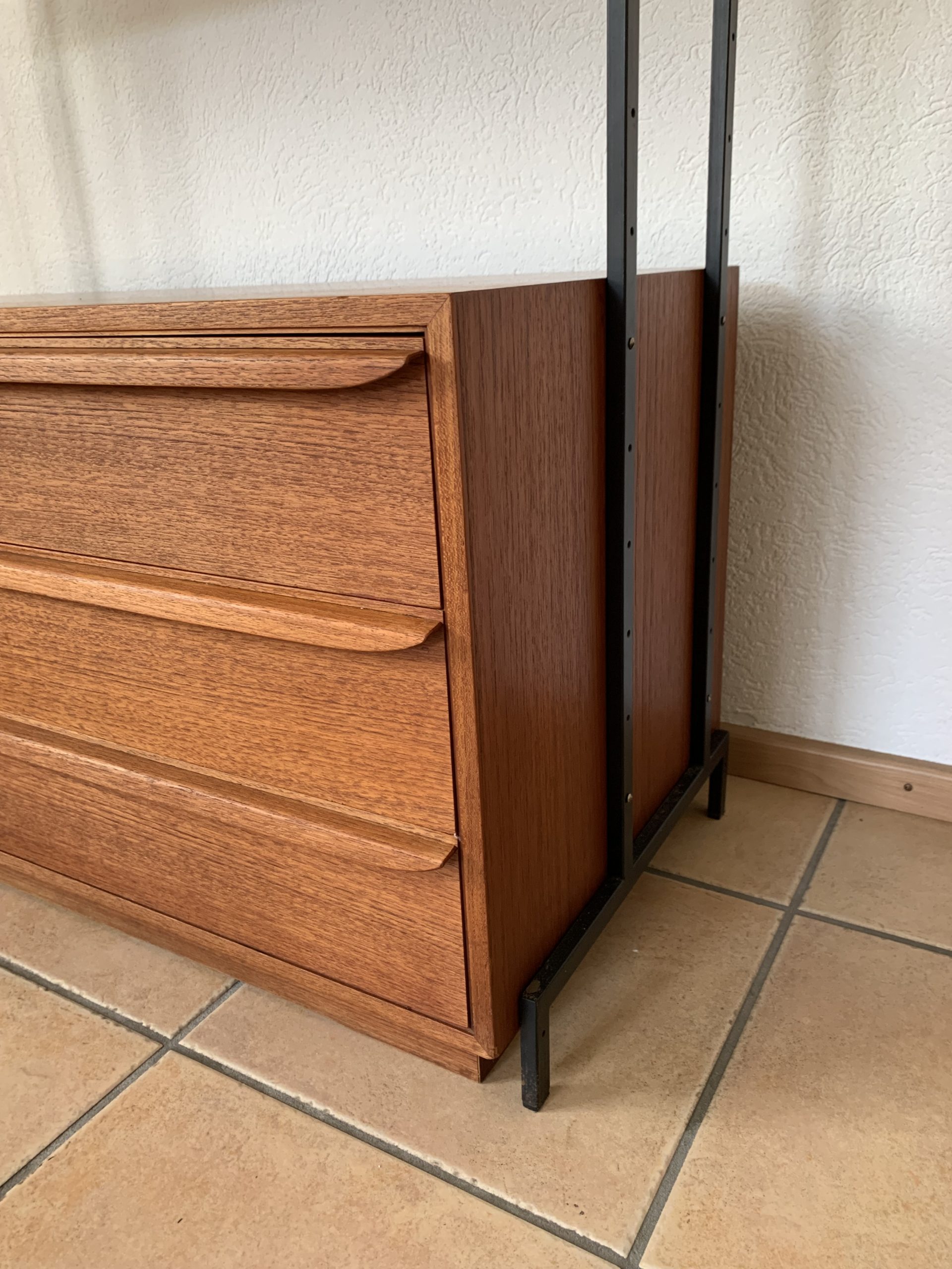 Produit venduÉtagère composée de 5 tablars et d’un caisson bas à trois tiroirs en bois contreplaqué. Le tout est porté par une structure métallique noire.
