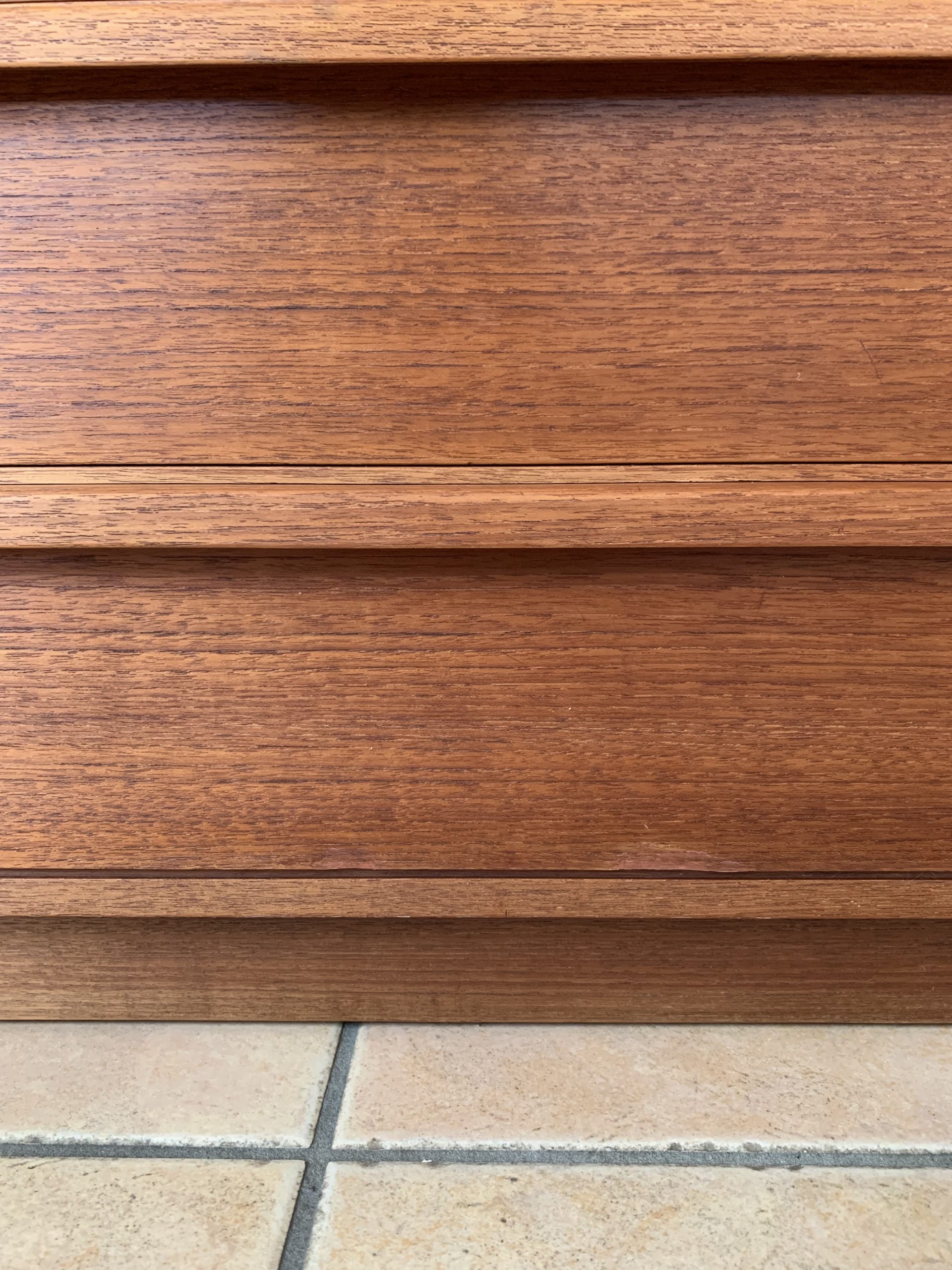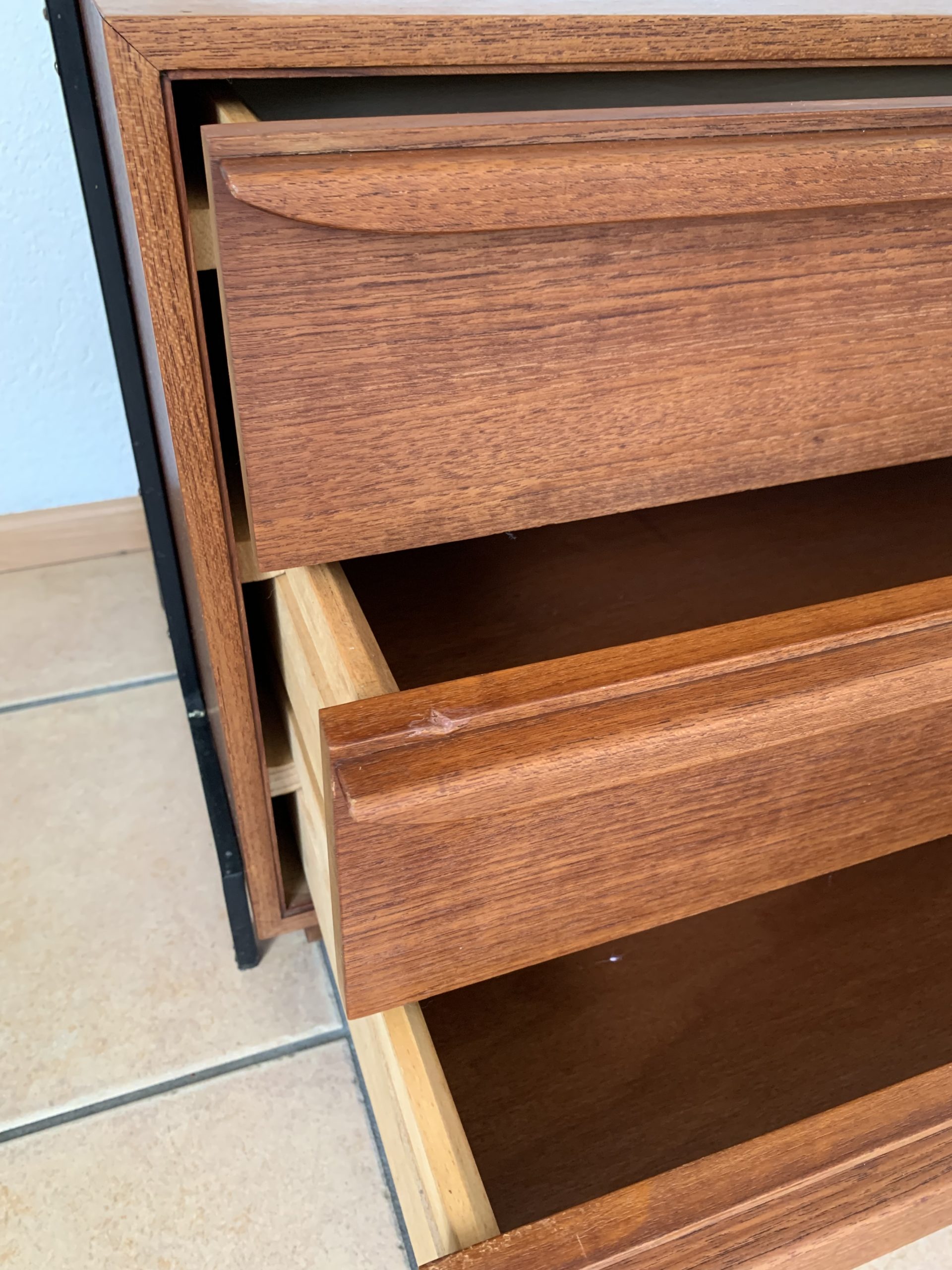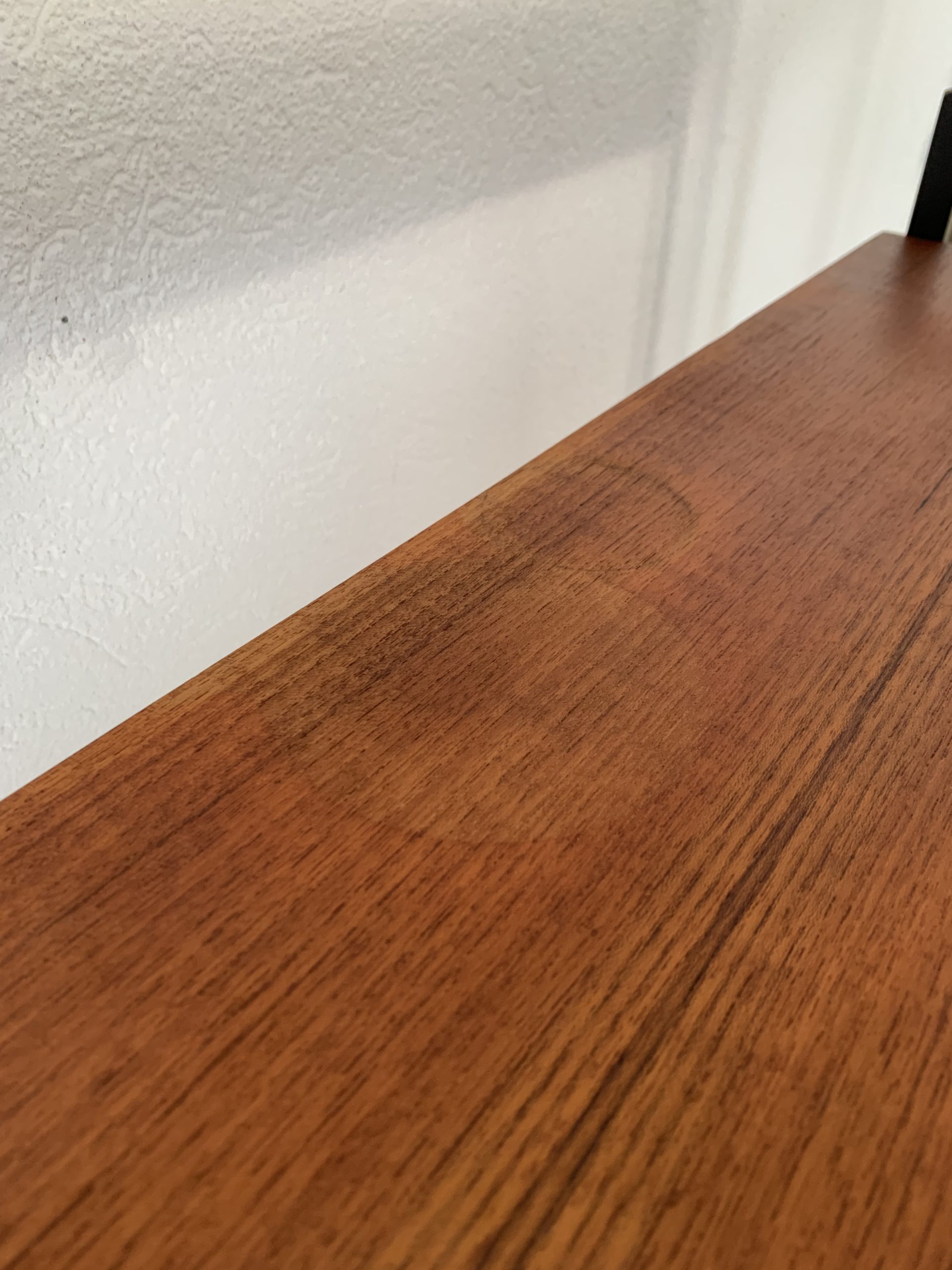 En bon état général. Légères taches sur un des tablars et sur le dessus du caisson (voir dernières photos). La peinture s’est enlevée sur une minime partie de la structure métallique (6ème photo). Quelques réparations ont été faites sur le contreplaqué (8ème photo)