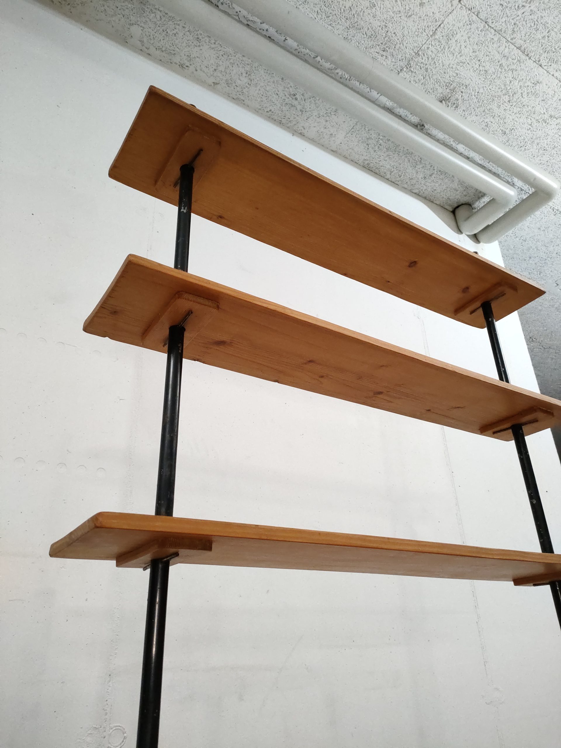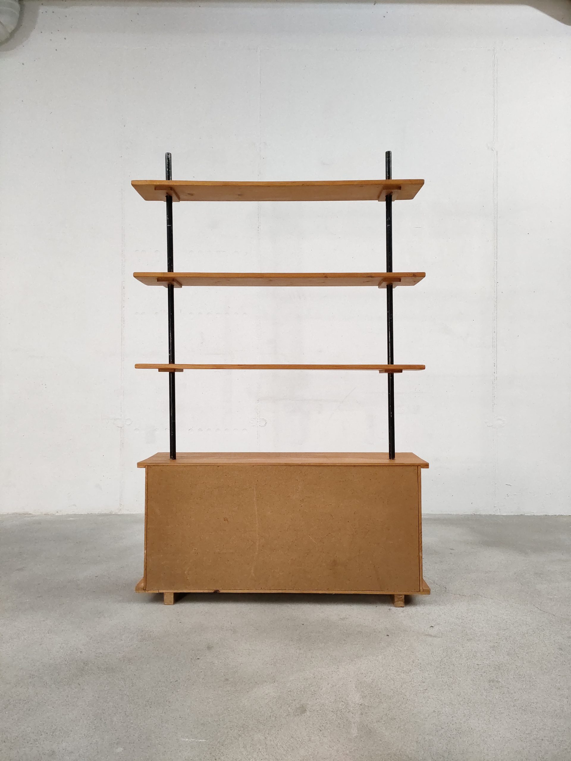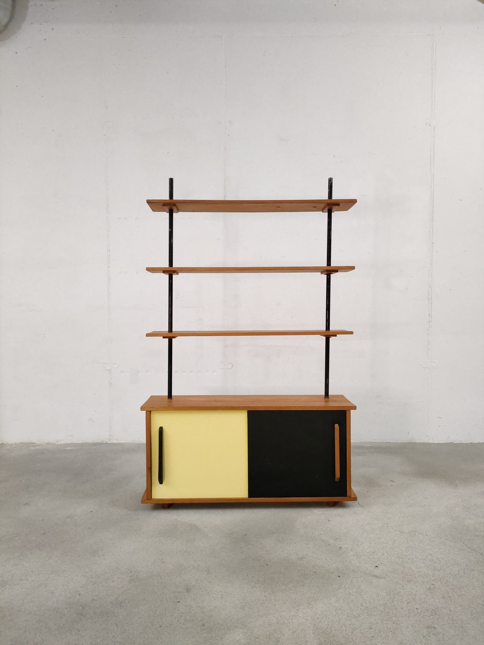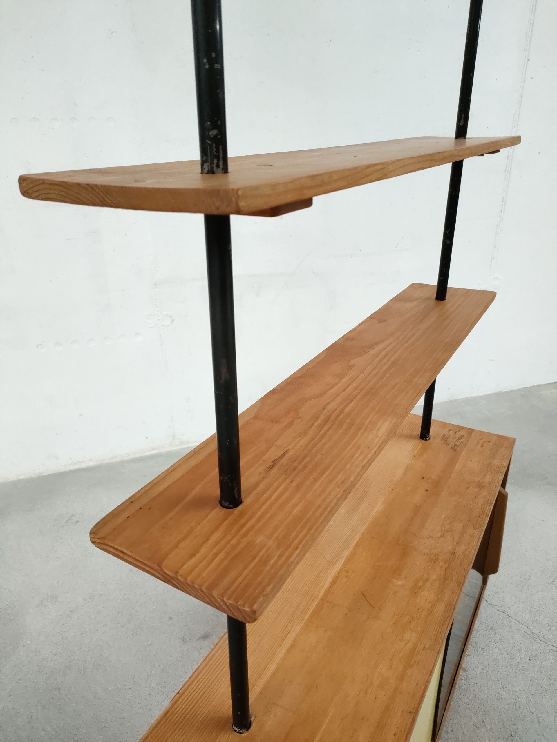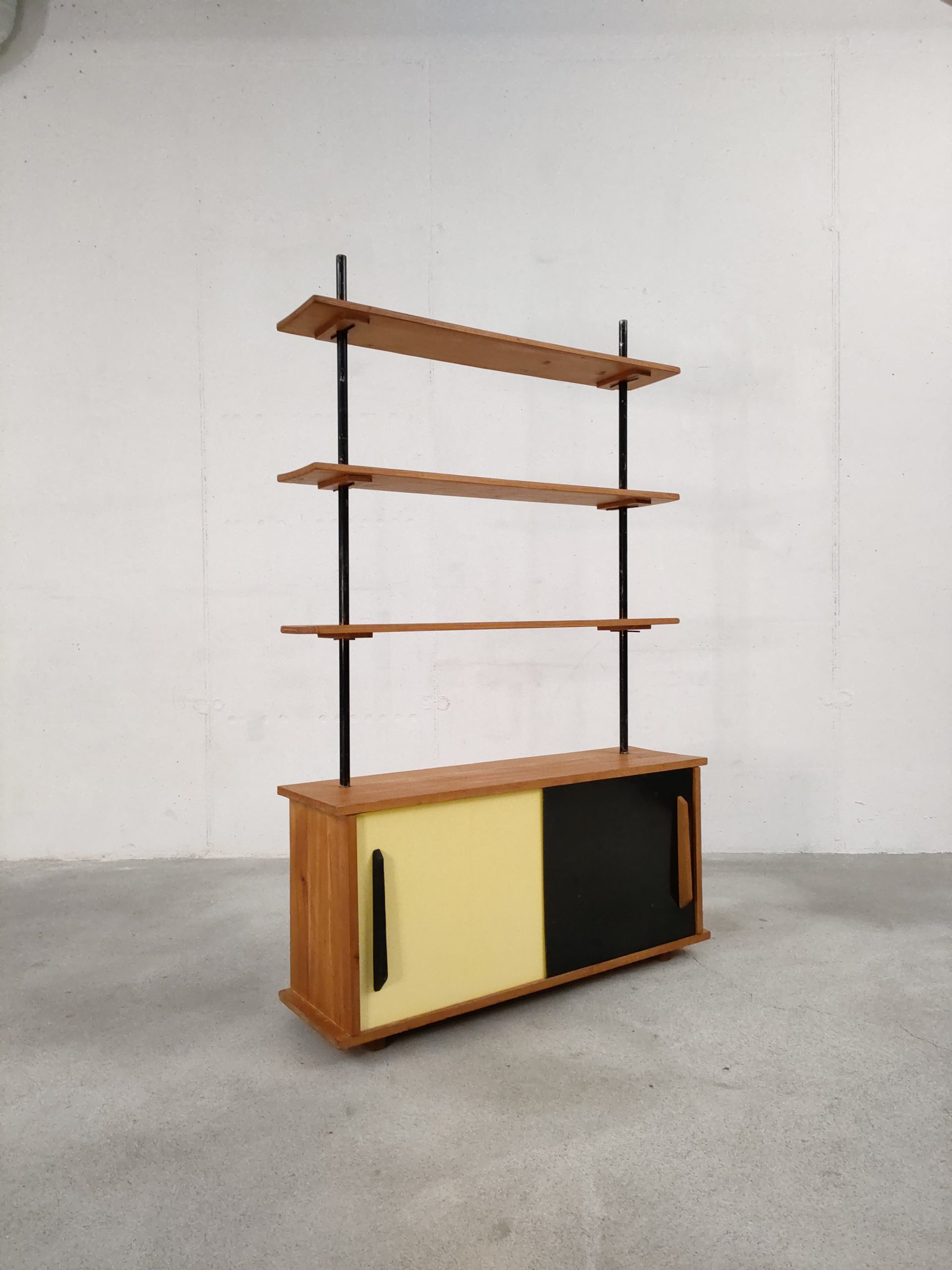 Produit venduÉtagère bibliothèque dotée de deux montants en métal noir, de trois tablars en bois et d’un module de rangement avec deux portes coulissantes. Plusieurs traces d’usure sont présentes sur le bois et sur le métal (voir photos).