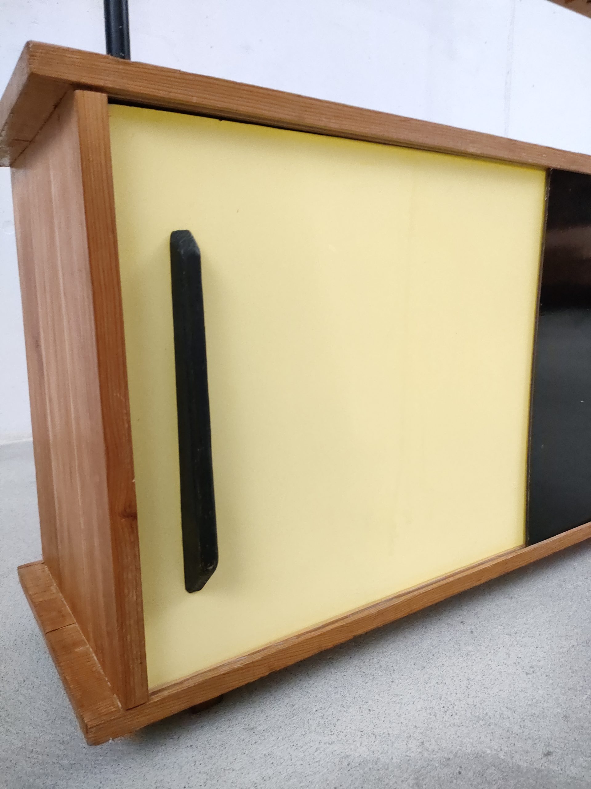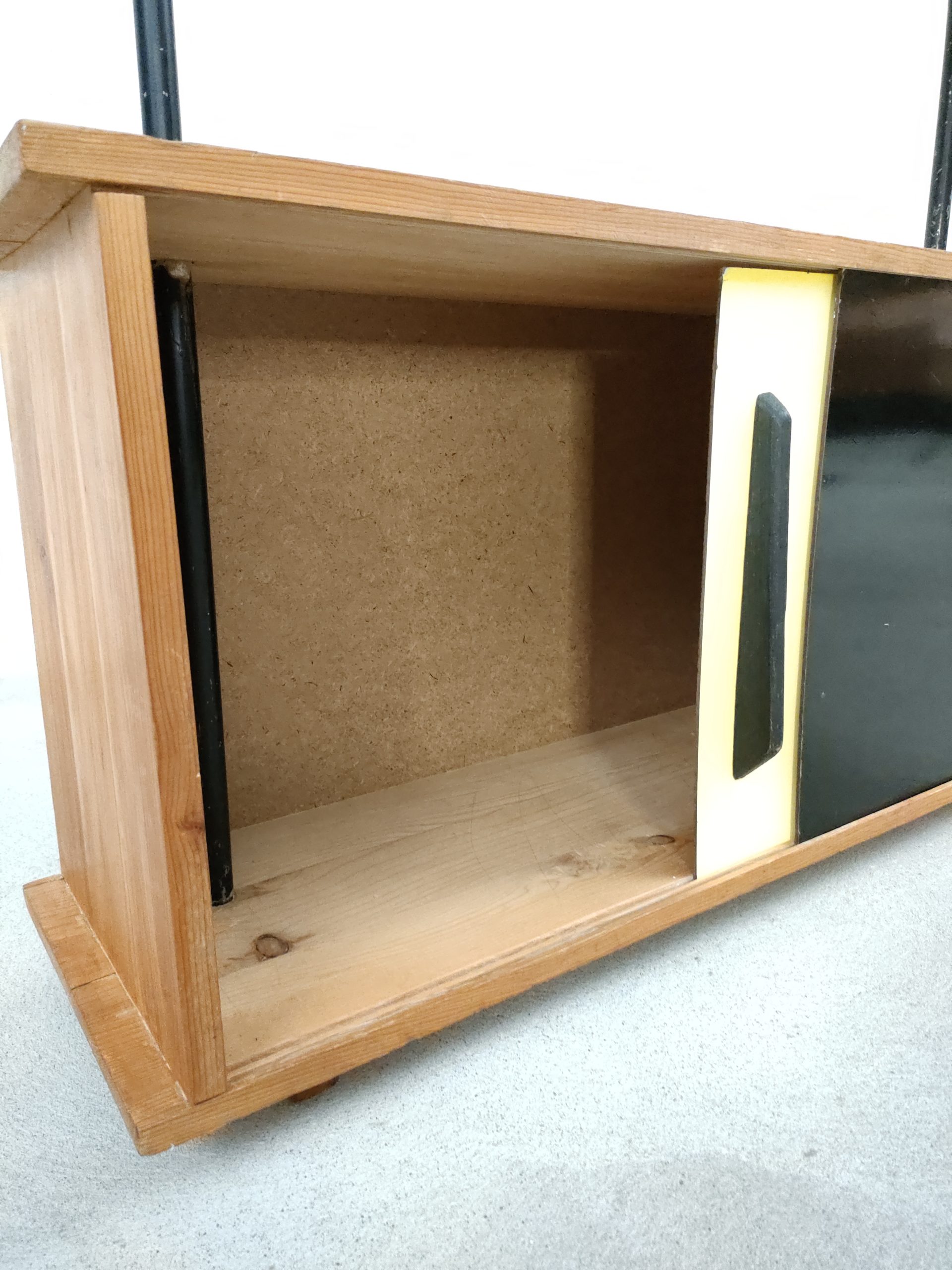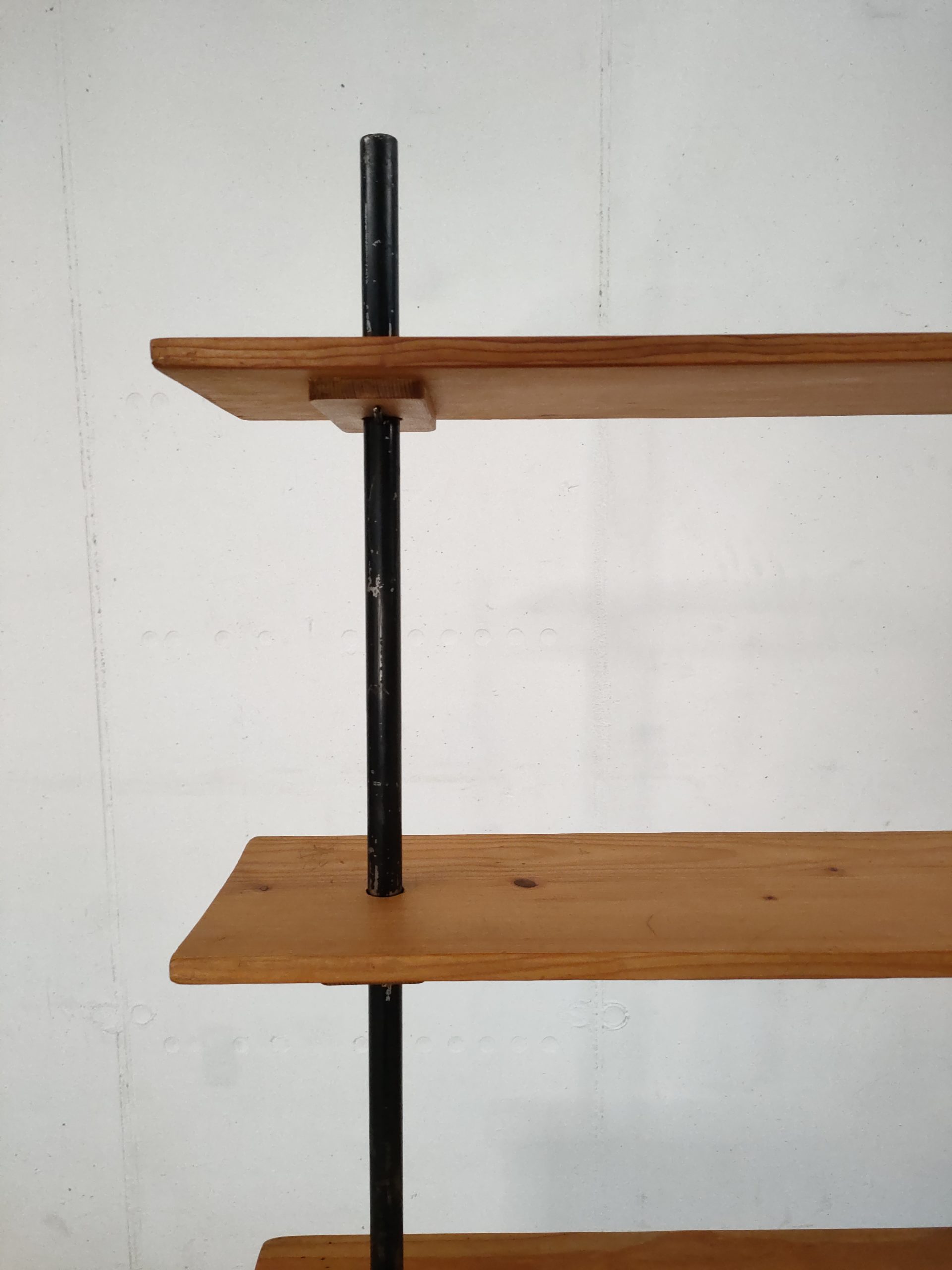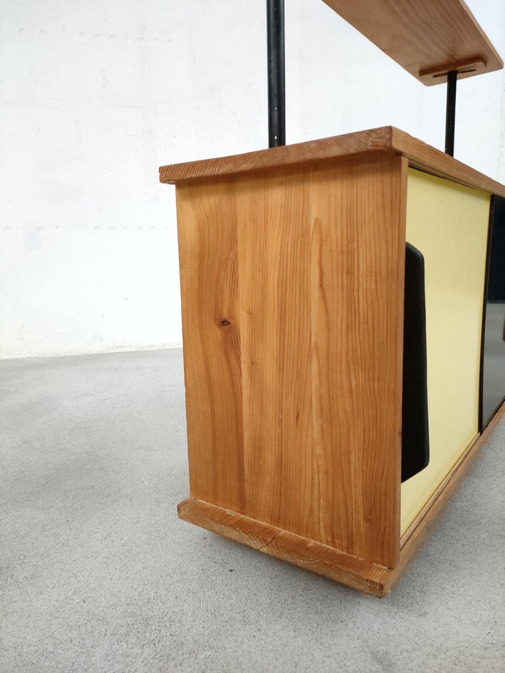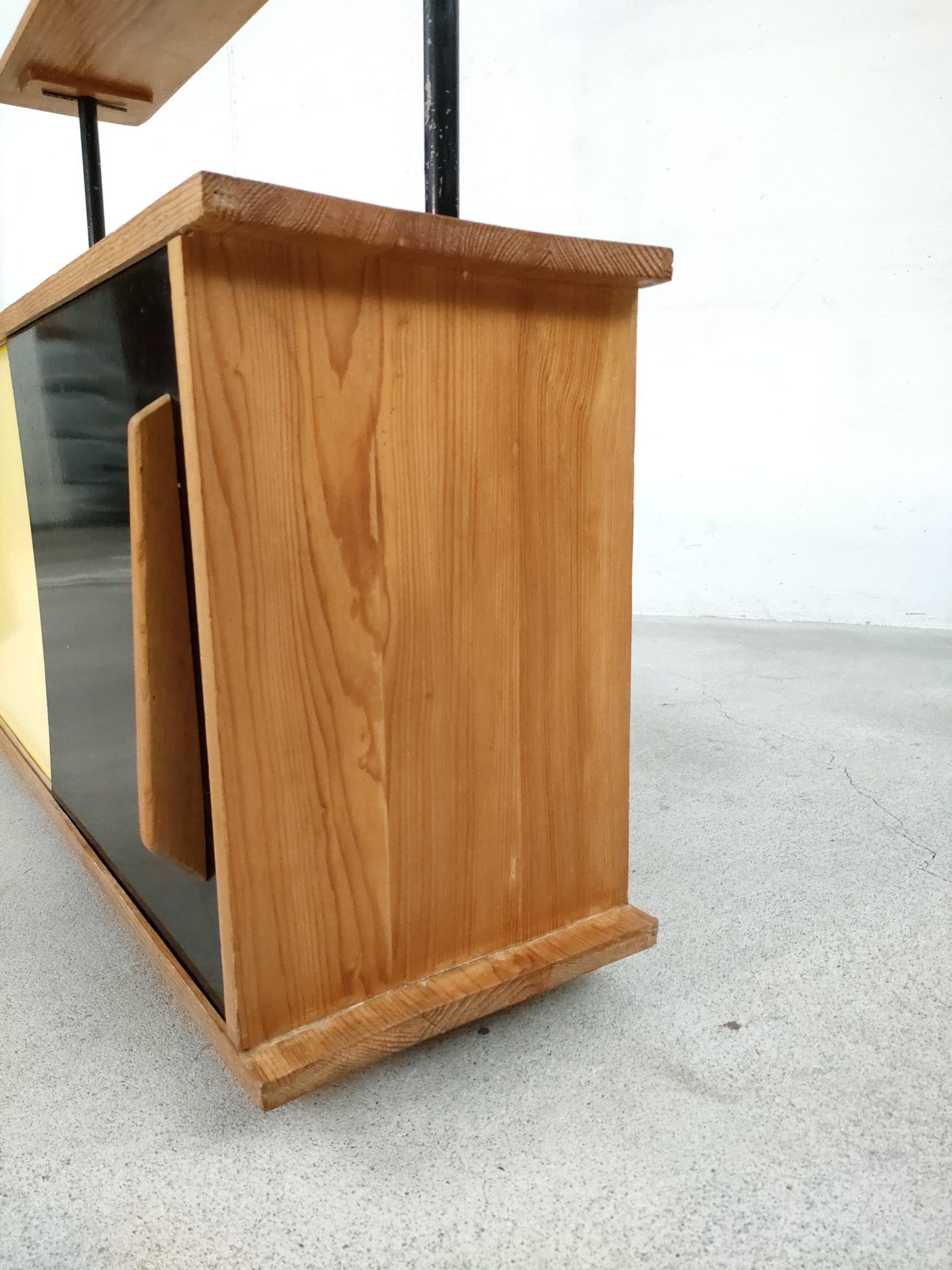 Produit venduÉtagère bibliothèque dotée de deux montants en métal noir, de trois tablars en bois et d’un module de rangement avec deux portes coulissantes. Plusieurs traces d’usure sont présentes sur le bois et sur le métal (voir photos).