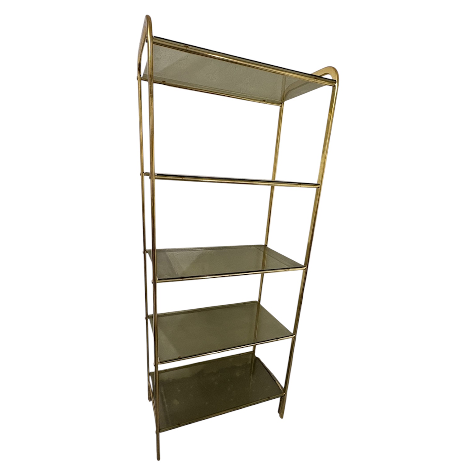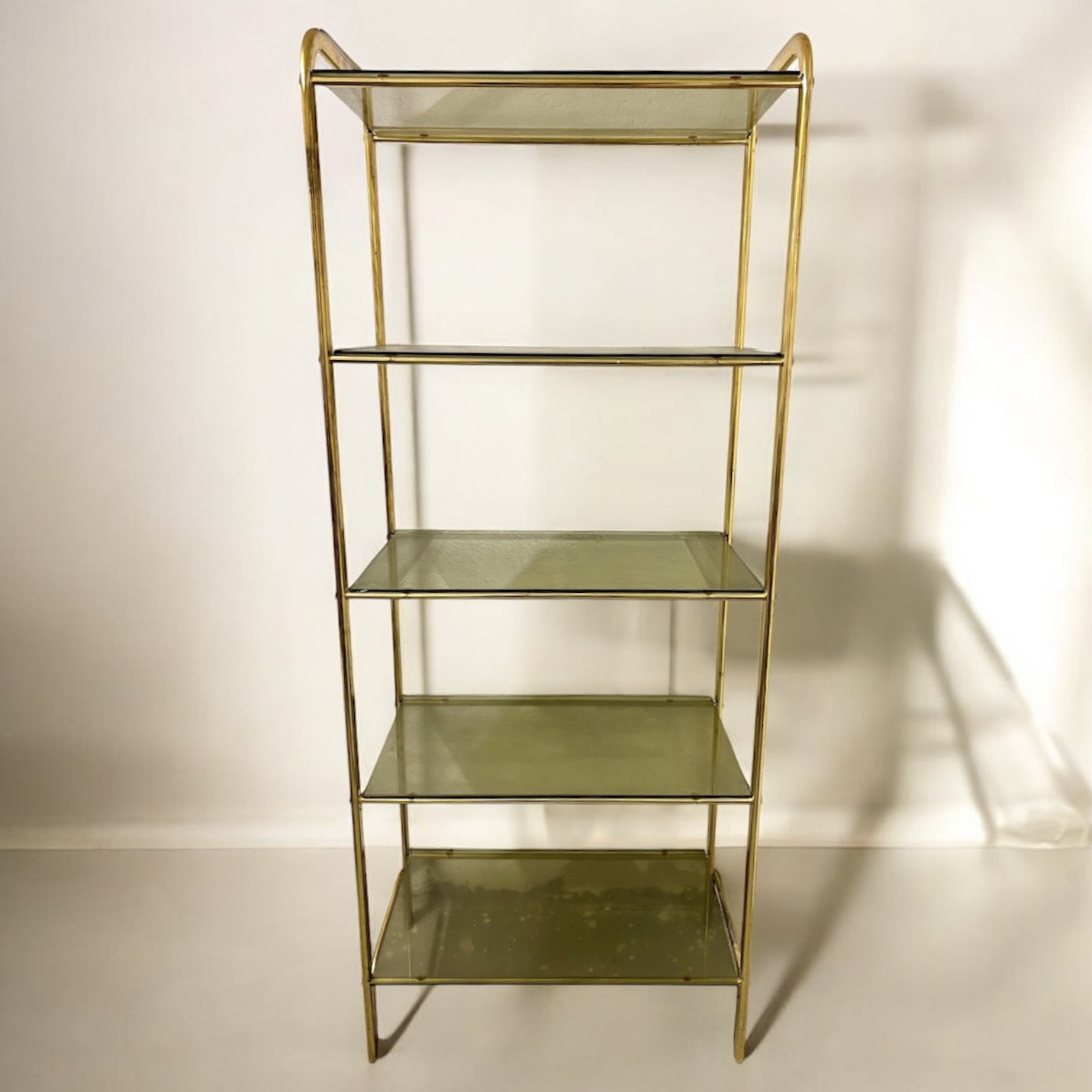 Élégante étagère à structure tubulaire en laiton doré et plateaux en verre, typique du design raffiné des années 1970.