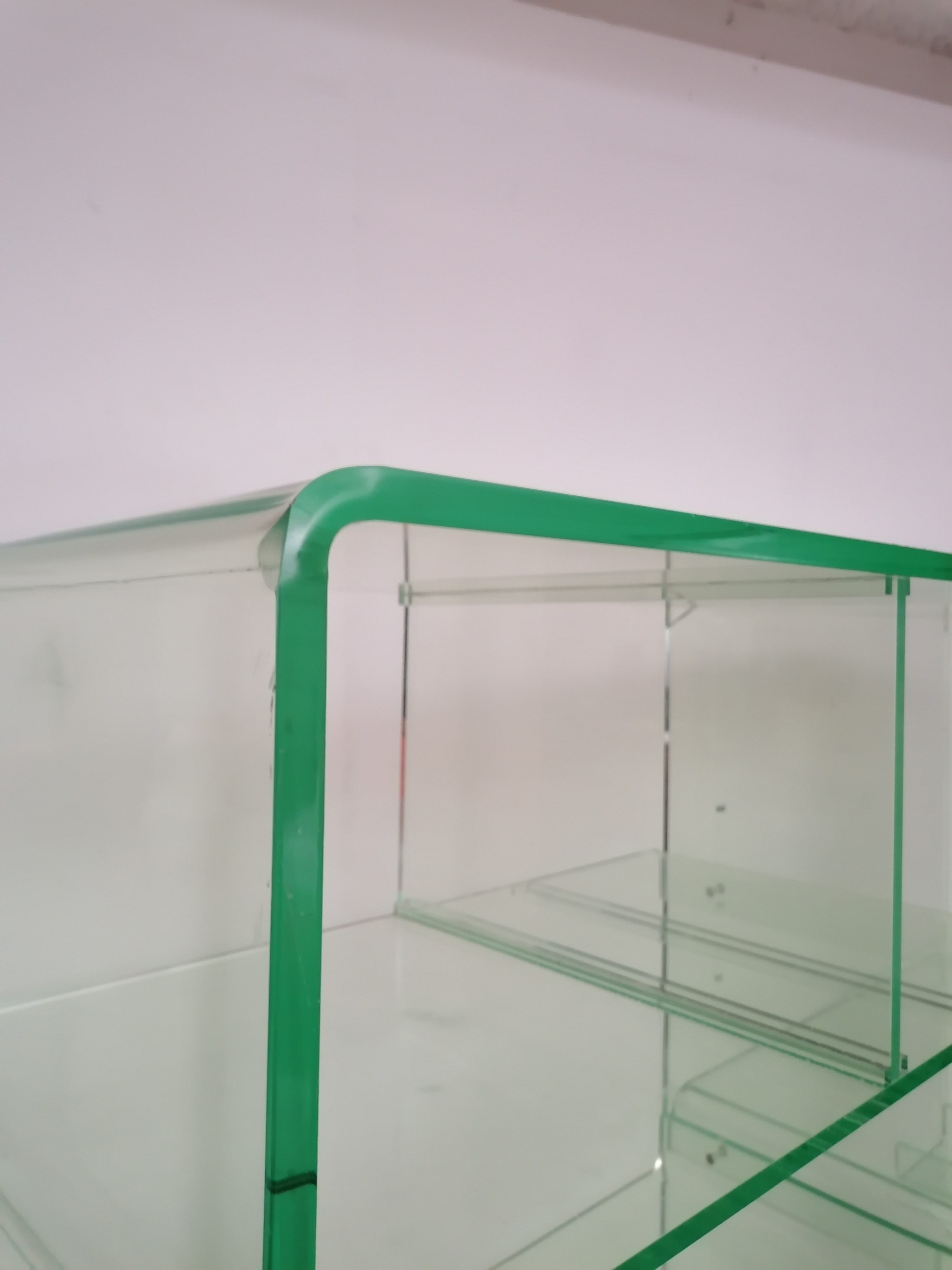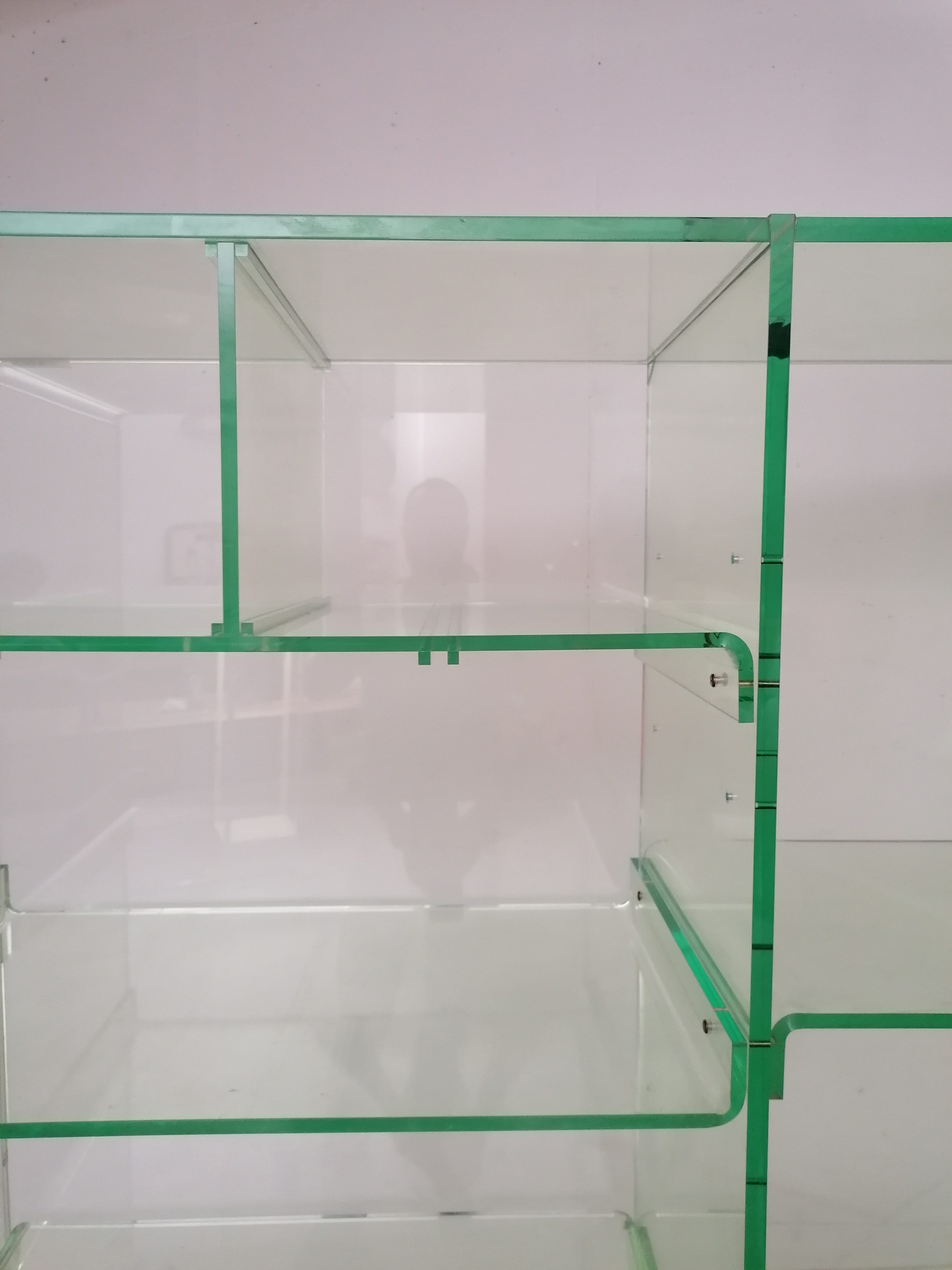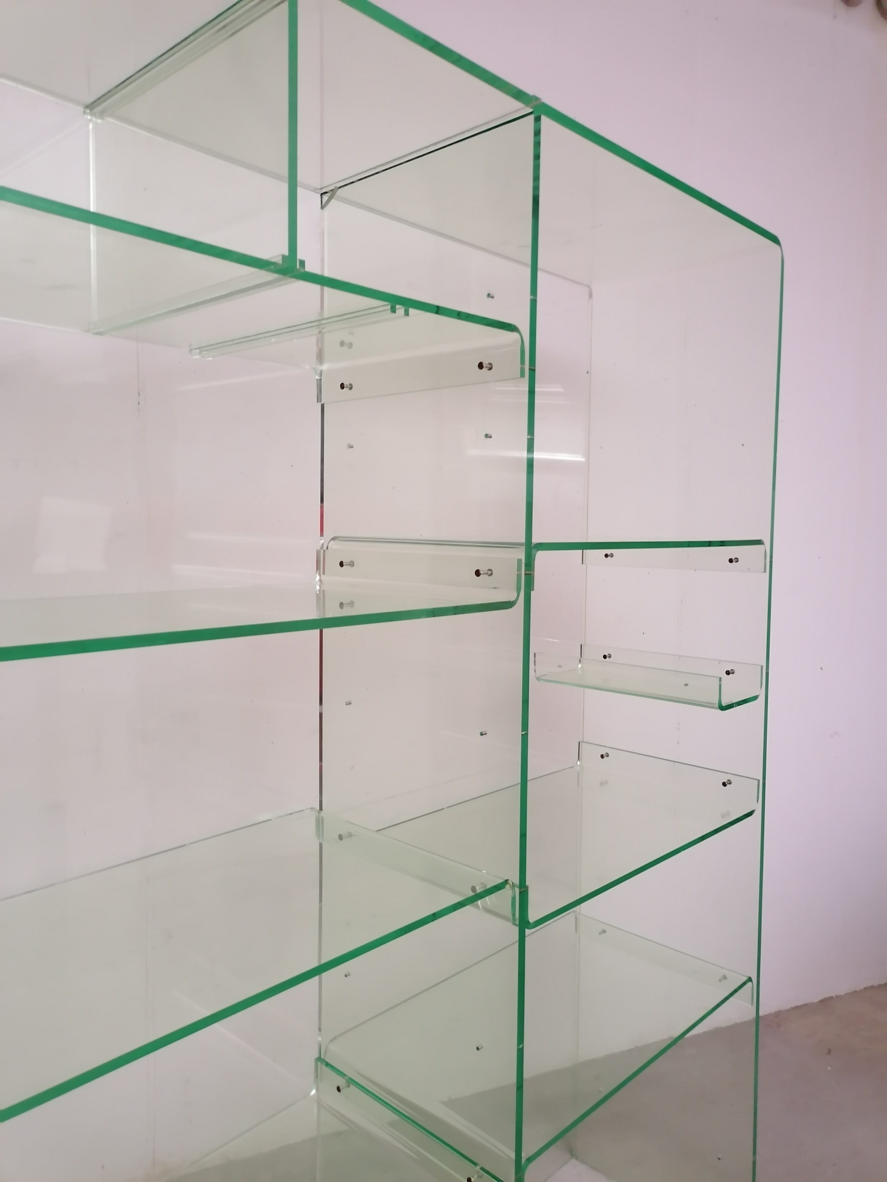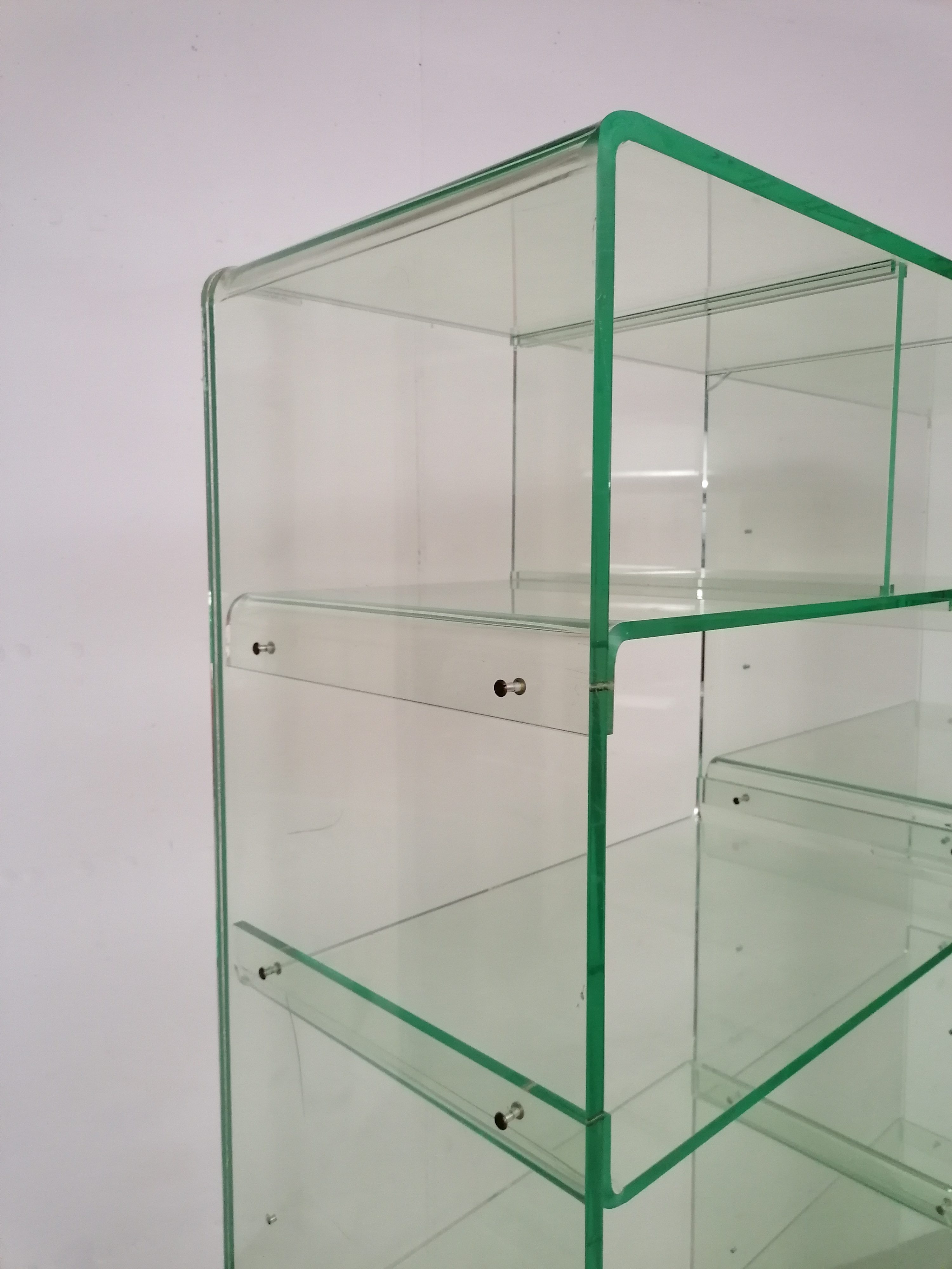 Produit venduÉtagère vintage en plexiglas. Composée de plusieurs étagères qui peuvent être placées à différentes hauteurs. Quelques traces d’usure mais stable et solide. Cette étagère est complétée par un tablar et trois petits espaces de rangement supplémentaires qui ne sont pas visibles sur les photos.