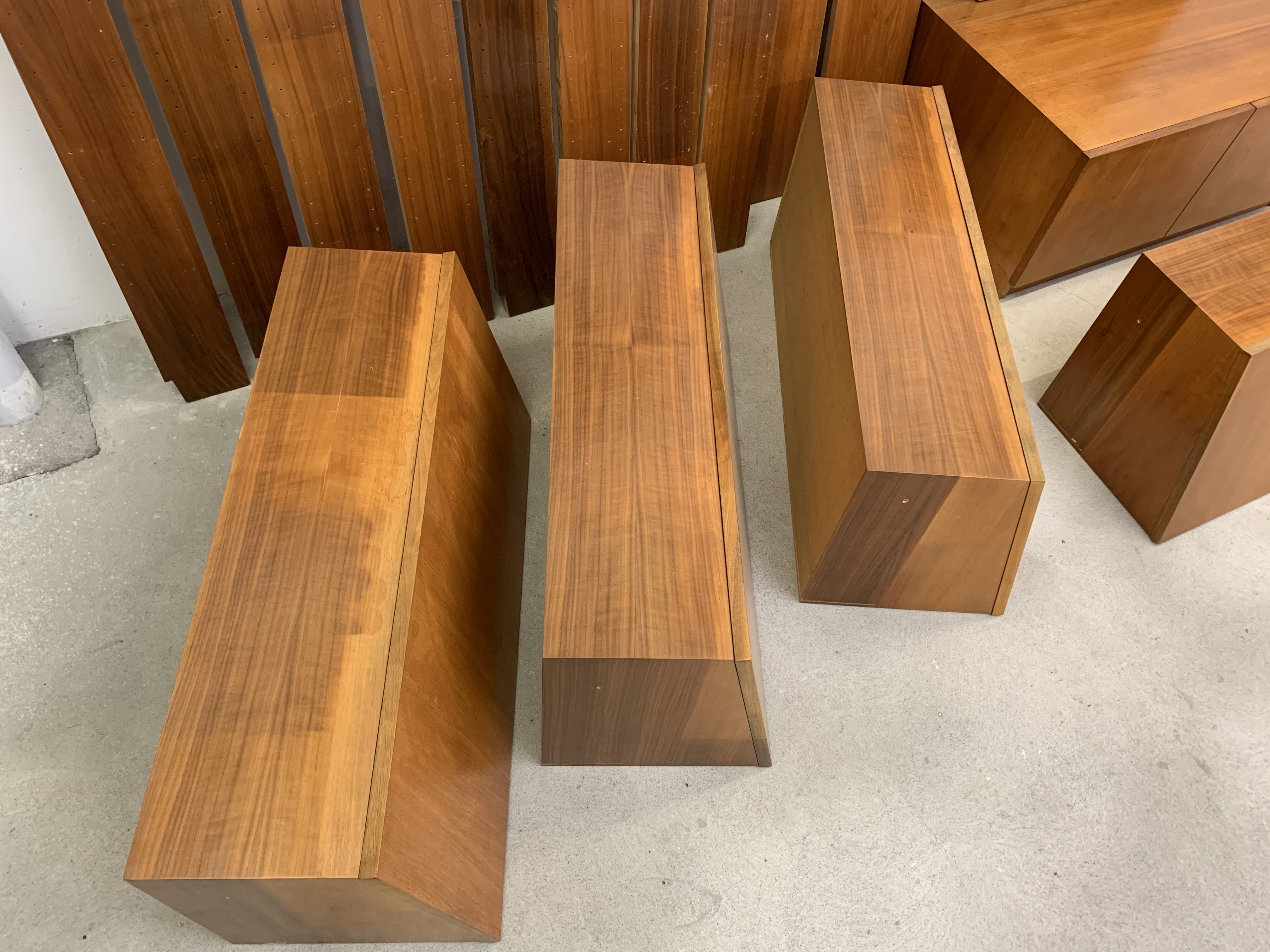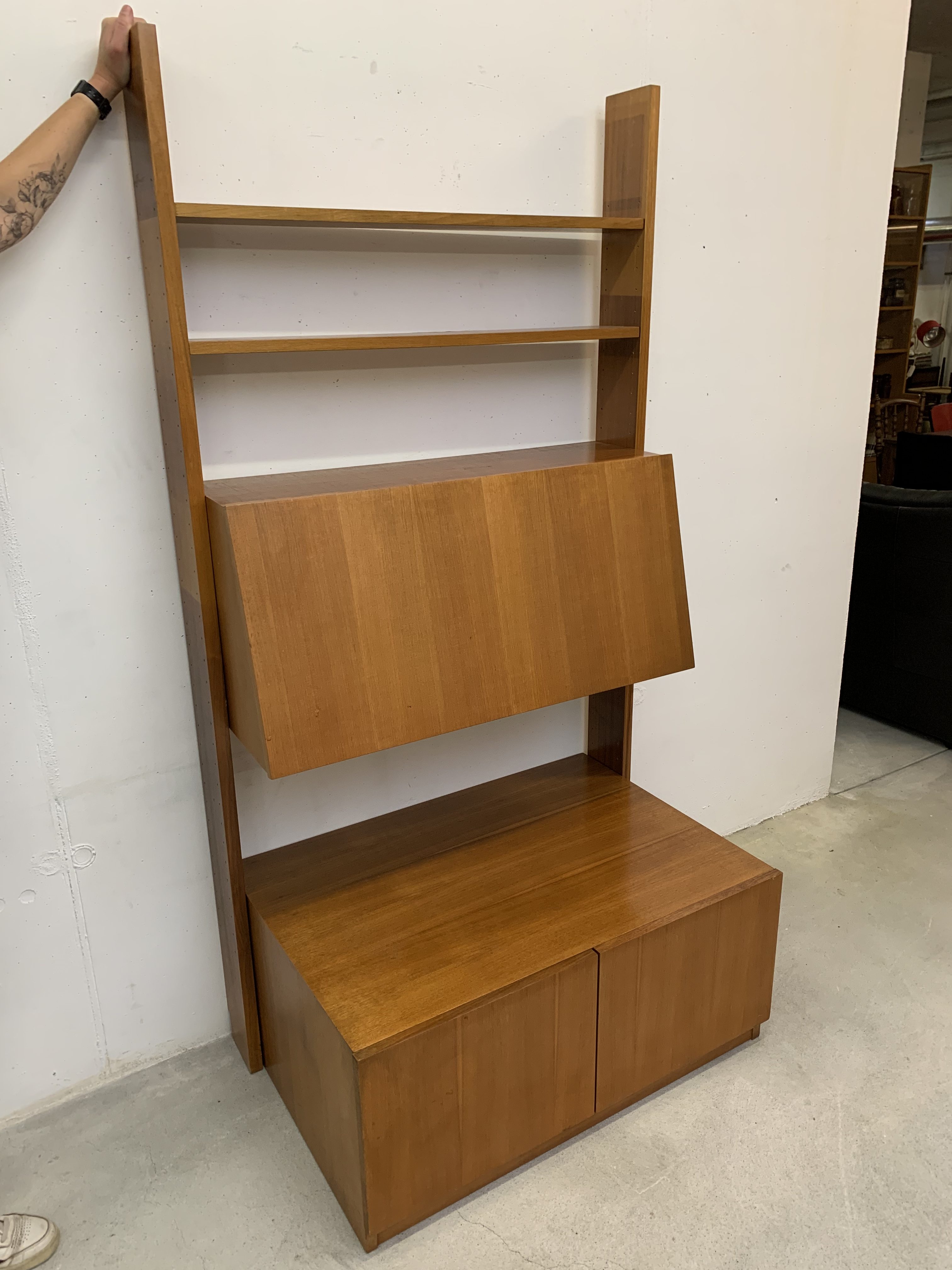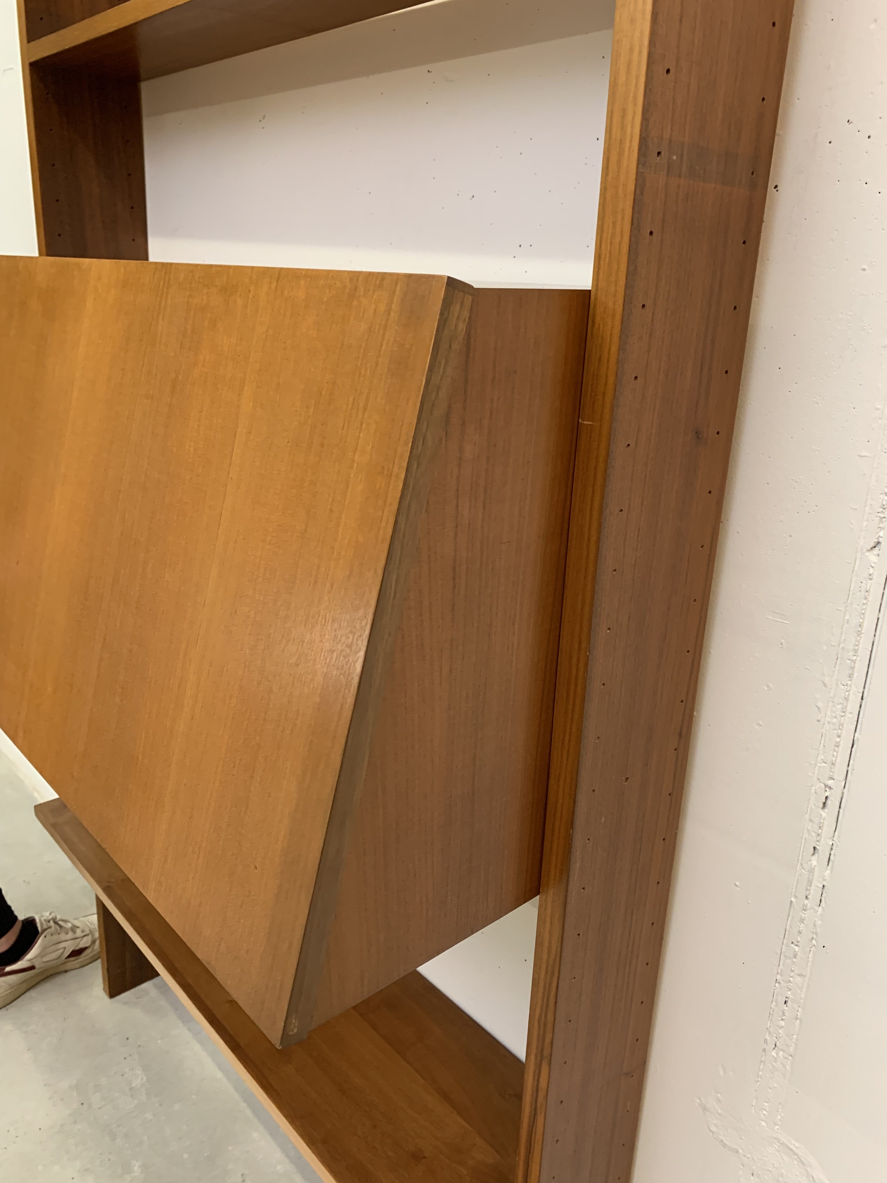 Produit venduÉtagère modulable avec caisson et tiroirs. Chaque élément peut être disposé à la hauteur voulue. Le caisson peut servir de minibar, mais sa porte ne reste pas parfaitement à l’horizontale une fois qu’elle est ouverte. La partie comprenant 2 tiroirs est indépendante (63 x 41 x 90 cm). Les tiroirs sont montés sur des rails à roulettes et sont équipés pour recevoir des dossiers suspendus. Les tablars mesurent 13,5 cm de profondeur et 90 cm de large. Le caisson fait 42 cm de hauteur et 36 de profondeur, à sa base (25 cm à son sommet). L’étagère se fixe uniquement au mur à son sommet à l’aide de petites équerres (fournies). Elle peut être facilement combinée avec les autres étagères identiques visibles sur une autre annonce.