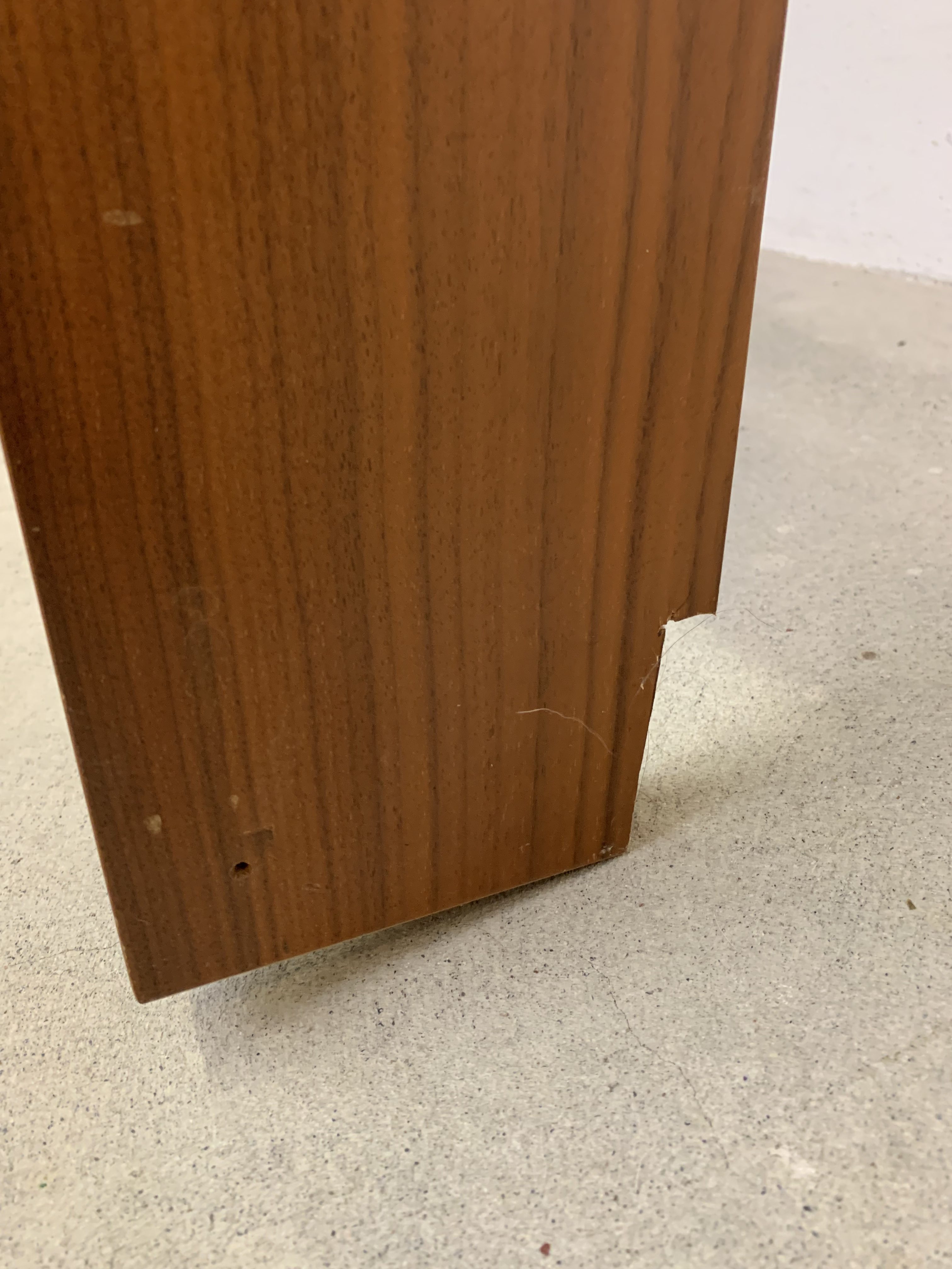 L’état général de l’étagère est bon. Les traces des objets qui y ont été posés durant de longues années sont bien visibles, en particulier sur les montants. Les montants ont quelques trous de vis, car il est nécessaire de fixer le caisson à l’aide de 2 vis. Selon votre nouvelle configuration, ces trous seront visibles.