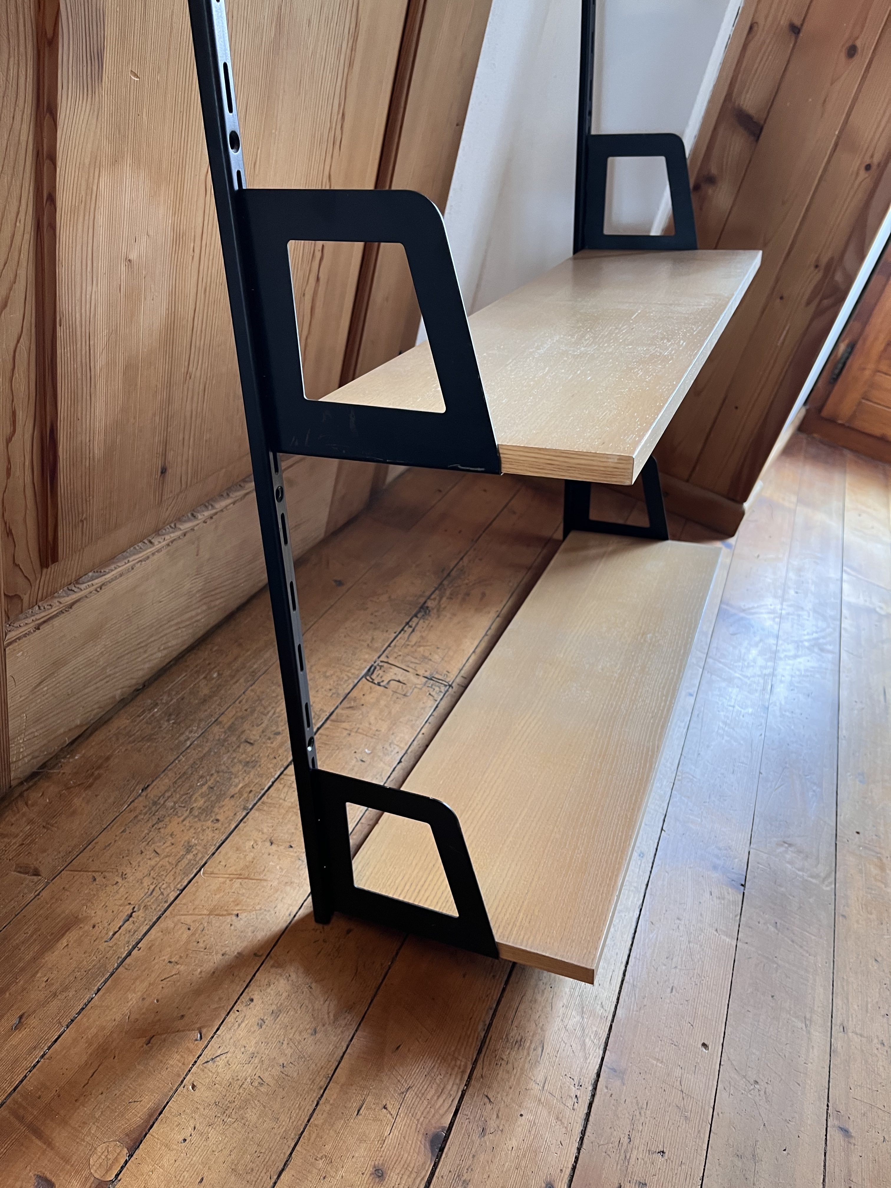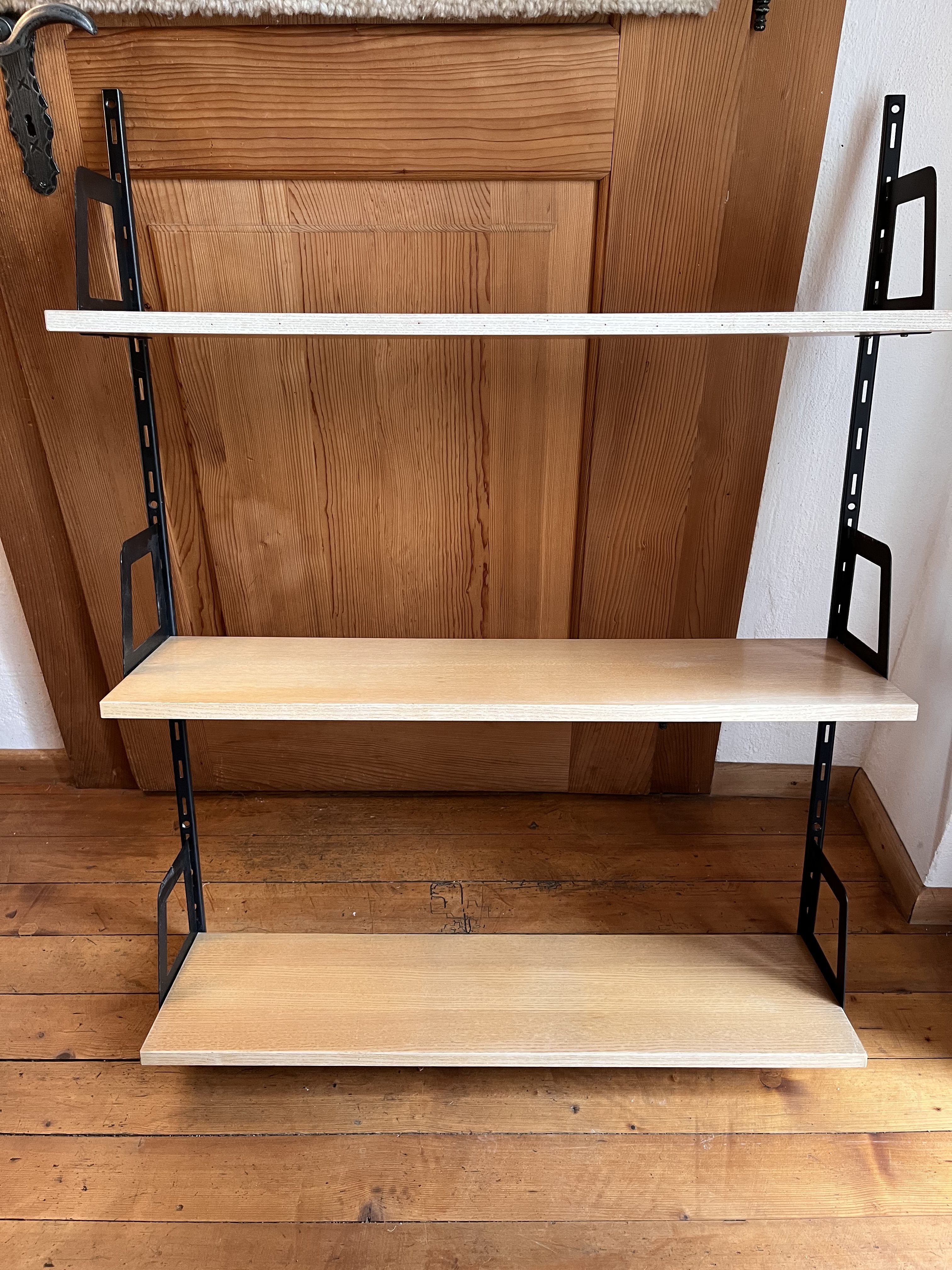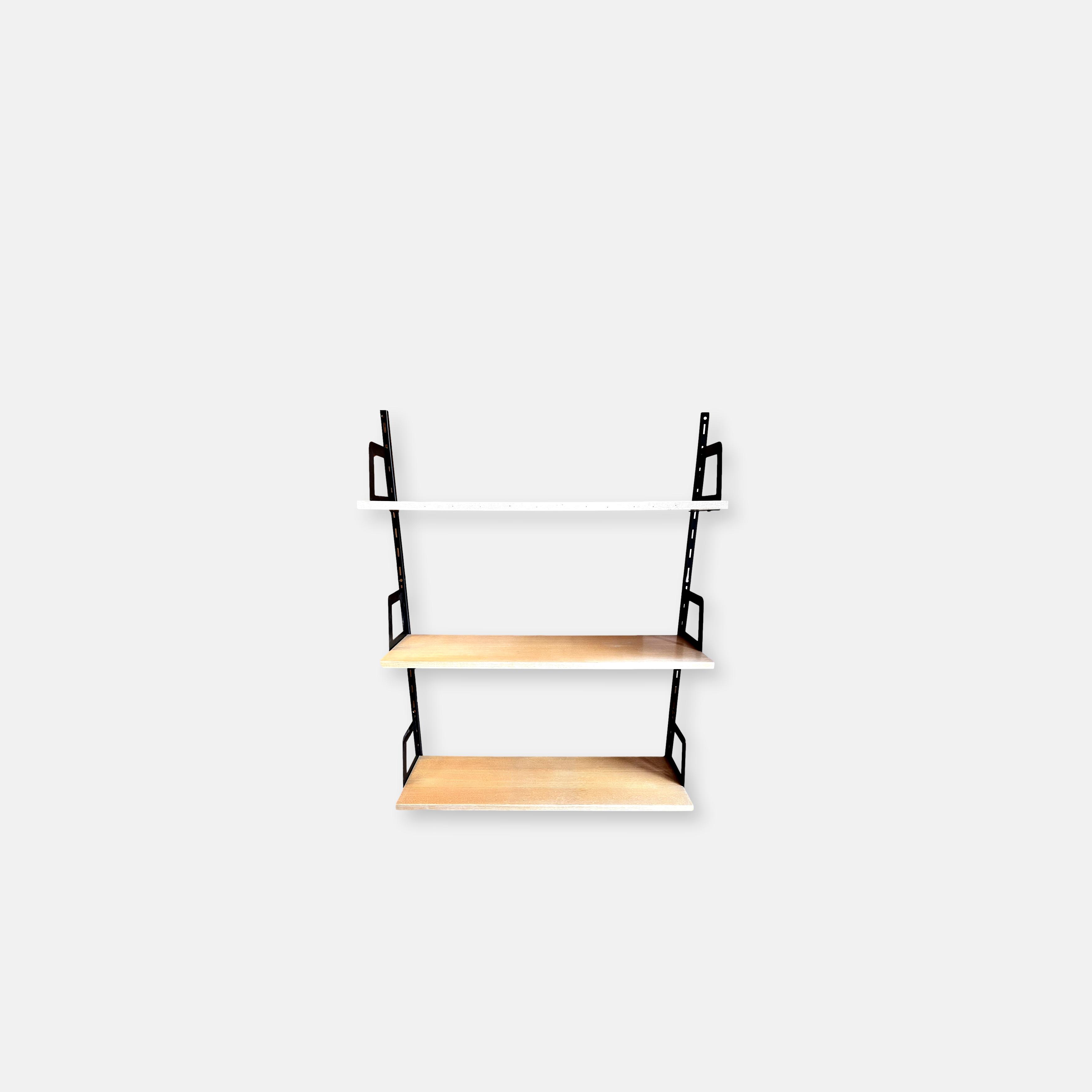 Produit venduÉtagère murale réglable vintage avec structure en métal noir et 3 étagères en bois.
