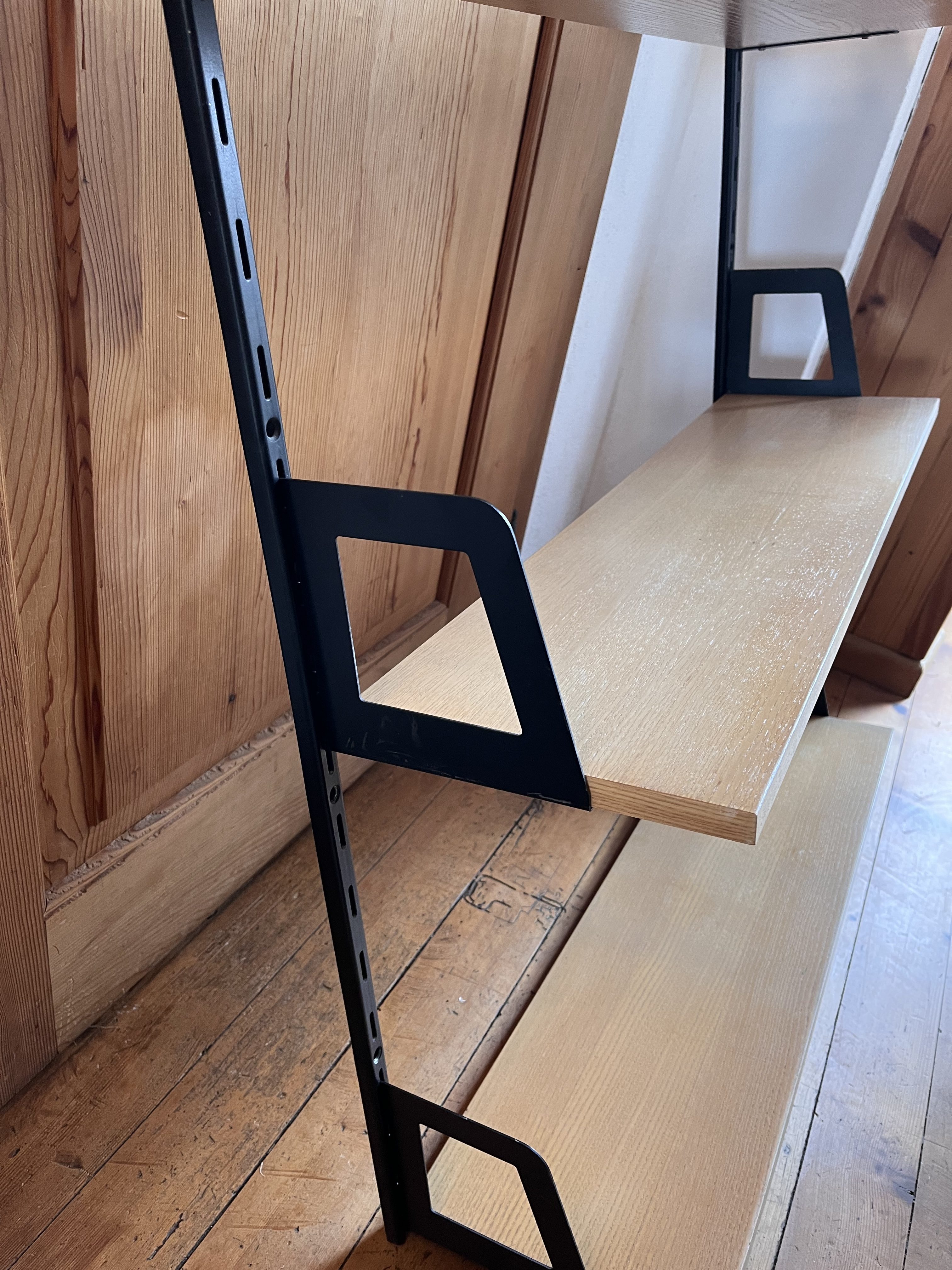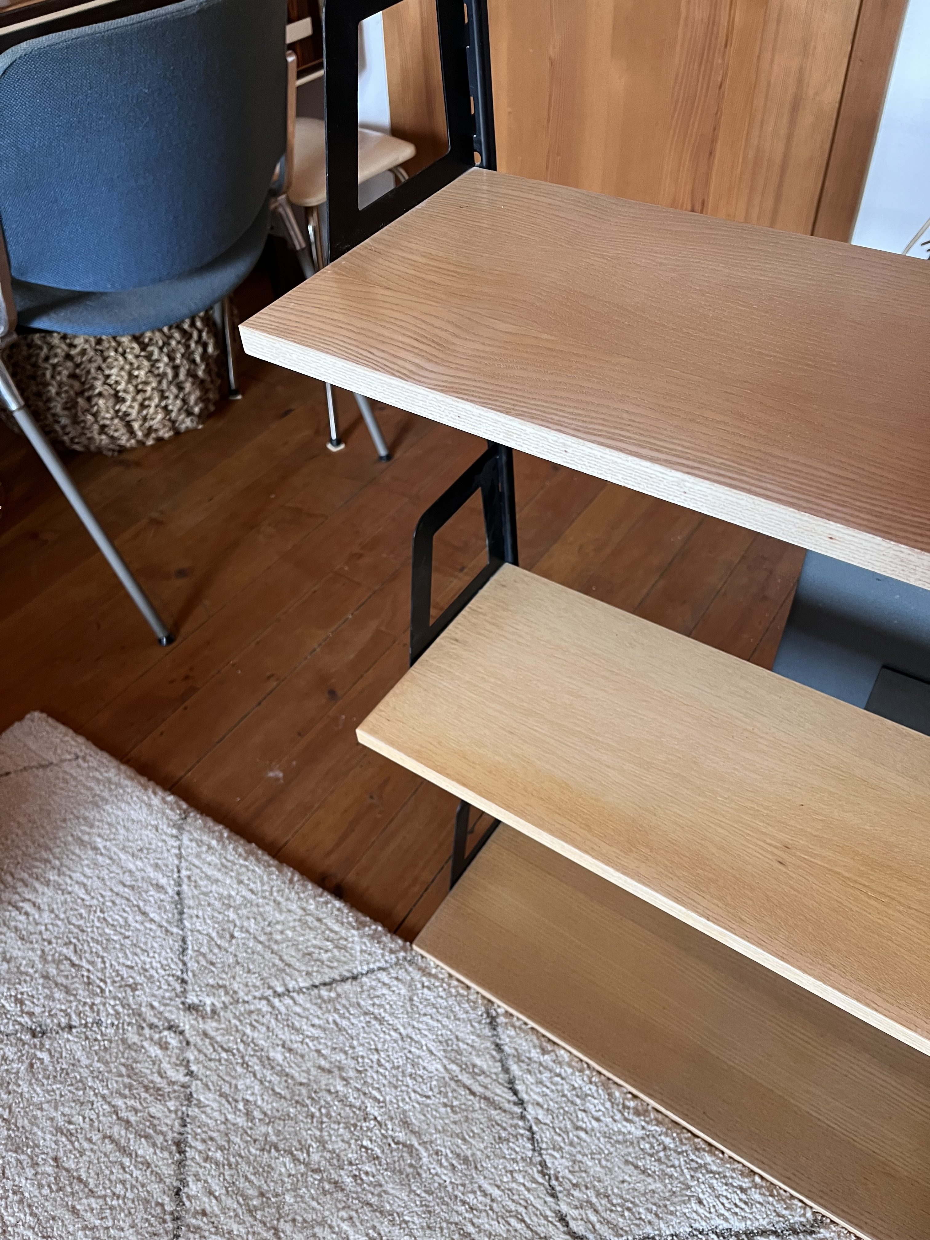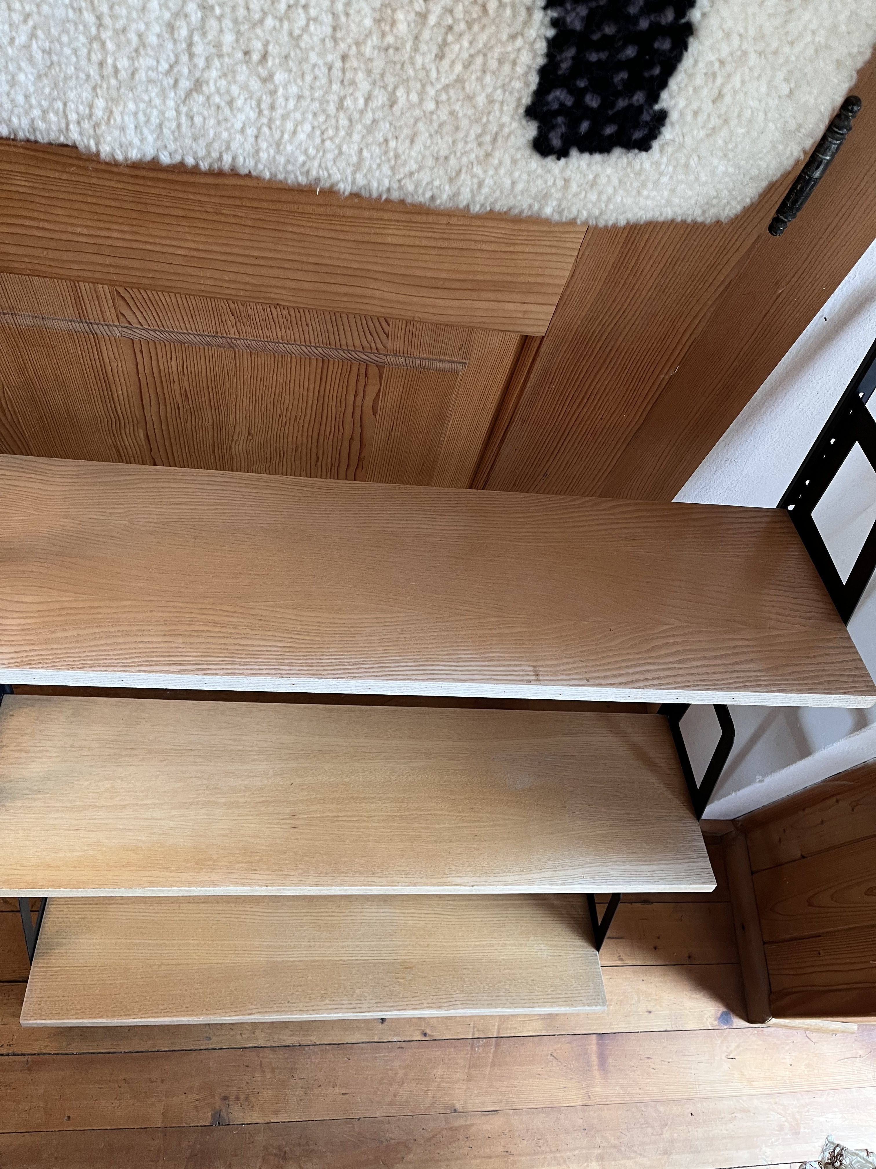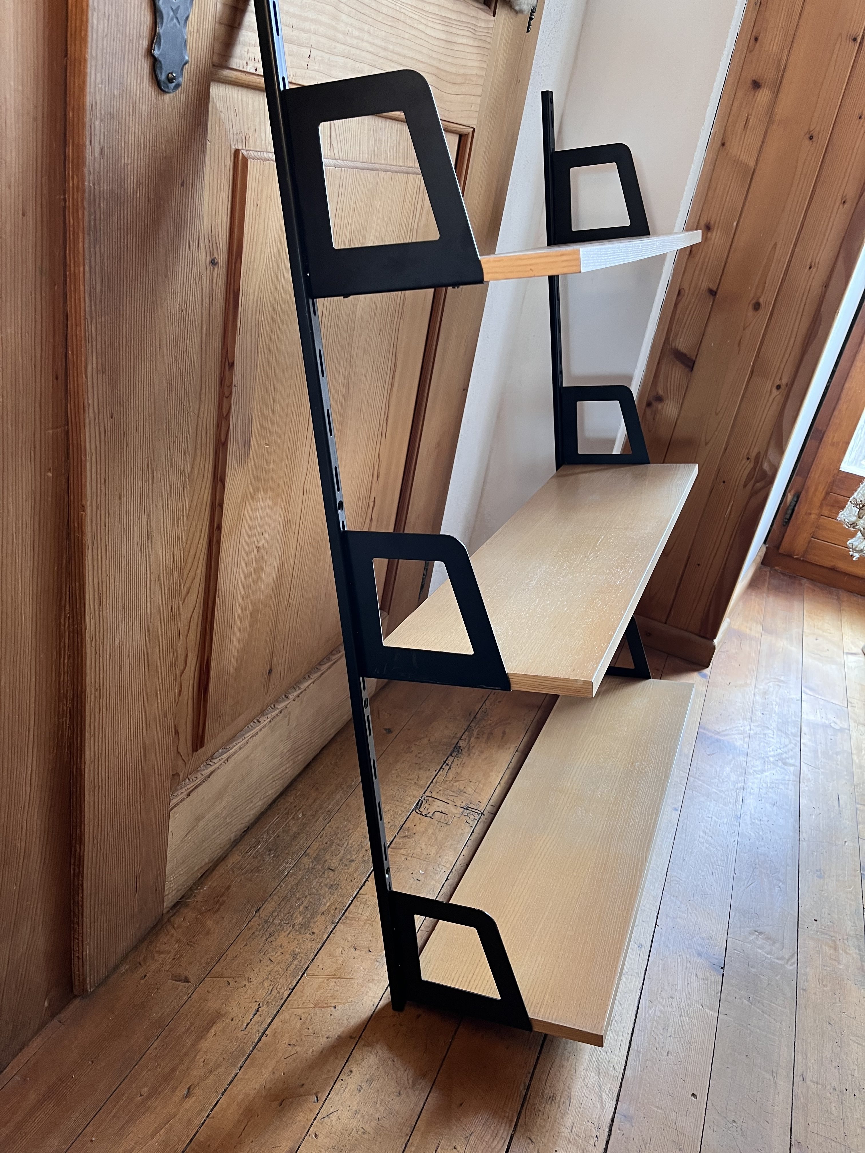 Produit venduÉtagère murale réglable vintage avec structure en métal noir et 3 étagères en bois.