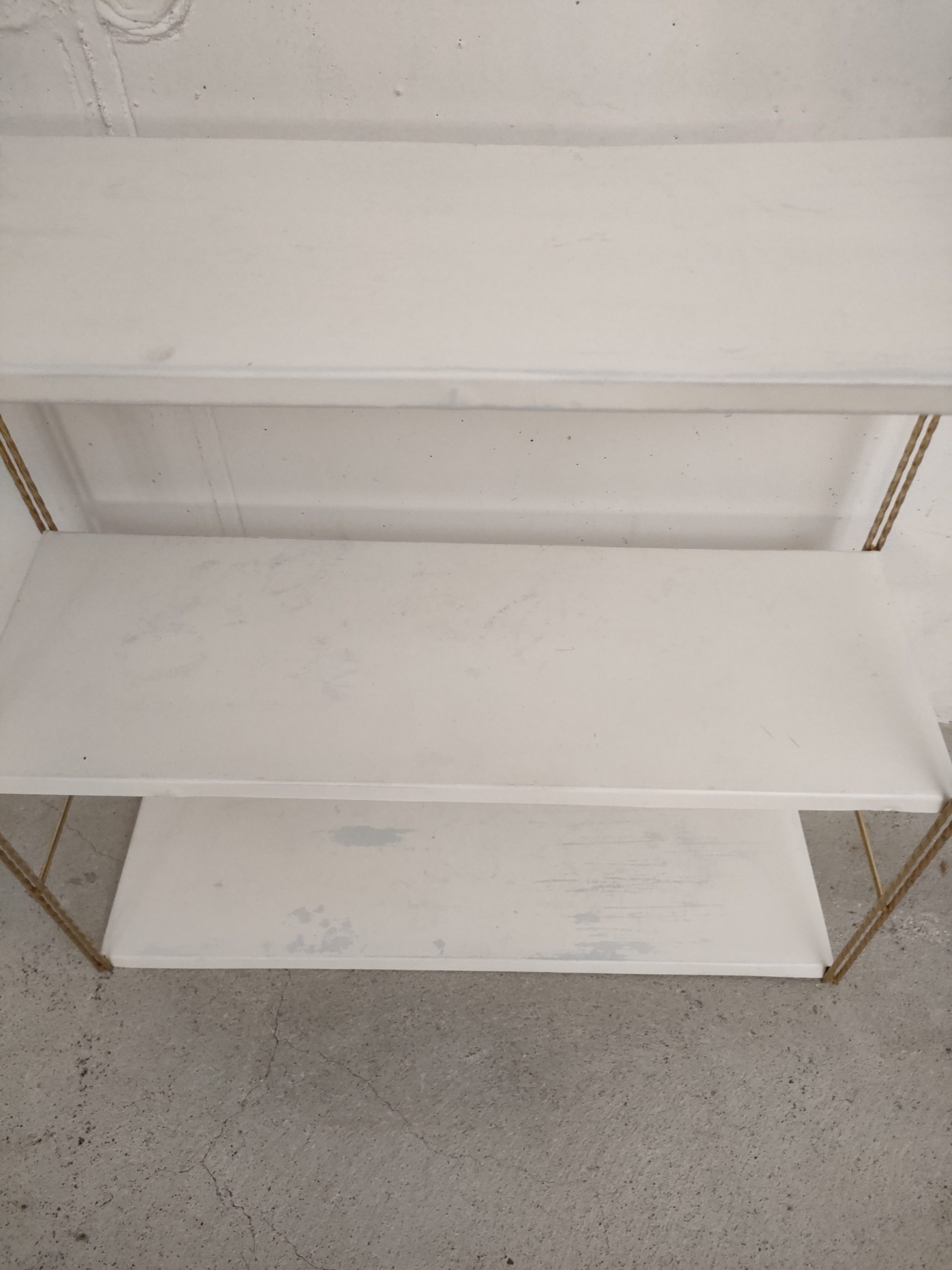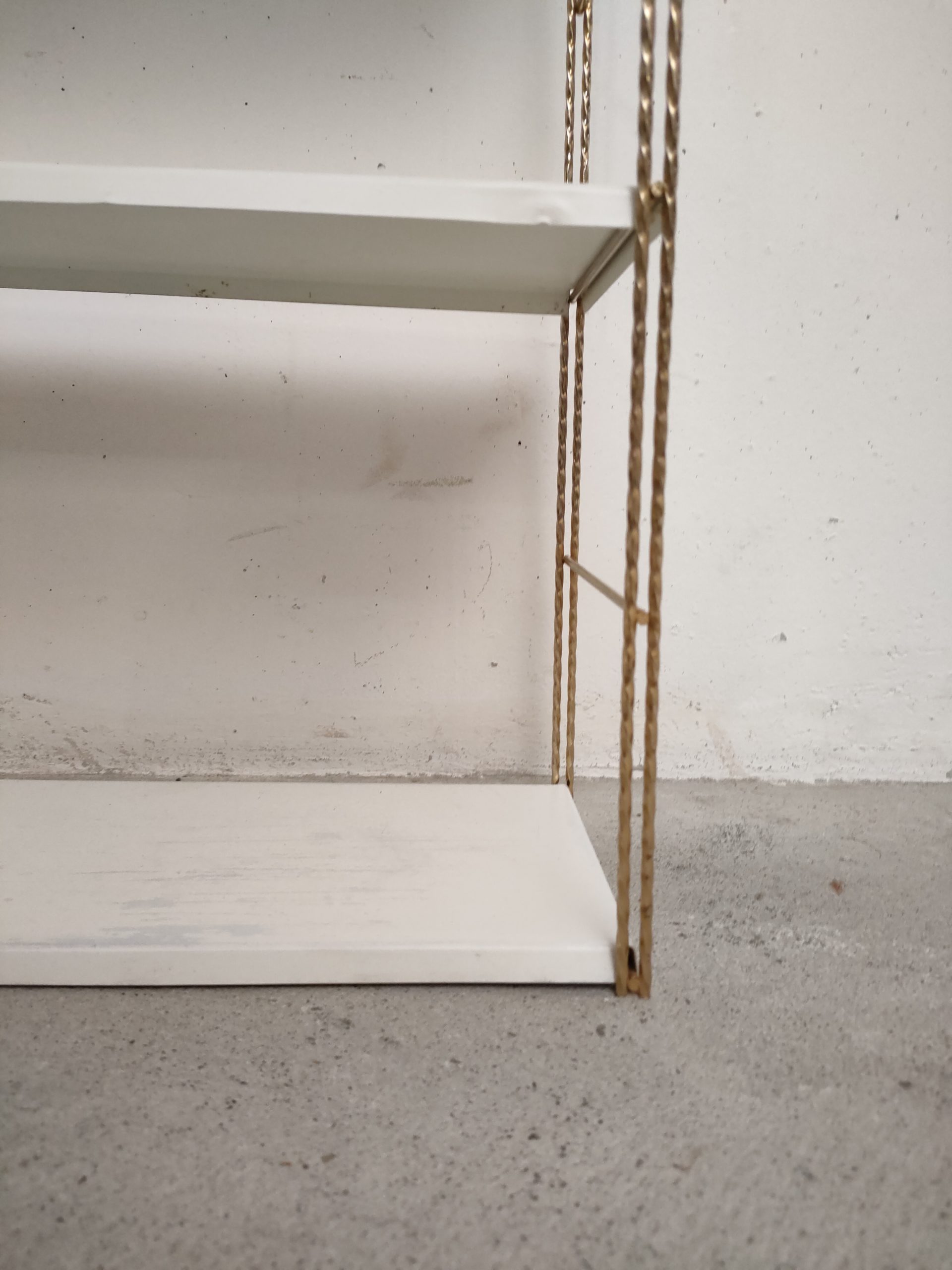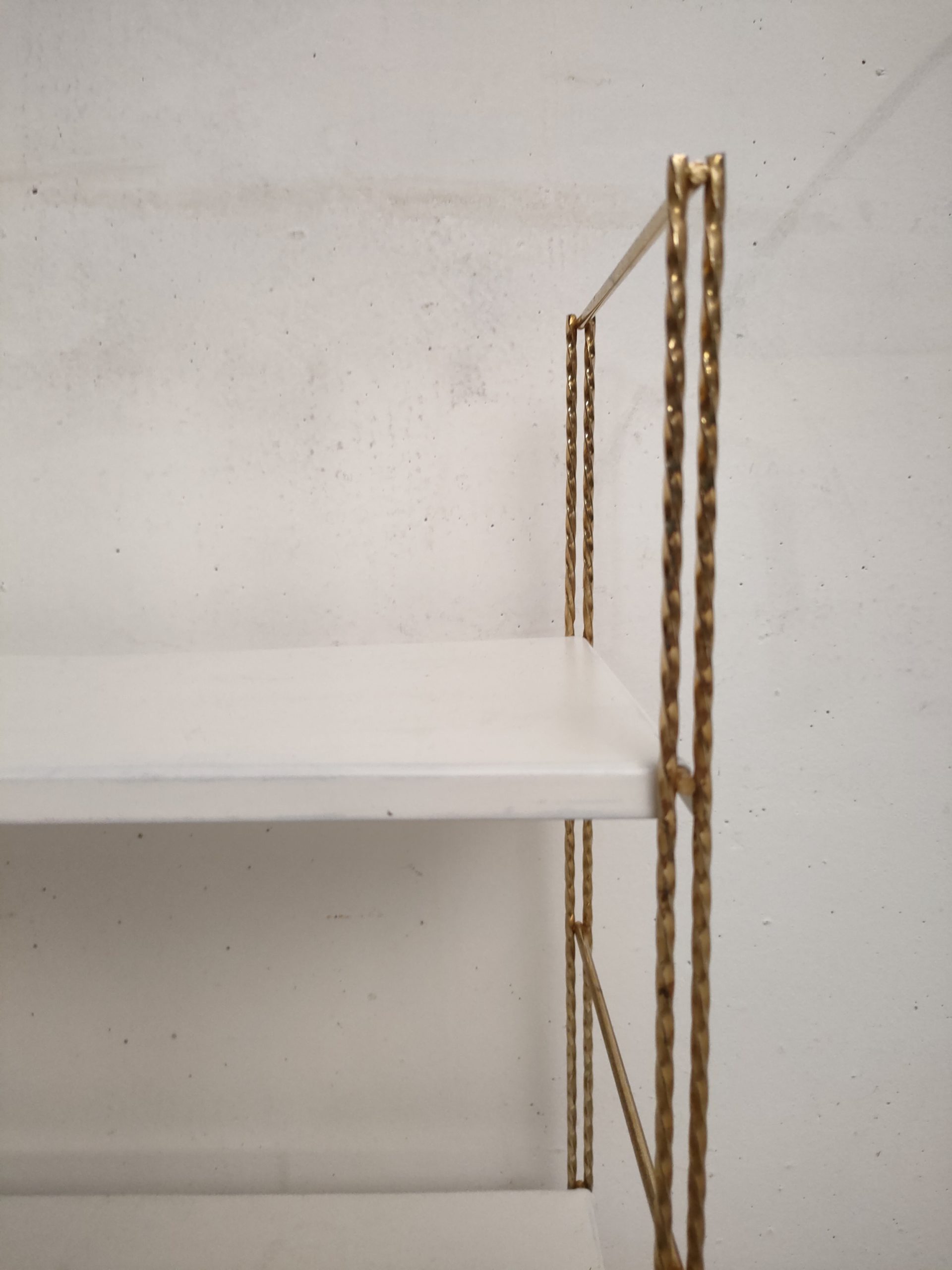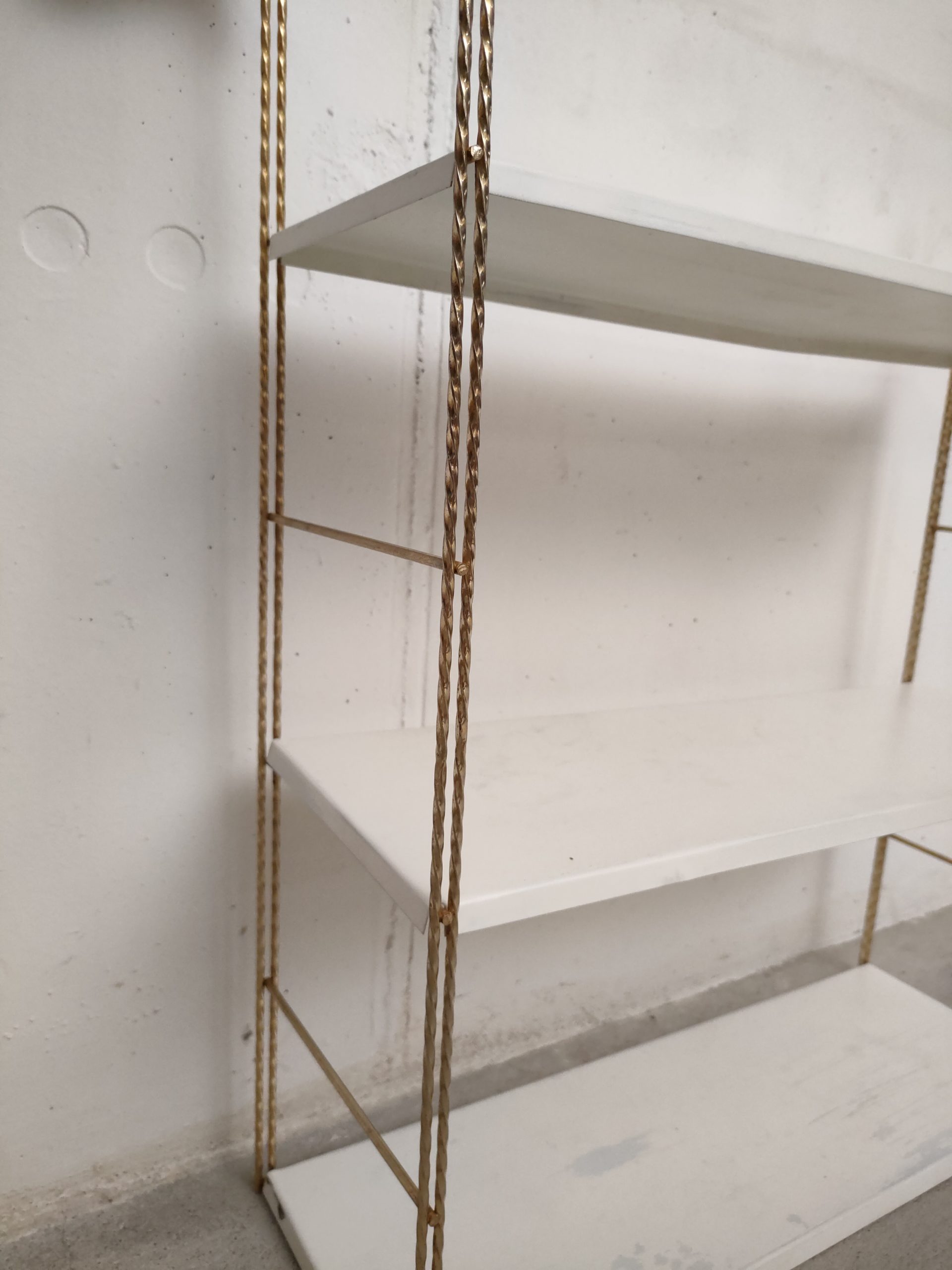 Produit venduÉtagère murale style string avec 2 portants torsadés en métal doré et 3 tablars en métal. Les tablars présentent des traces d’usure.