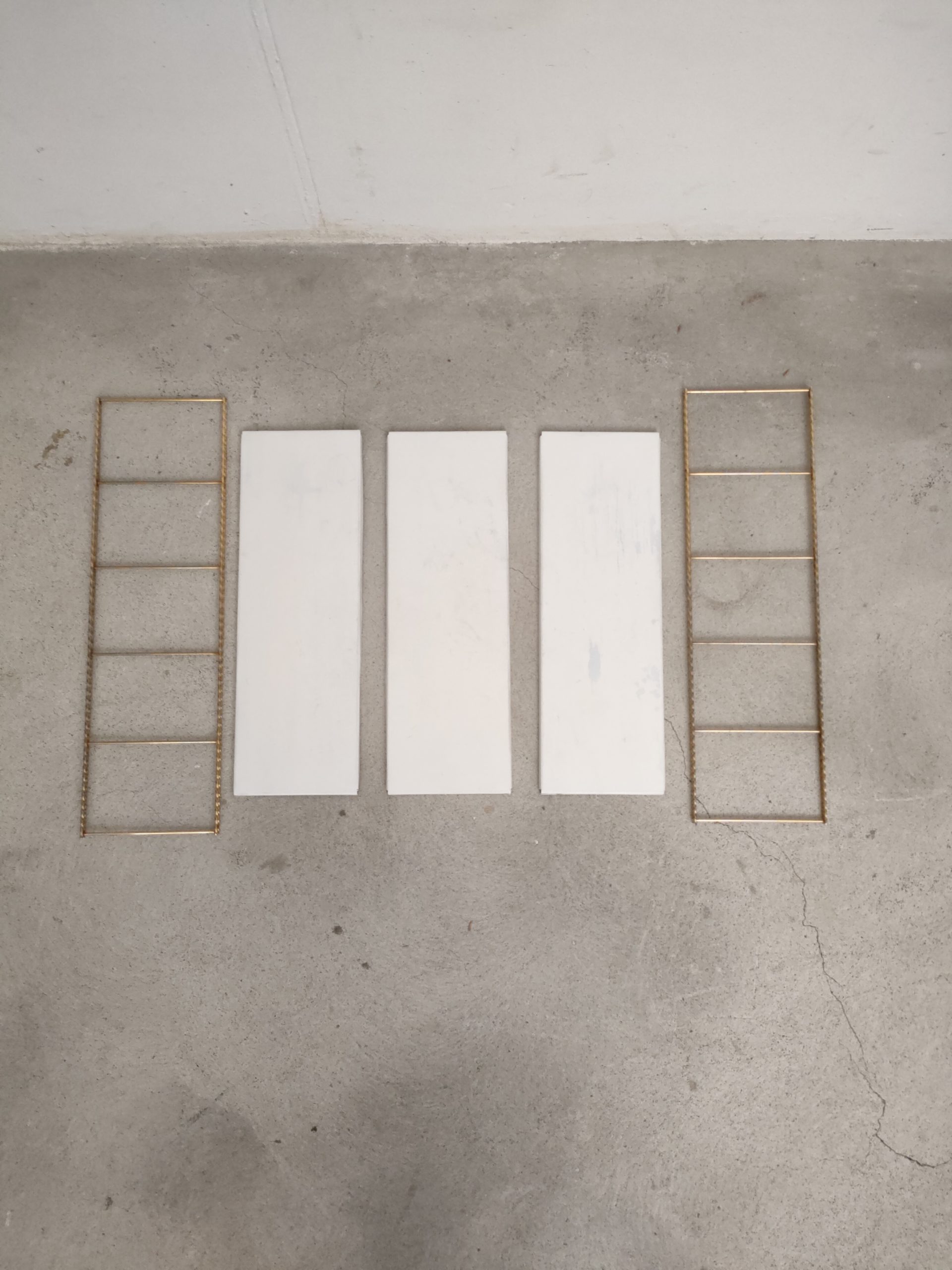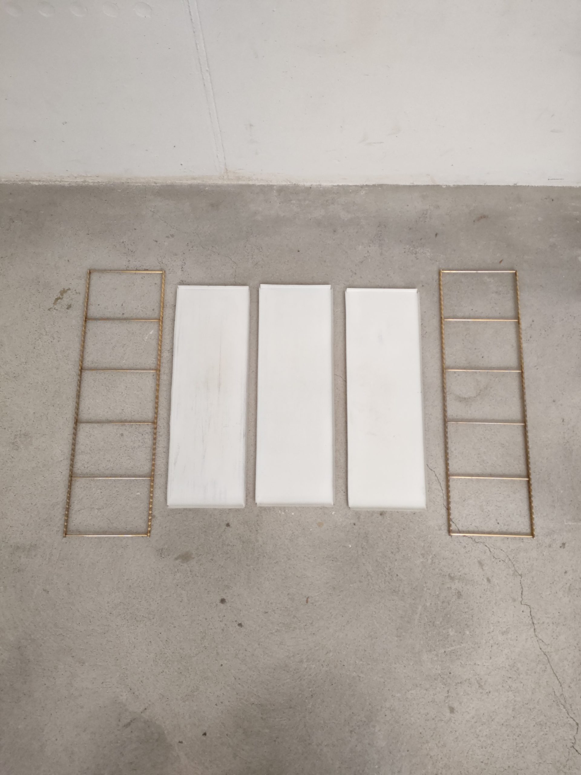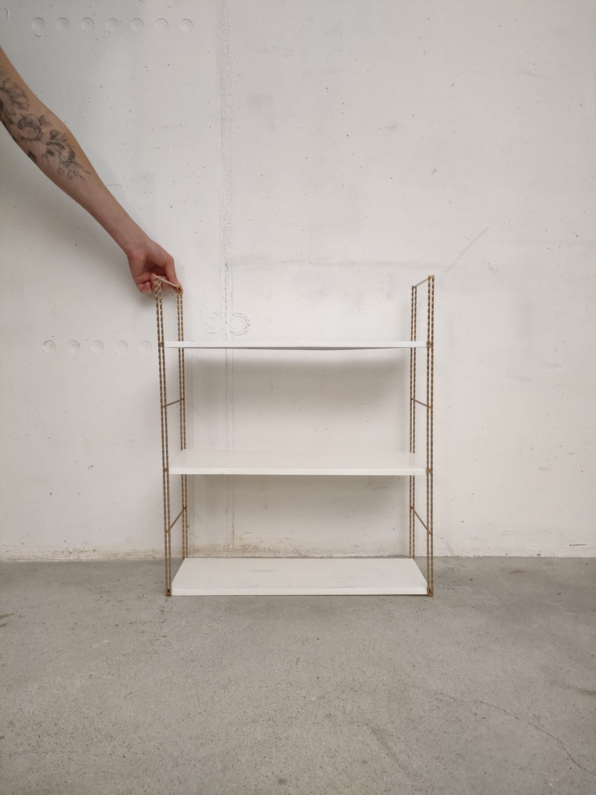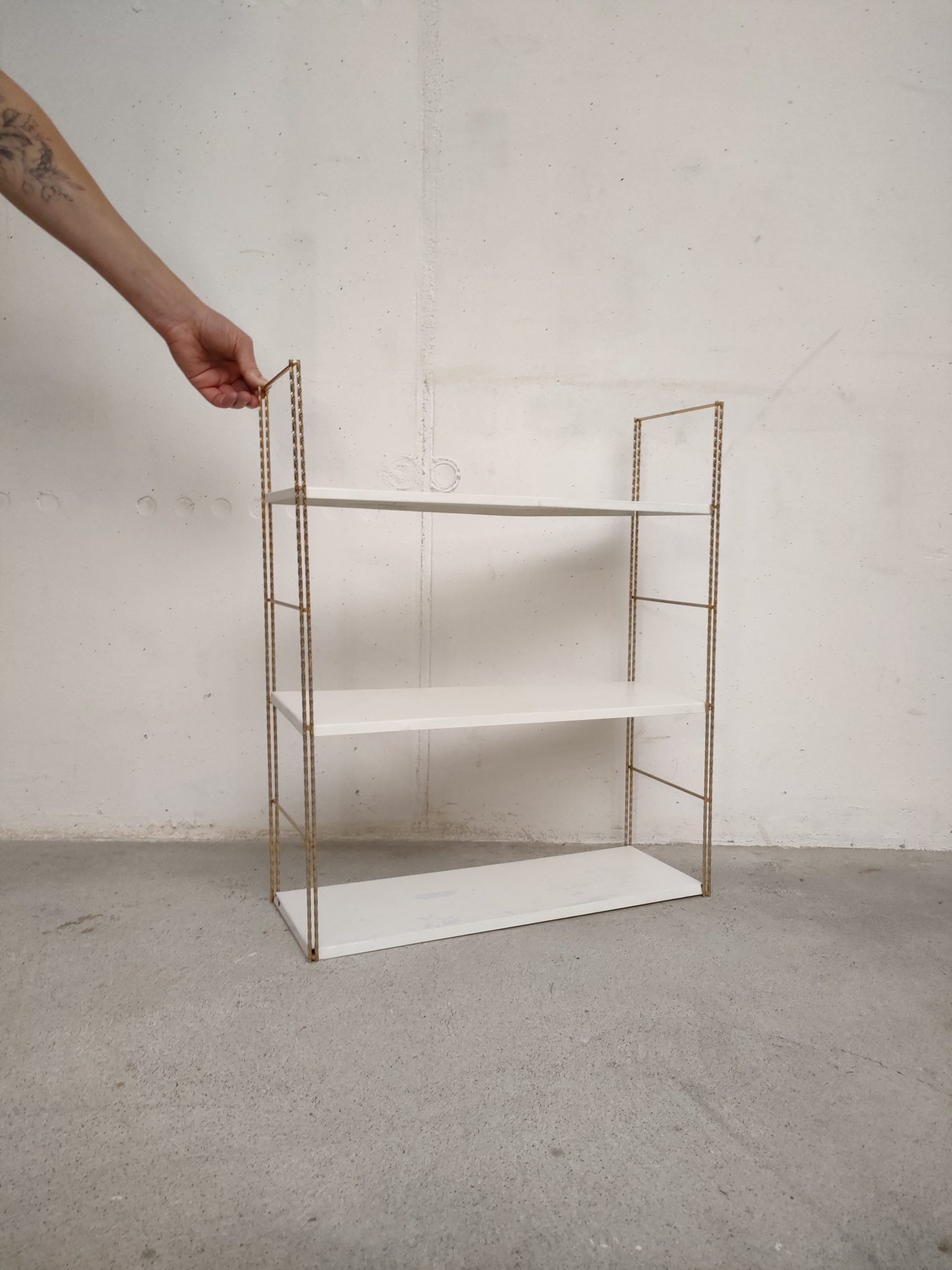 Produit venduÉtagère murale style string avec 2 portants torsadés en métal doré et 3 tablars en métal. Les tablars présentent des traces d’usure.