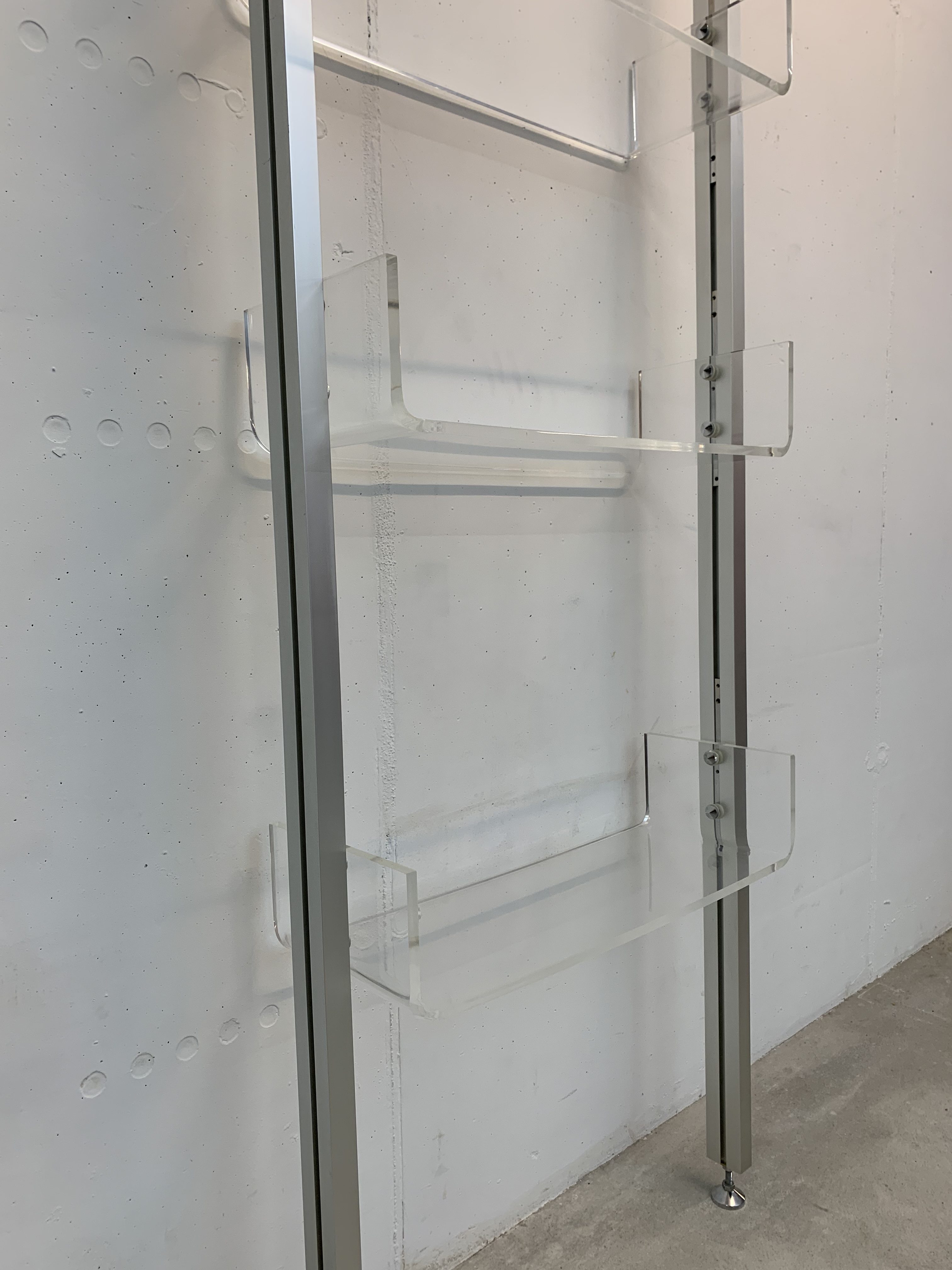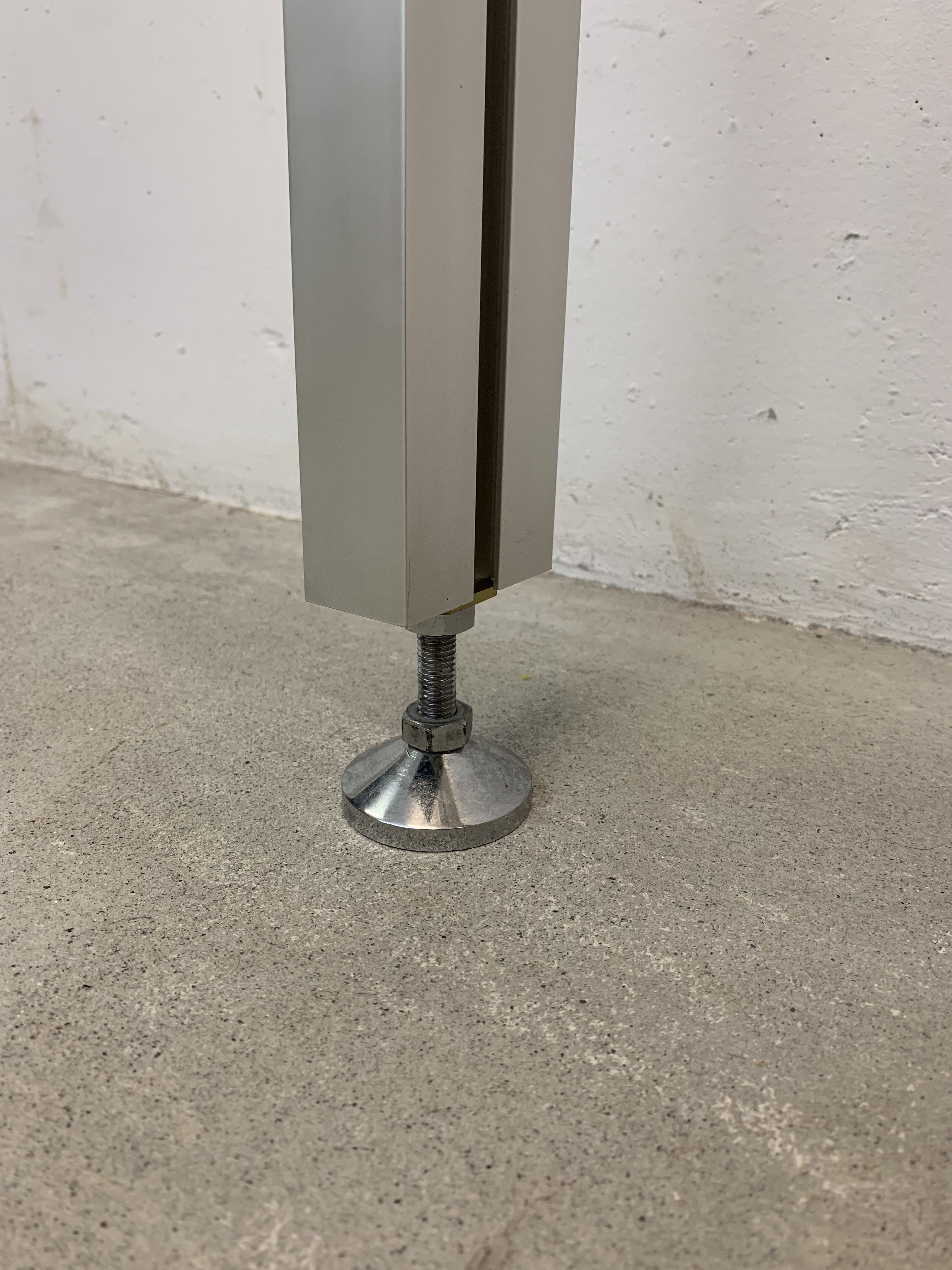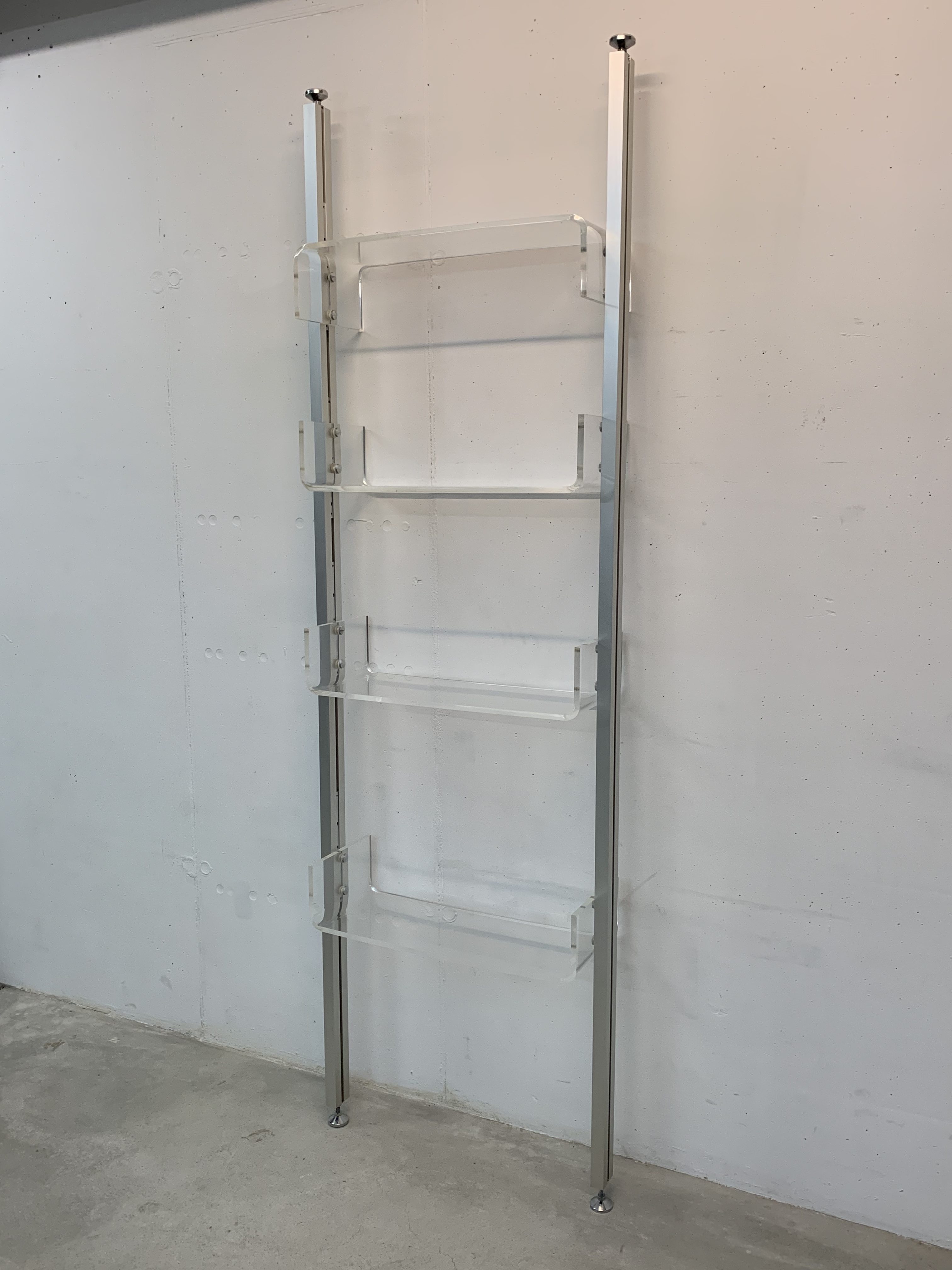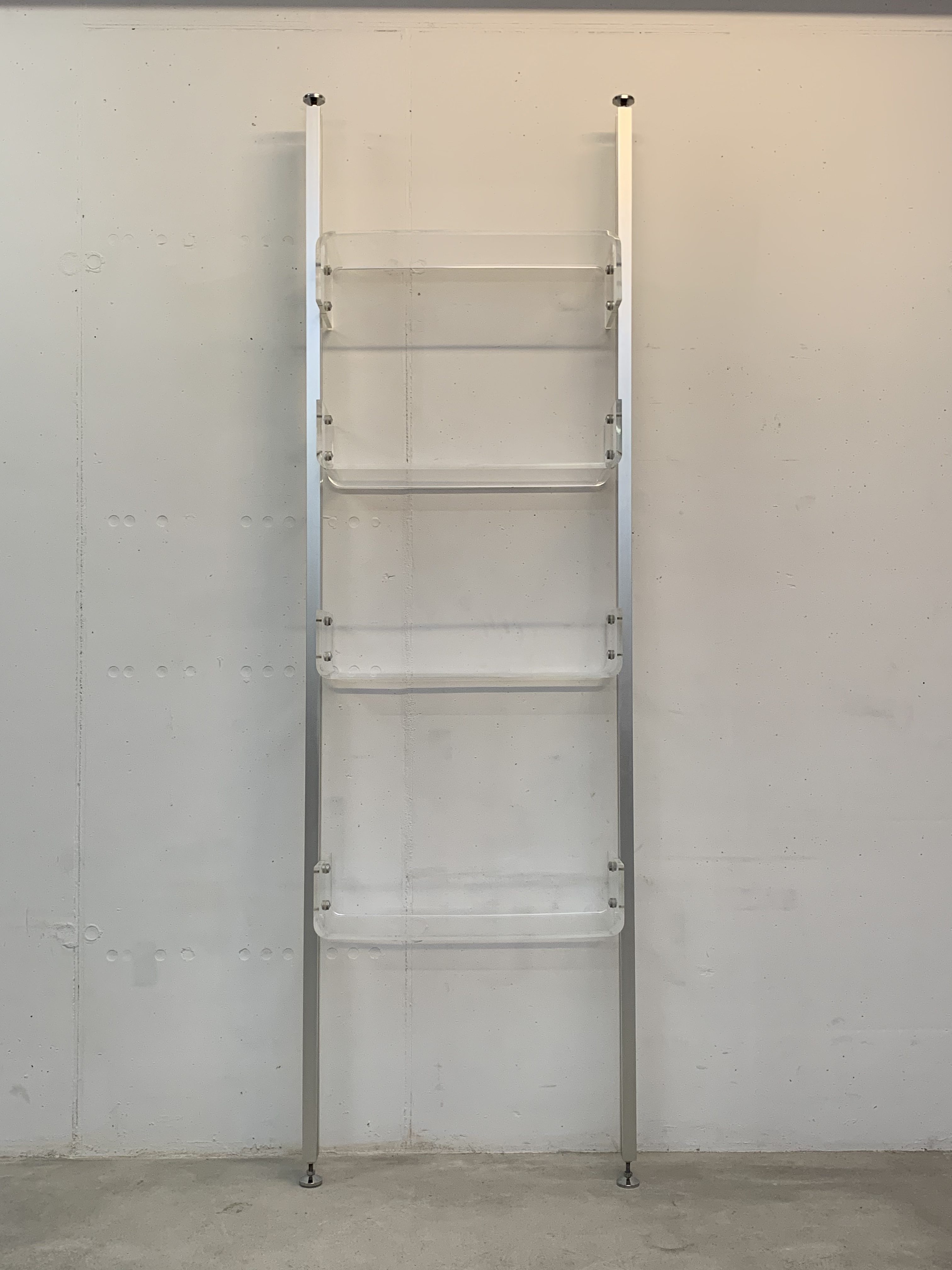 Produit venduÉtagère sol-plafond dessinée par Michel Ducaroy pour Roche Bobois en 1970. Les montants sont en aluminium et les 4 plateaux en plexiglas. Chaque plateau peut être disposé à la hauteur voulue et monté à l’envers ou à l’endroit. L’état général de l’étagère est très bon: il n’y a que de légères traces d’utilisation. Une petite rondelle en plastique manque (là où une vis tient un tablar) et a été substituée par une rondelle en carton (pratiquement invisible). Un patin en plastique sous un pied manque également, il peut facilement être remplacé par une feutrine pour ne pas abîmer le sol.