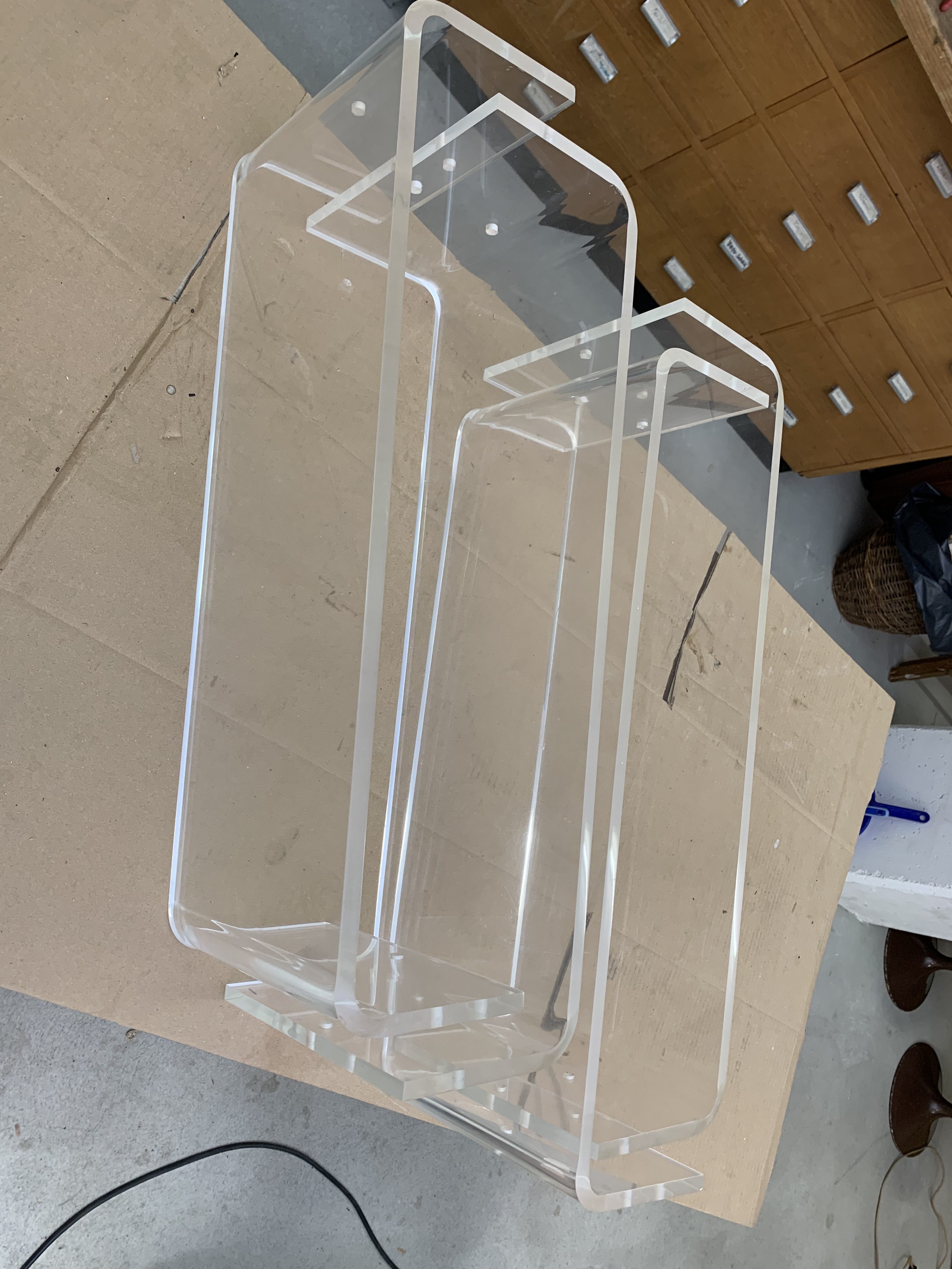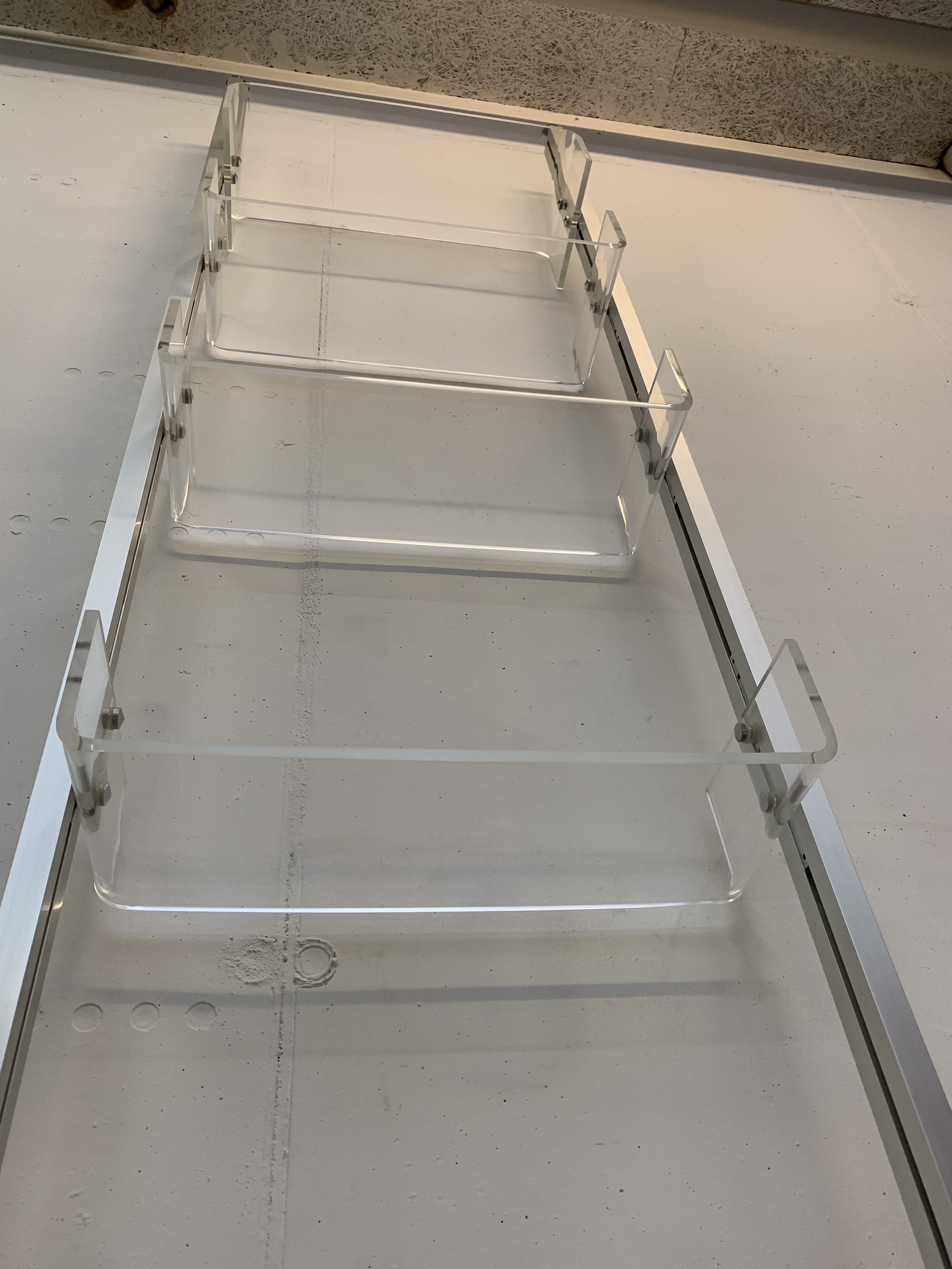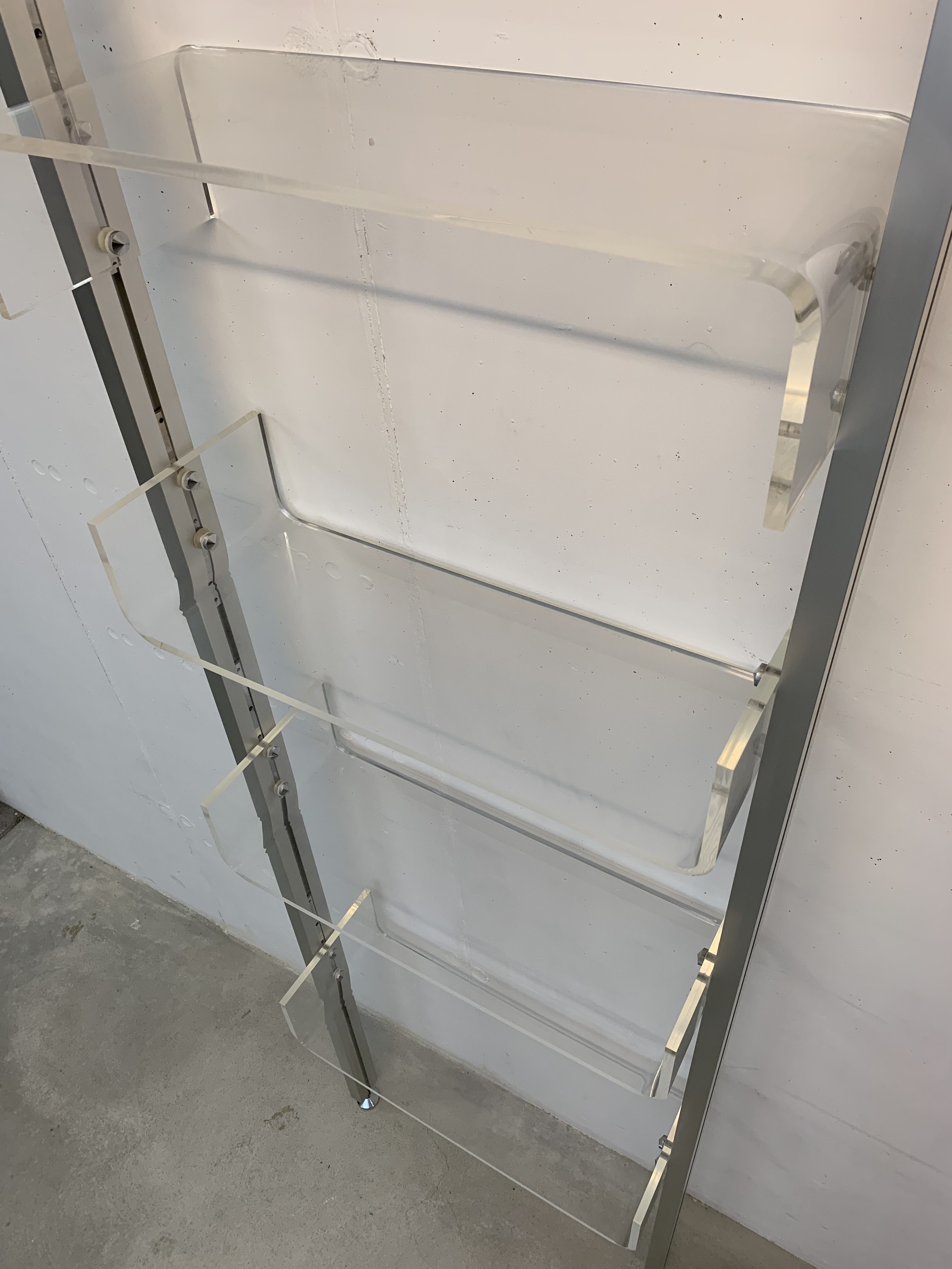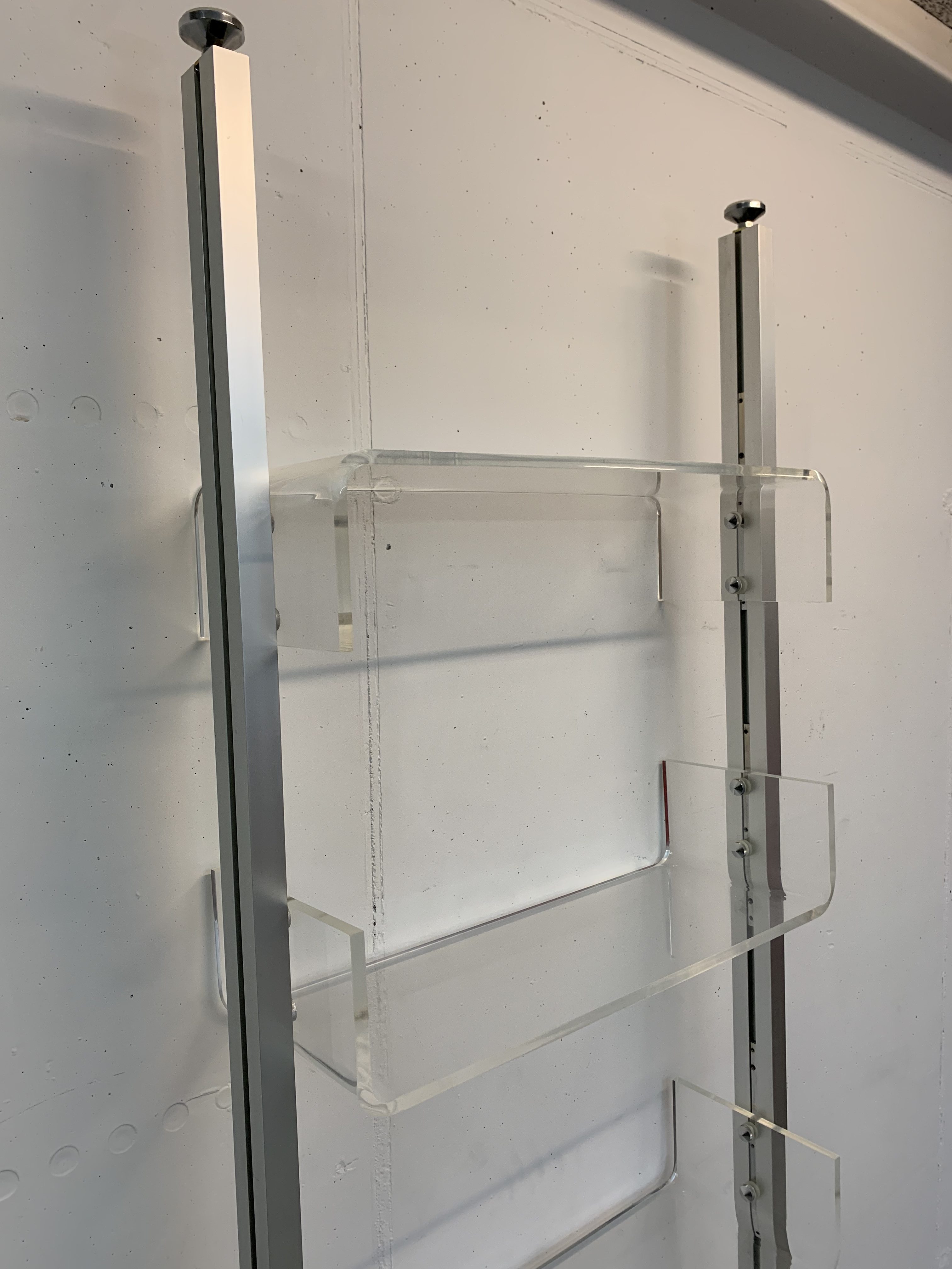 Produit venduÉtagère sol-plafond dessinée par Michel Ducaroy pour Roche Bobois en 1970. Les montants sont en aluminium et les 4 plateaux en plexiglas. Chaque plateau peut être disposé à la hauteur voulue et monté à l’envers ou à l’endroit. L’état général de l’étagère est très bon: il n’y a que de légères traces d’utilisation. Une petite rondelle en plastique manque (là où une vis tient un tablar) et a été substituée par une rondelle en carton (pratiquement invisible). Un patin en plastique sous un pied manque également, il peut facilement être remplacé par une feutrine pour ne pas abîmer le sol.