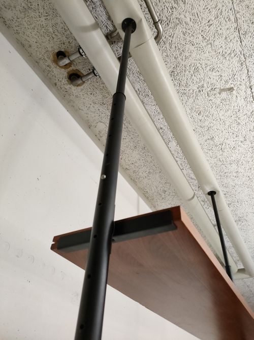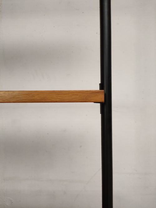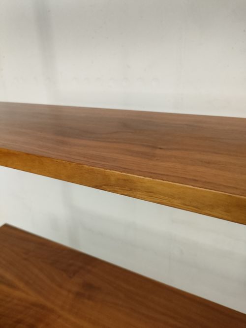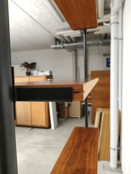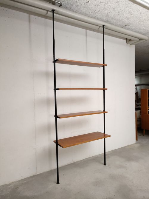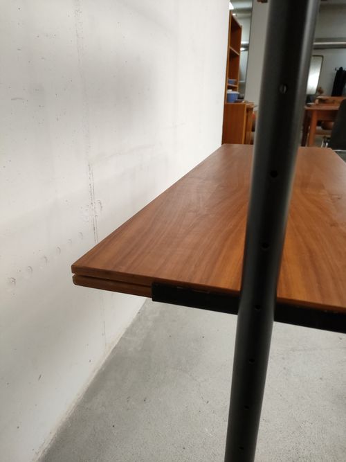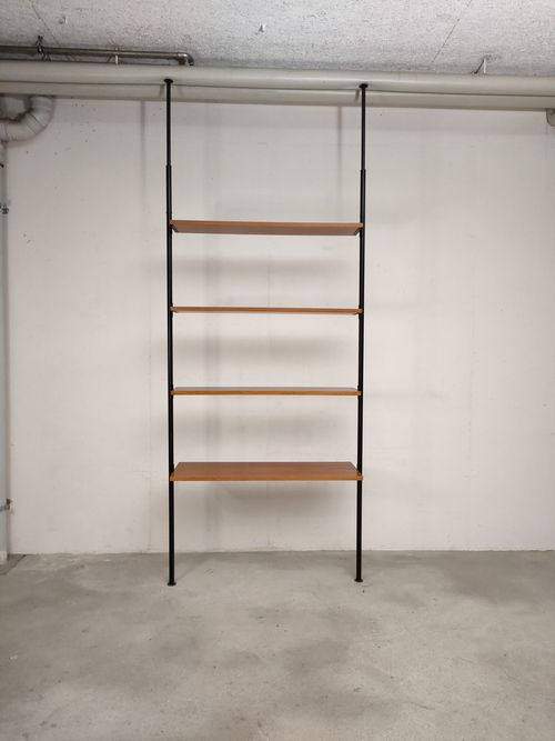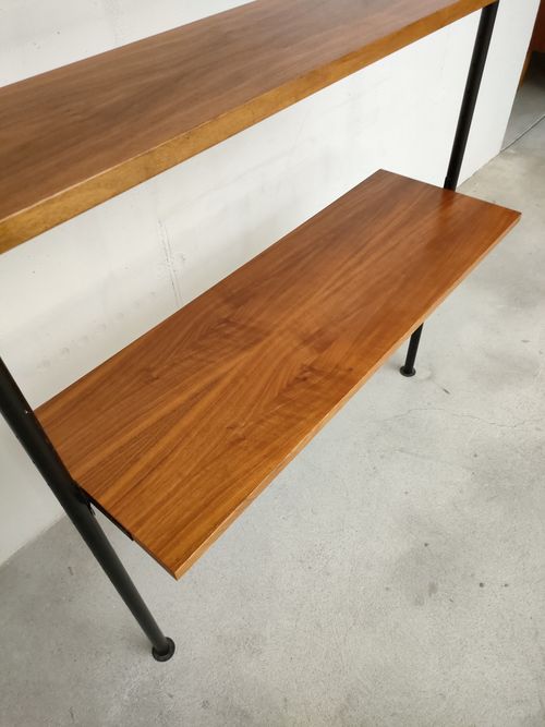 Produit venduÉtagère télescopique vintage modulable. Composée de 2 barres en métal réglables (hauteur min : 240 cm, max : 280 cm) et de 4 tablars en bois. Le bois des tablars est élégant, en bon état et d’une belle couleur. 3 tablars mesurent 22 cm de profondeur, le dernier 36 cm. Les tablars étaient à l’origine prévus pour un autre système de fixation, les parties à l’arrière des bords des tablars présentent des cavités (voir photos). Malgré cela elles sont parfaitement adaptés aux barres et aux systèmes de fixation actuels et l’étagère est parfaitement stable et fonctionnelle.