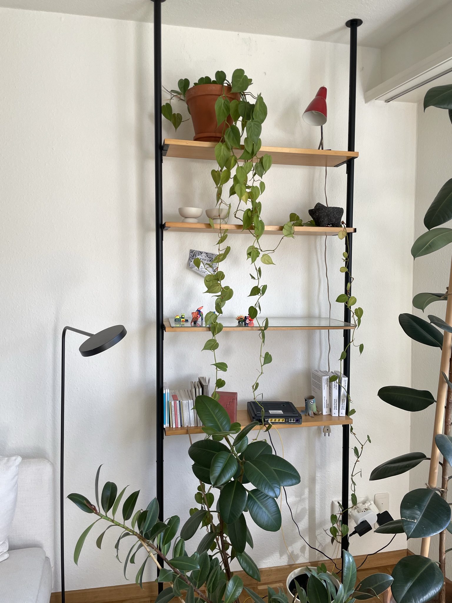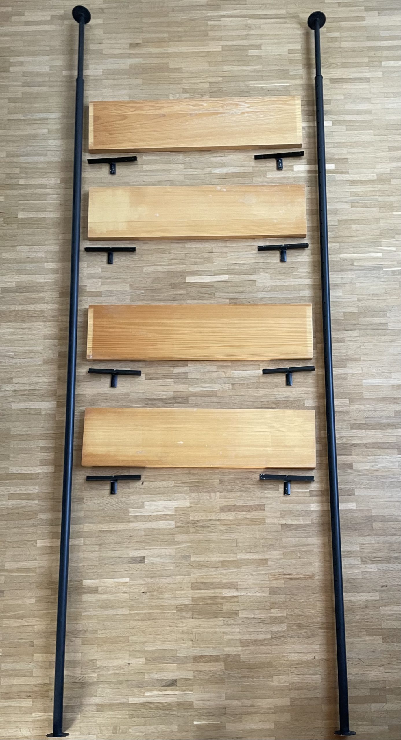 Produit venduEtagère télescopique vintage avec montants tubulaires noir mat et 4 tablars en bois plaqué hêtre. Réglable en hauteur env. 235 à 260 cm.
