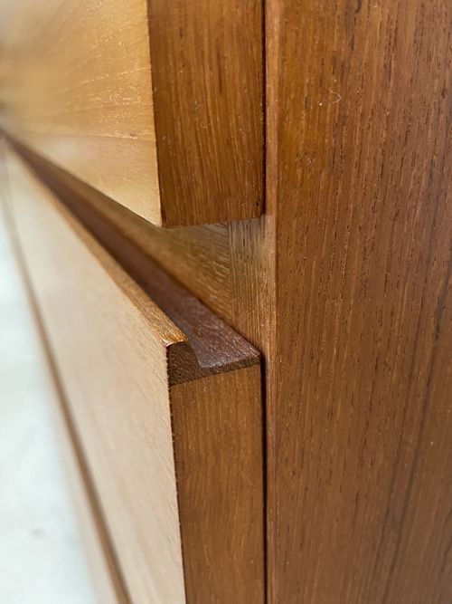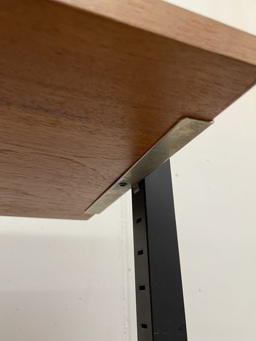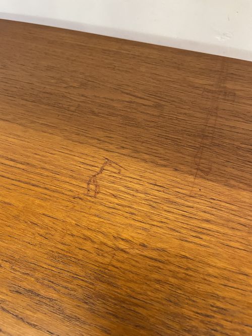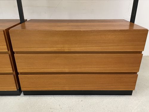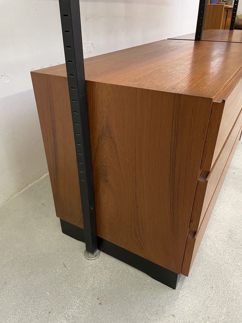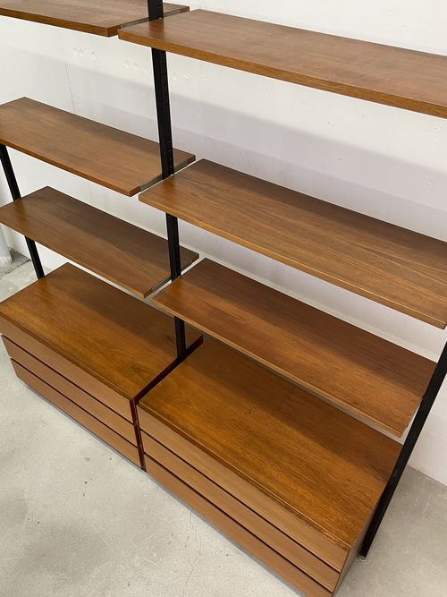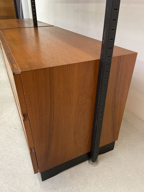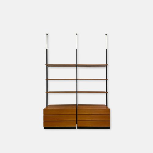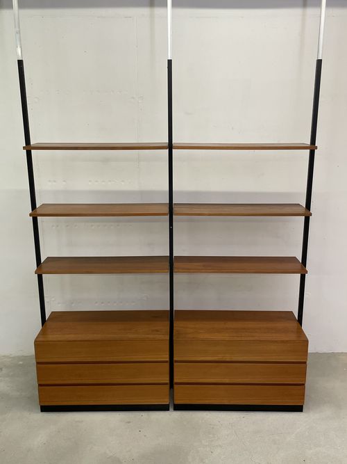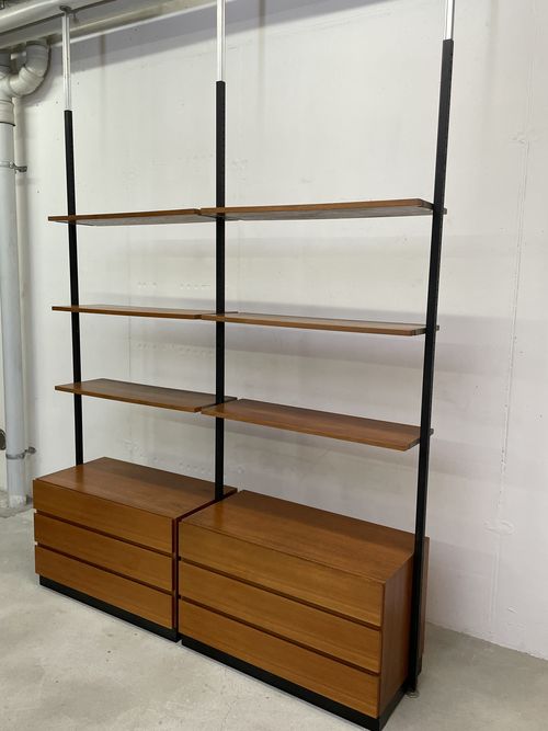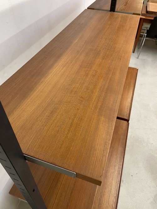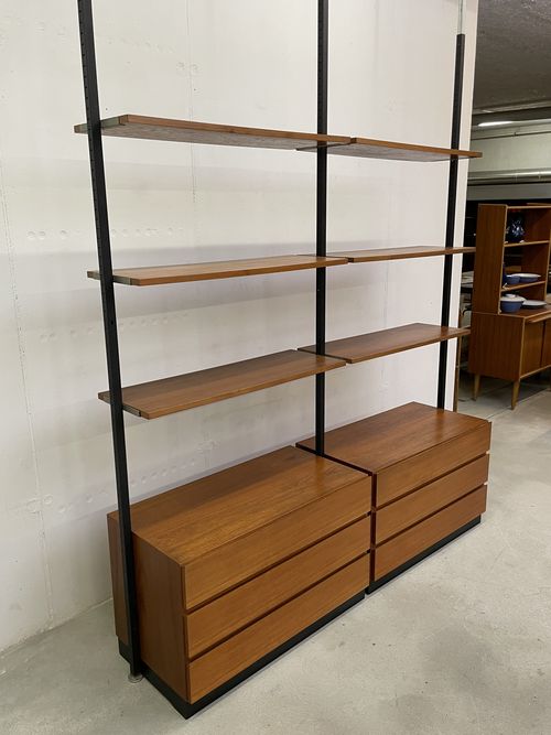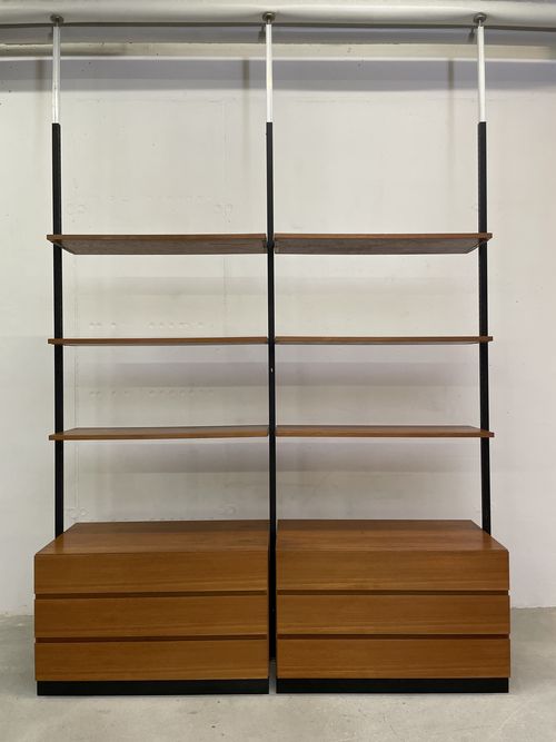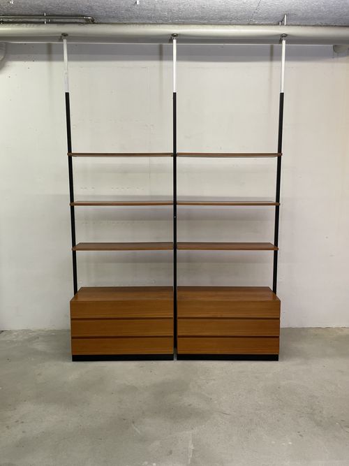 Produit venduÉtagère télescopique vintage comprenant 3 barres, 2 modules à tiroirs et 6 tablars. Convient pour les plafonds de 230 à 280 cm environ. Les tablars peuvent être disposés à la hauteur souhaitée; ils mesurent chacun 30×88 cm. Le bois est du teck et, hormis quelques traces d’utilisation plutôt légères, est en bon état. Les montants comportent également quelques griffures et des éclats dans la peinture noire. L’ensemble reste très bien conservé pour son âge!