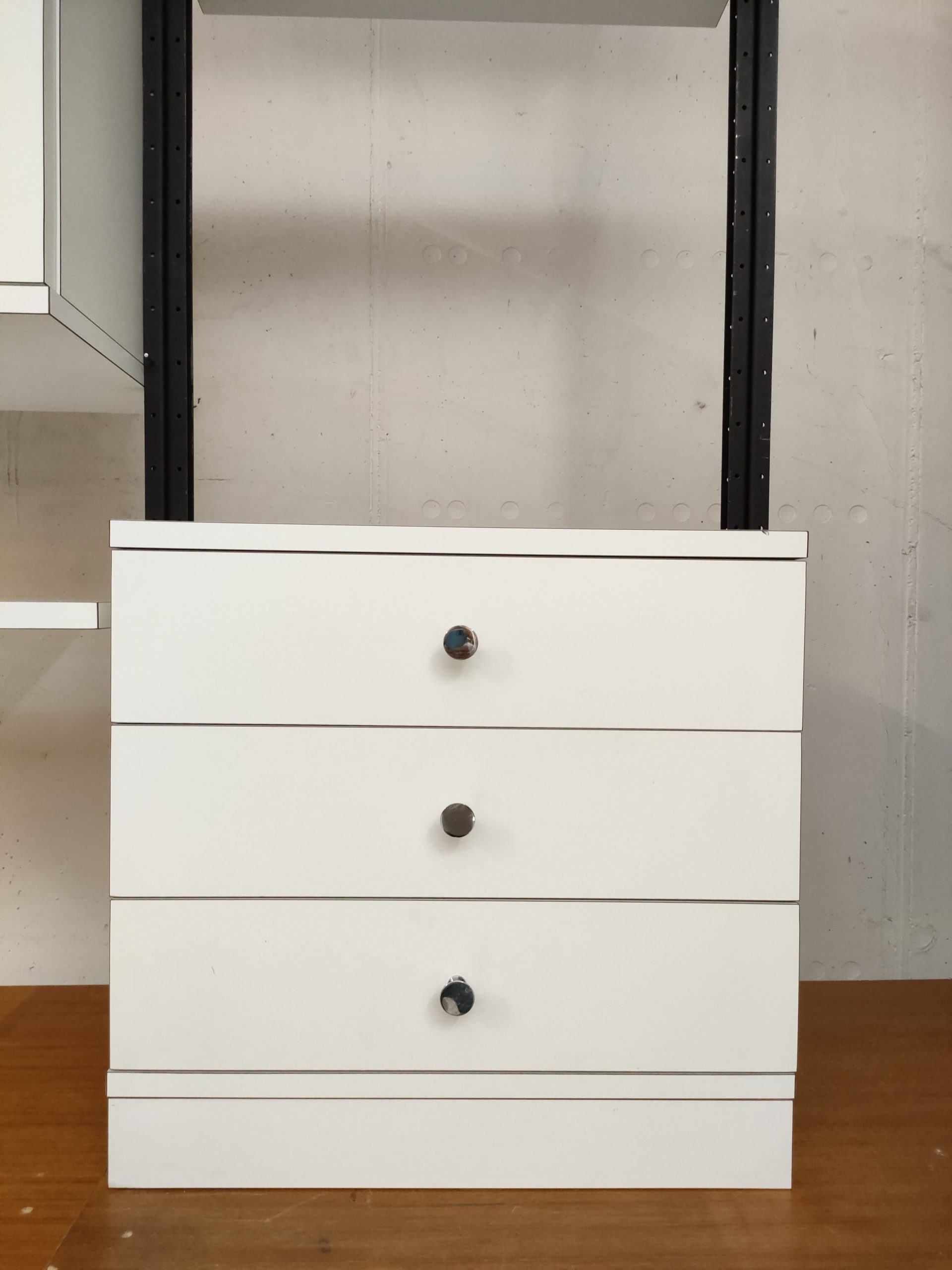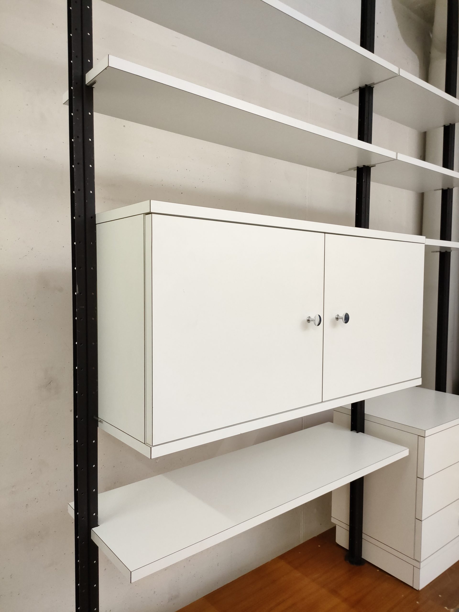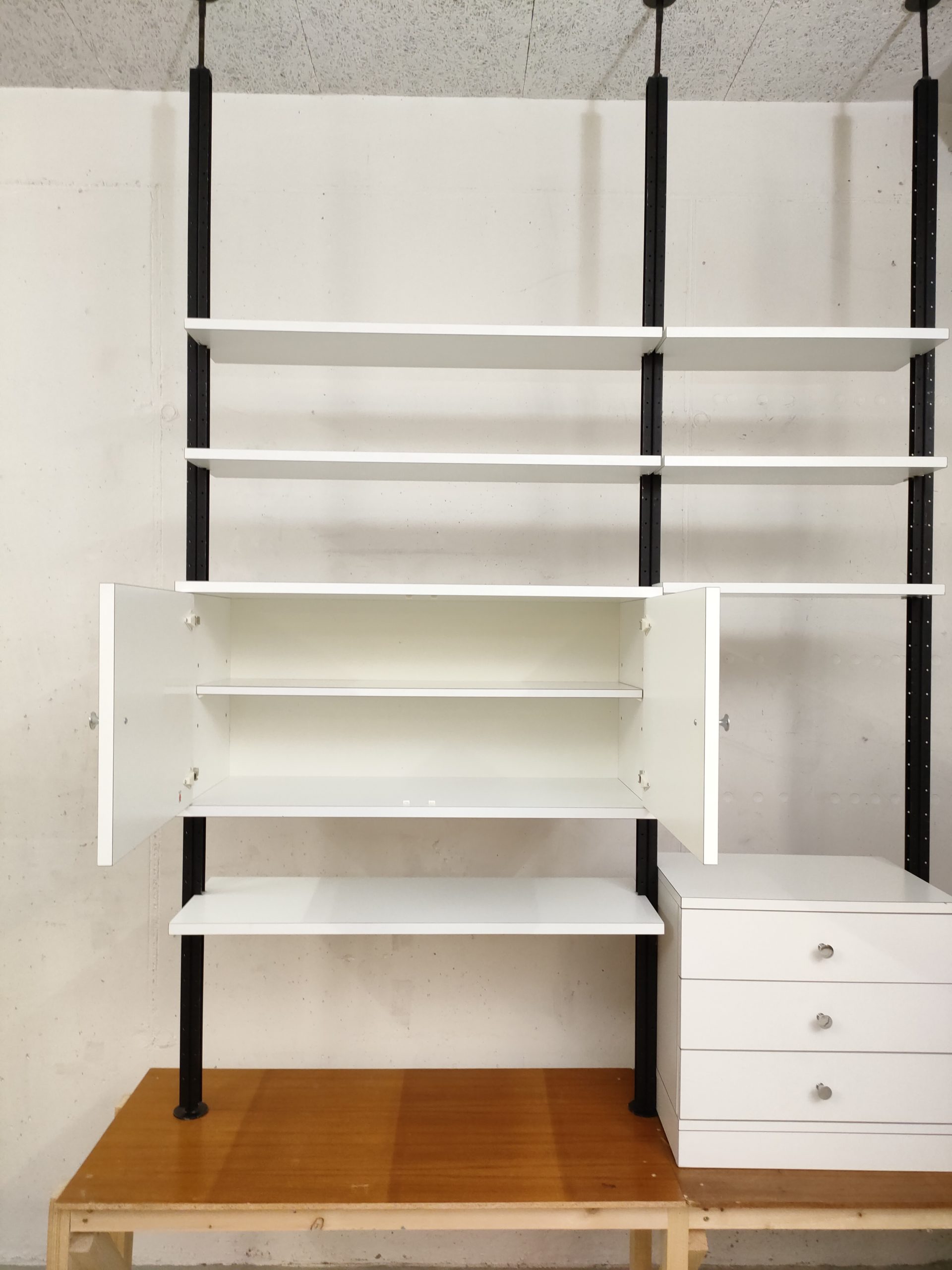 Produit venduÉtagère télescopique vintage modulable produite par le fabricant suisse Victoria Möbel. Dotée de 3 barres en métal noir avec hauteur réglable (min 220 cm, max 260 cm) et de six tablars (3 de 55 cm et 3 de 93 cm). Un module de rangement supérieur avec portes et étagère à l’intérieur et un module de rangement inferieur avec 3 tiroirs complètent cette étagère télescopique. Quelques traces s’usure sur les barres et sur le module de rangement avec tiroirs (voir photos) mais bon état général. Stable et solide et parfaitement fonctionnelle.