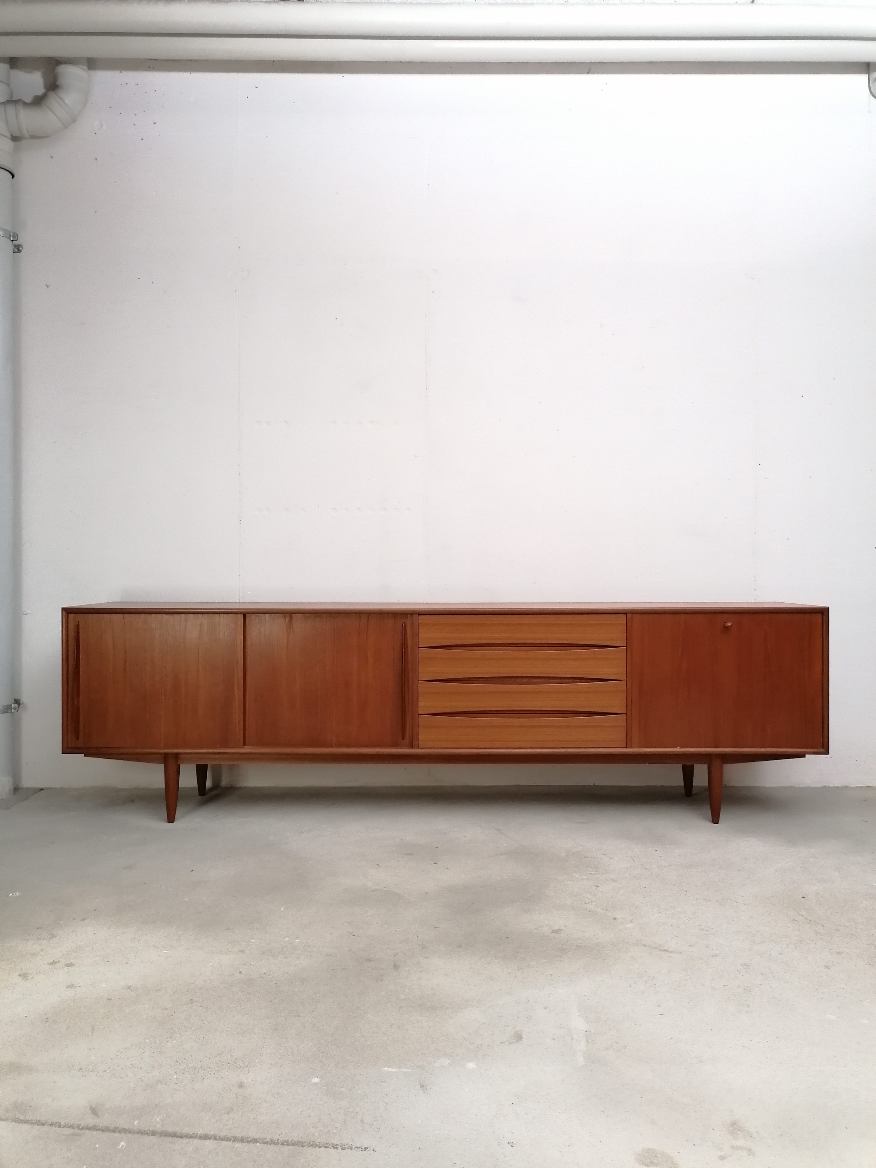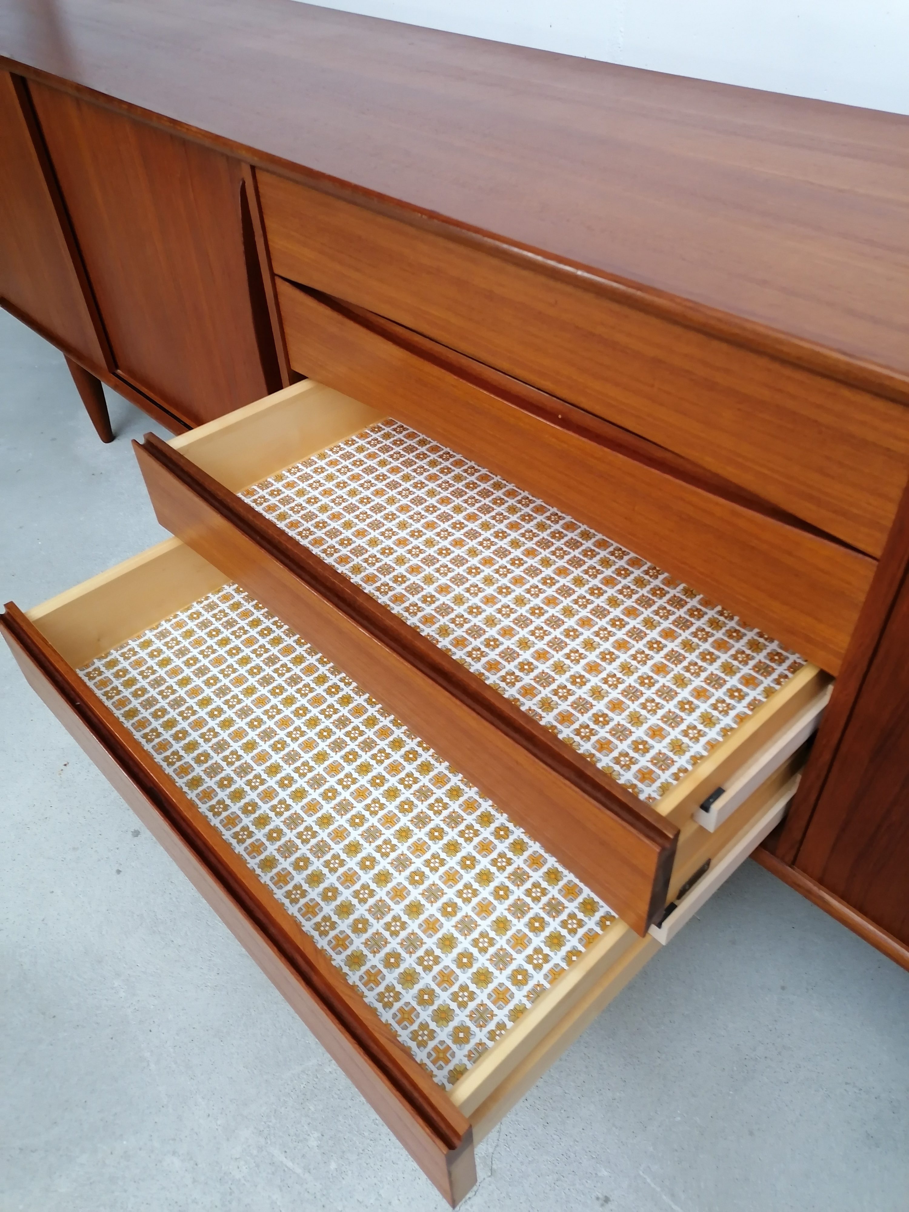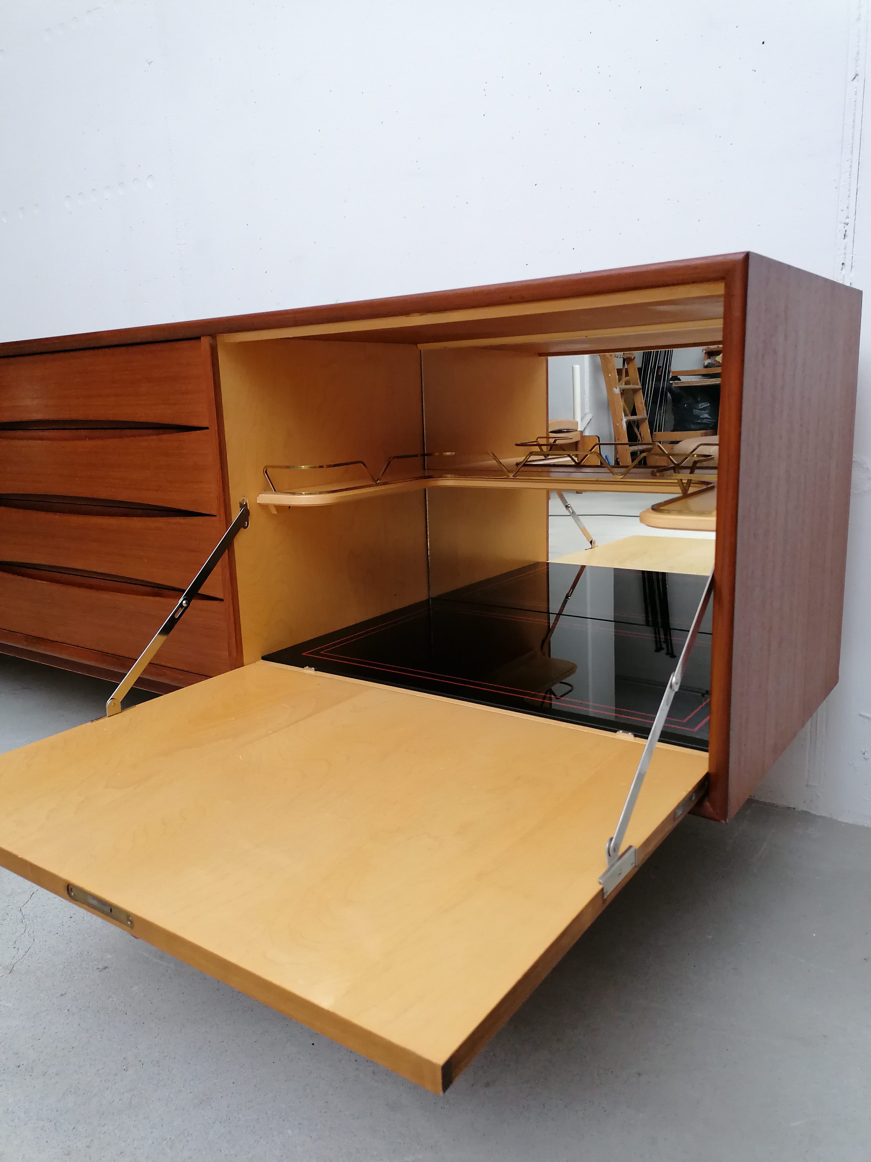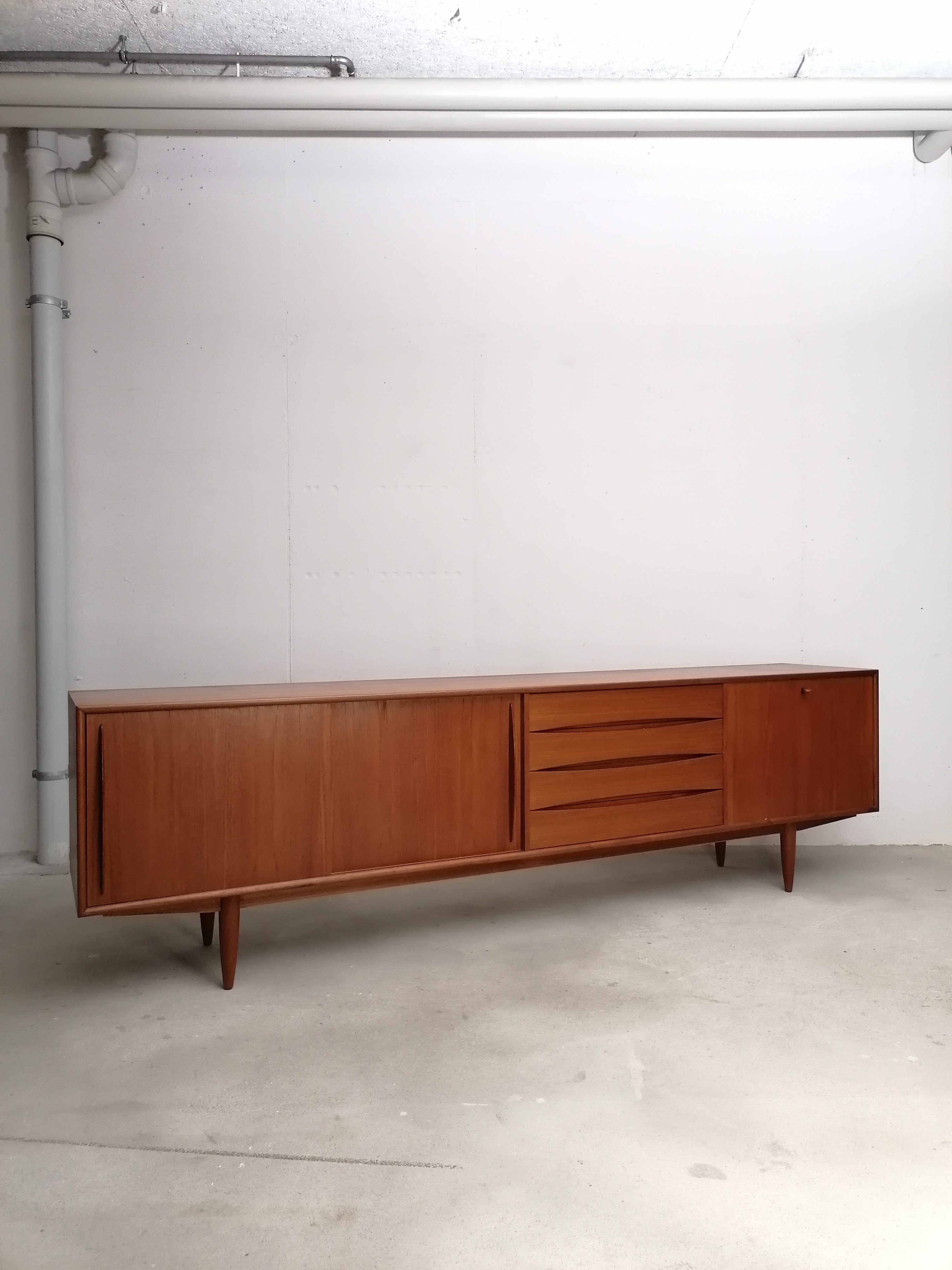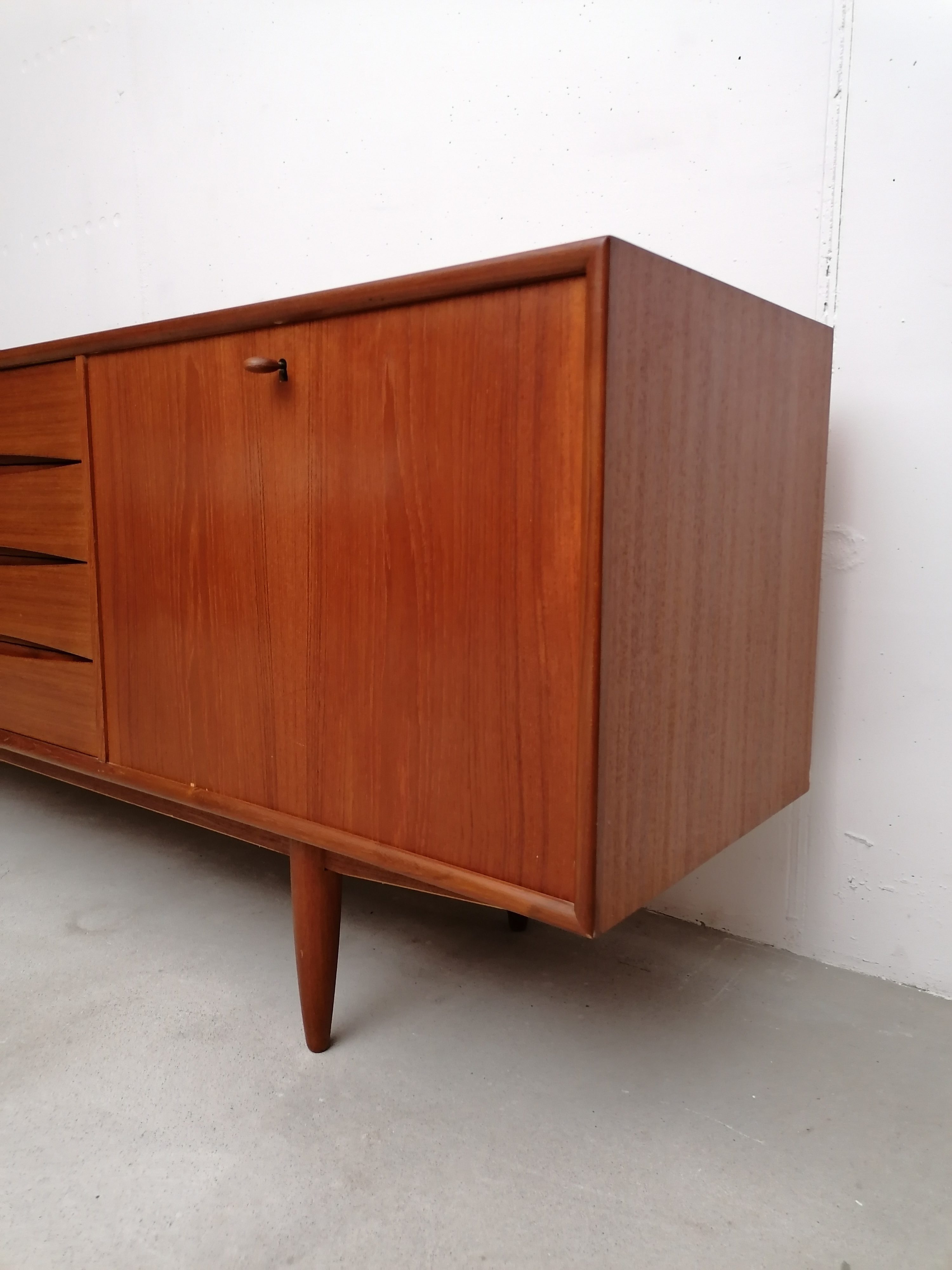 Produit venduGrand sideboard (260 cm) vintage des années 60. En teck avec un très élégant piètement et des très jolis bord arrondis. À gauche on retrouve deux portes coulissantes avec une étagère à l’intérieur. Dans la partie centrale 4 tiroirs avec papier d’origine. À droite un espace bar avec plateau en verre noir, miroir sur le fond et un support en bois pour ranger les verres. Quelques légères traces d’usure sur le bois (visibles sur les photos). Le sideboard est stable et solide et très élégant.