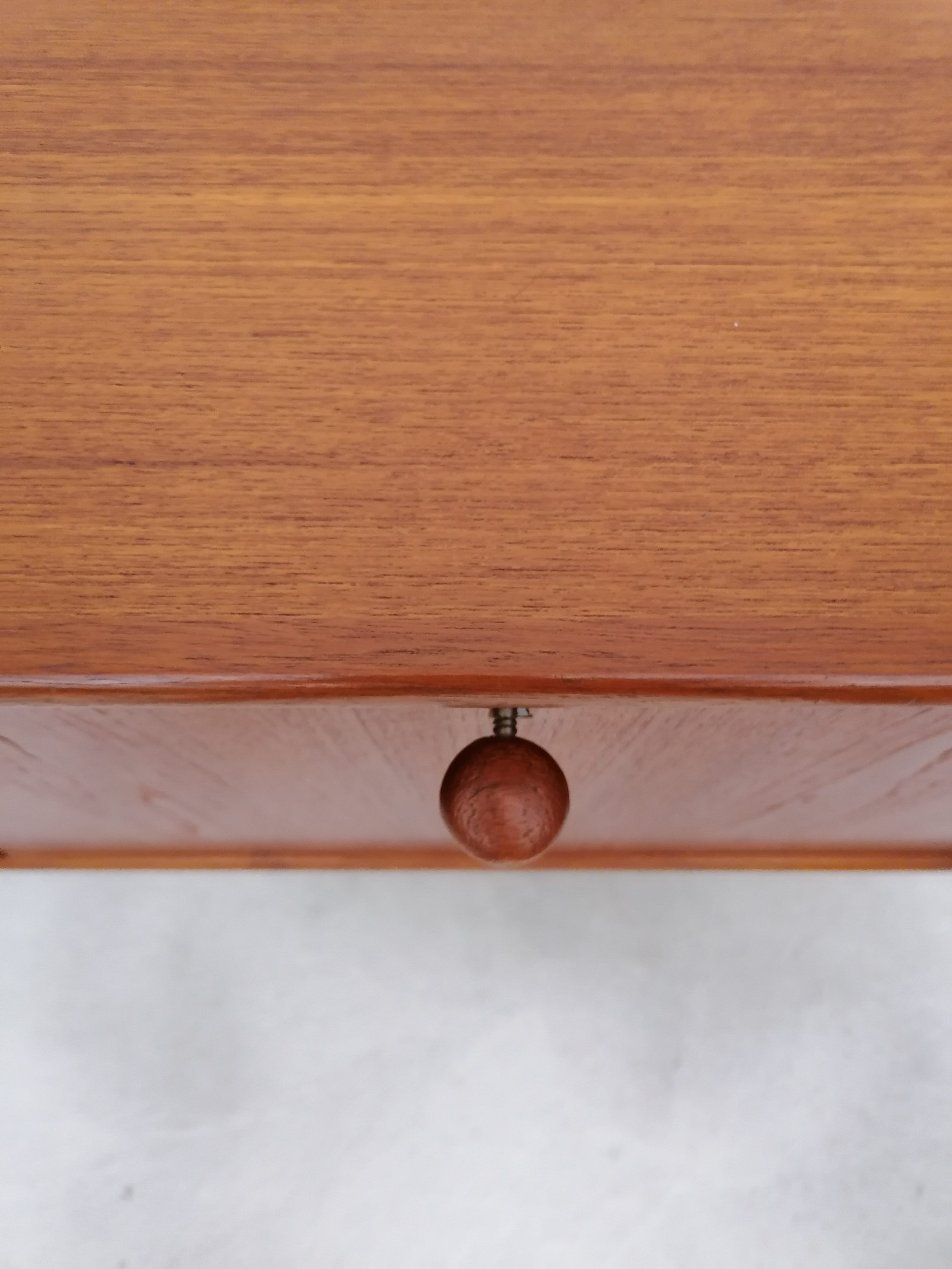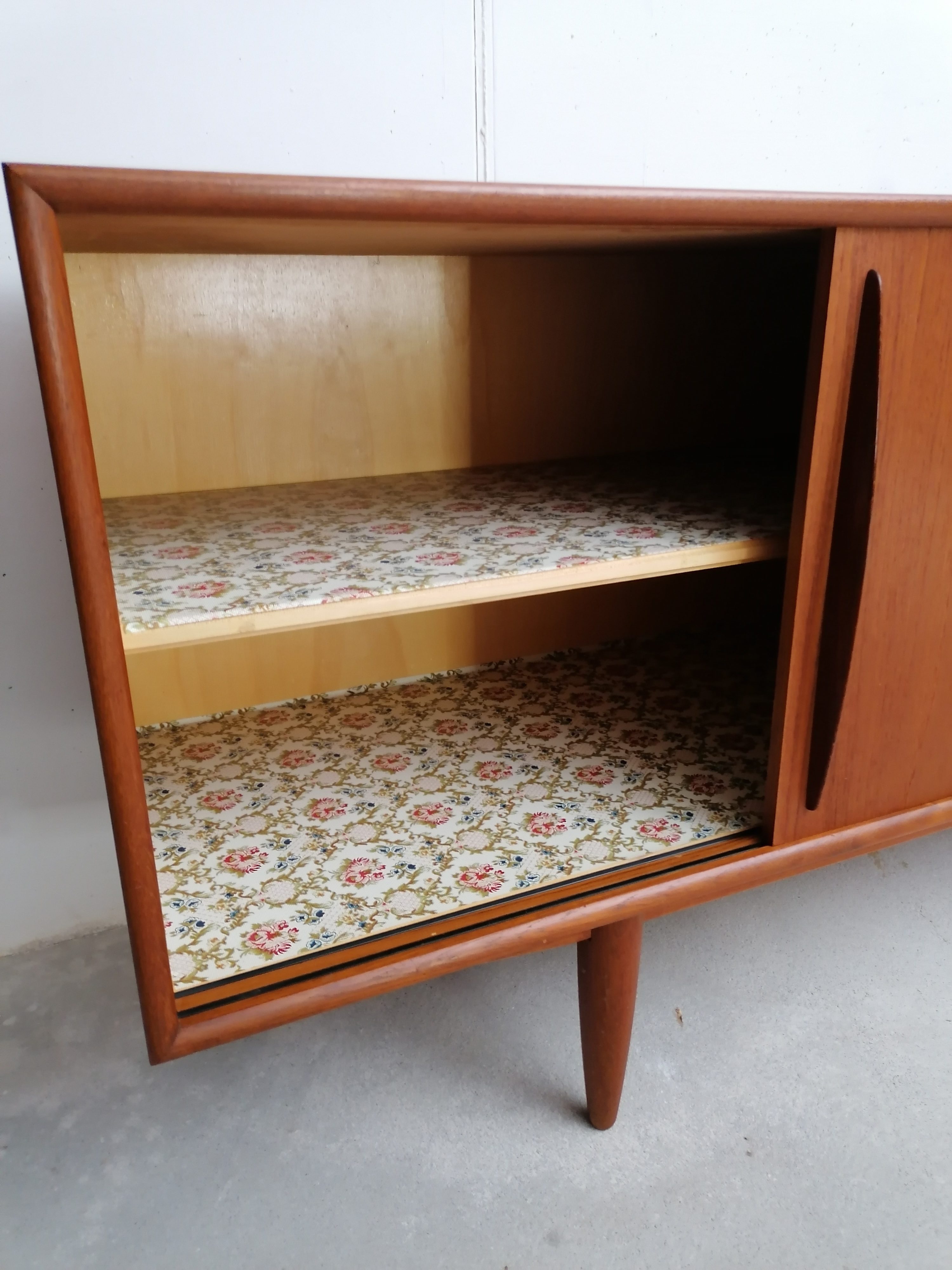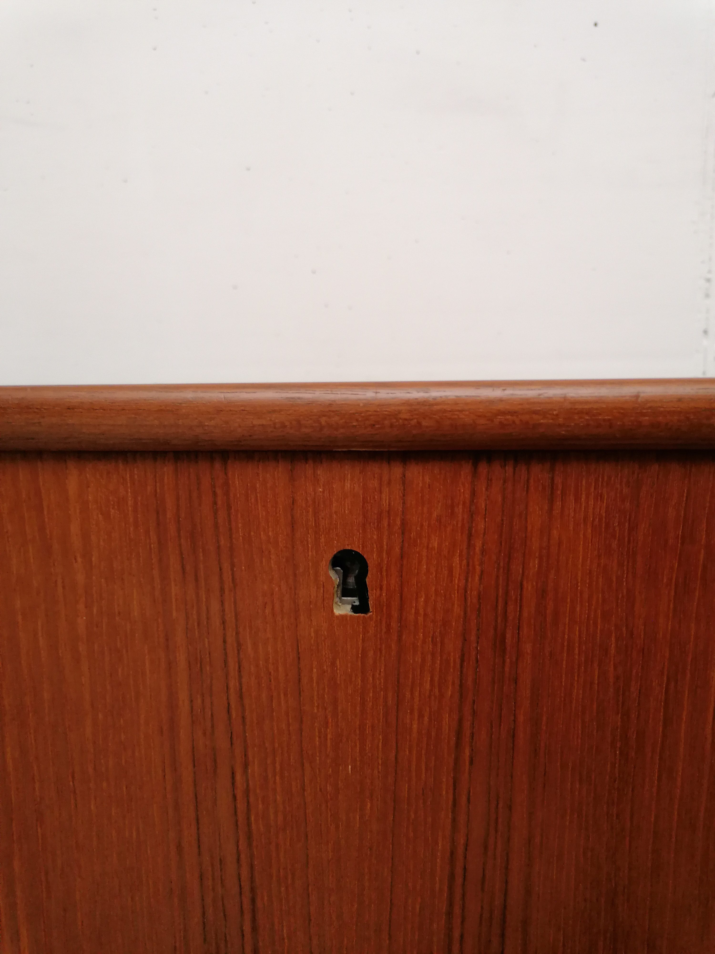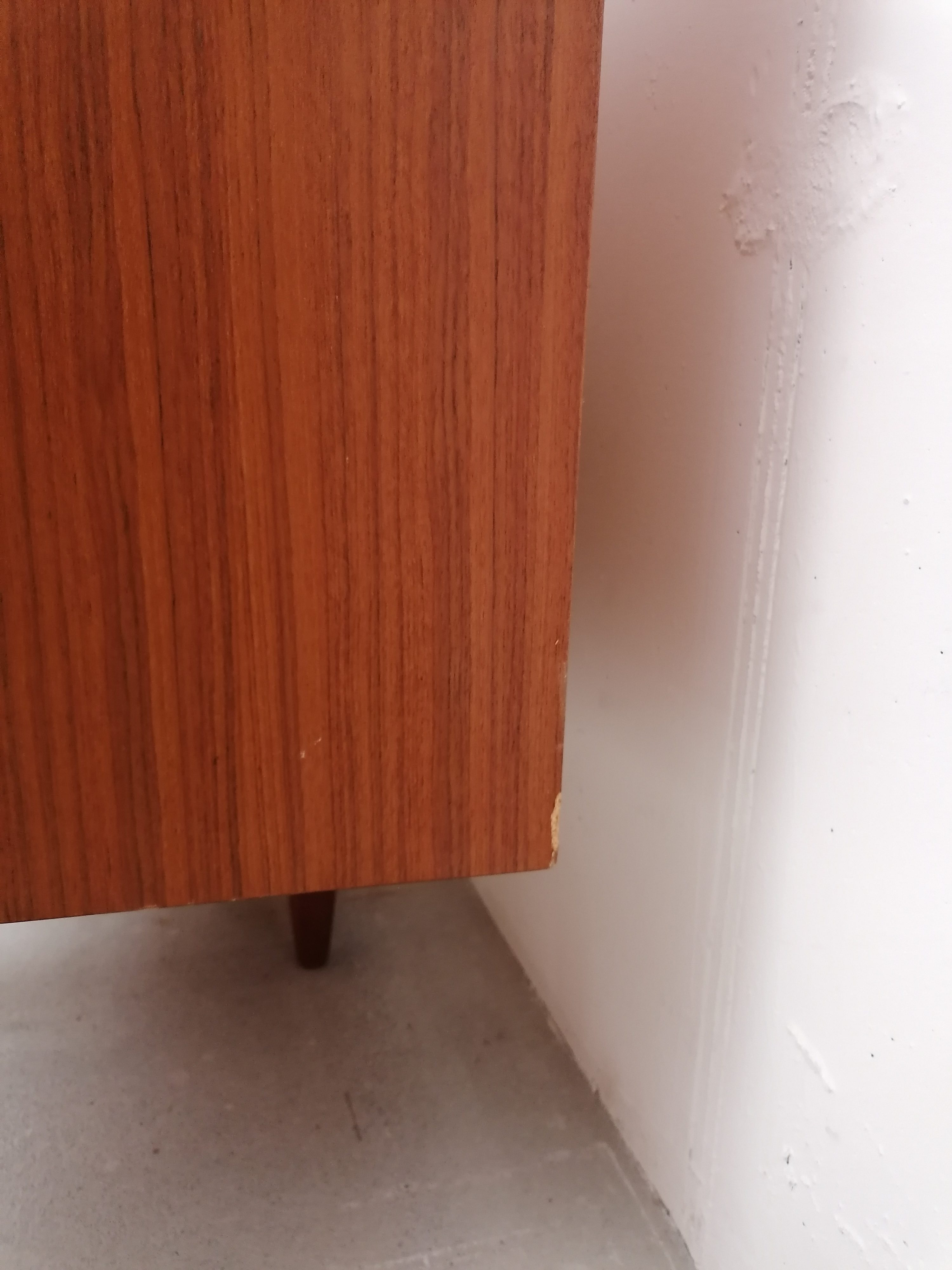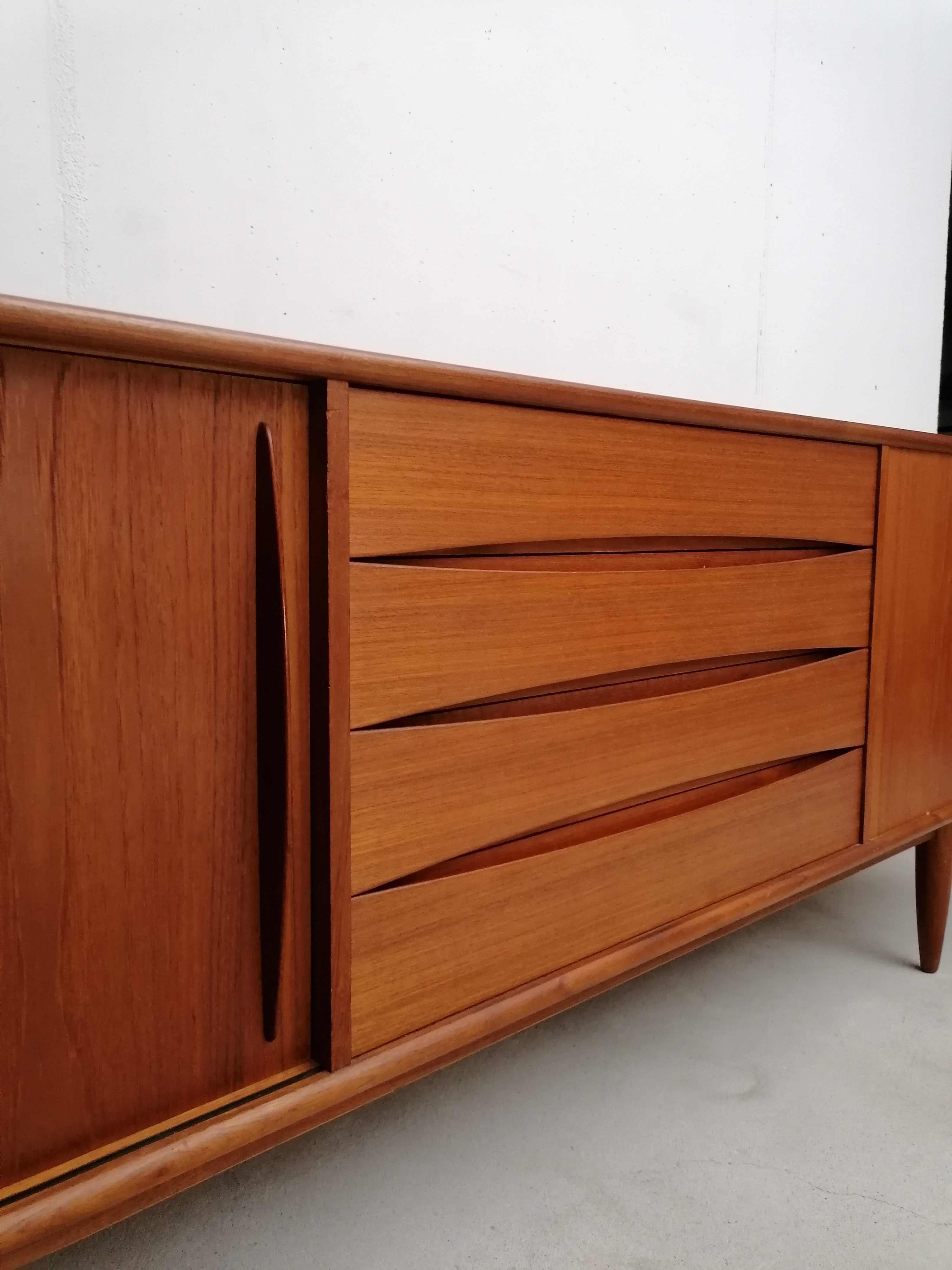 Produit venduGrand sideboard (260 cm) vintage des années 60. En teck avec un très élégant piètement et des très jolis bord arrondis. À gauche on retrouve deux portes coulissantes avec une étagère à l’intérieur. Dans la partie centrale 4 tiroirs avec papier d’origine. À droite un espace bar avec plateau en verre noir, miroir sur le fond et un support en bois pour ranger les verres. Quelques légères traces d’usure sur le bois (visibles sur les photos). Le sideboard est stable et solide et très élégant.