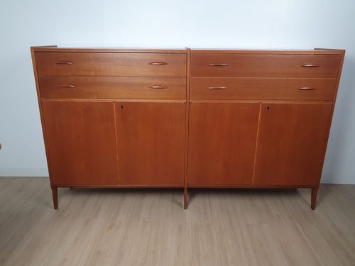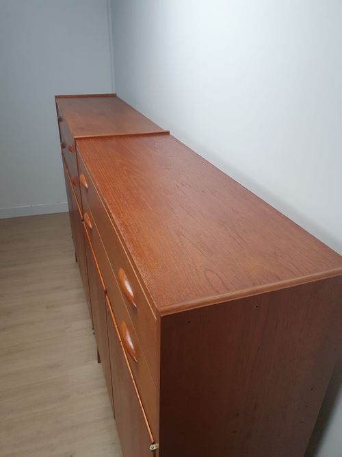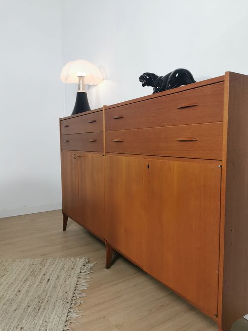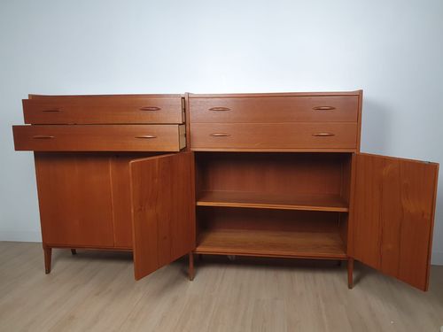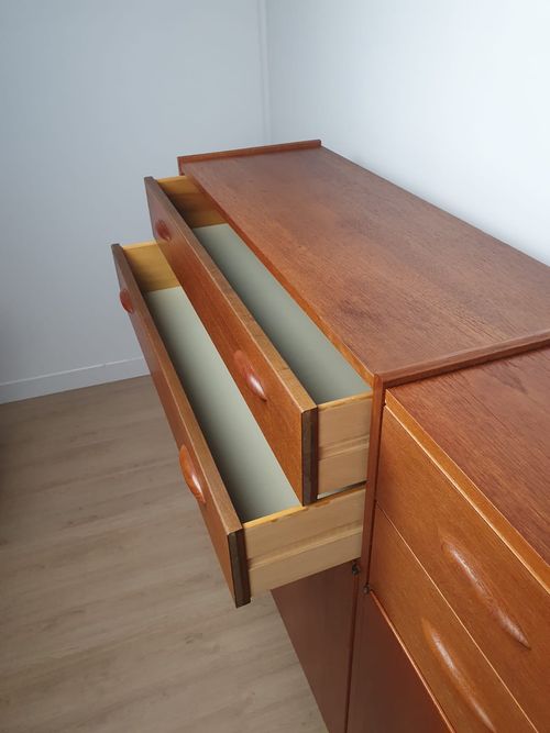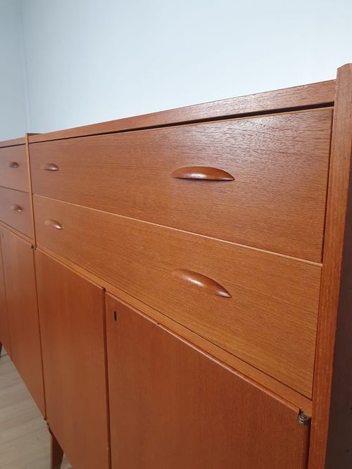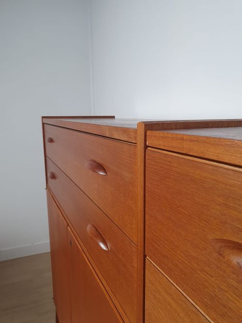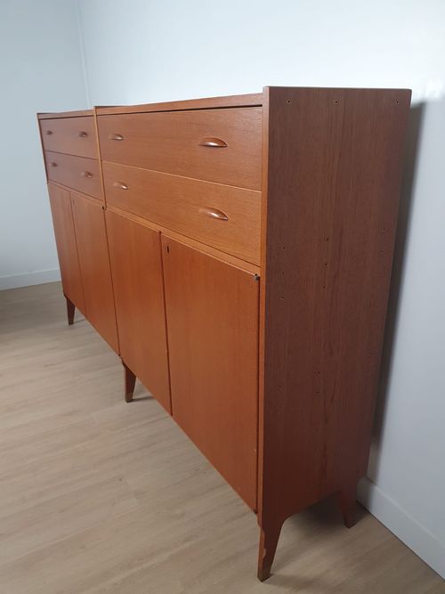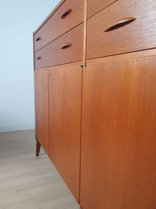 Produit venduHighboard en teck scandinave des années 60 avec tiroirs et placards.