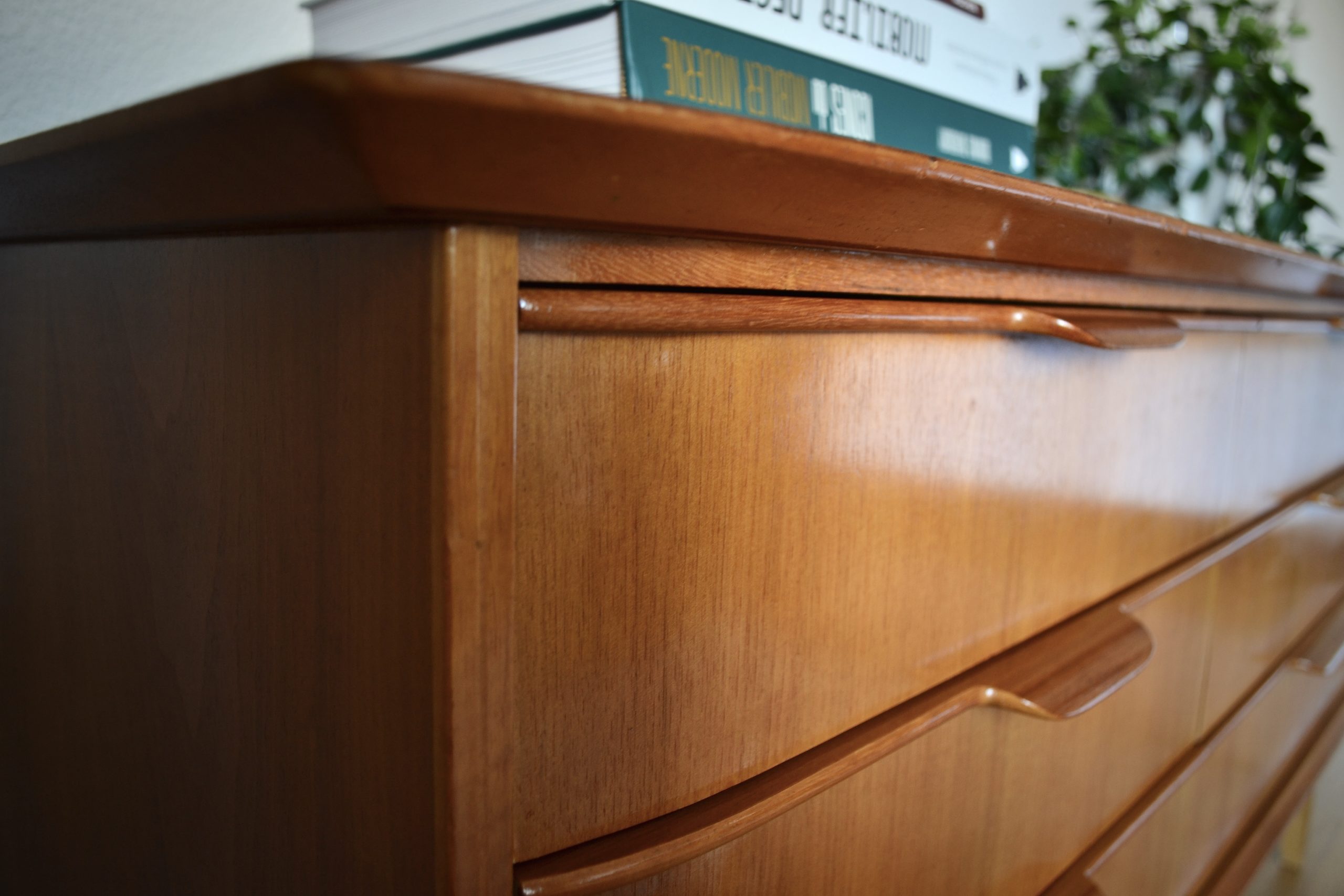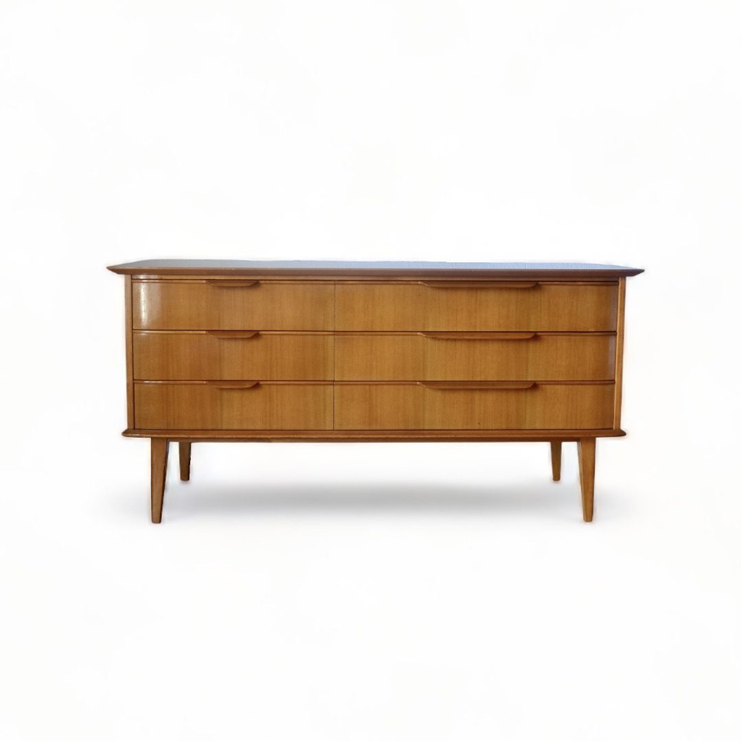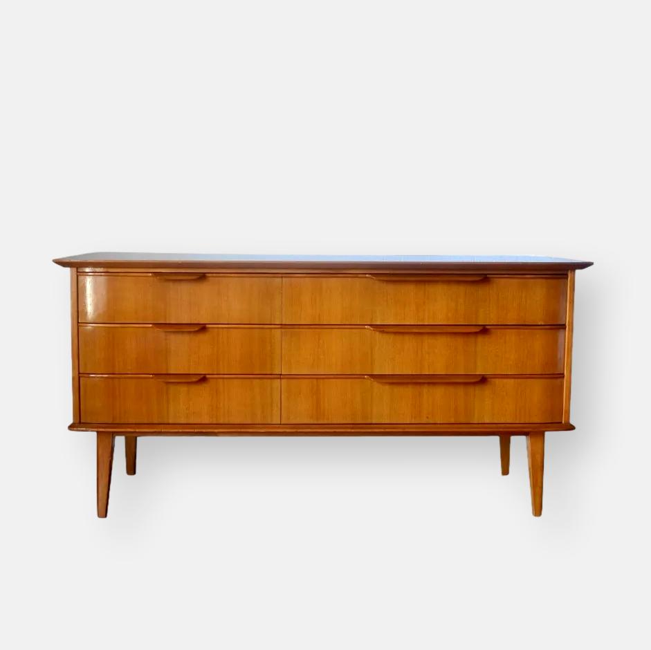 Dans la lignée du mobilier “mid-century” cette petite enfilade ou lowboard en noyer vous charmera assurément par ses proportions idéales lui permettant de s’installer à peu près partout ! Elle offre également un génereux volume de rangement à l’intérieur de ses six tiroirs.