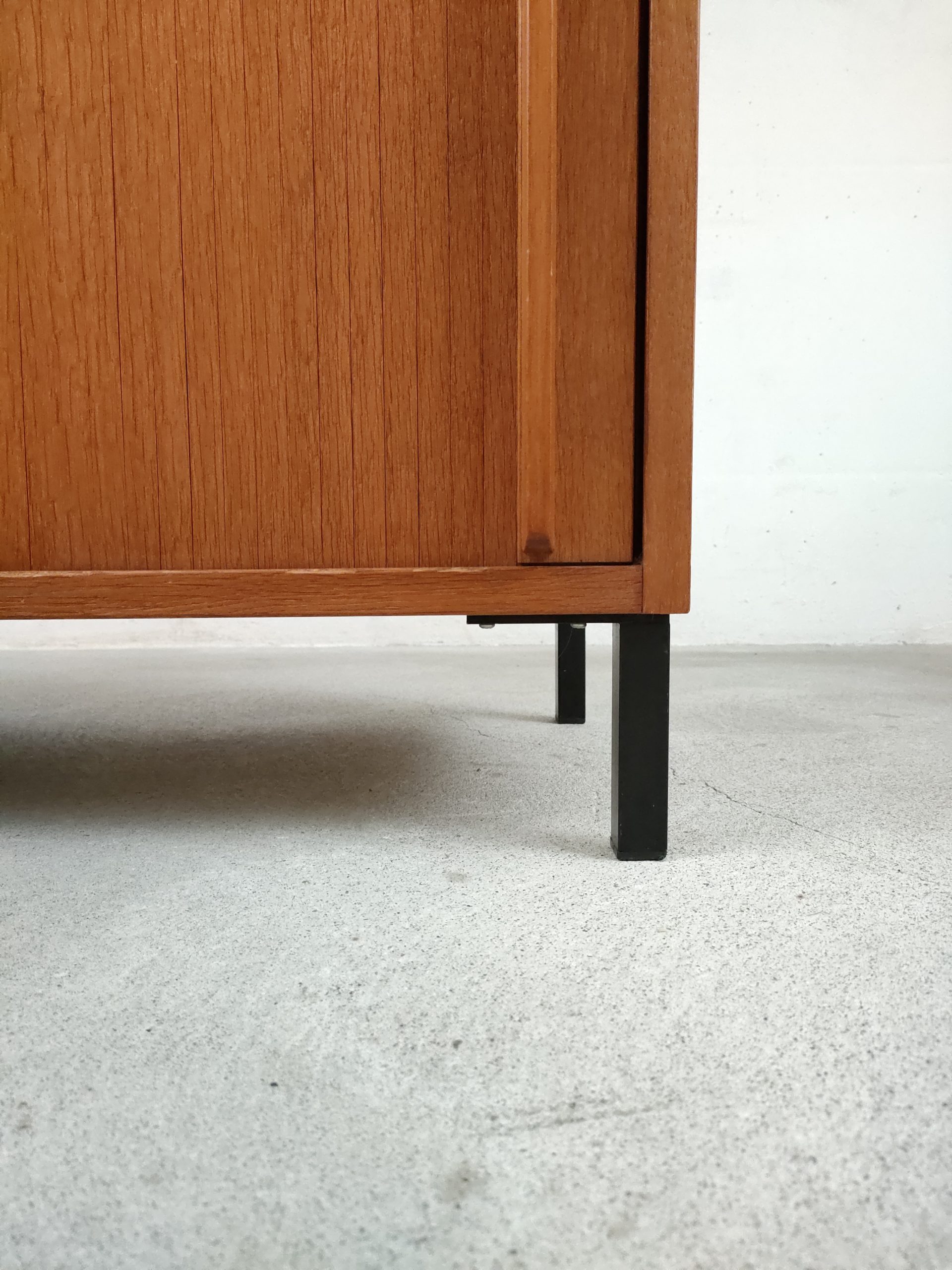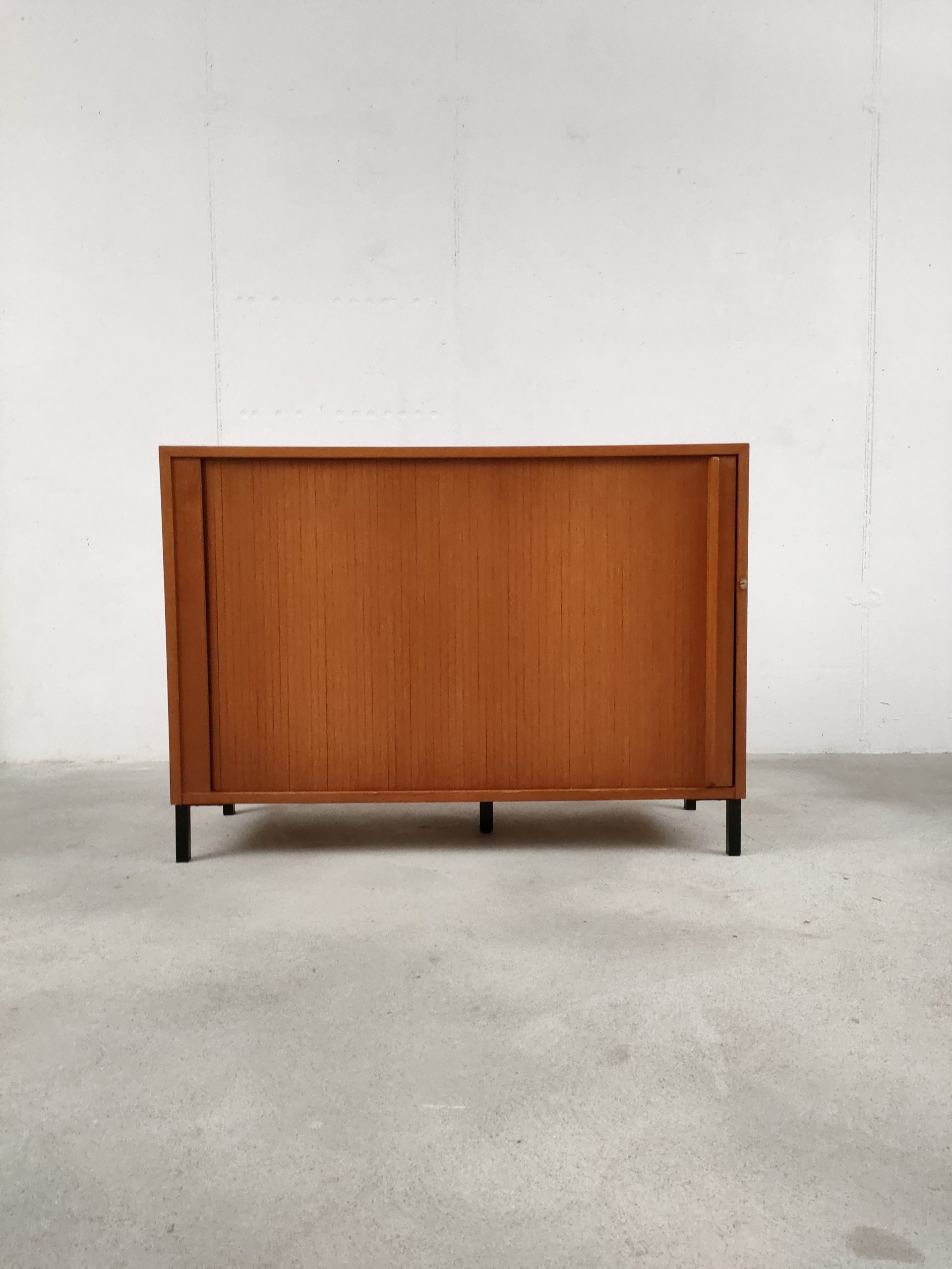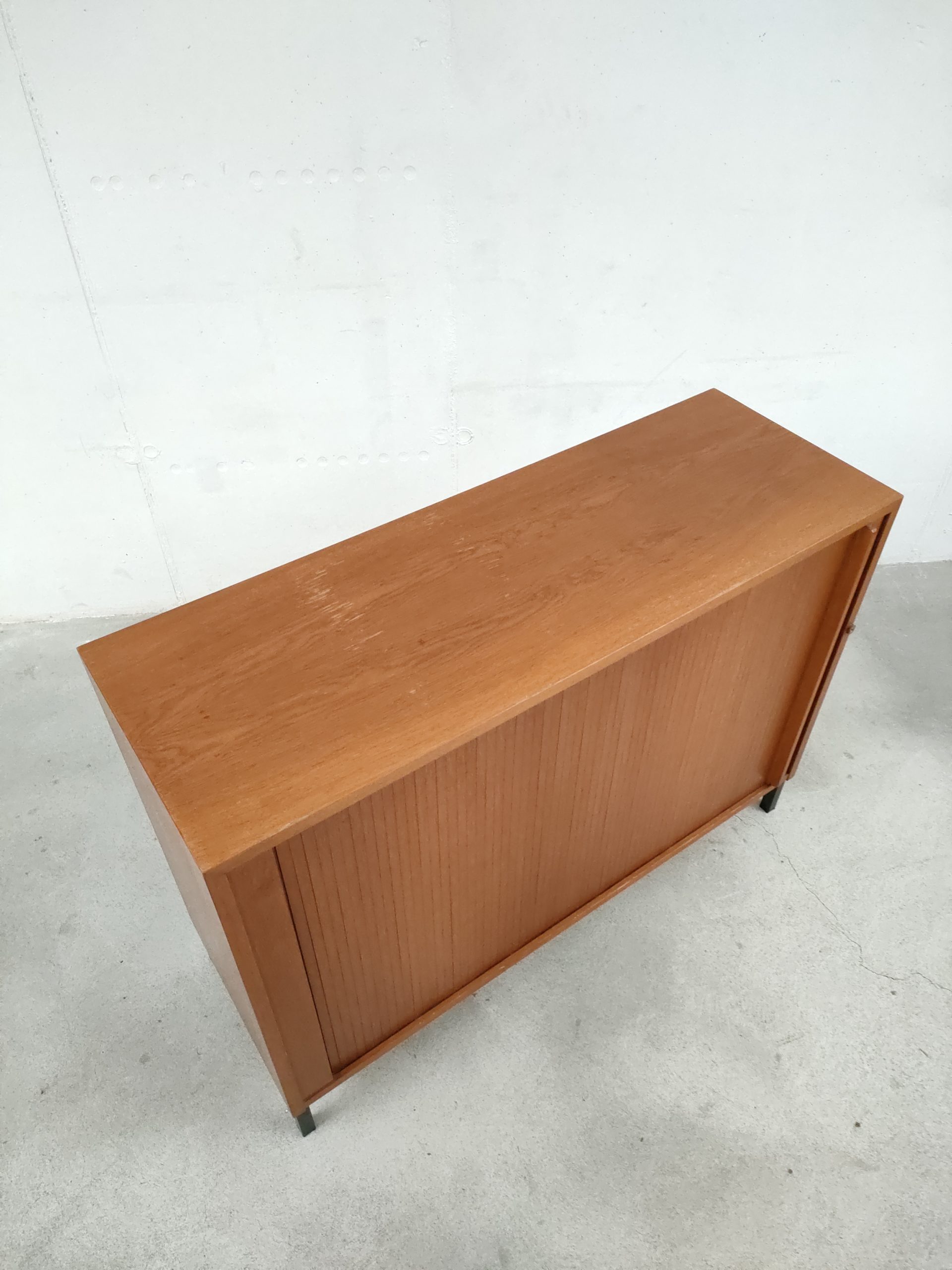 Produit venduMeuble à rideau vintage en bois avec piètement en métal. Le meuble dispose de 2 espaces internes dont une avec une étagère. Clé malheureusement non disponible et traces d’utilisation sur le plateau (cf. photo).