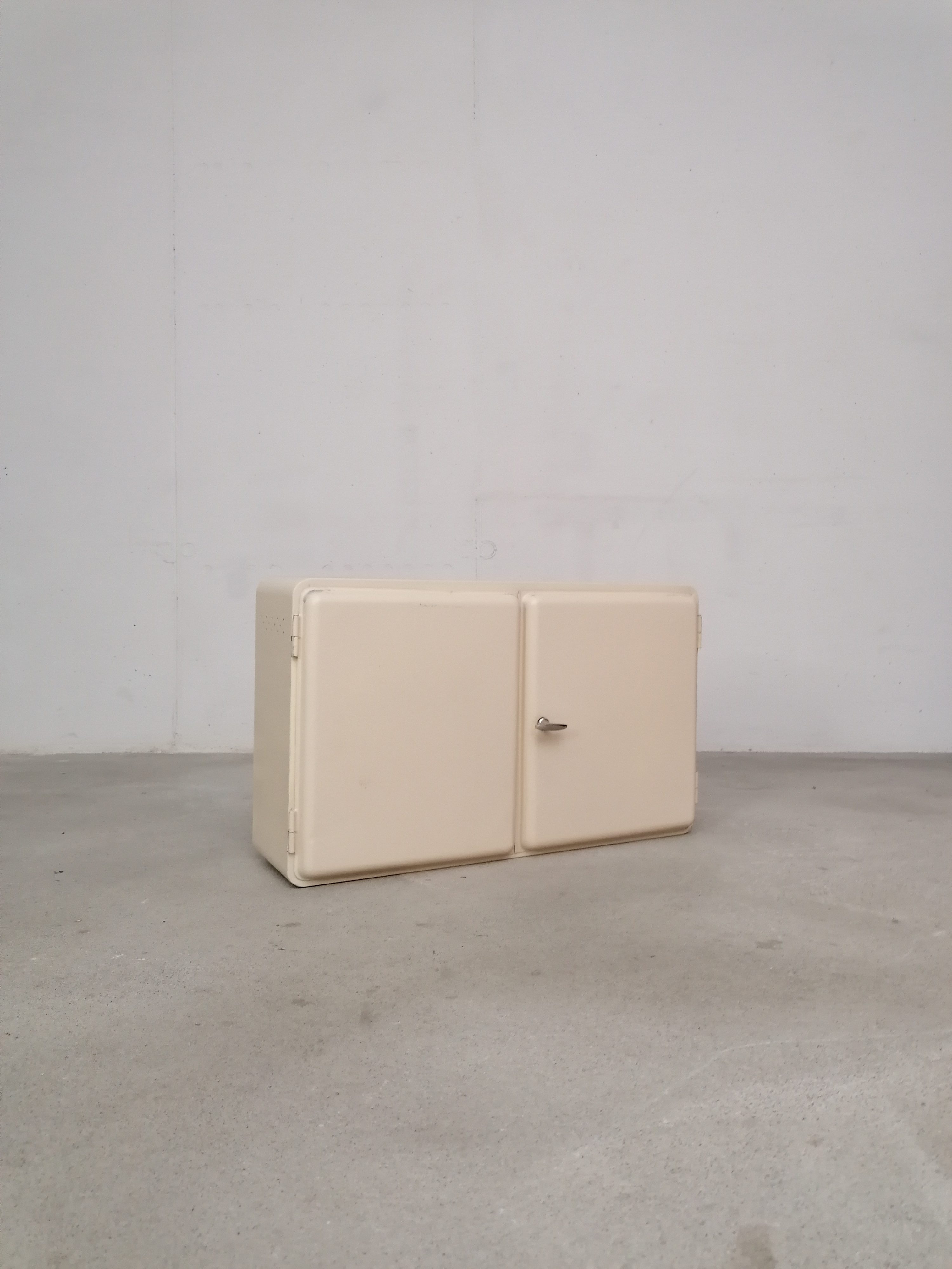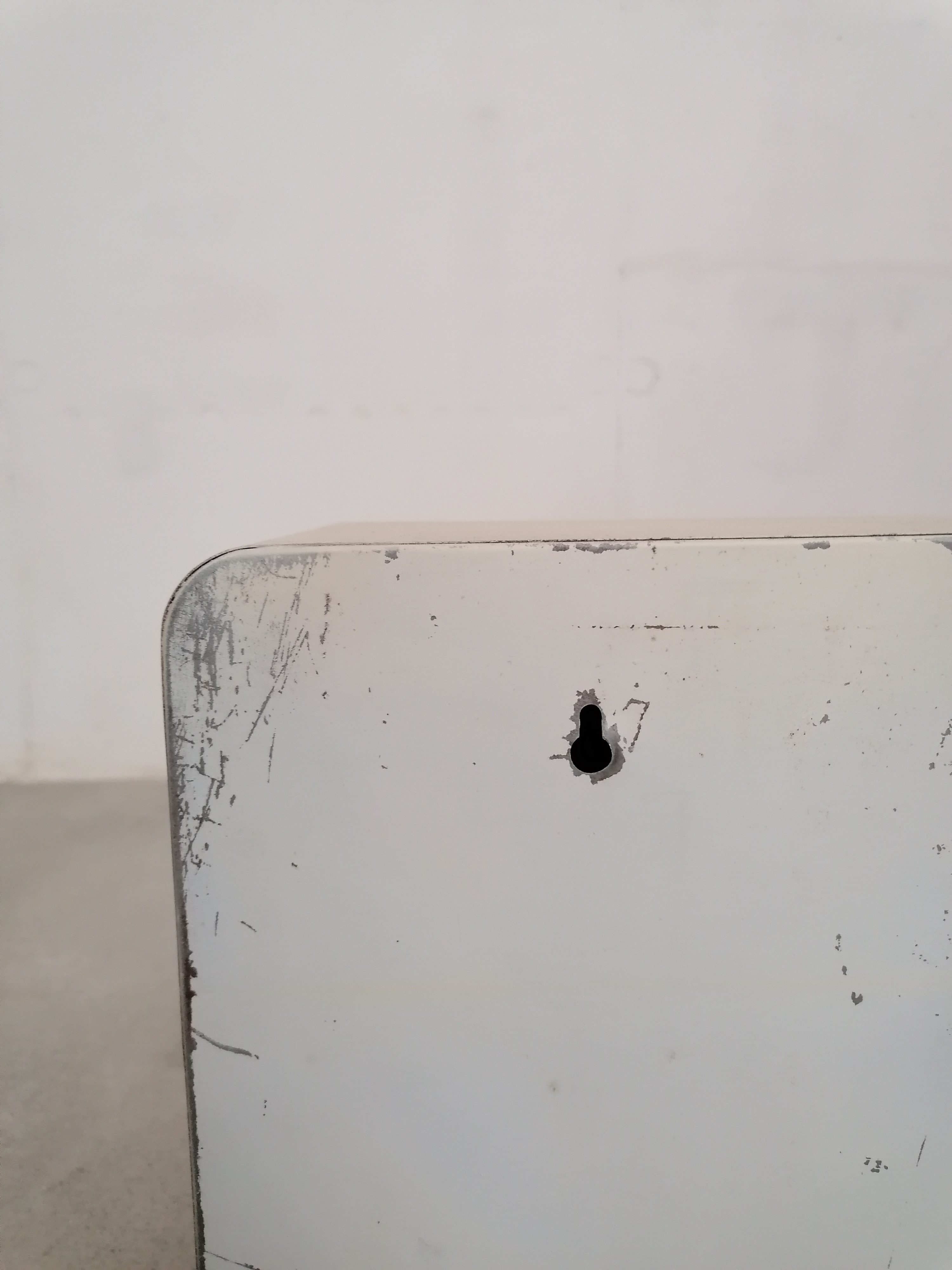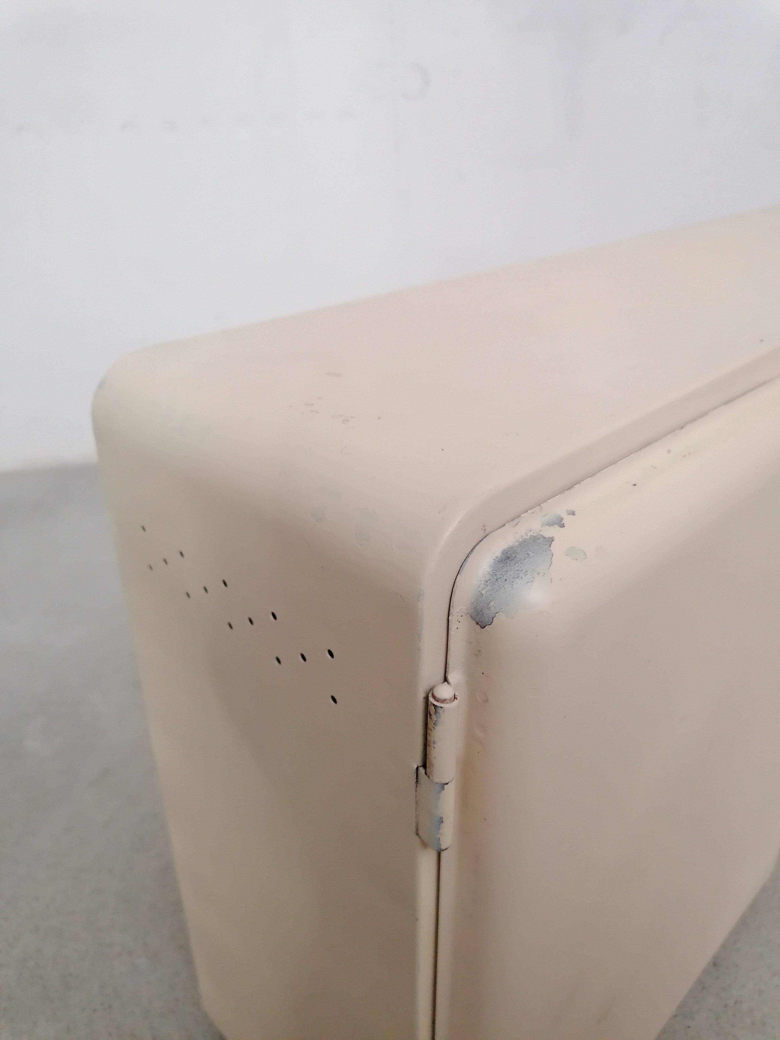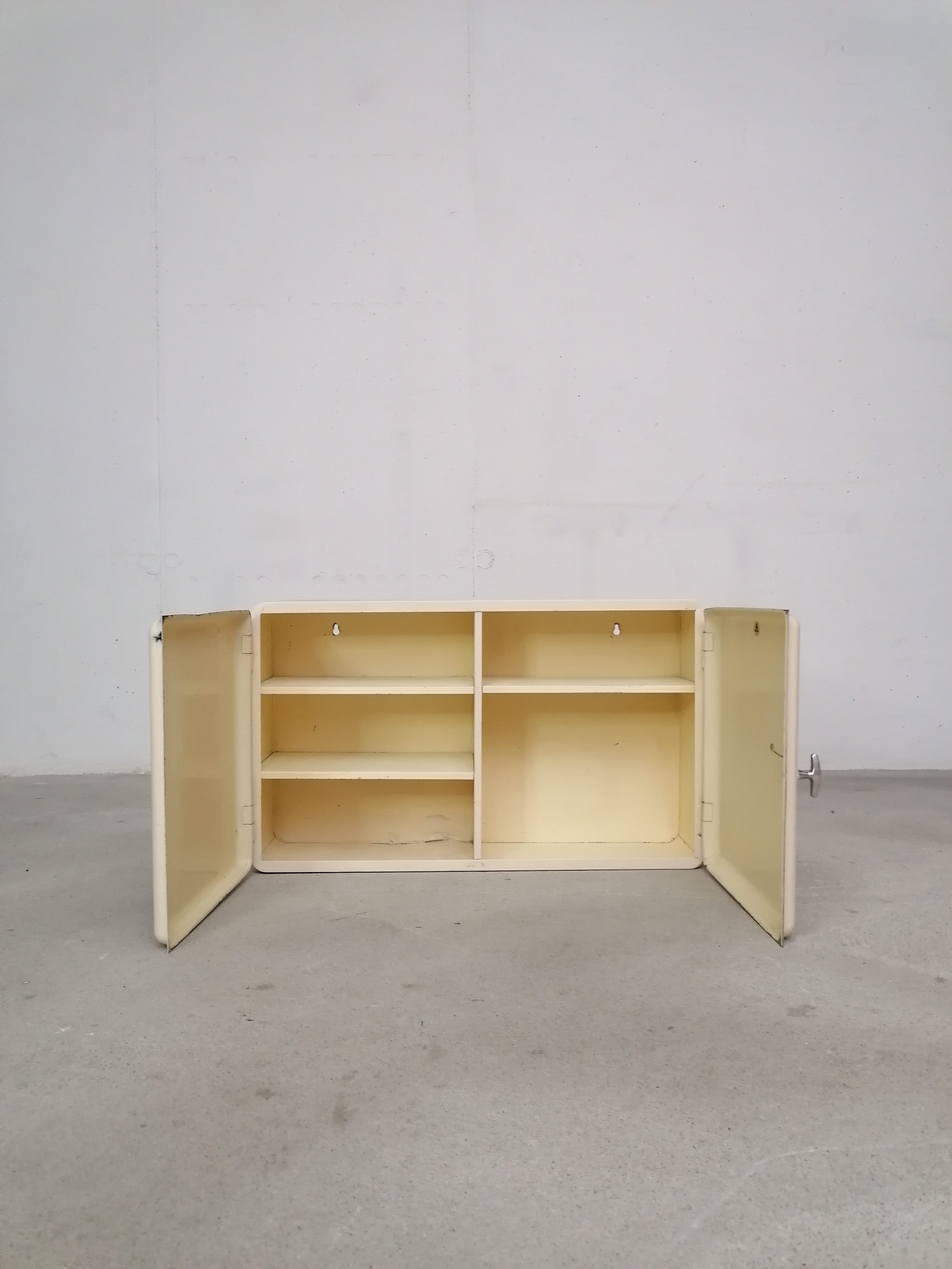 Produit venduMeuble de pharmacie vintage. Entièrement en métal peint dans une joli couleur beige pastel. Deux portes et trois étagères à l’intérieur. Quelques traces et marques du temps (voir photos) qui lui donnent une très belle patine. Stable et solide et très élégant avec ses bord arrondis. Deux trous à l’arrière permettent de l’accrocher au mur, dans une cuisine par exemple.
