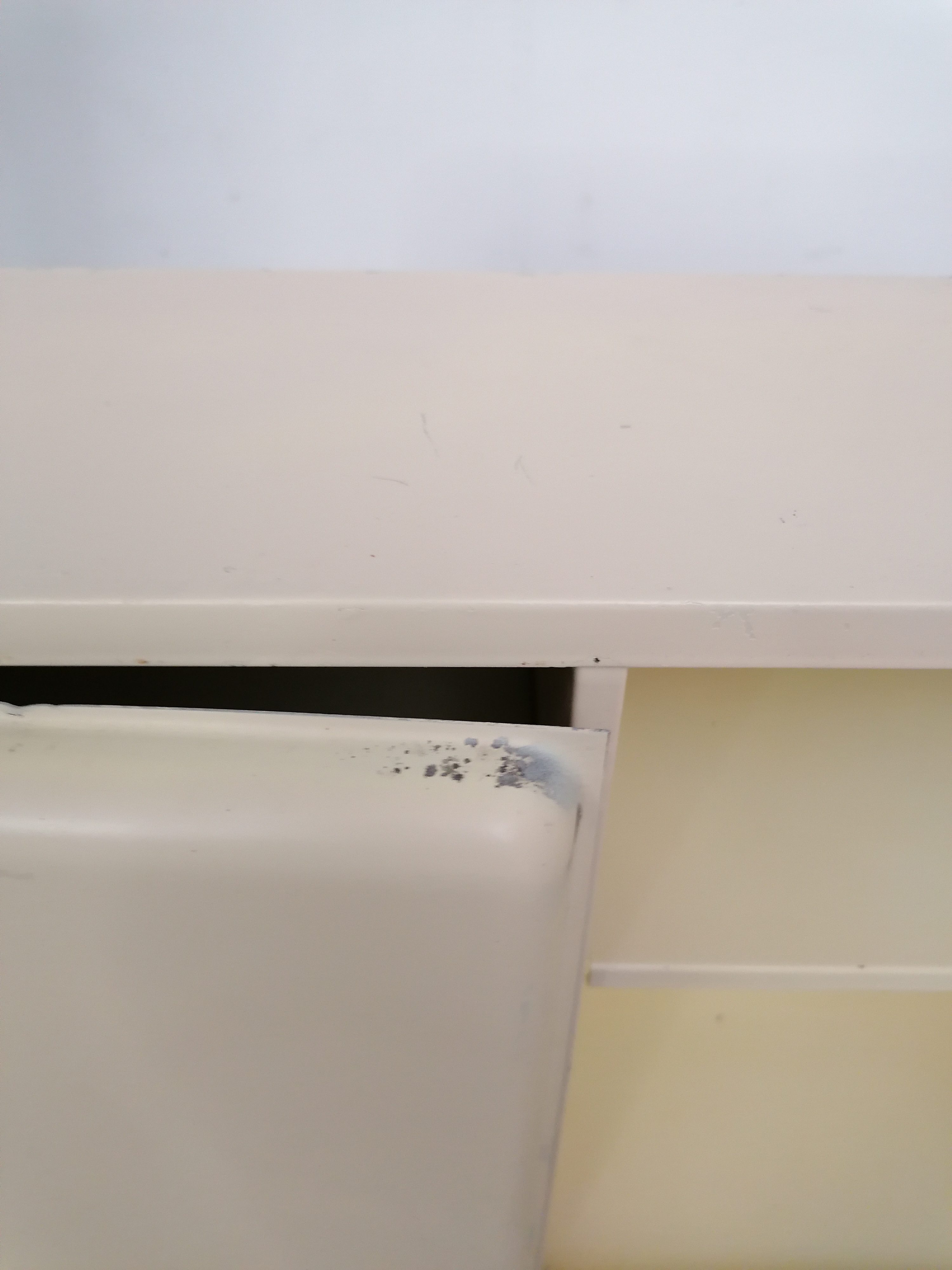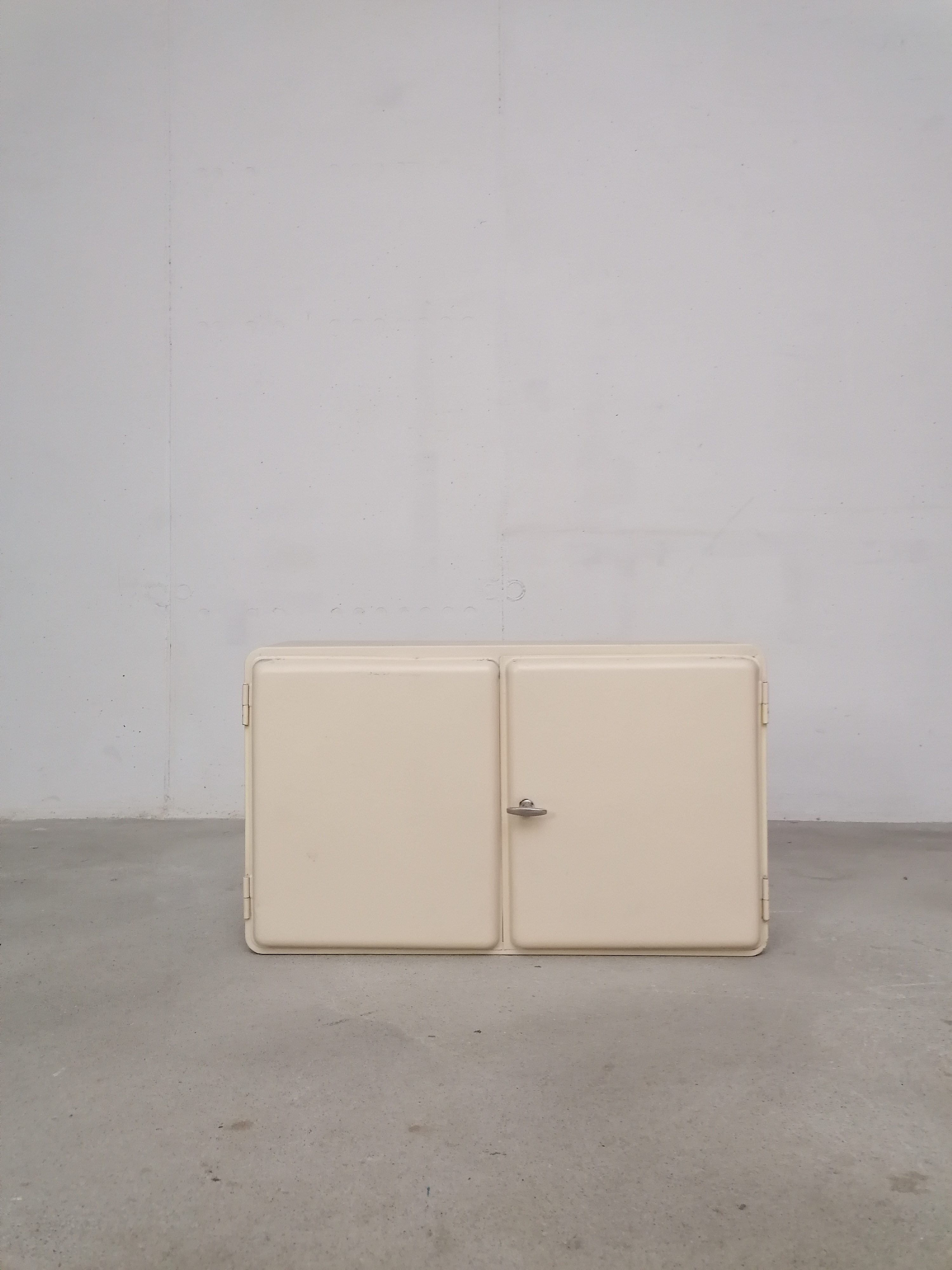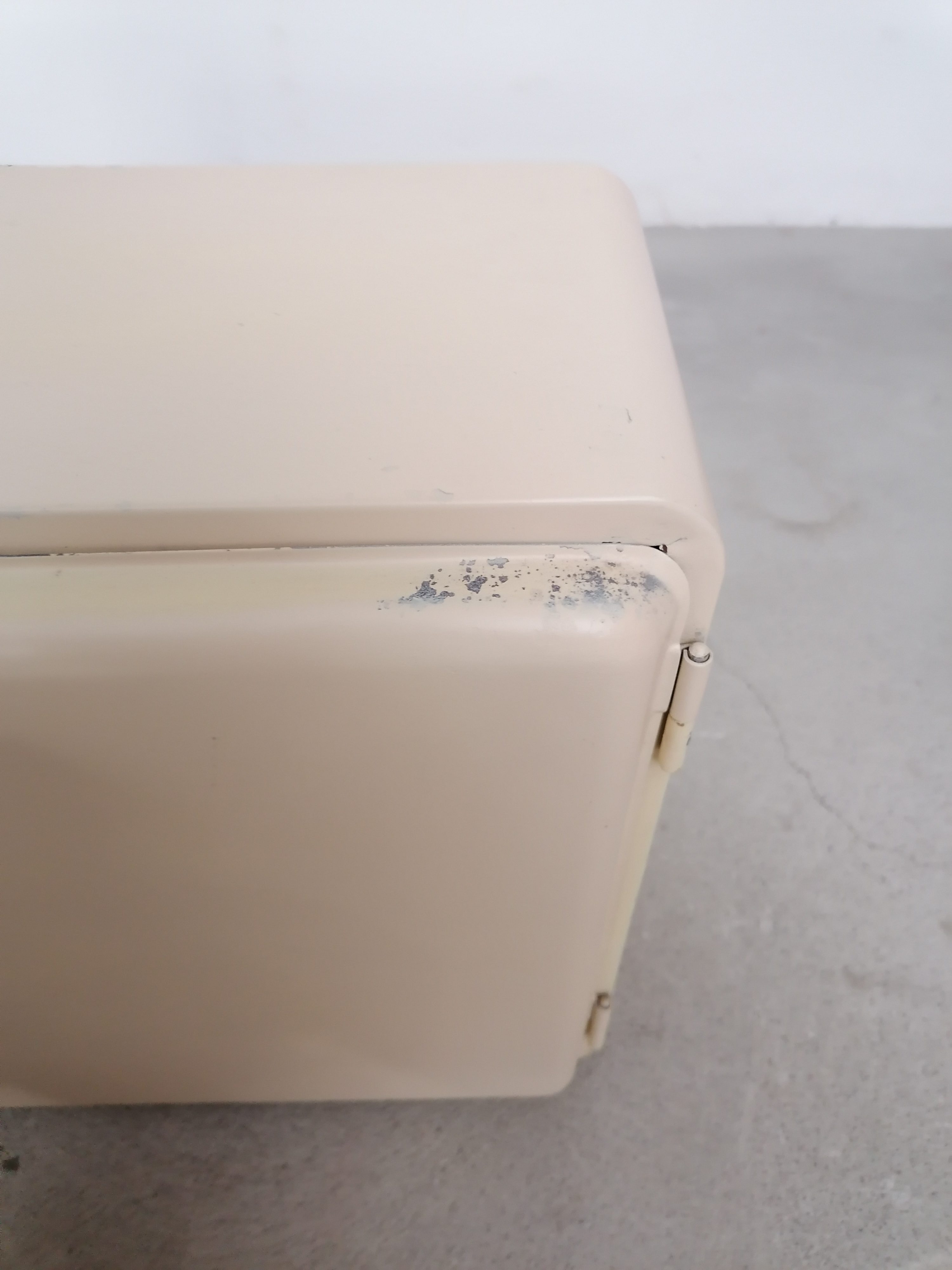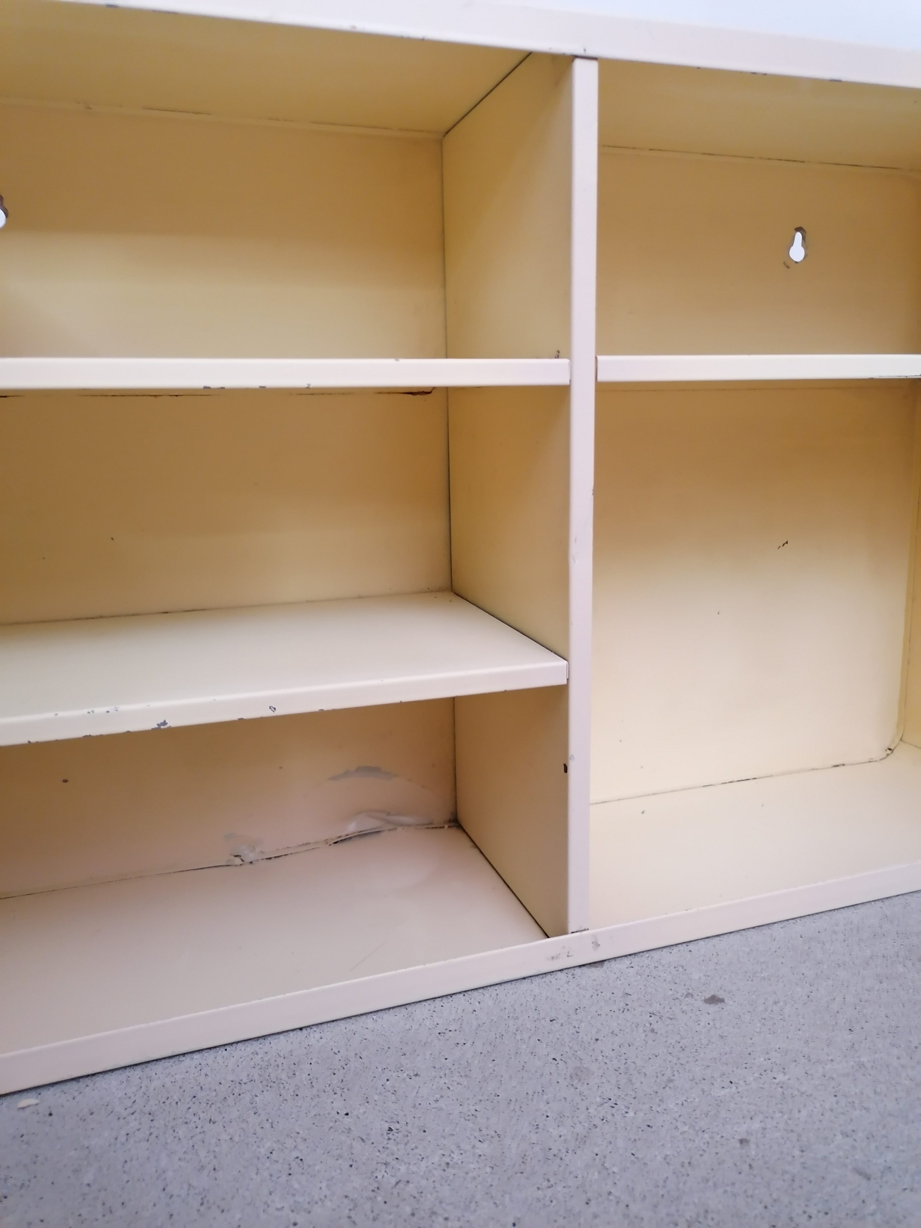 Produit venduMeuble de pharmacie vintage. Entièrement en métal peint dans une joli couleur beige pastel. Deux portes et trois étagères à l’intérieur. Quelques traces et marques du temps (voir photos) qui lui donnent une très belle patine. Stable et solide et très élégant avec ses bord arrondis. Deux trous à l’arrière permettent de l’accrocher au mur, dans une cuisine par exemple.