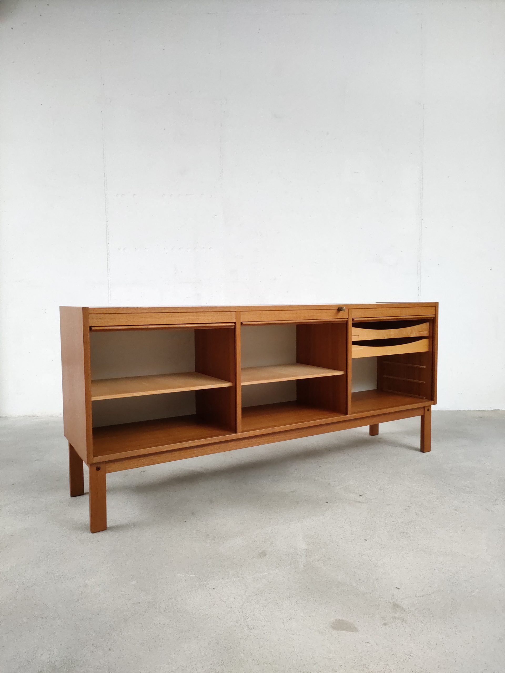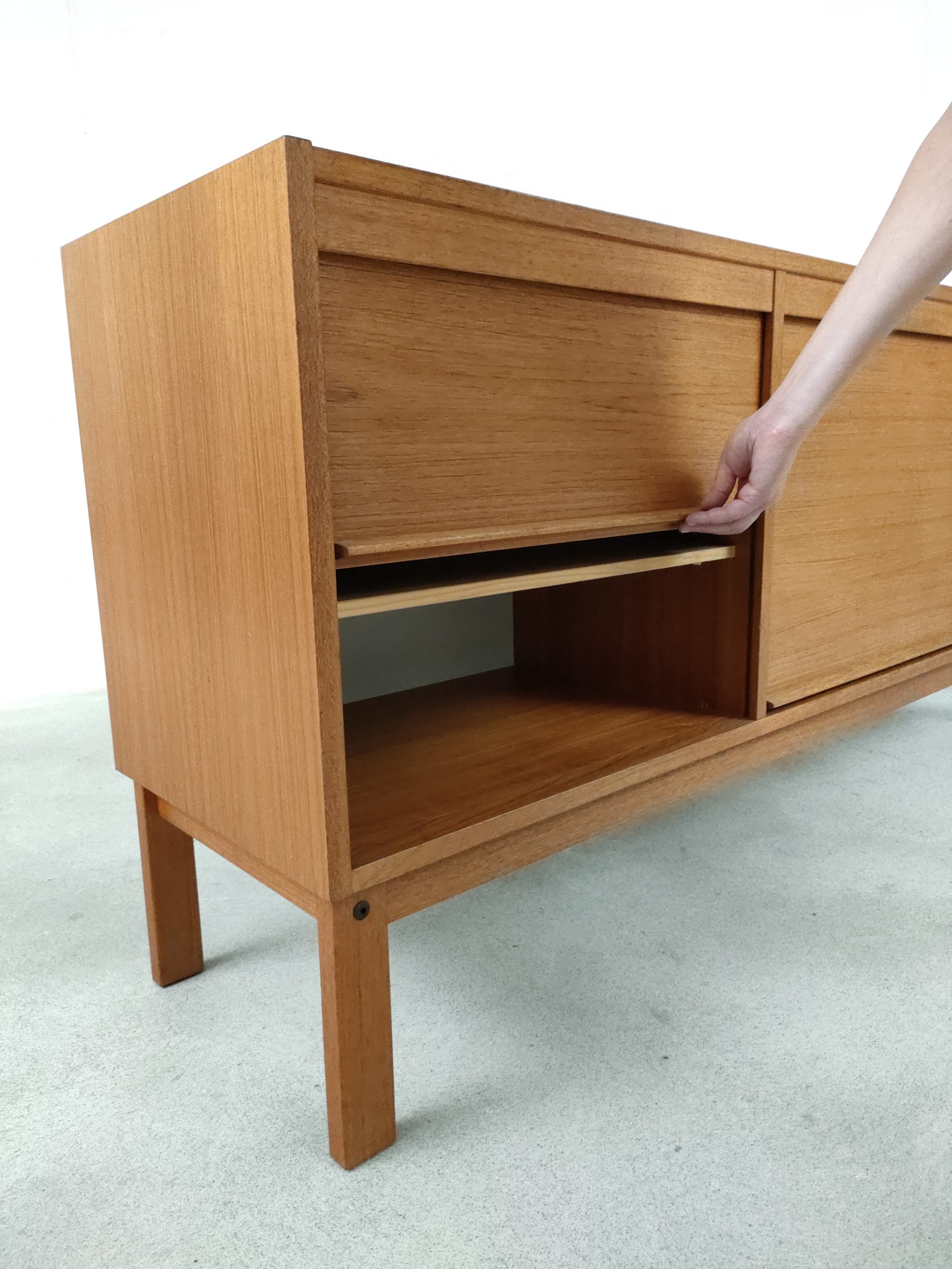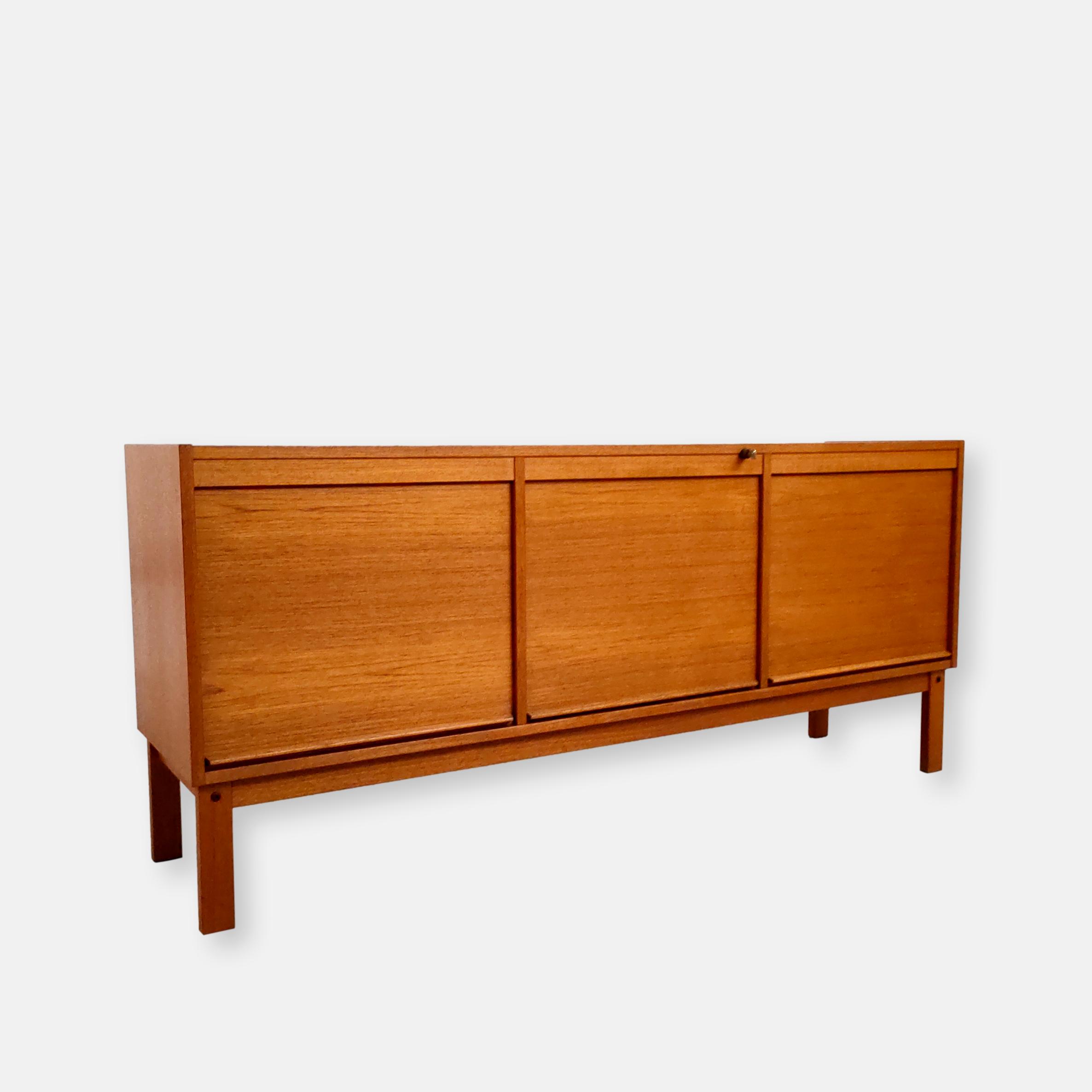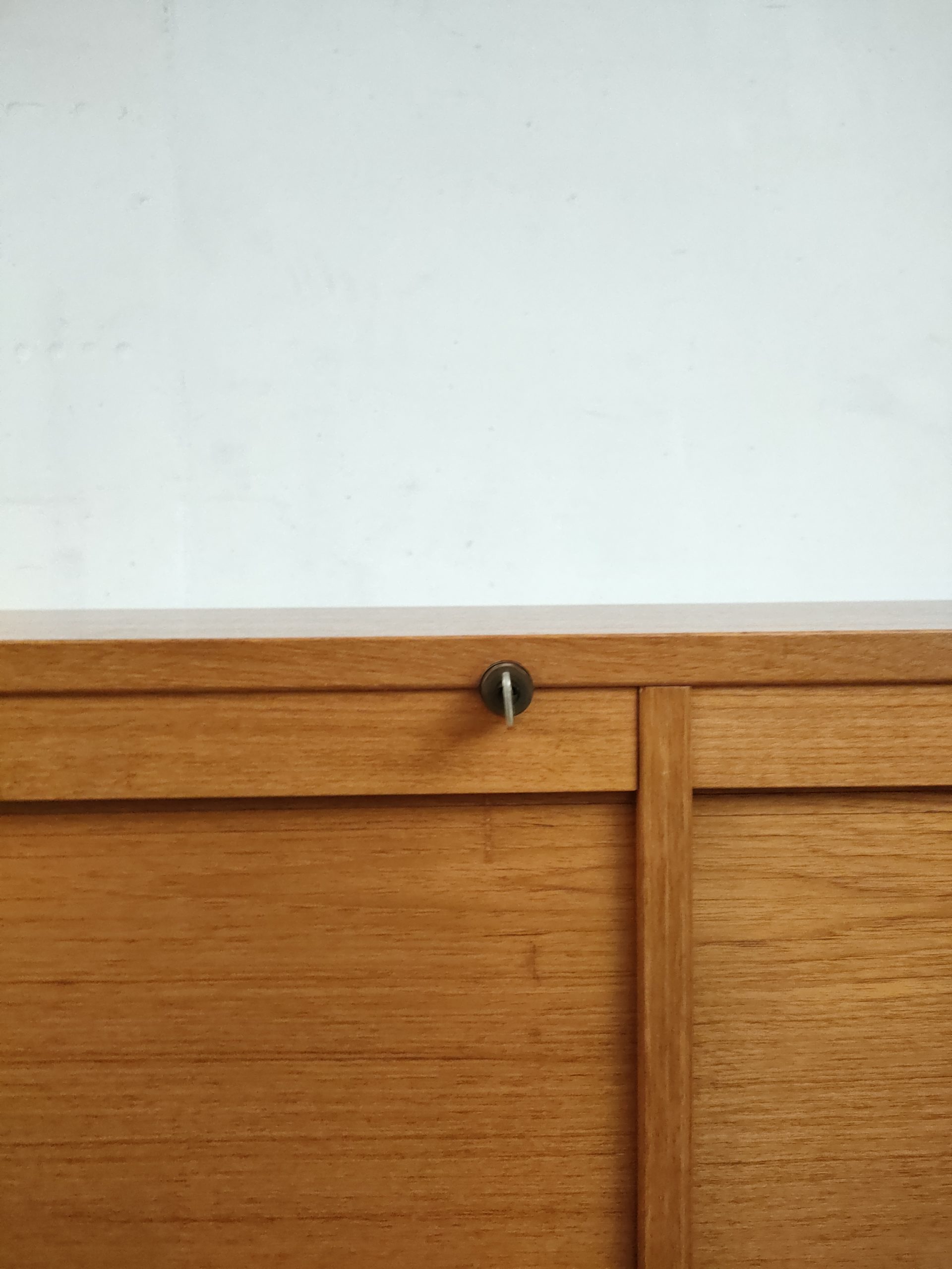 Produit venduMeuble de rangement vintage avec élégant piétement en bois. Doté de trois éspaces de rangement avec système de fermeture à rideau. Le trois éspaces peuvent être fermés à clé. Deux étagères amovibles et deux tiroirs se trouvent à l’intérieur. Quelques traces d’usure sur le bois (voir photos). Le meuble est stable et solide et parfaitement fonctionnel.