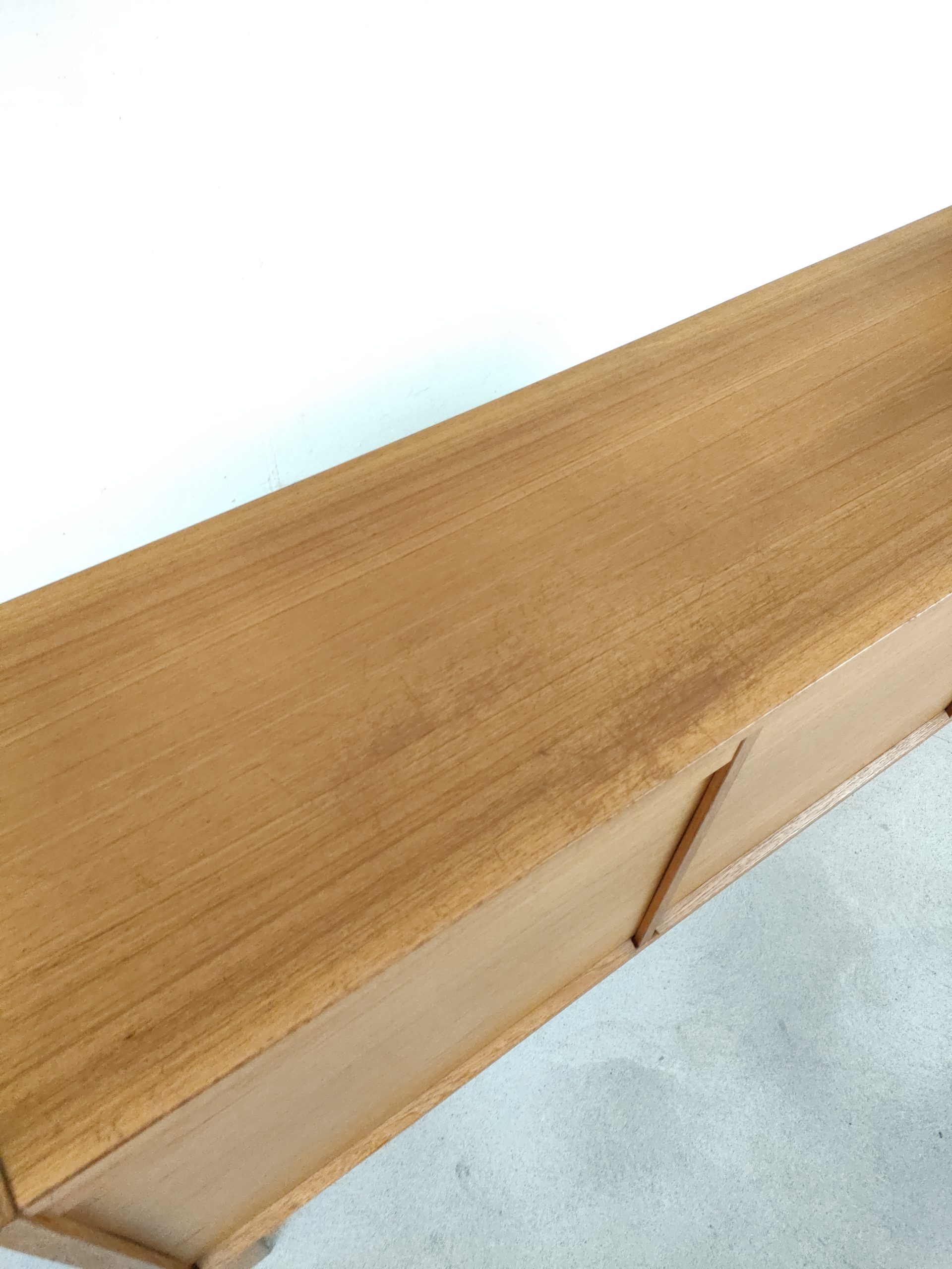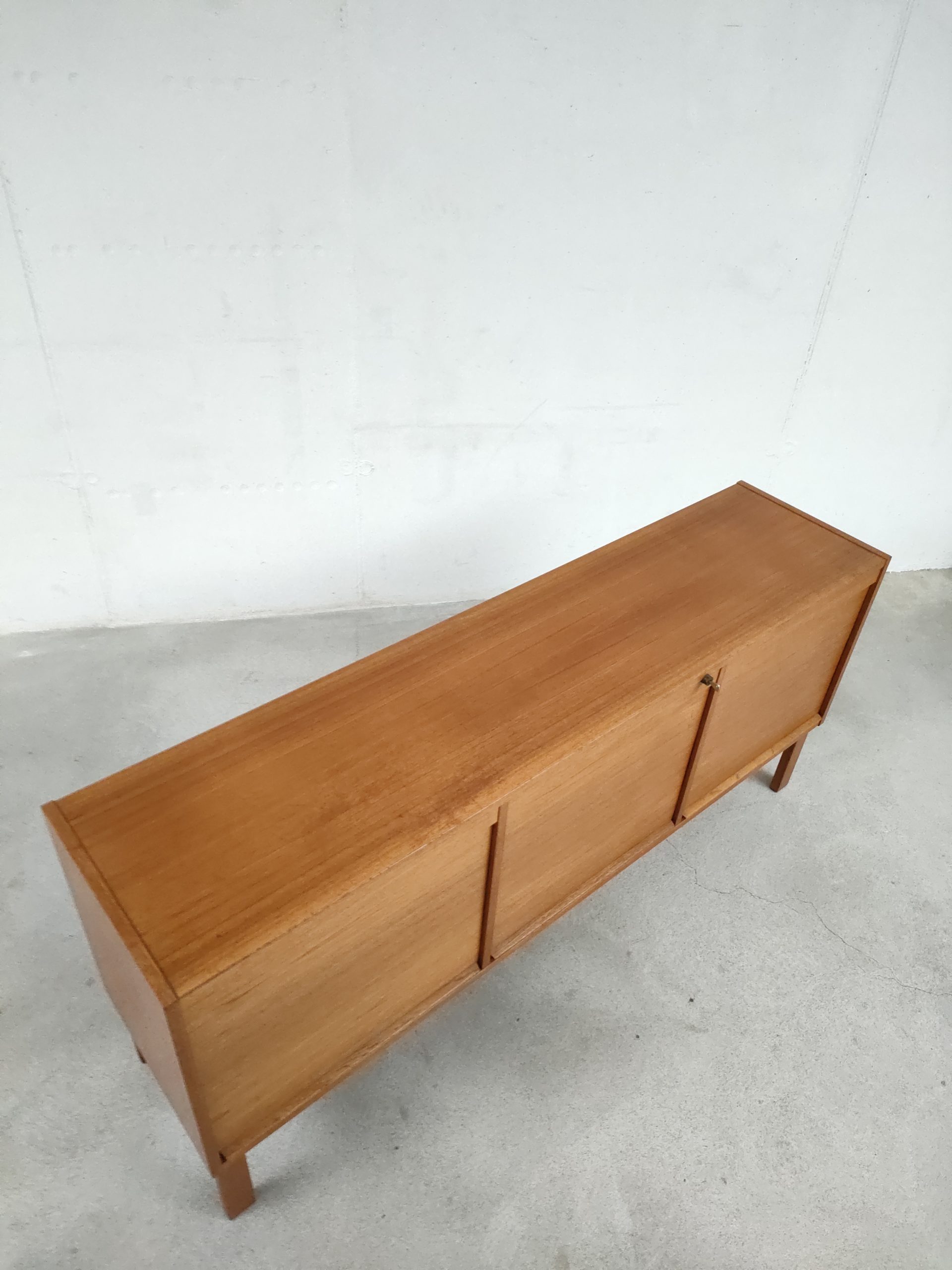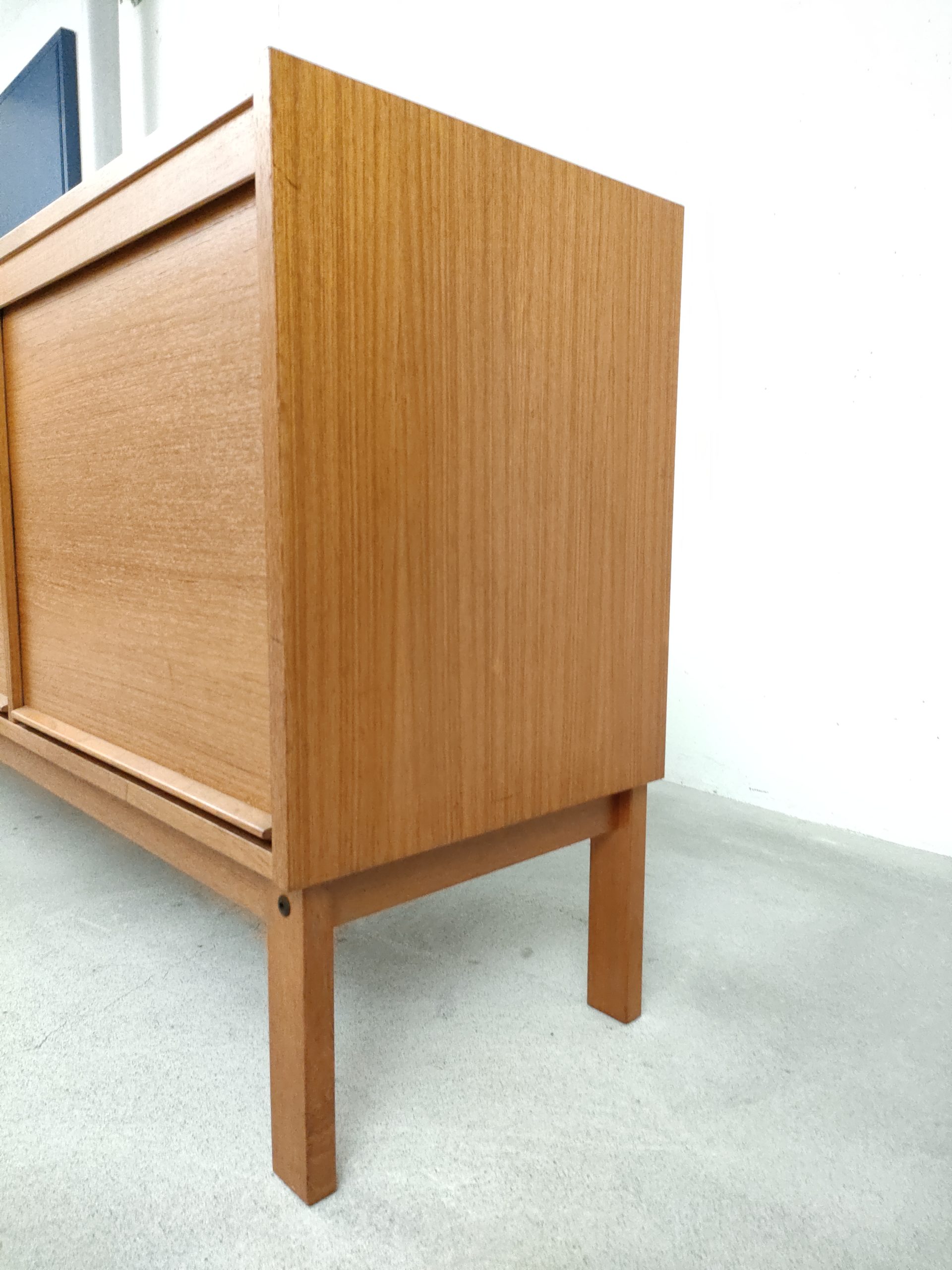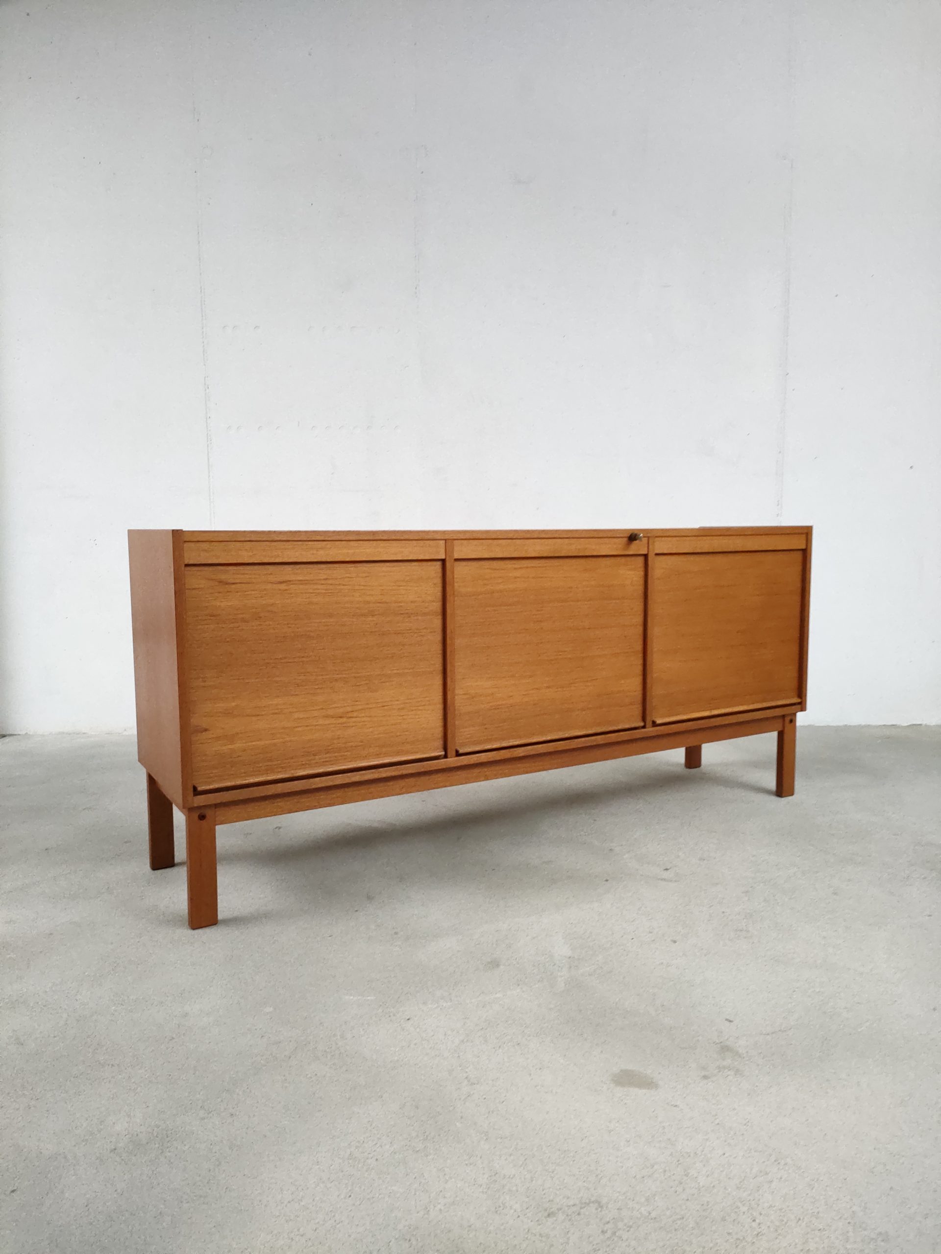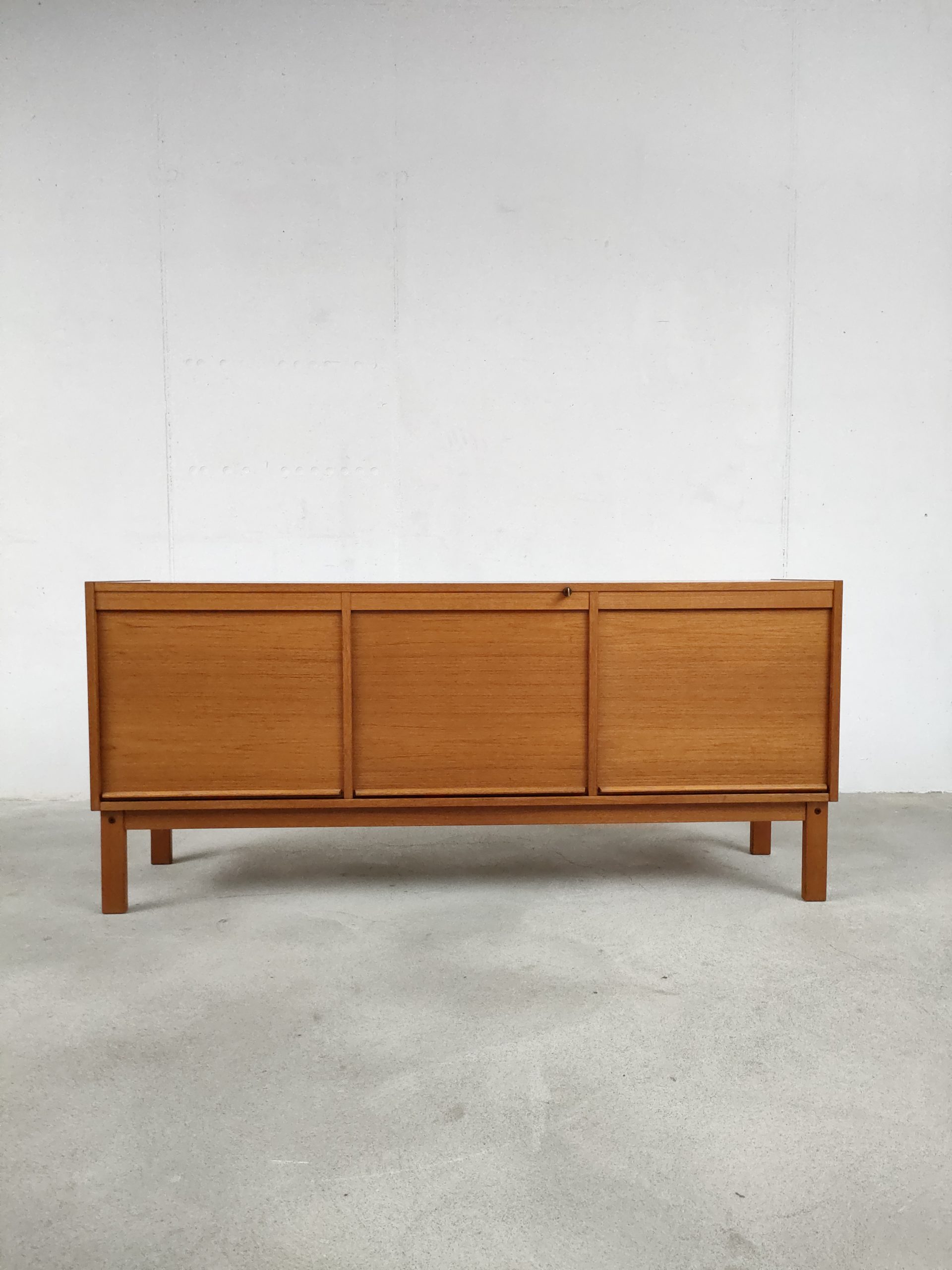 Produit venduMeuble de rangement vintage avec élégant piétement en bois. Doté de trois éspaces de rangement avec système de fermeture à rideau. Le trois éspaces peuvent être fermés à clé. Deux étagères amovibles et deux tiroirs se trouvent à l’intérieur. Quelques traces d’usure sur le bois (voir photos). Le meuble est stable et solide et parfaitement fonctionnel.