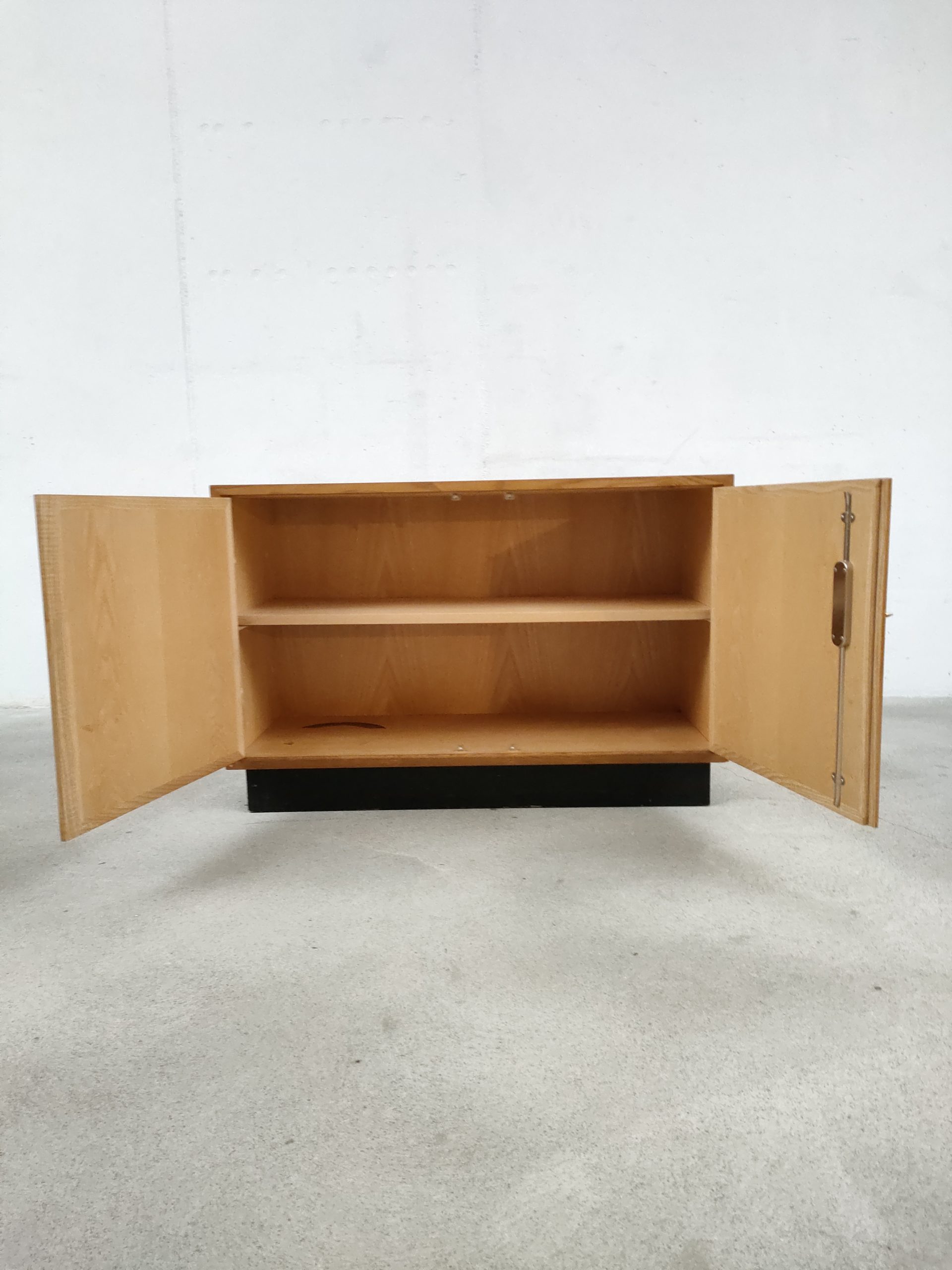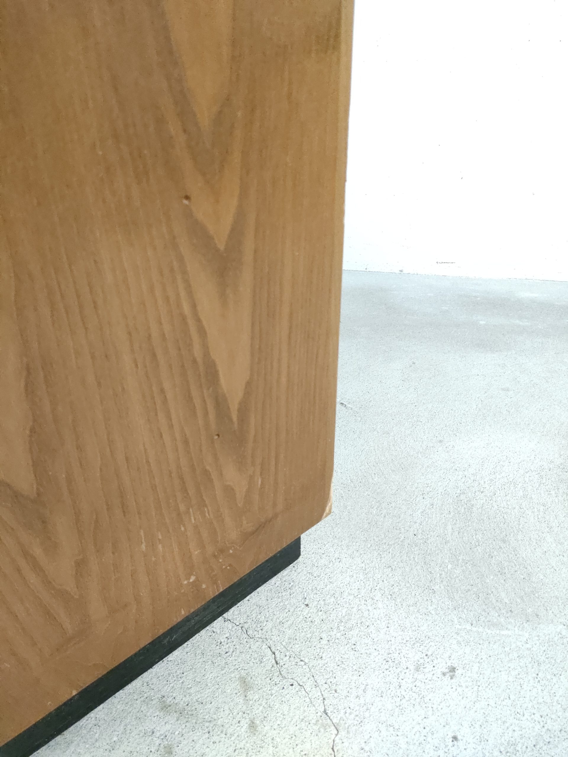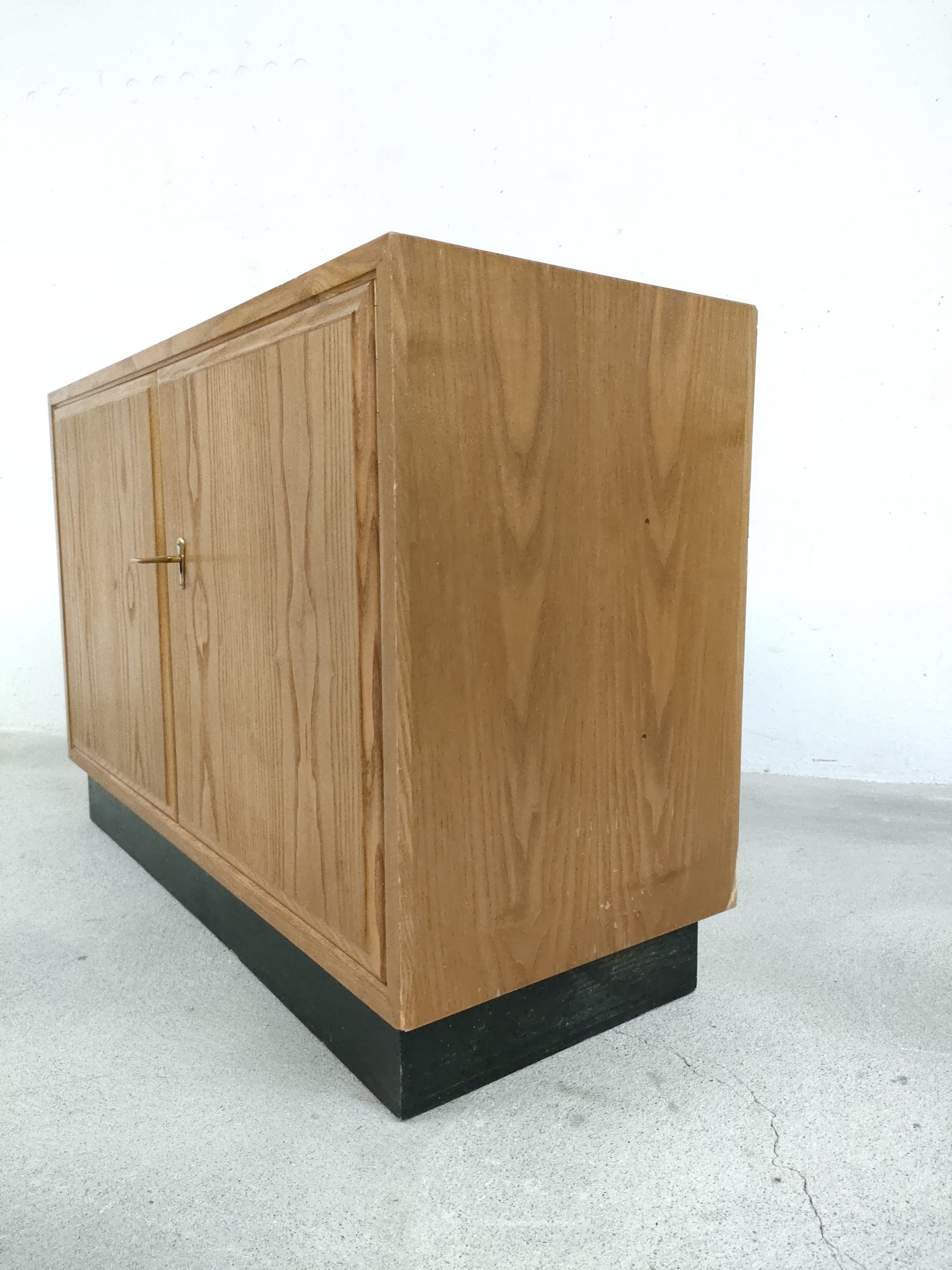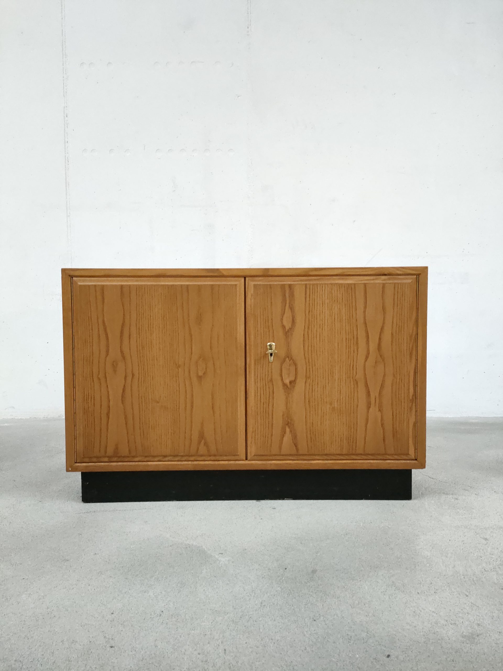Produit venduMeuble de rangement en bois avec deux portes avec clé dorée et socle noir. À l’intérieur on retrouve une étagère. Des traces d’usure et signes du temps sont présents à certains endroits (voir photos). Le meuble est stable et solide et parfaitement fonctionnel.