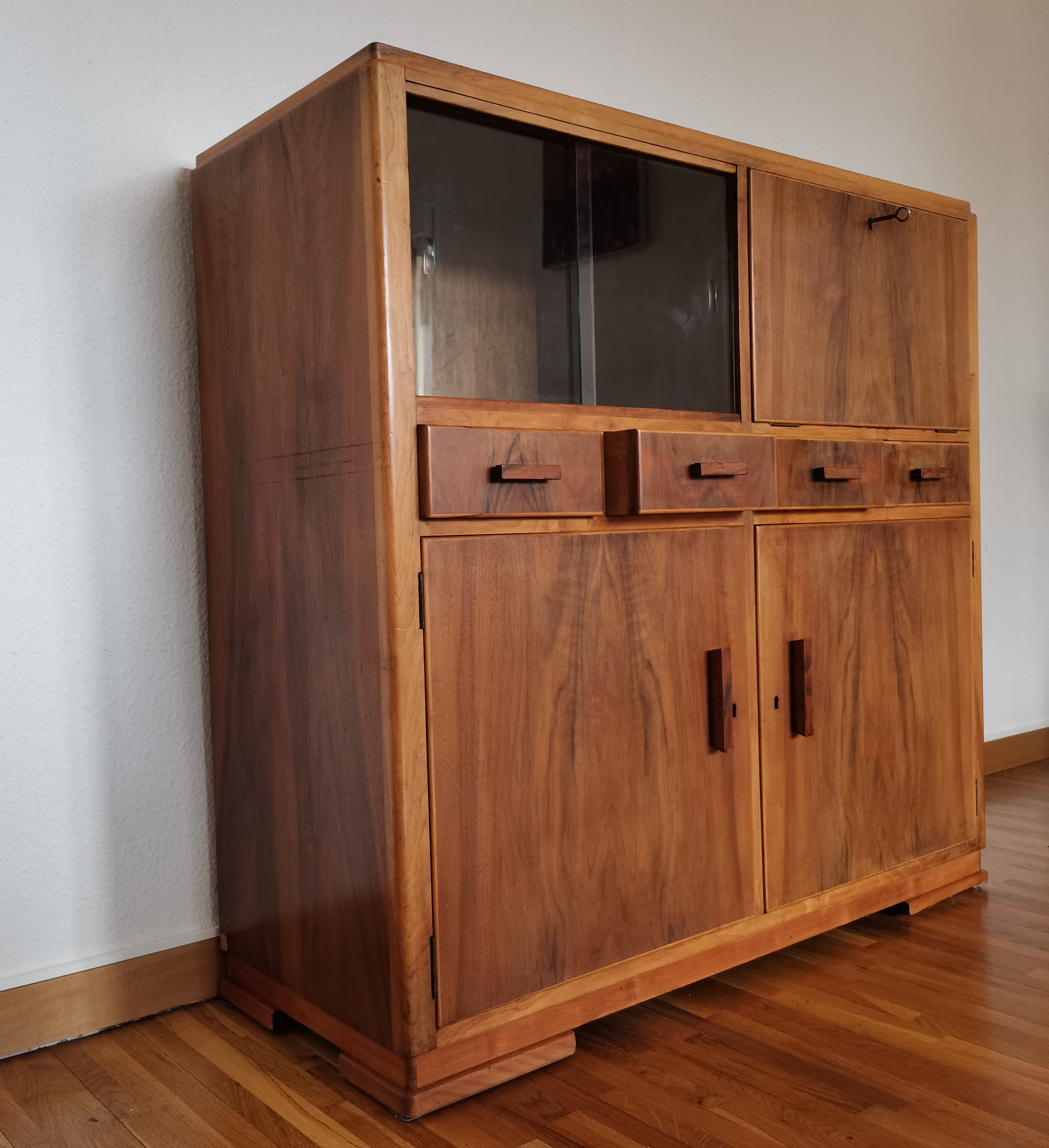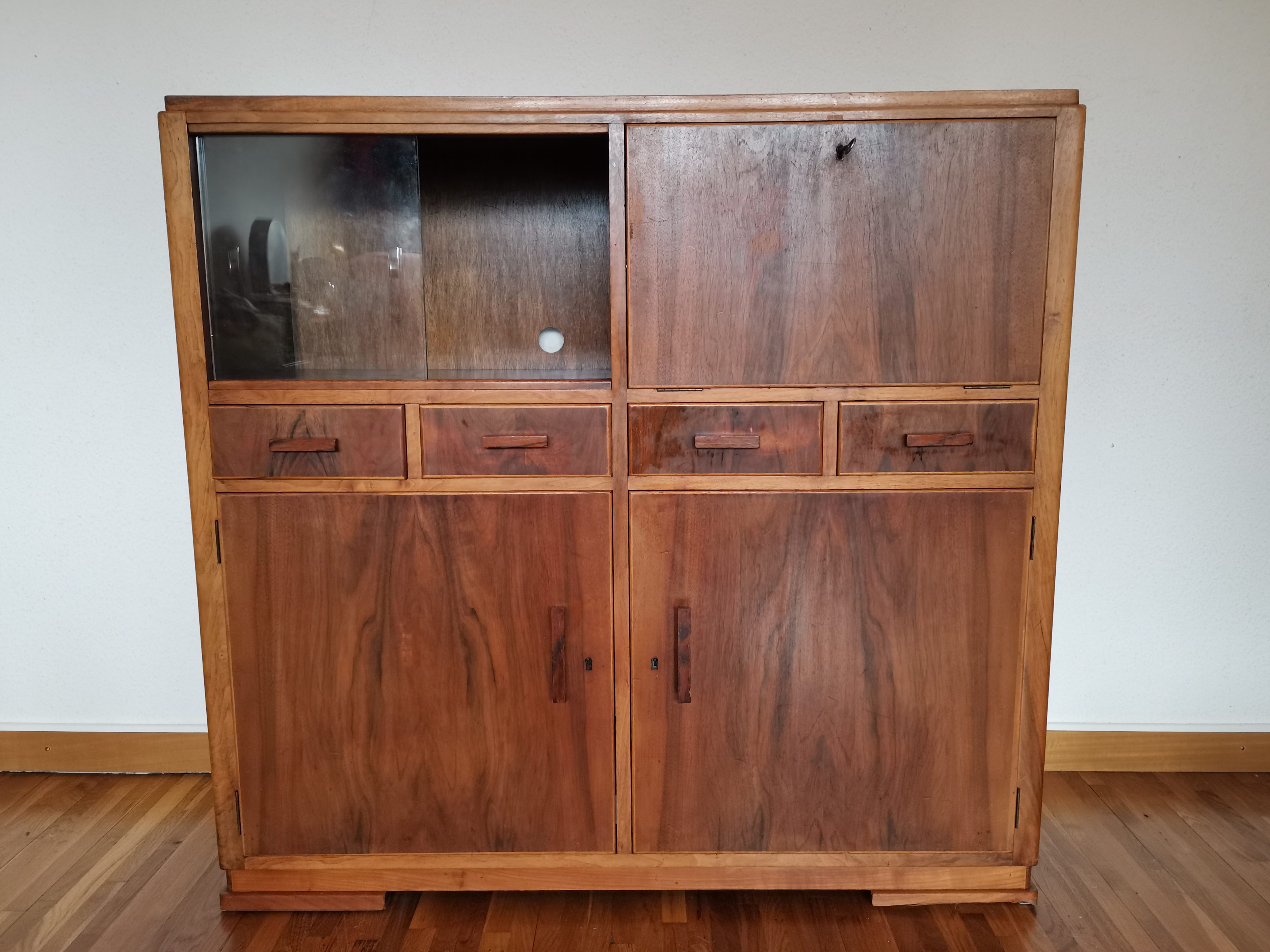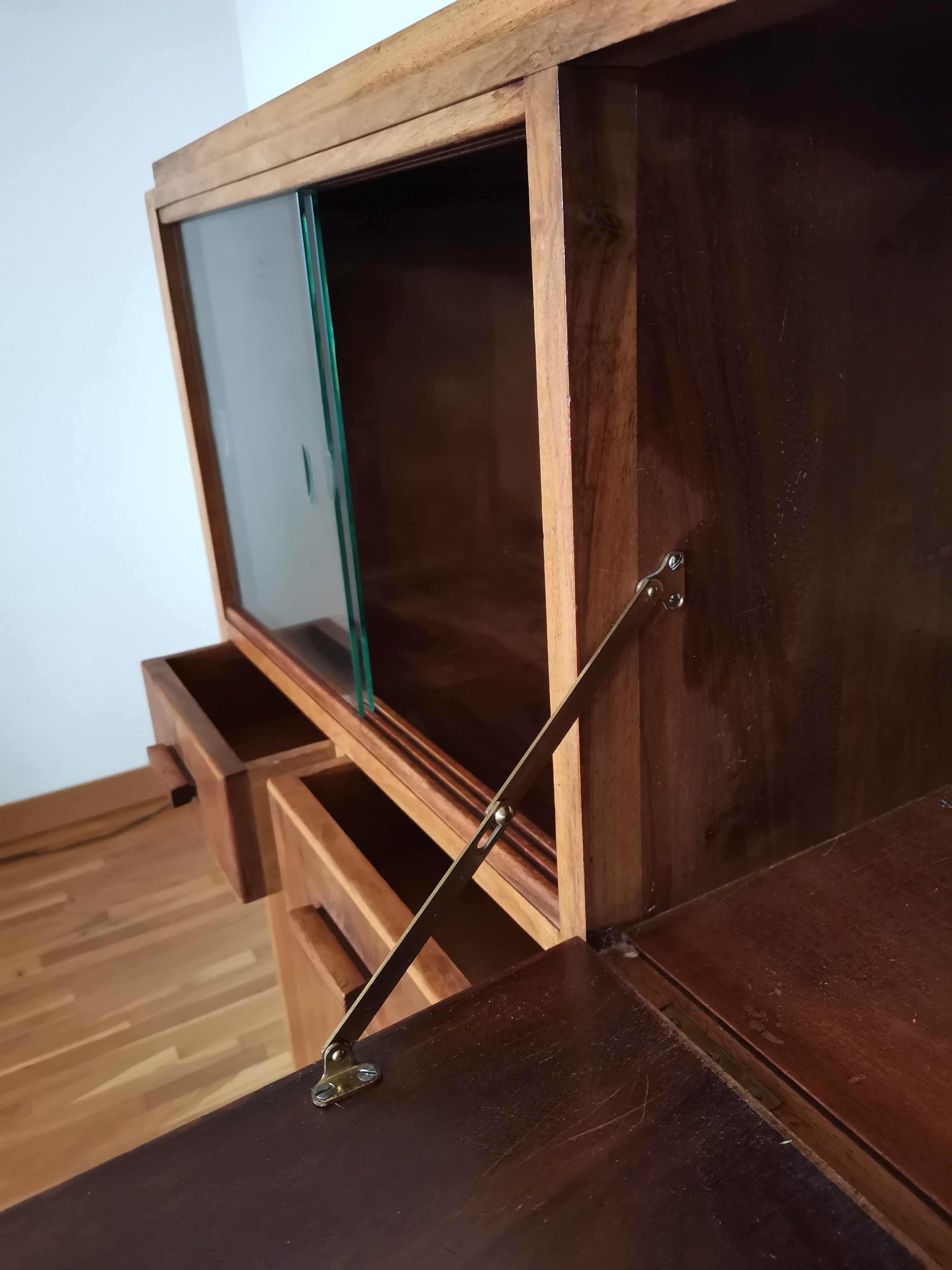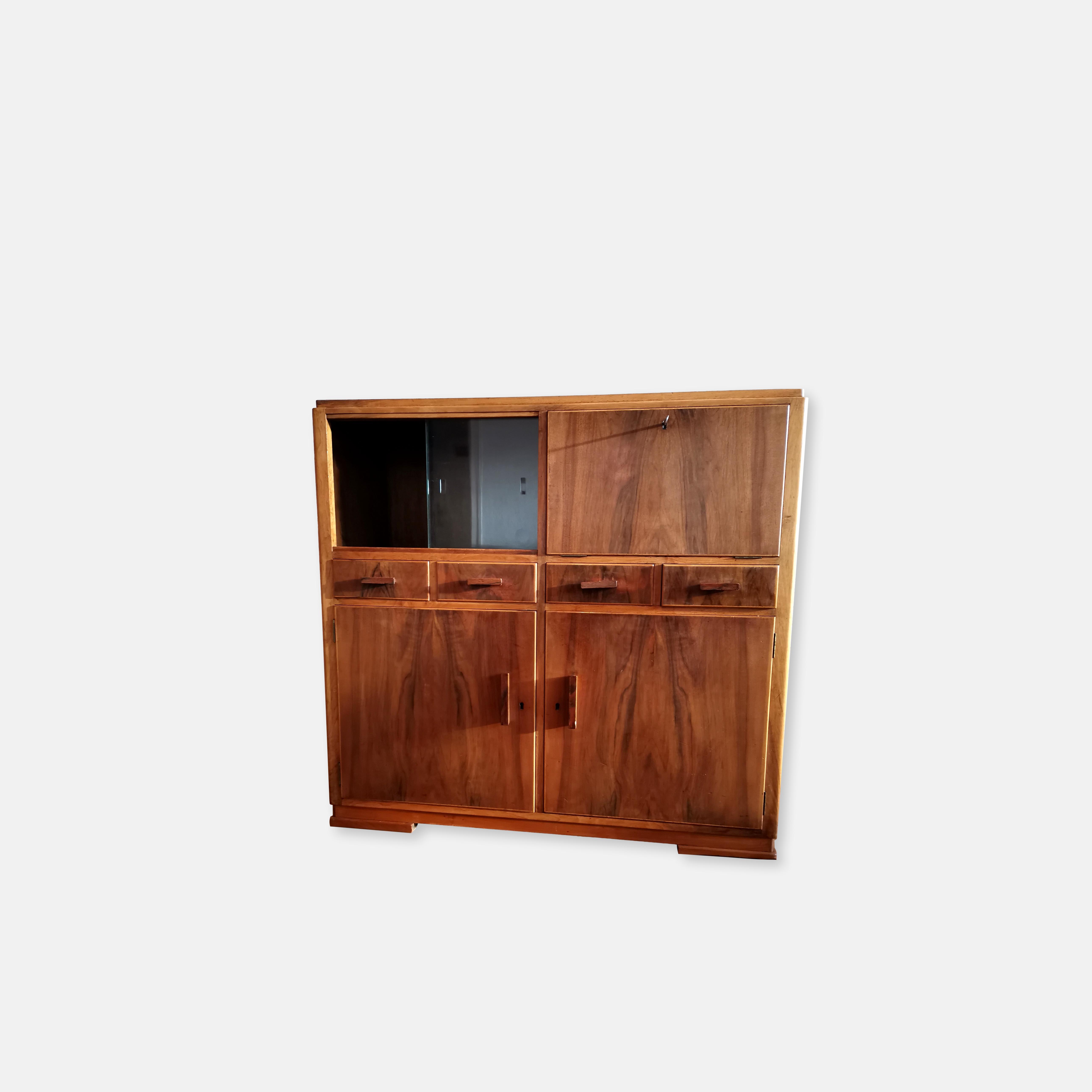 Produit venduMeuble de rangement vintage en bois. Doté de 4 tiroirs et de plusieurs espaces de rangement dont un avec vitrine et un avec porte rabattable (idéal pour bar).