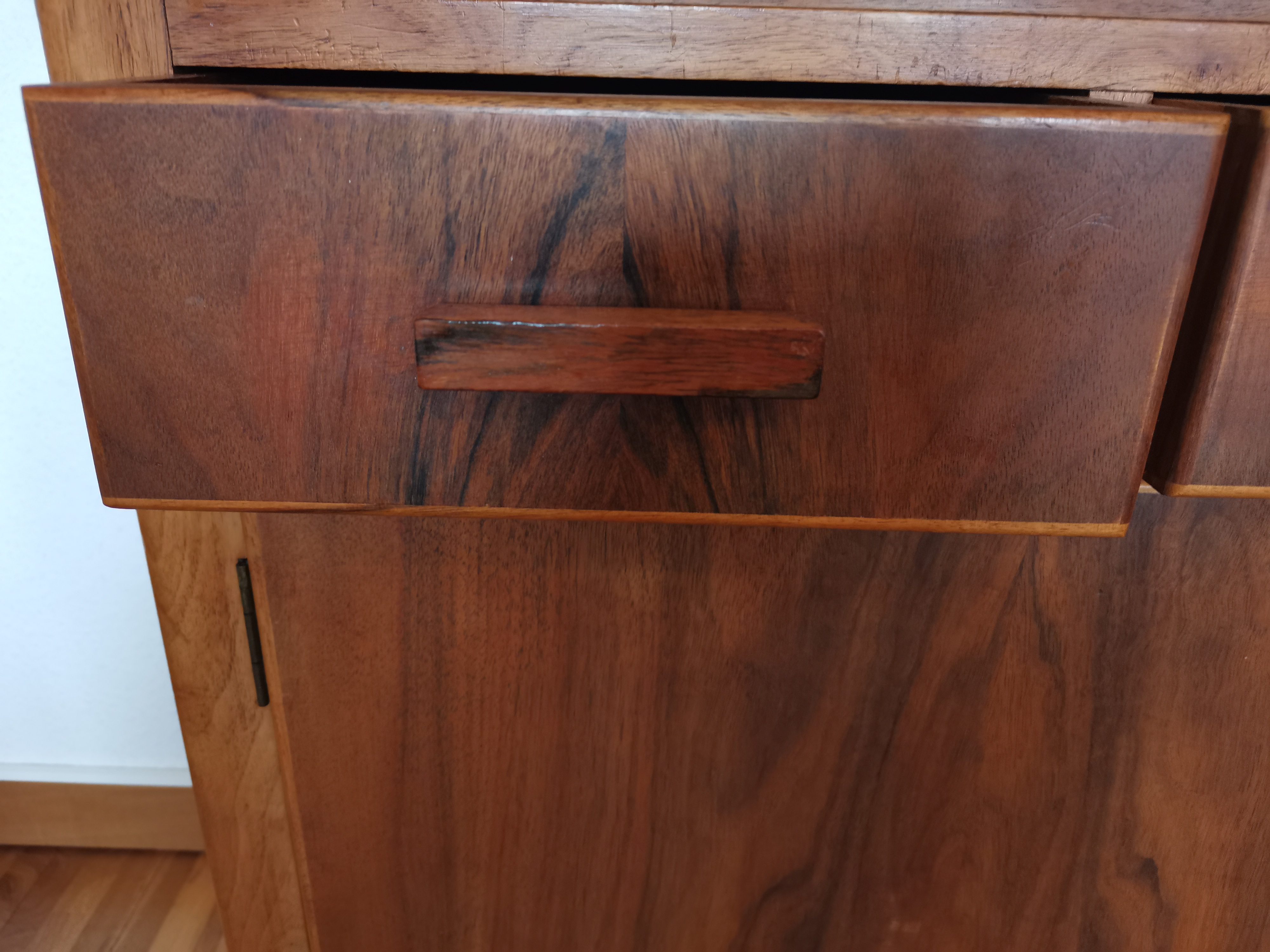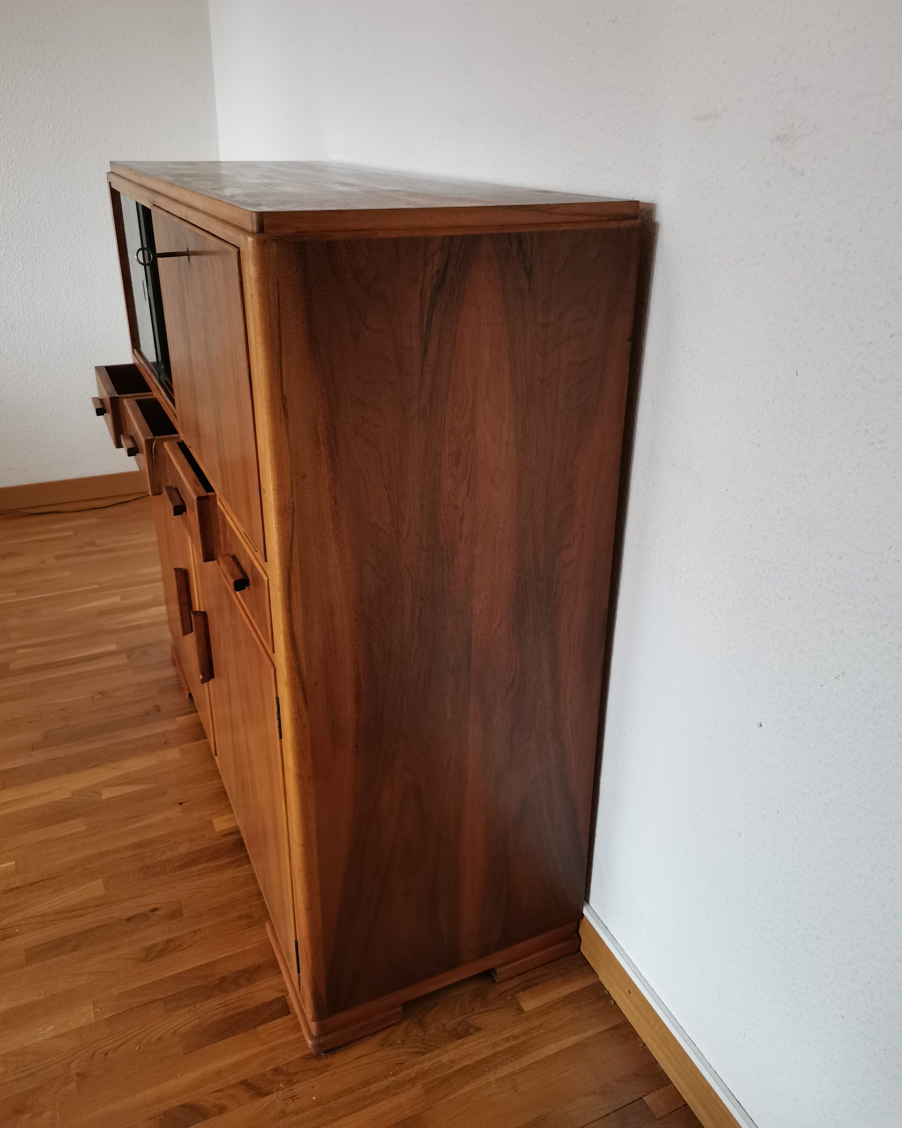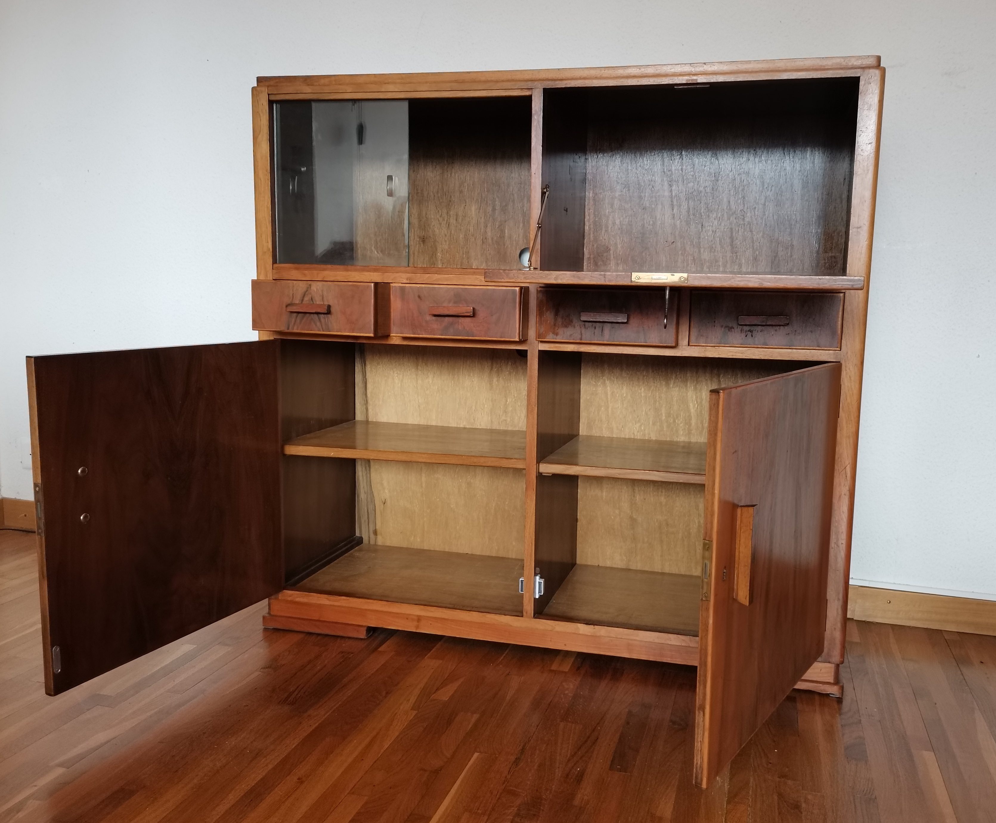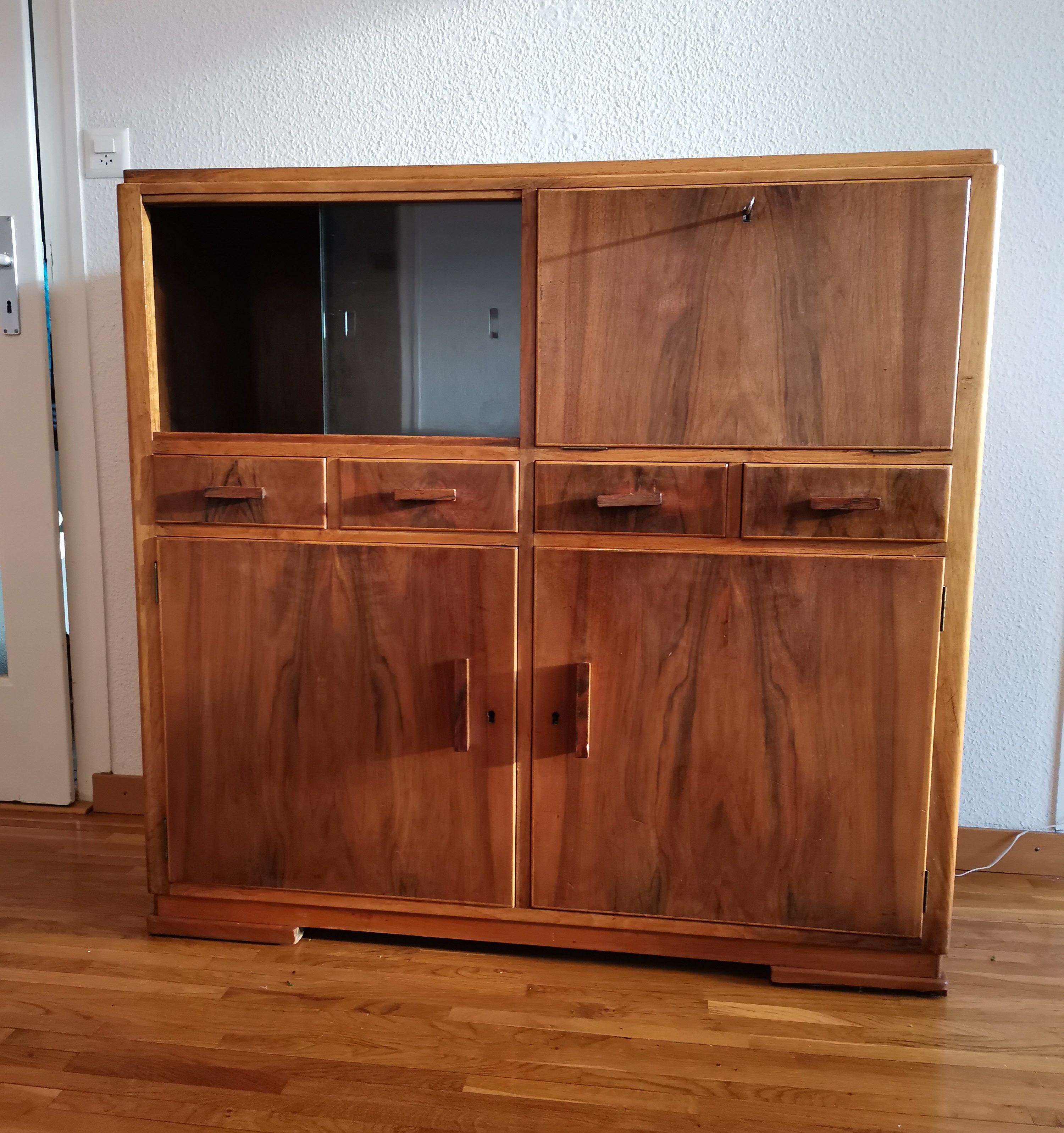 Produit venduMeuble de rangement vintage en bois. Doté de 4 tiroirs et de plusieurs espaces de rangement dont un avec vitrine et un avec porte rabattable (idéal pour bar).