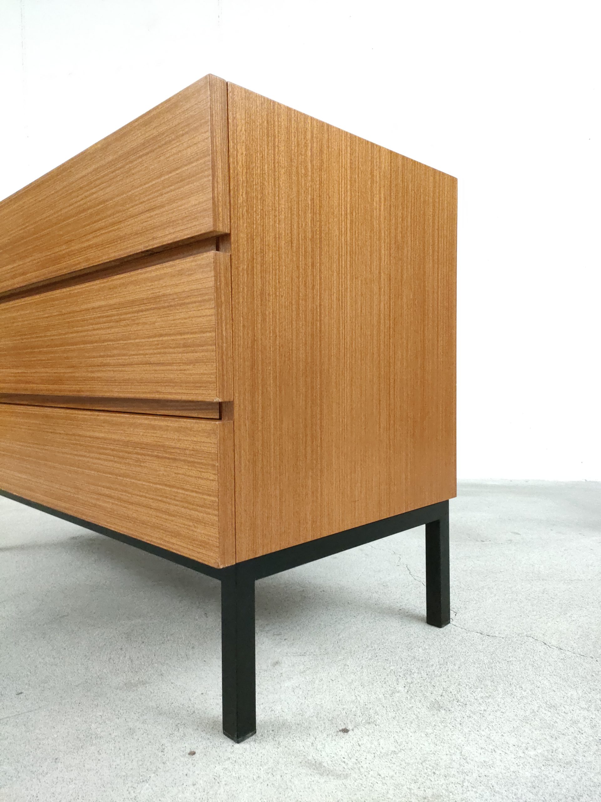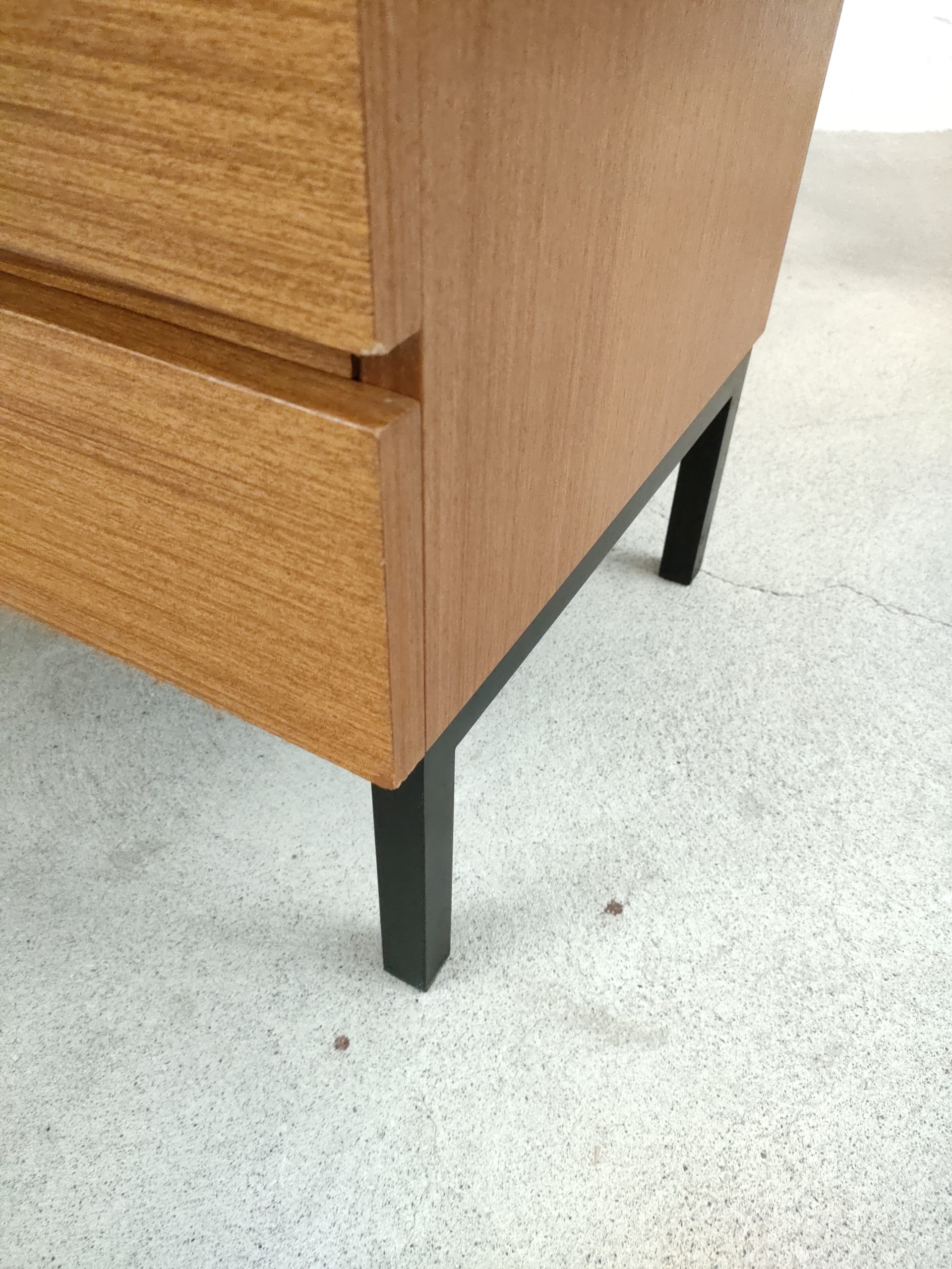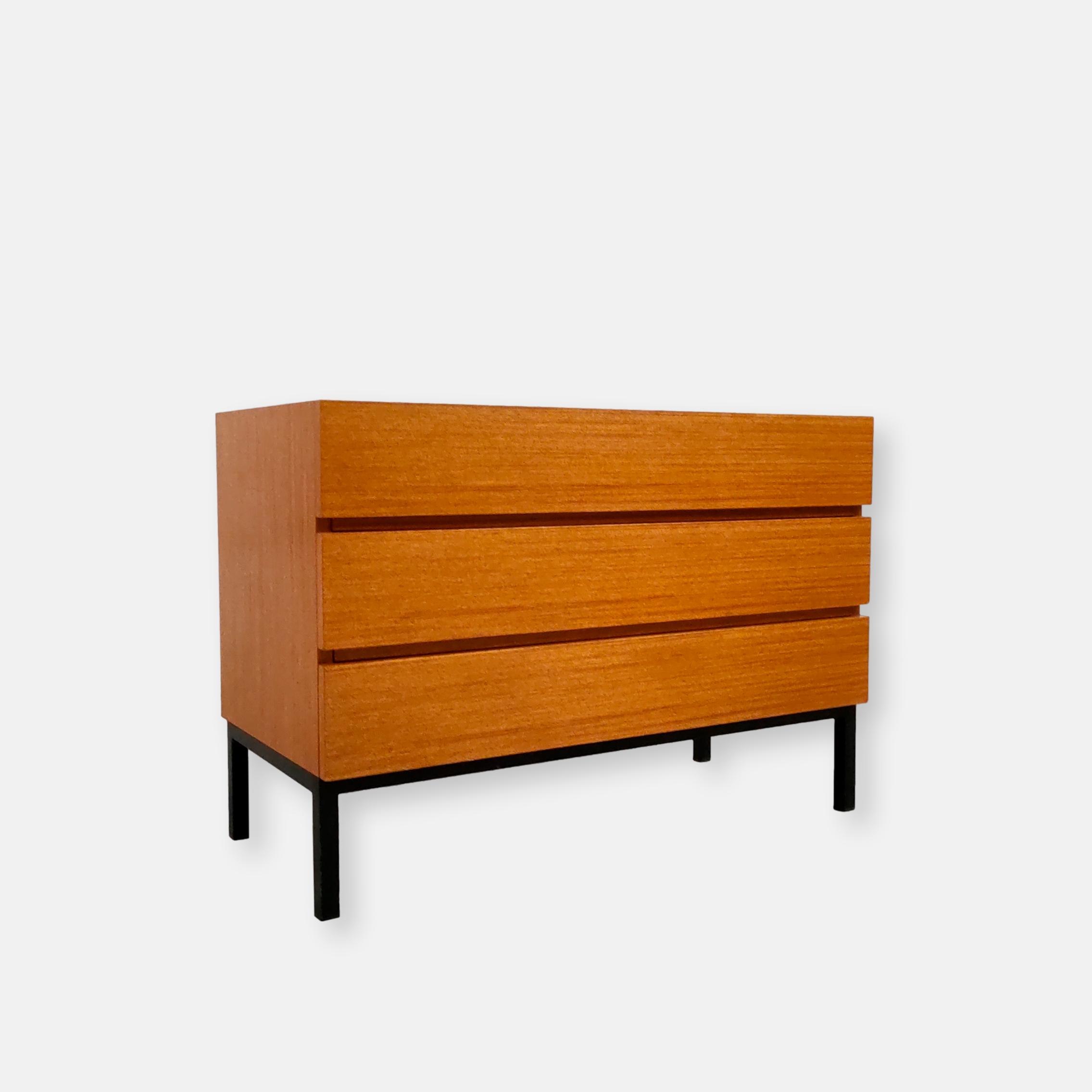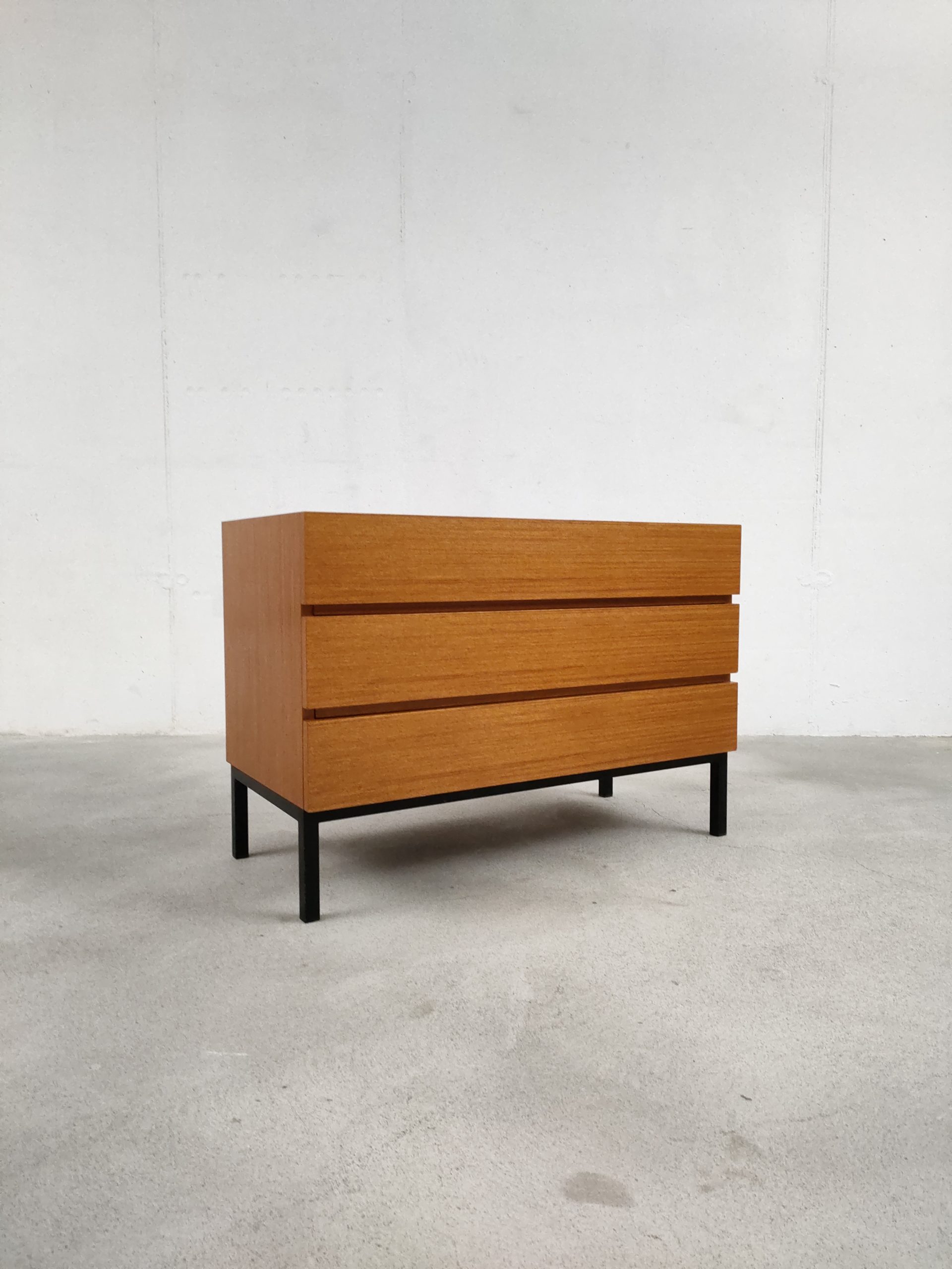 Produit venduMeuble de rangement vintage en bois doté de 3 tiroirs et d’un piètement en métal noir. Produit par le fabricant suisse MSL. Quelques traces d’usure sur le bois, en particulier un coin du tiroir en bas a droite a été réparé avec de la pâte à bois (voir photos). Le meuble est stable est solide et très élégant avec ses lignes minimalistes.