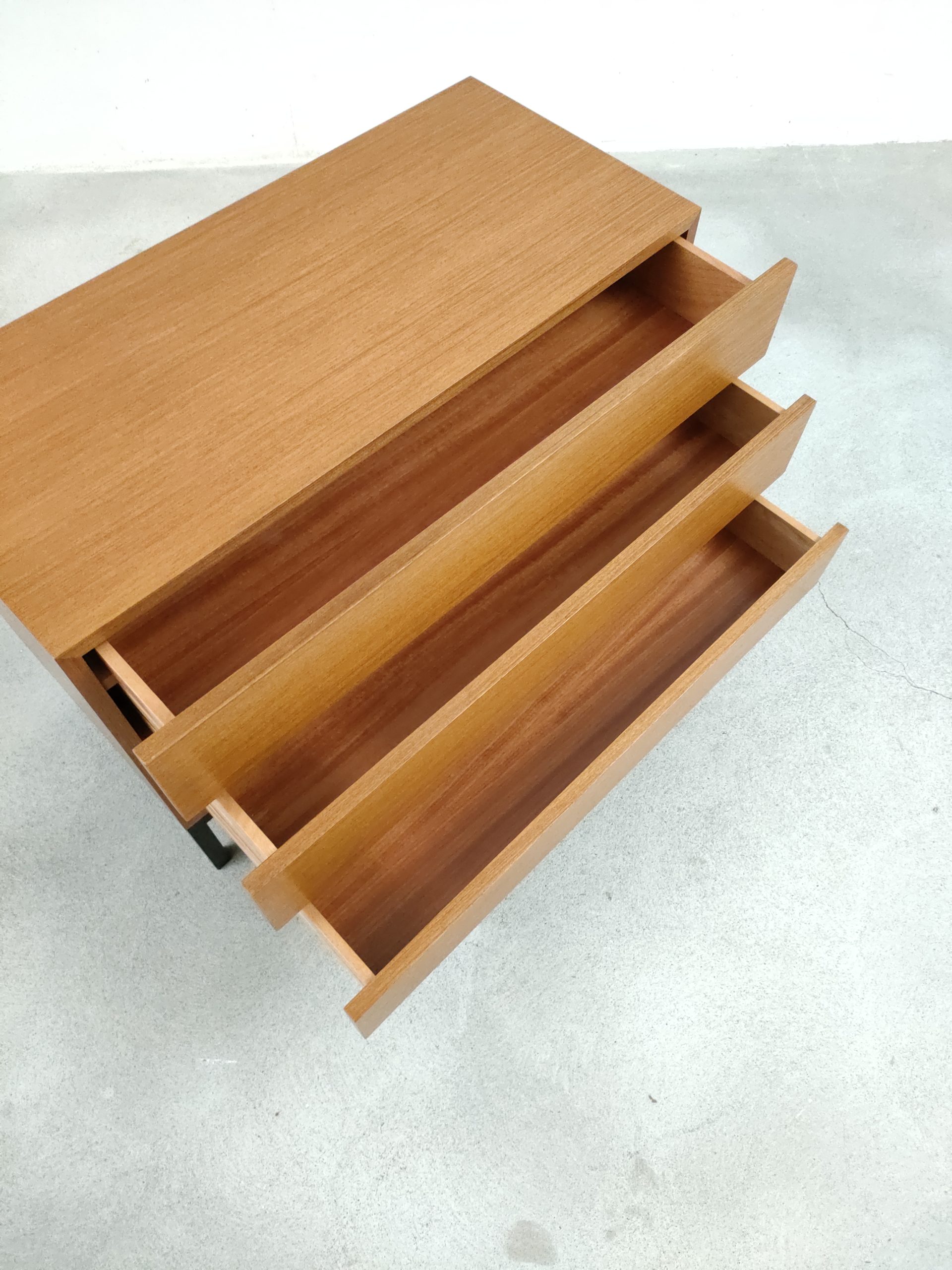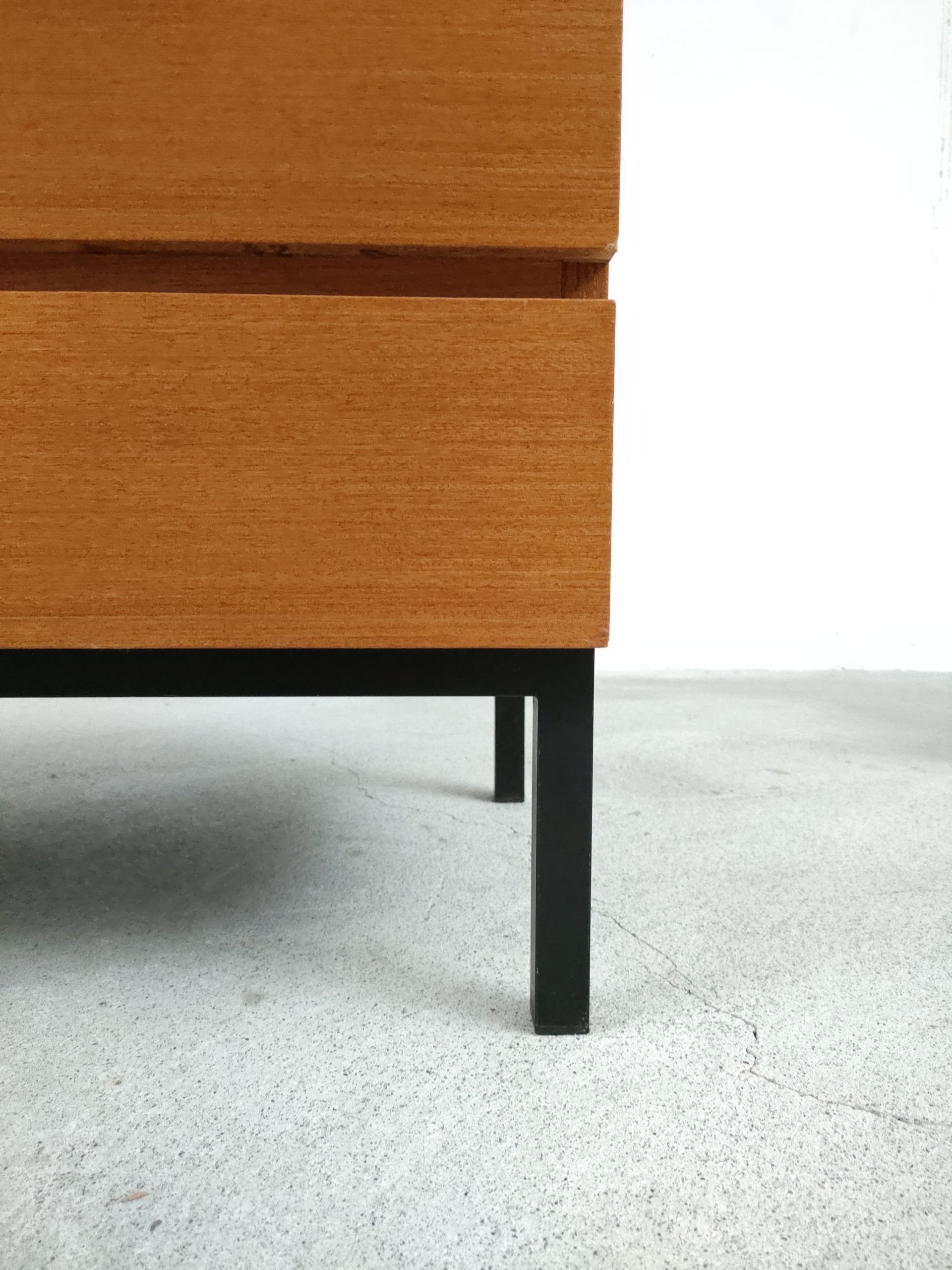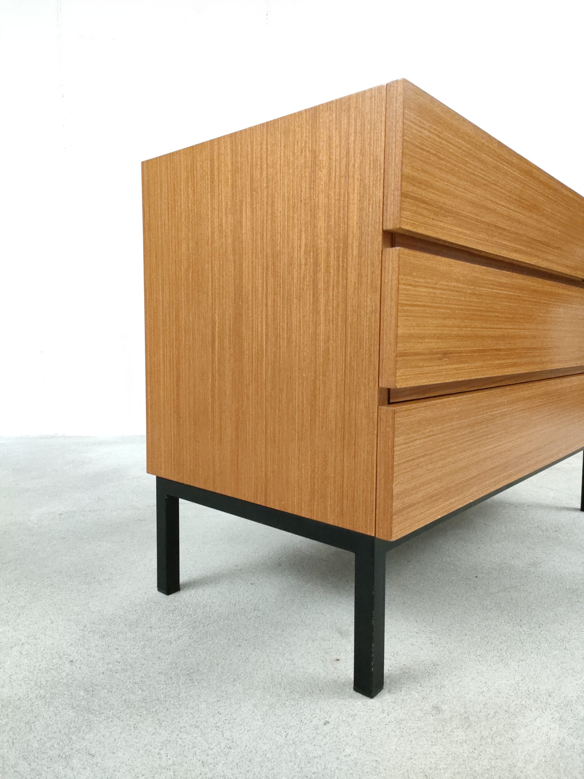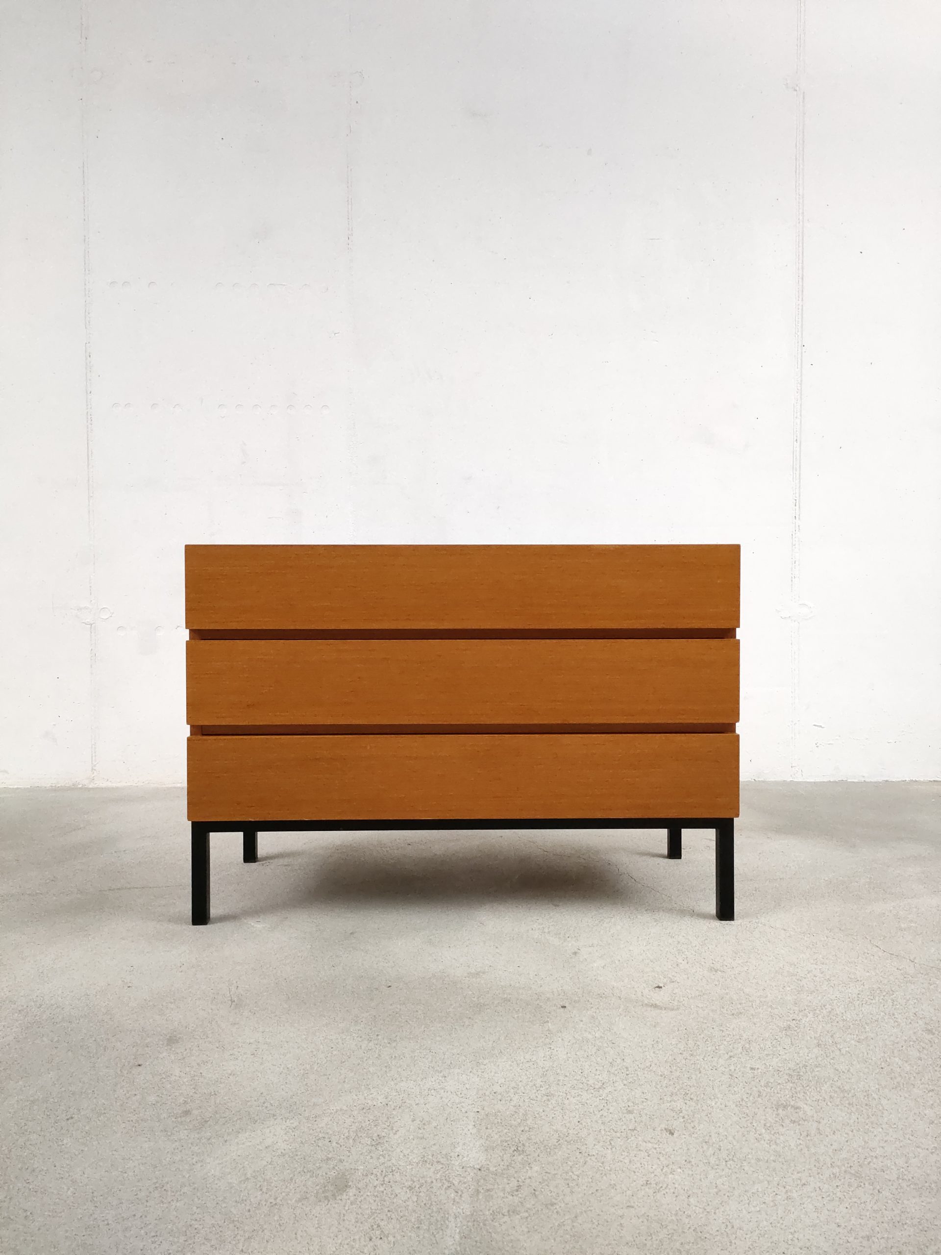 Produit venduMeuble de rangement vintage en bois doté de 3 tiroirs et d’un piètement en métal noir. Produit par le fabricant suisse MSL. Quelques traces d’usure sur le bois, en particulier un coin du tiroir en bas a droite a été réparé avec de la pâte à bois (voir photos). Le meuble est stable est solide et très élégant avec ses lignes minimalistes.
