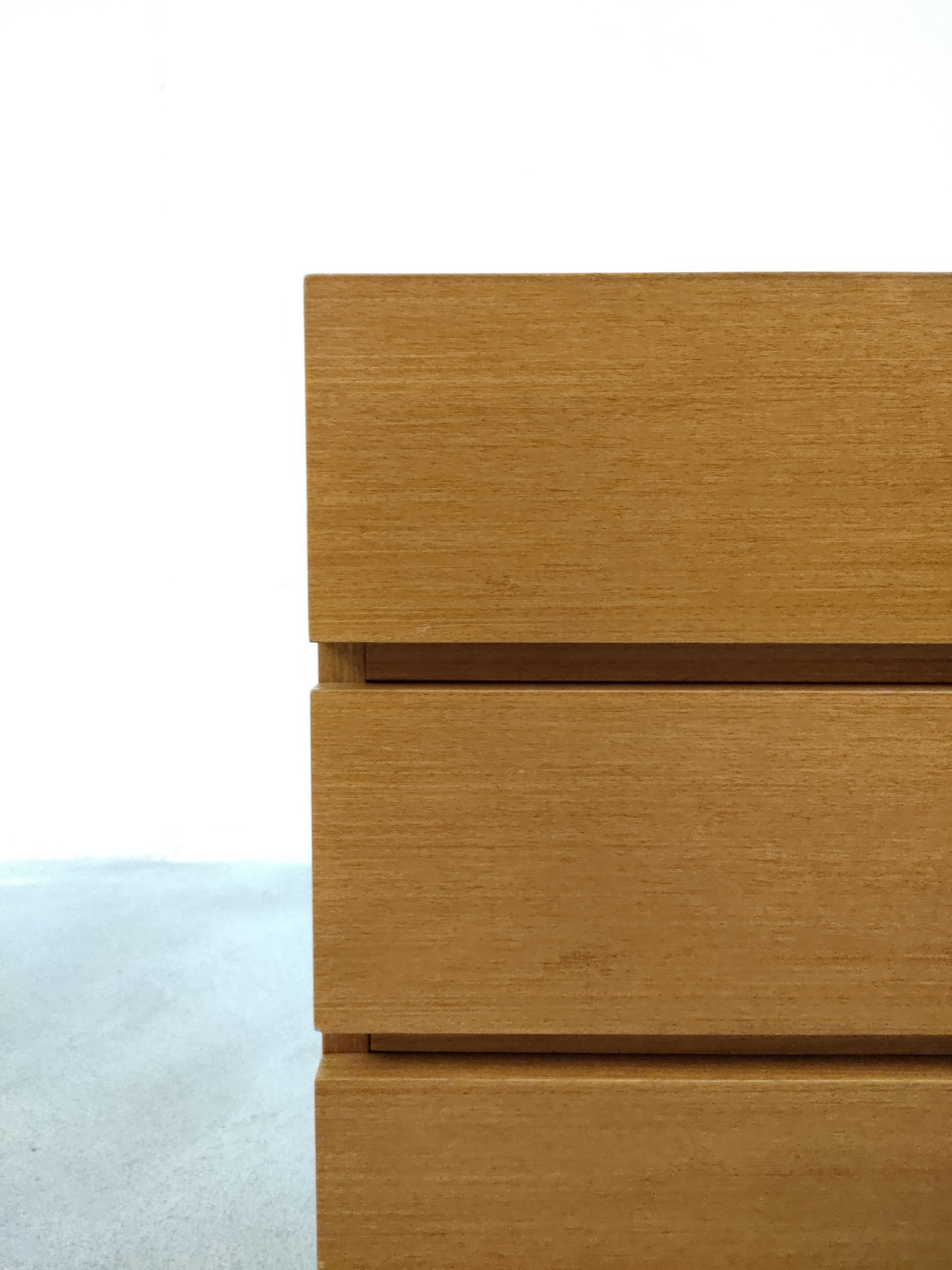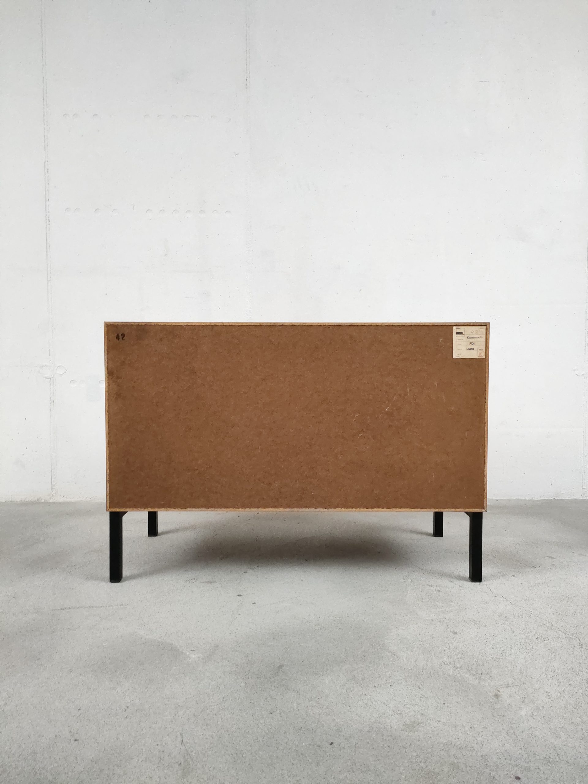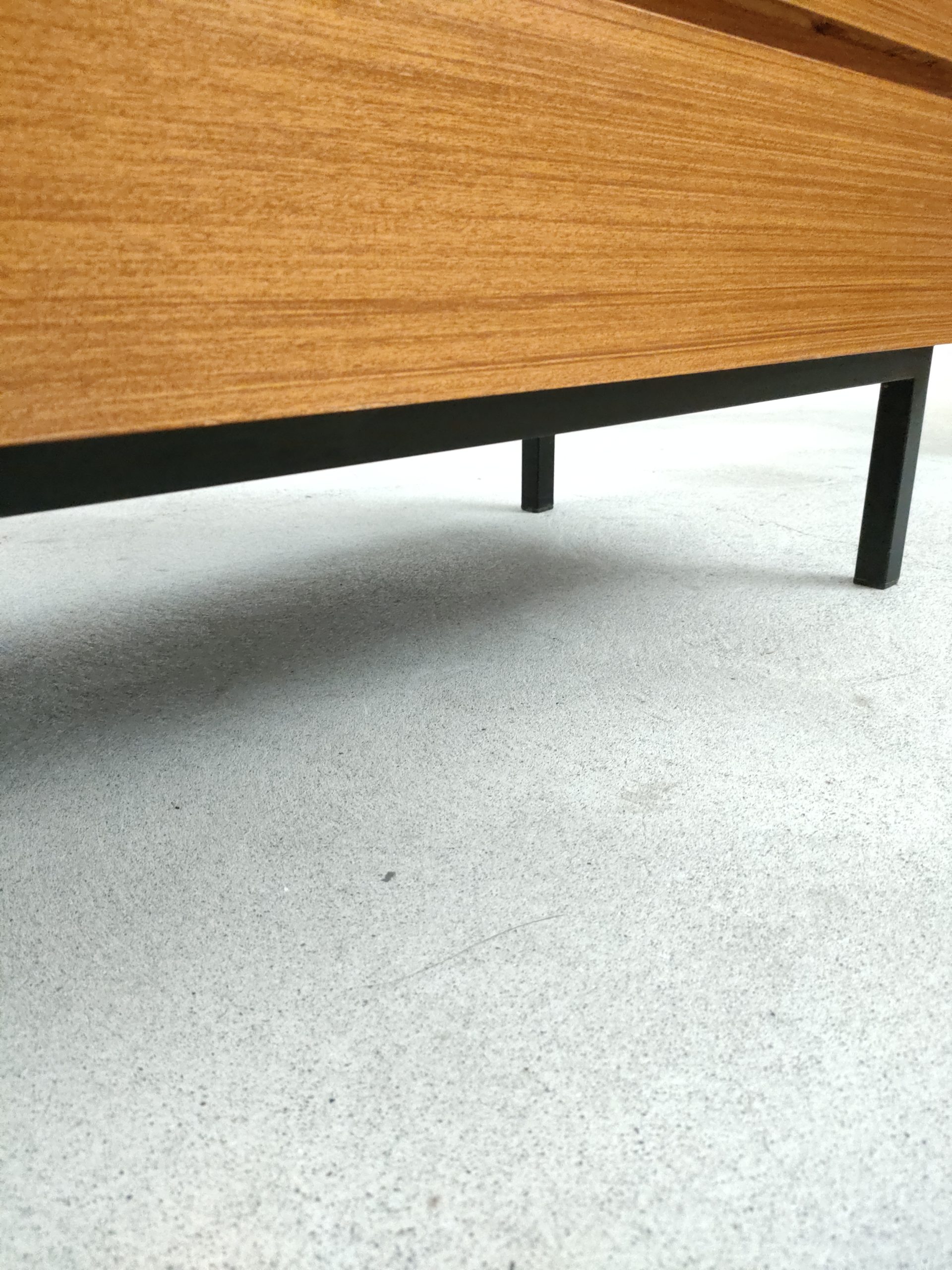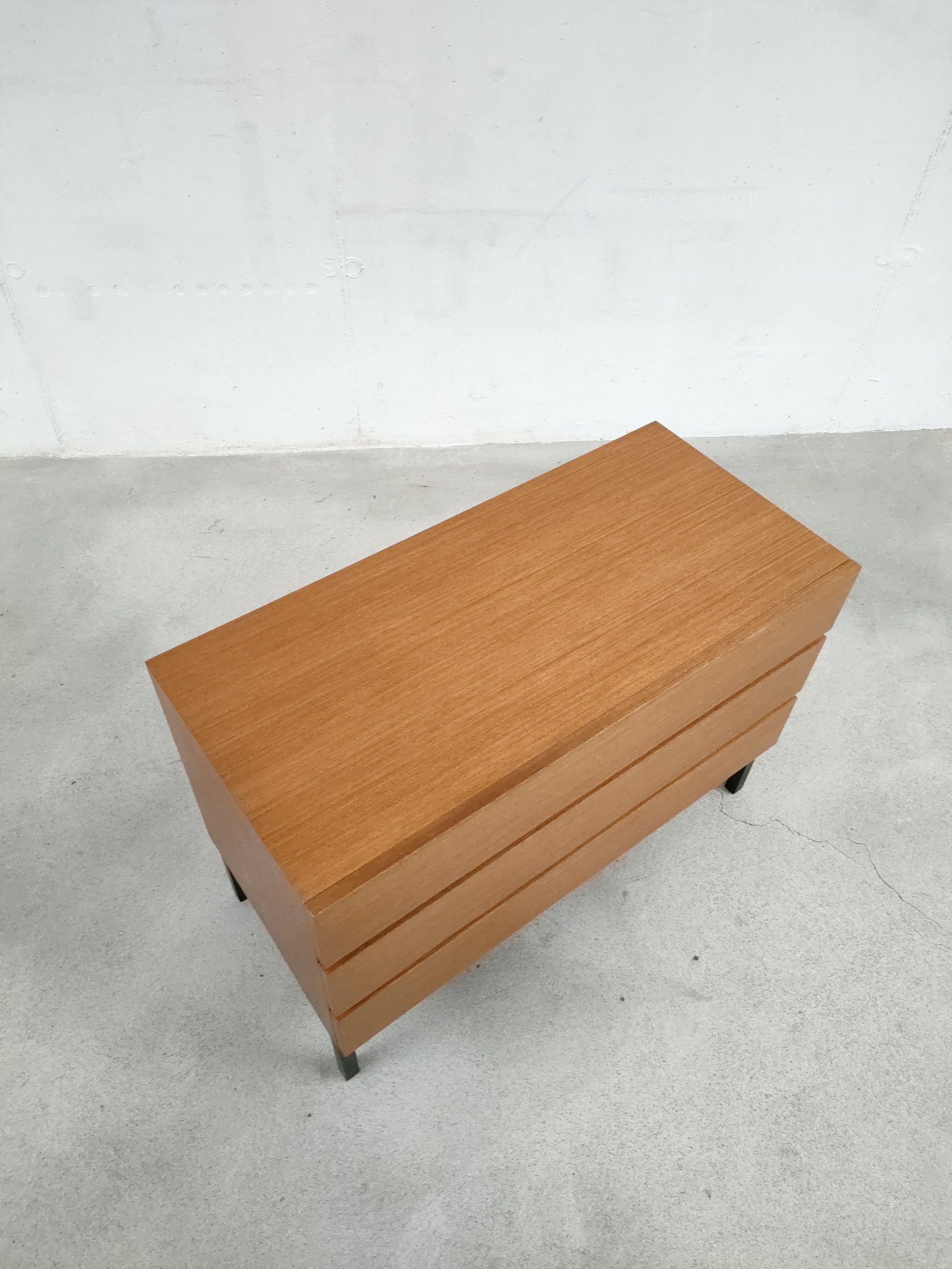 Produit venduMeuble de rangement vintage en bois doté de 3 tiroirs et d’un piètement en métal noir. Produit par le fabricant suisse MSL. Quelques traces d’usure sur le bois, en particulier un coin du tiroir en bas a droite a été réparé avec de la pâte à bois (voir photos). Le meuble est stable est solide et très élégant avec ses lignes minimalistes.