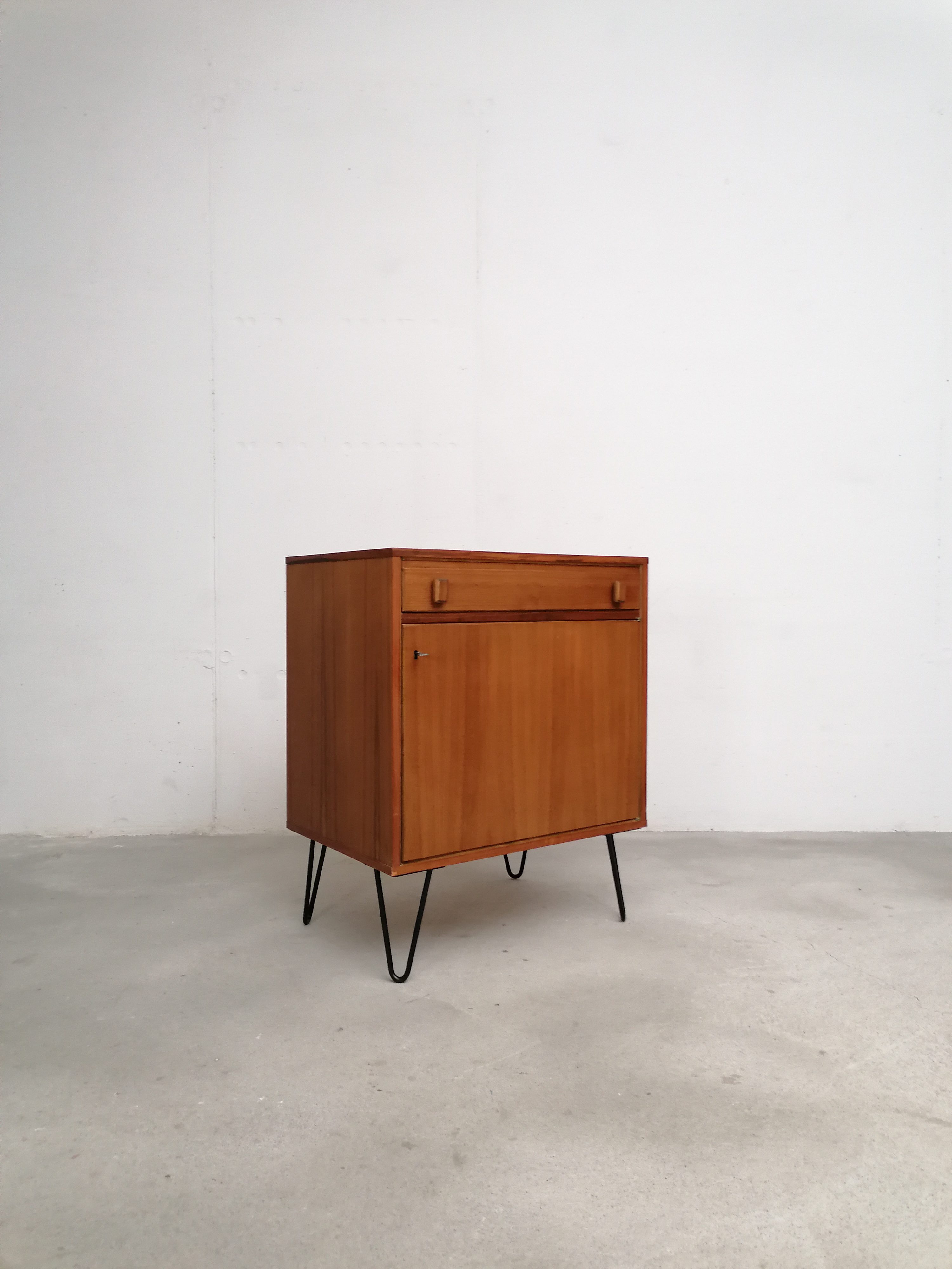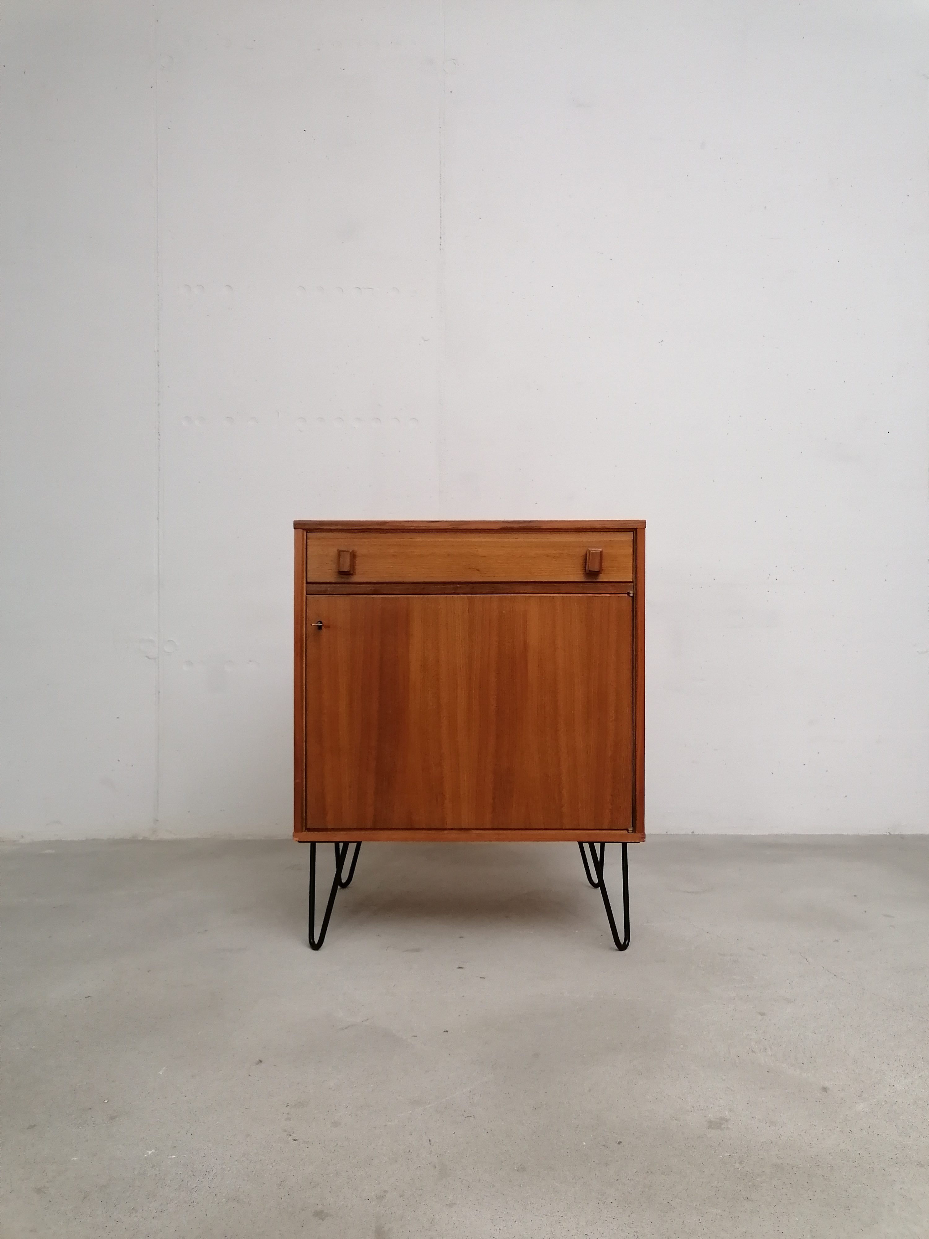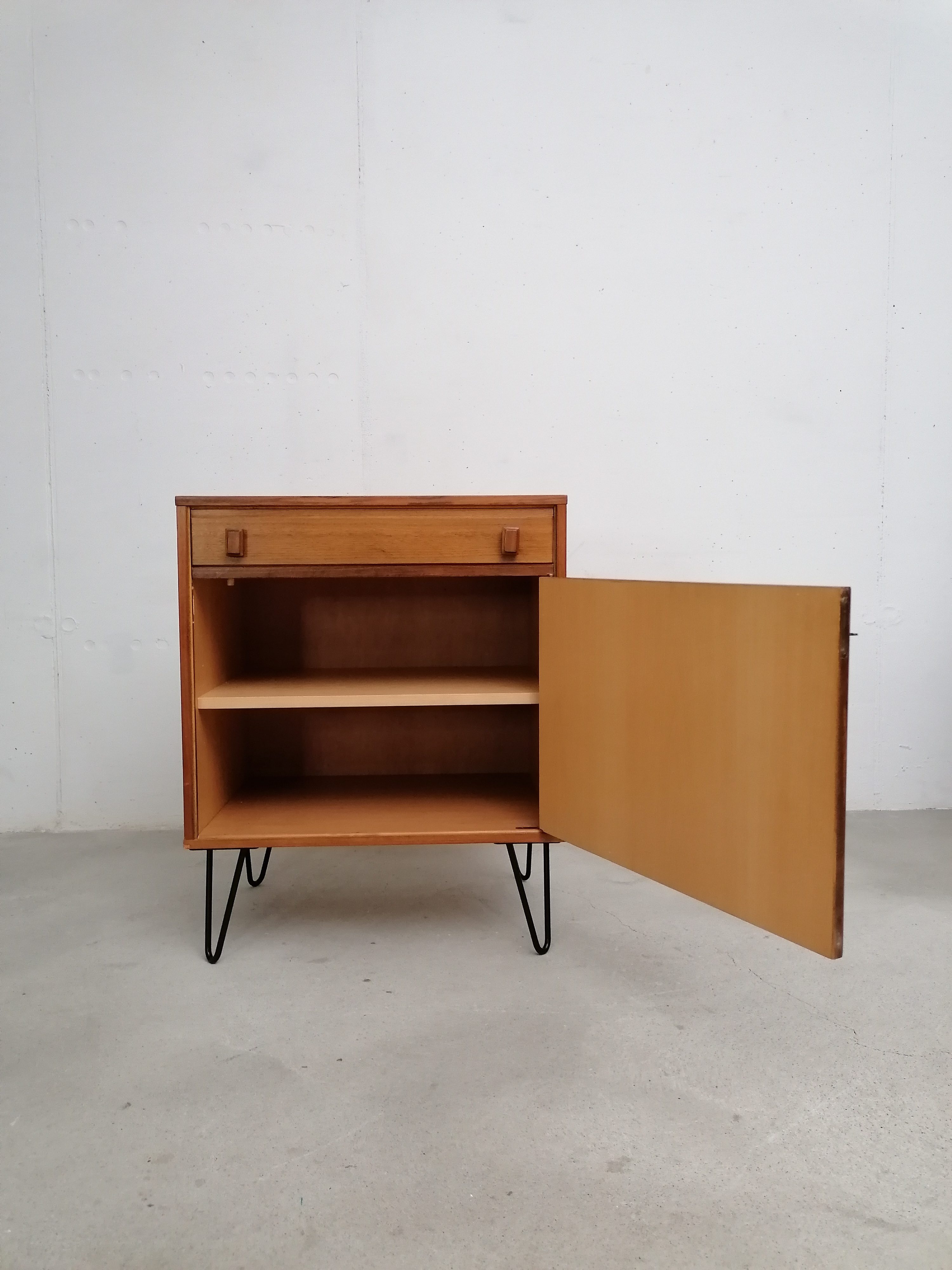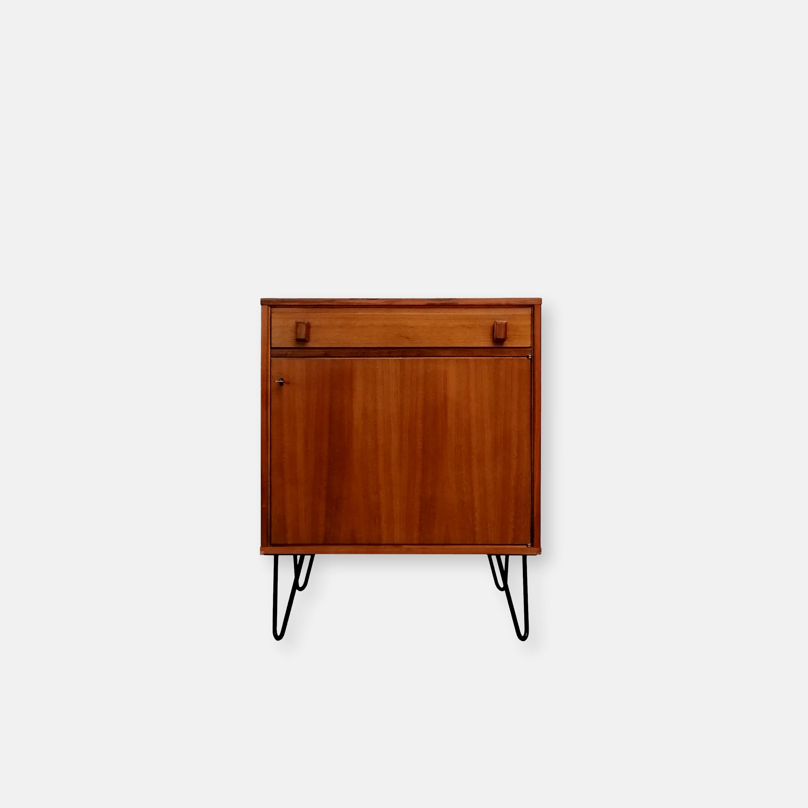 Produit venduMeuble de rangement vintage suédois avec un tiroir et un espace de rangement avec porte et étagère à l’intérieur. Piètement en métal noir probablement pas d’origine. Quelques légères traces d’usure visibles sur les photos. Parfaitement stable et fonctionnel.