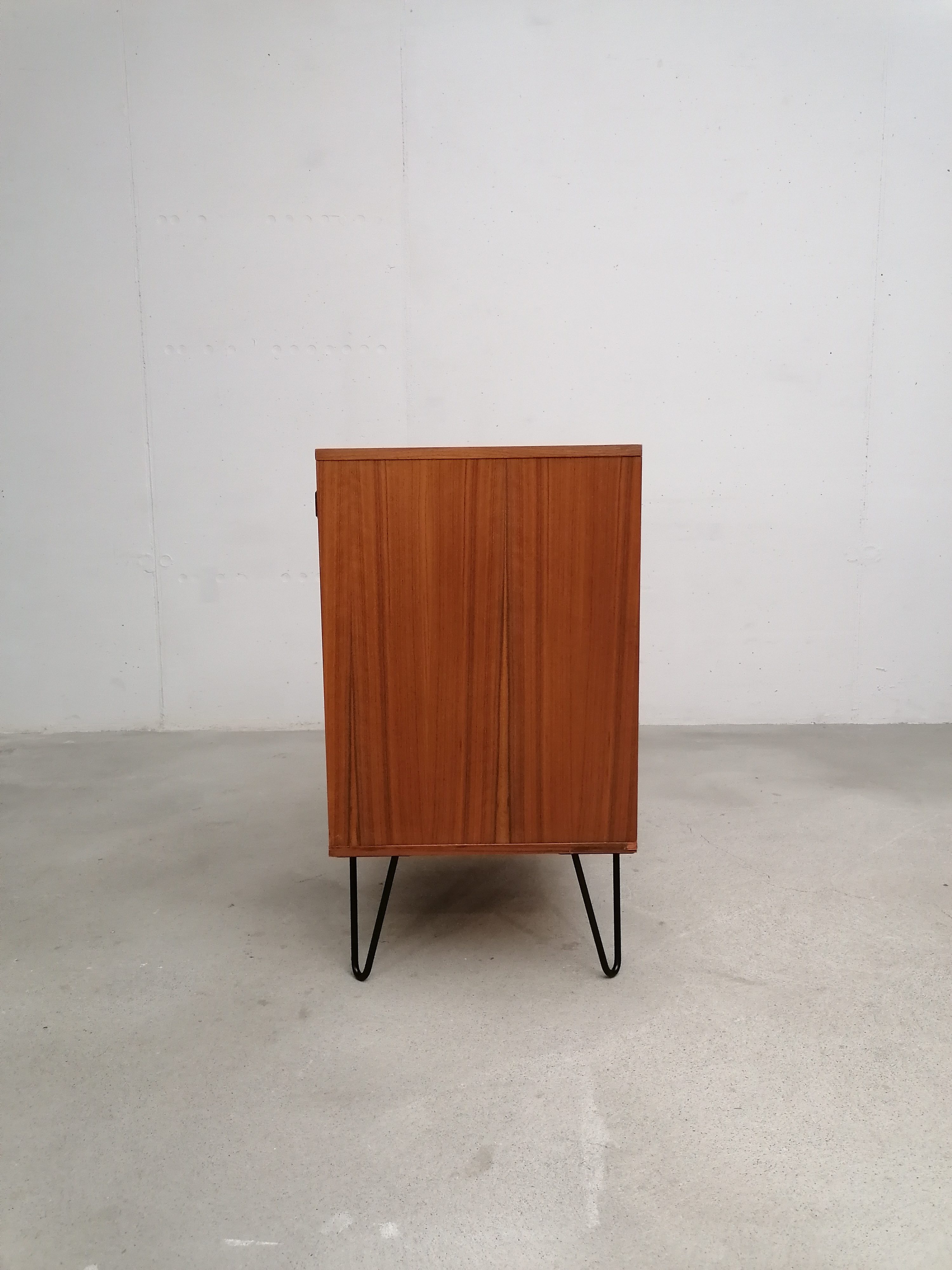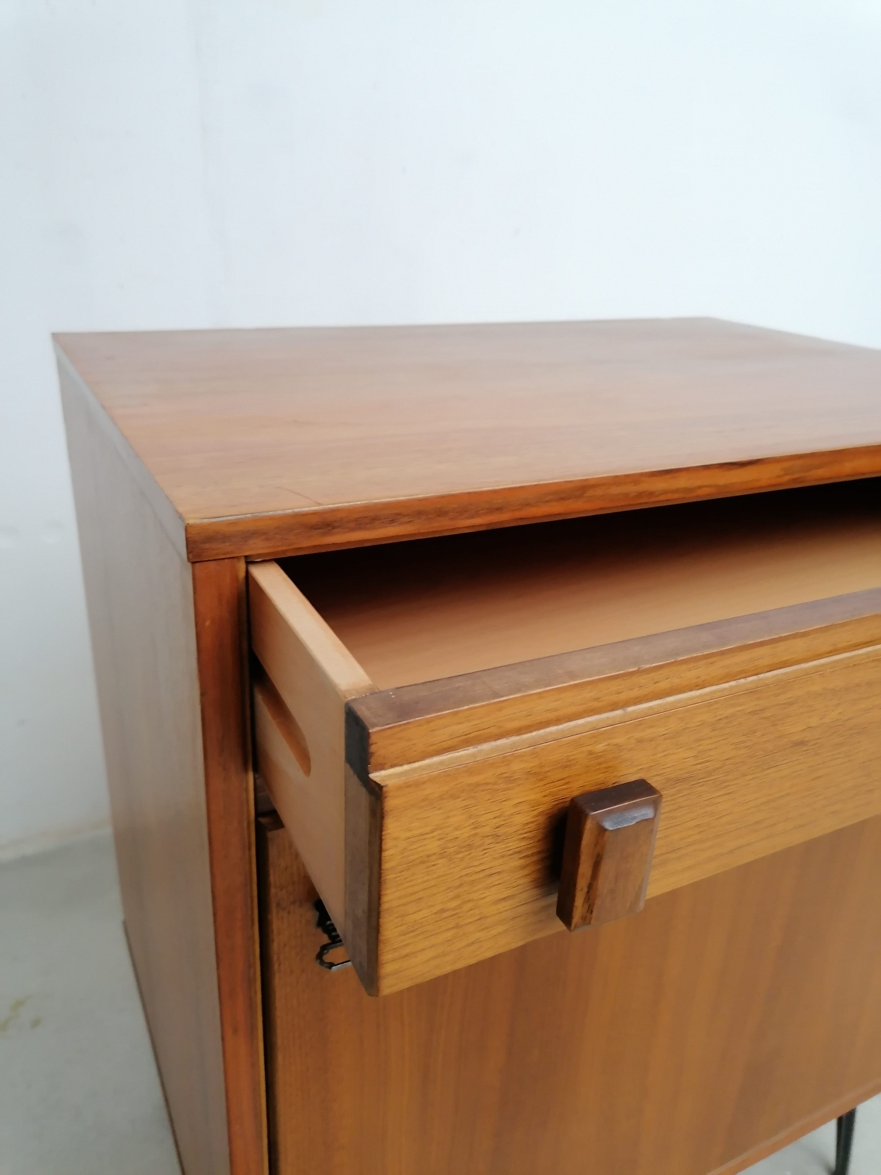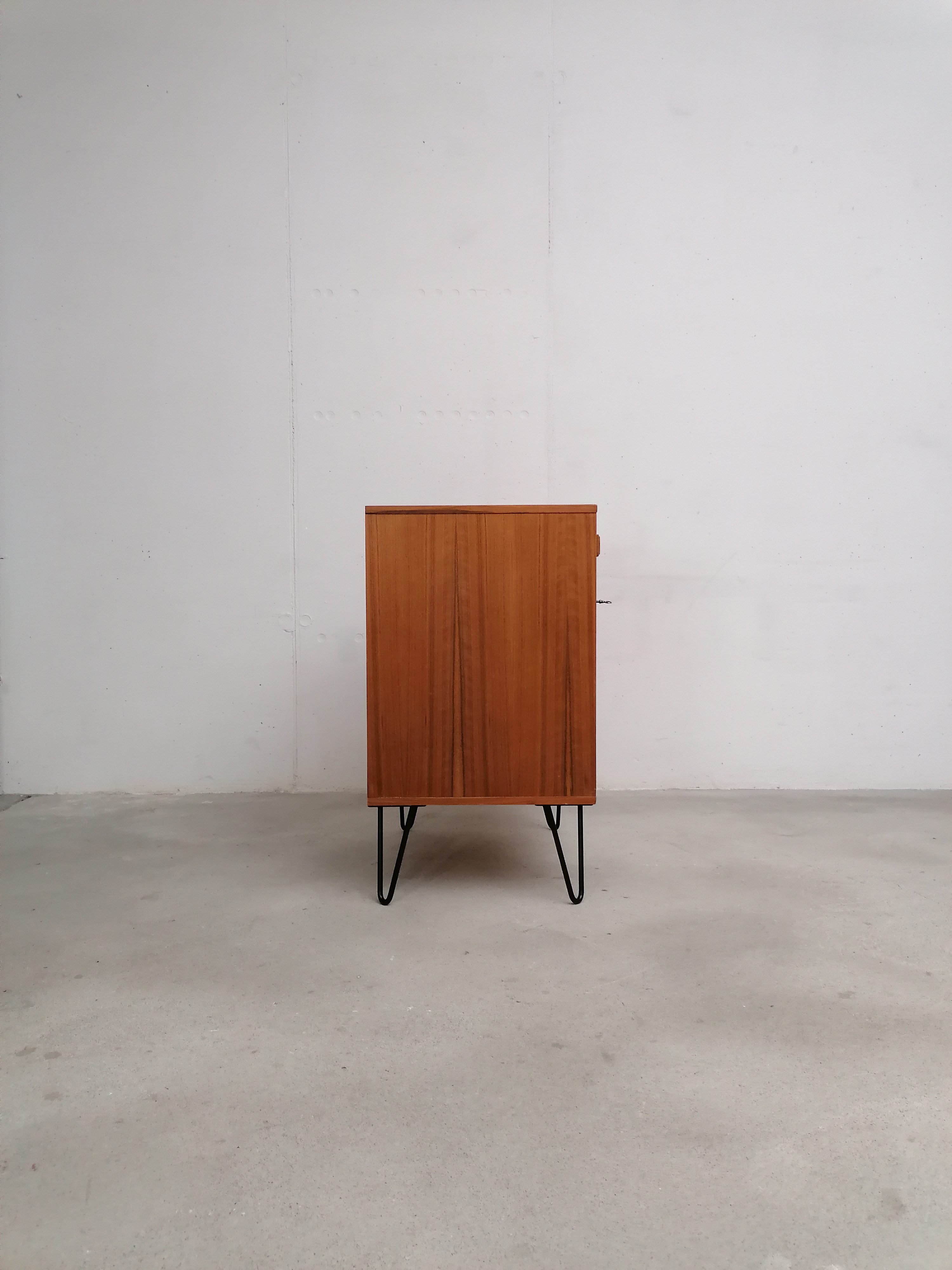 Produit venduMeuble de rangement vintage suédois avec un tiroir et un espace de rangement avec porte et étagère à l’intérieur. Piètement en métal noir probablement pas d’origine. Quelques légères traces d’usure visibles sur les photos. Parfaitement stable et fonctionnel.