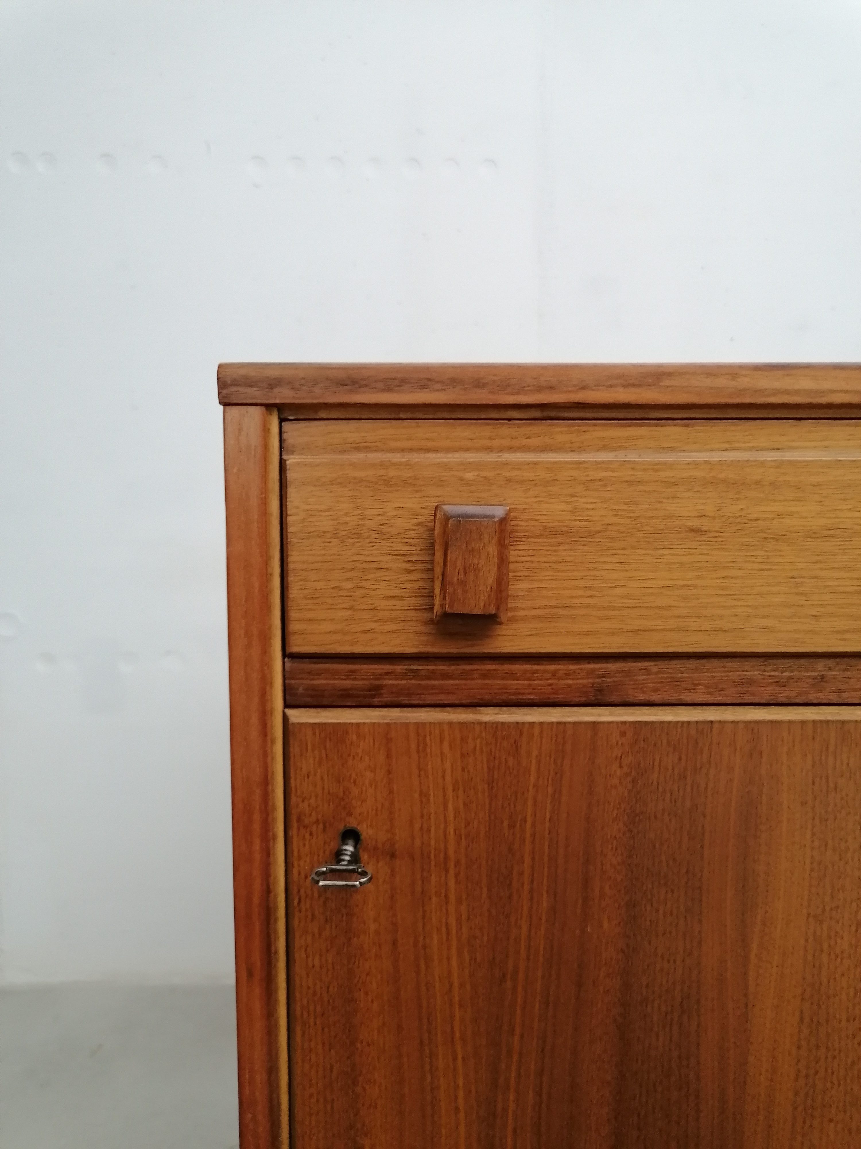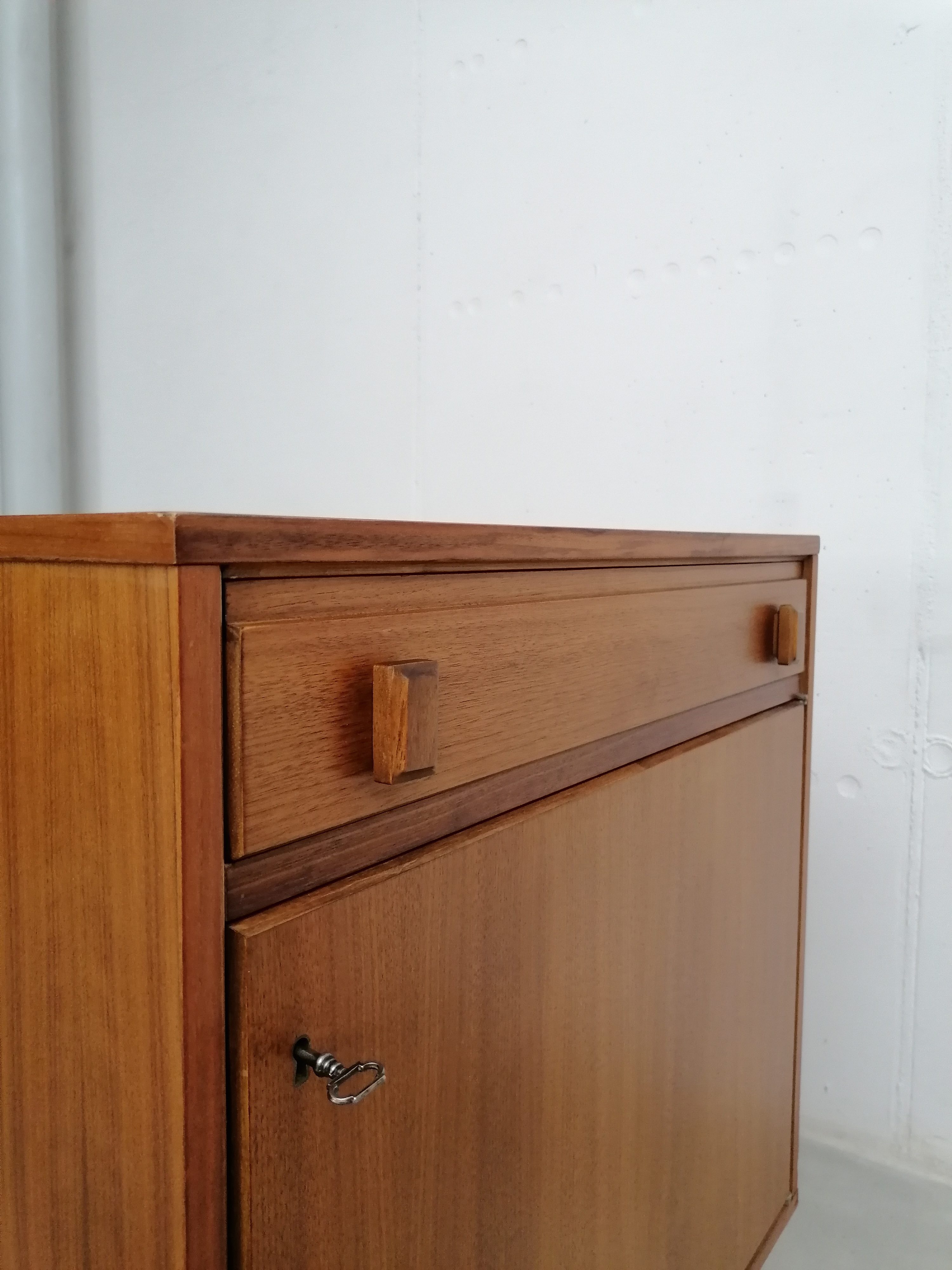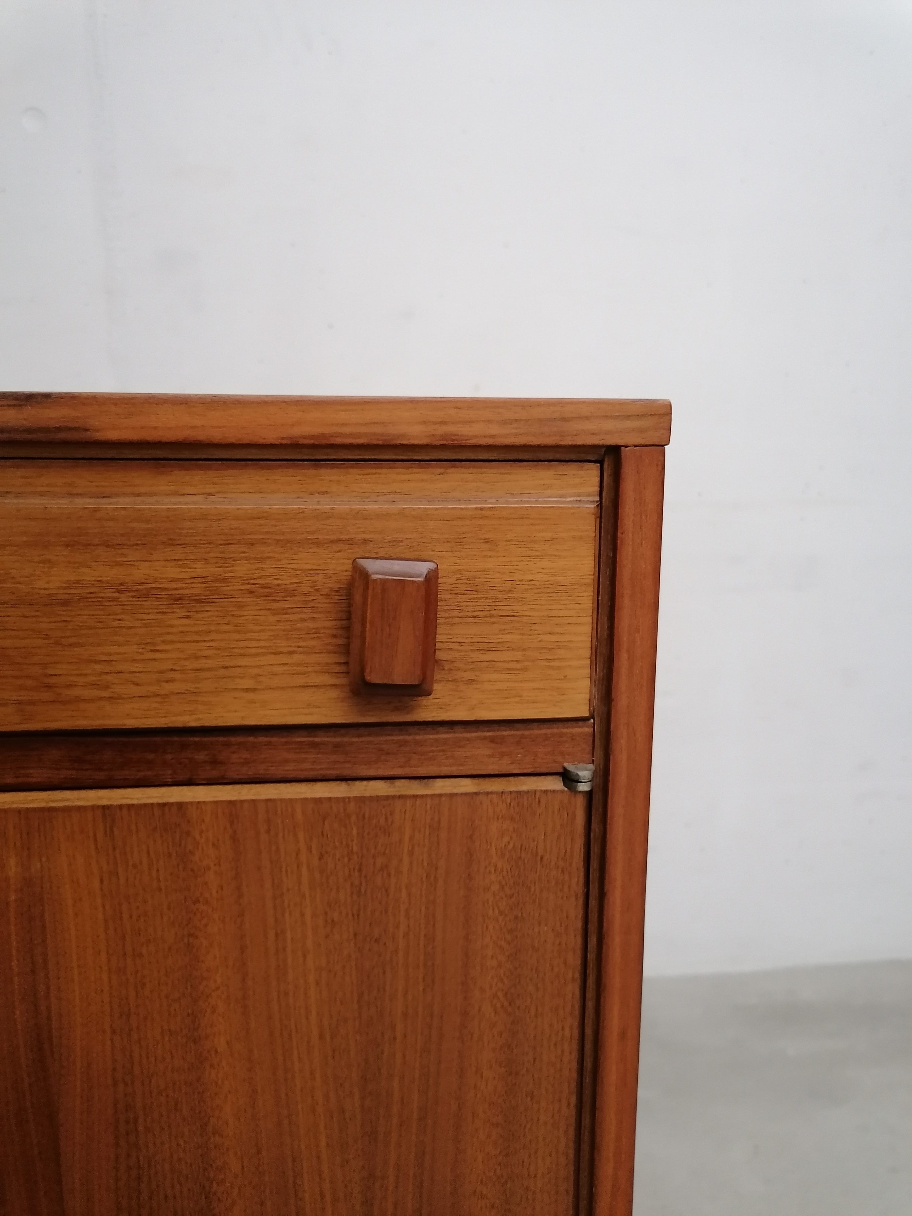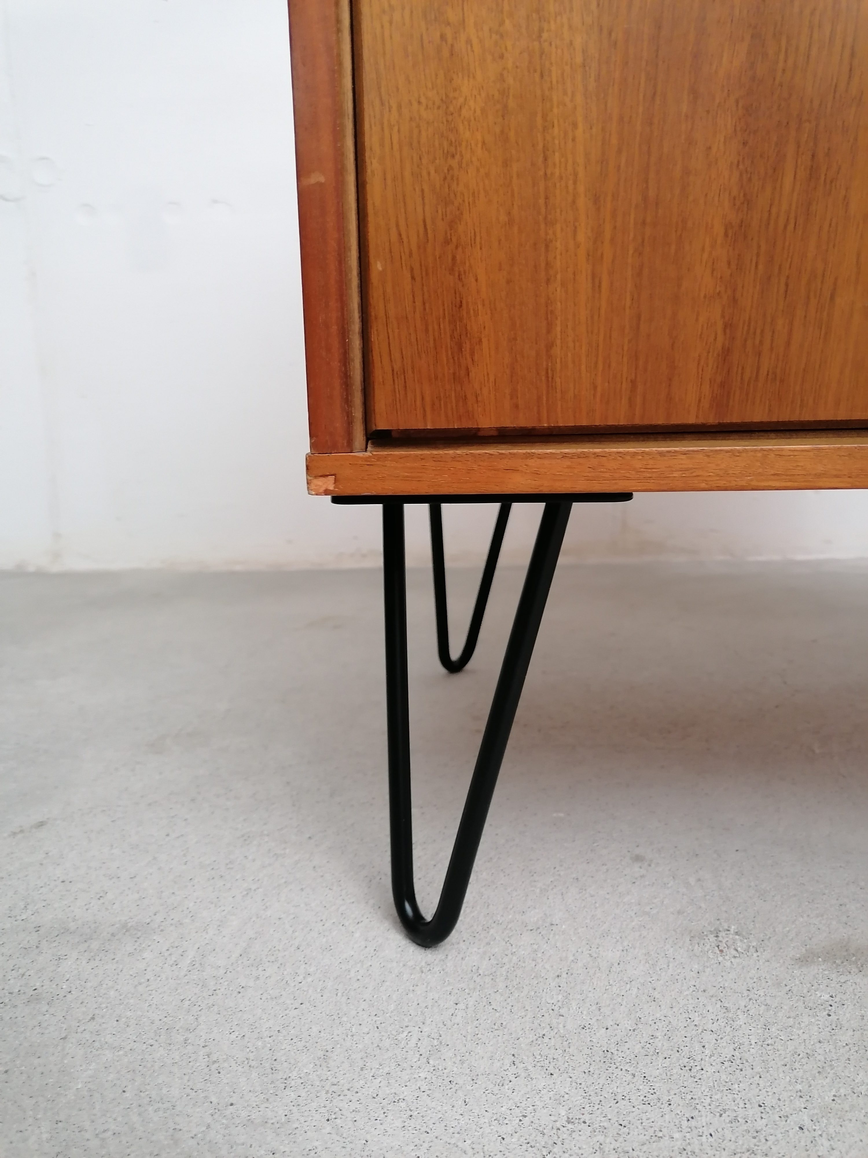 Produit venduMeuble de rangement vintage suédois avec un tiroir et un espace de rangement avec porte et étagère à l’intérieur. Piètement en métal noir probablement pas d’origine. Quelques légères traces d’usure visibles sur les photos. Parfaitement stable et fonctionnel.