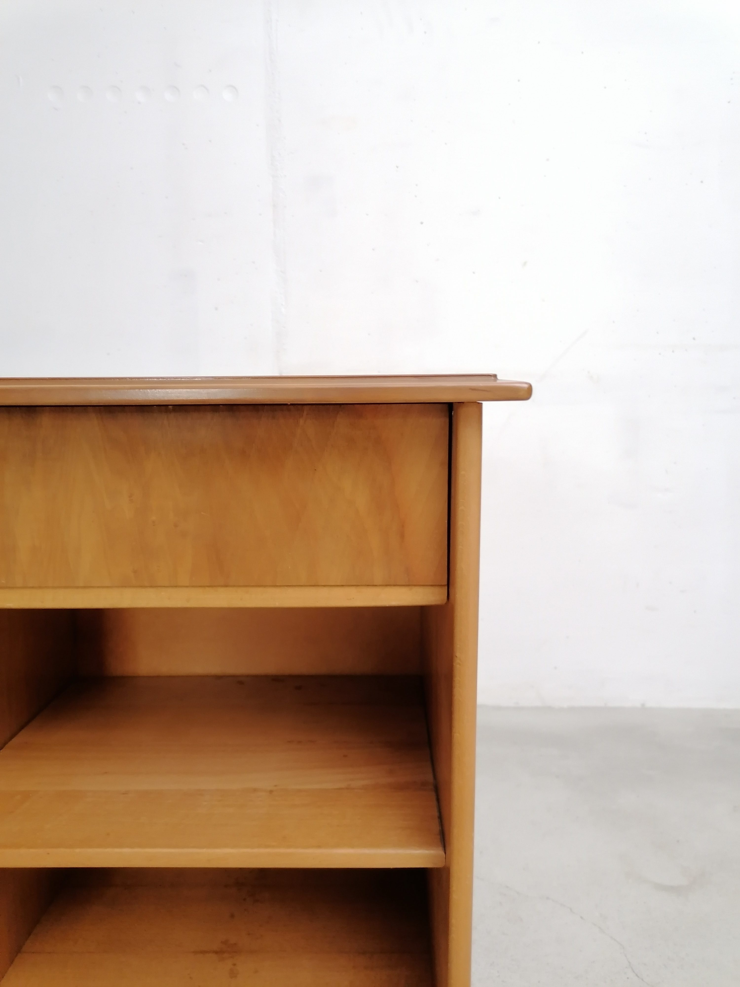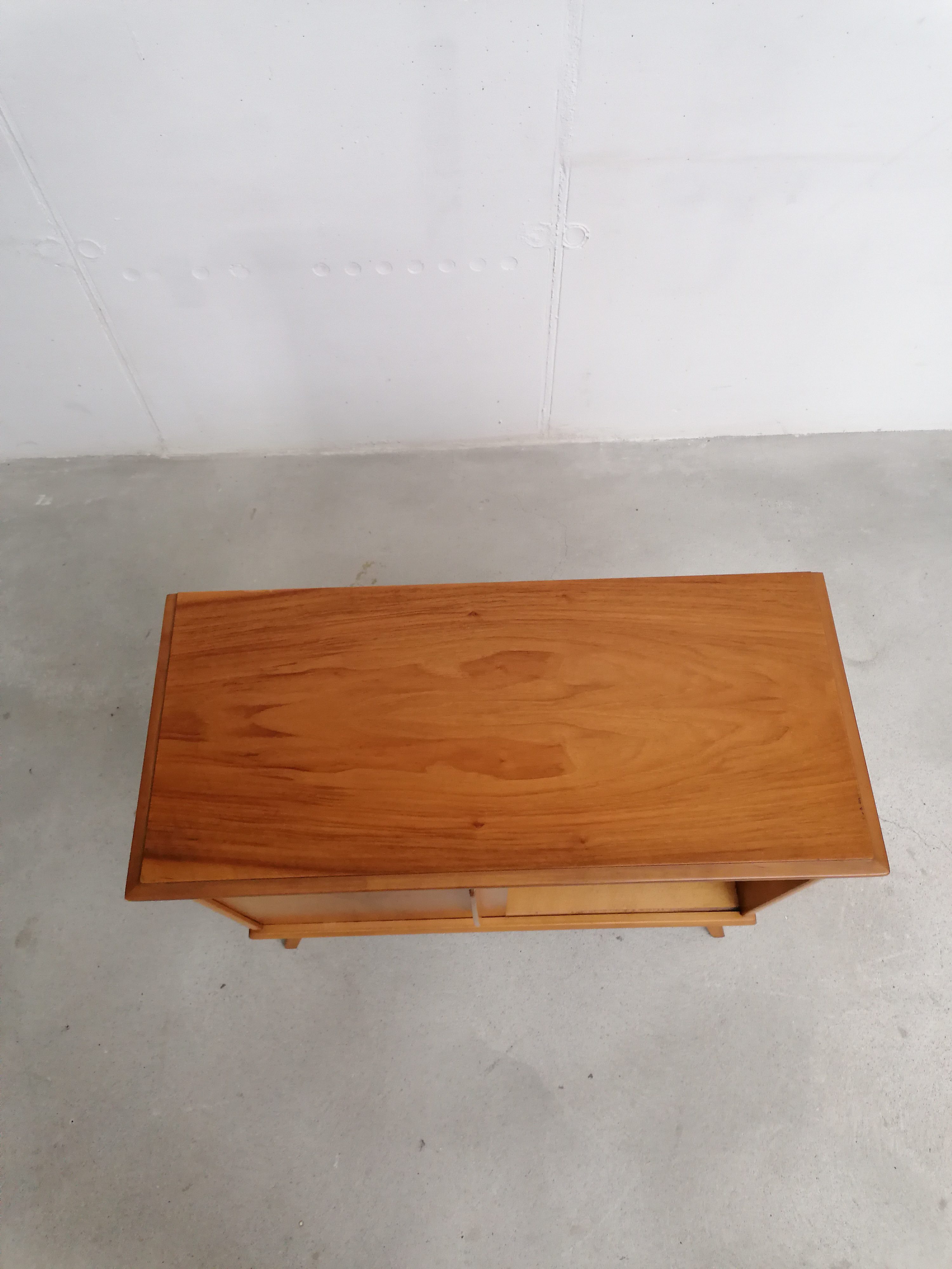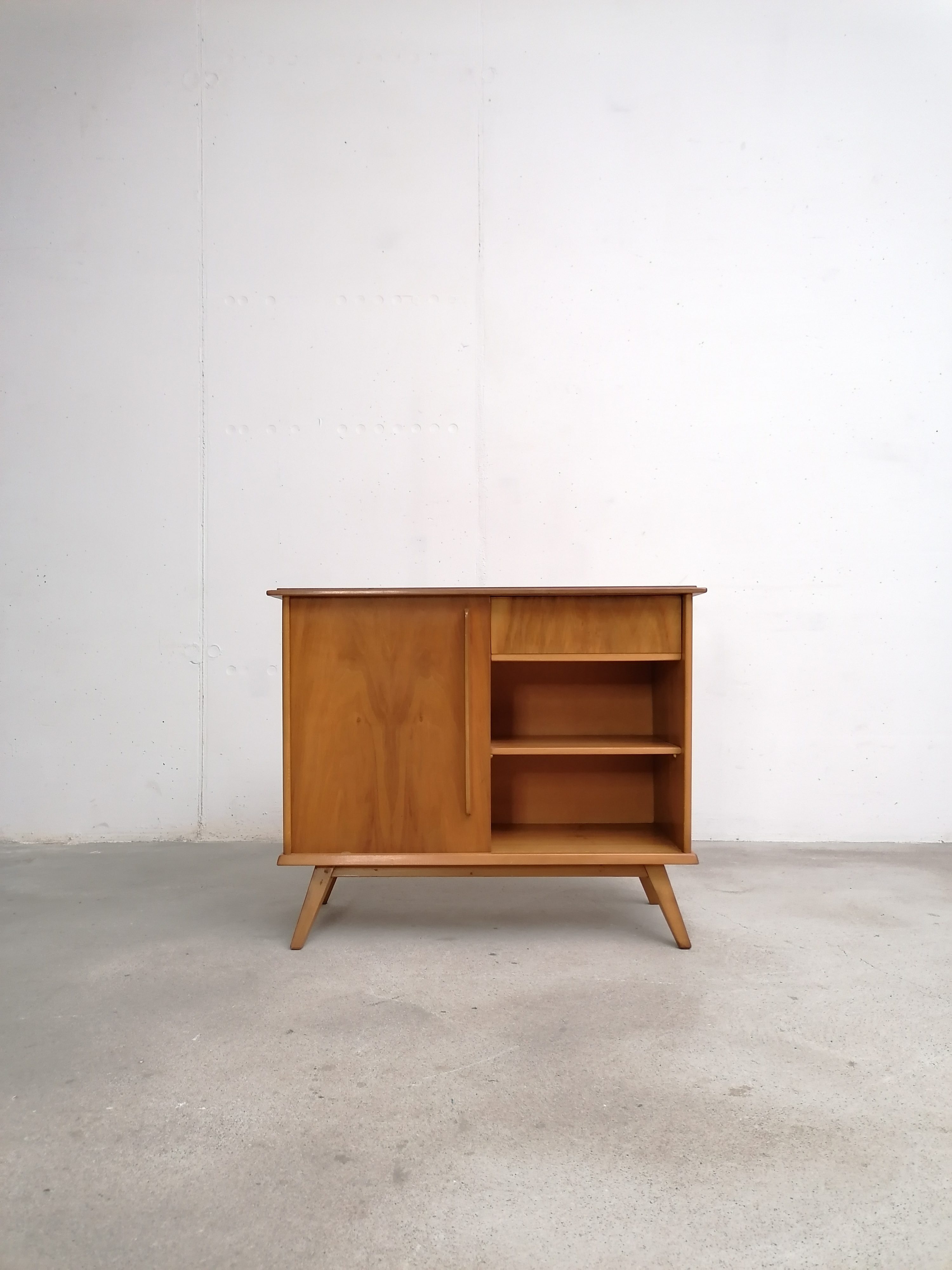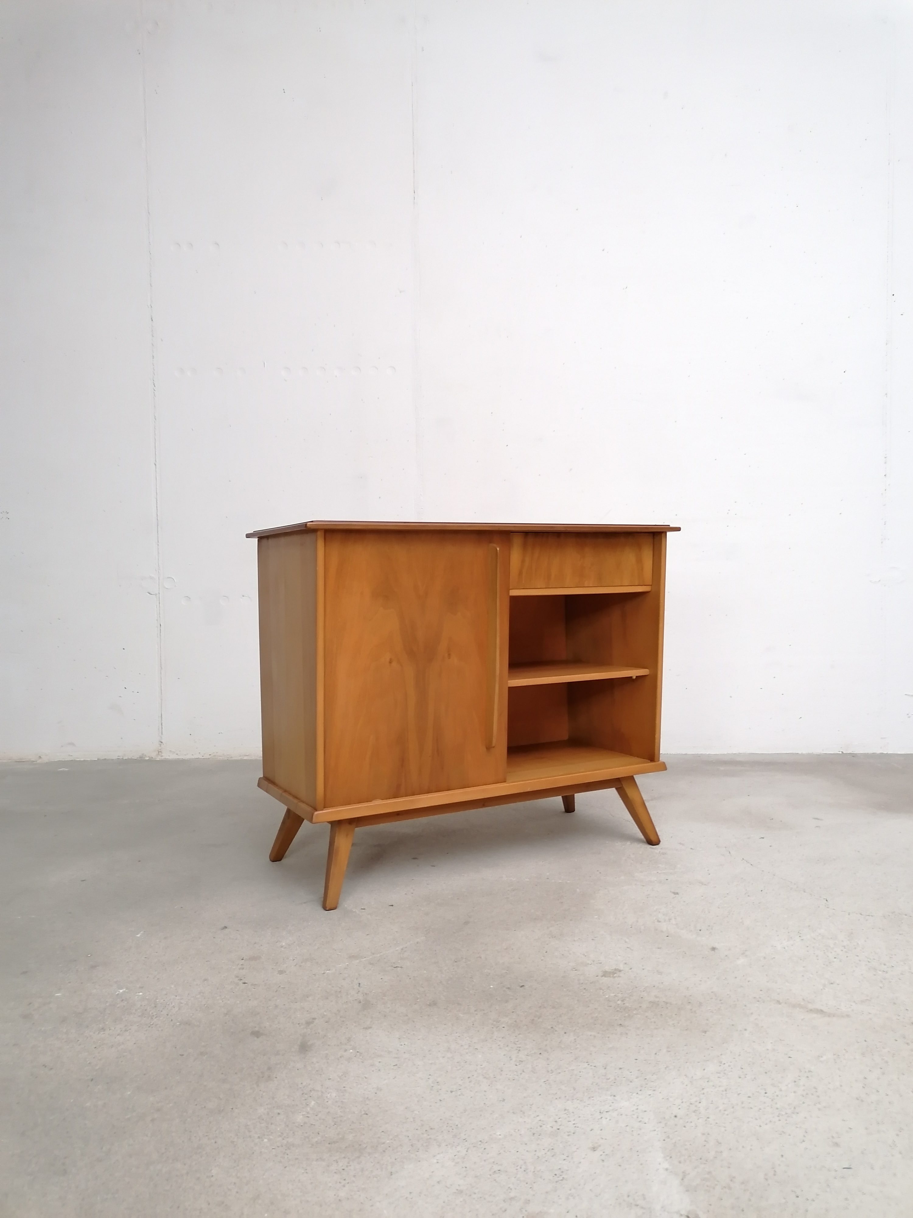 Produit venduMeuble de rangement vintage en bois avec porte coulissante et élégant piètement. Un tiroir et deux étagères complètent ce petit meuble de rangement vintage que grâce à ses dimensions peut trouver facilement place dans une entrée et dans d’autres petites pièces.