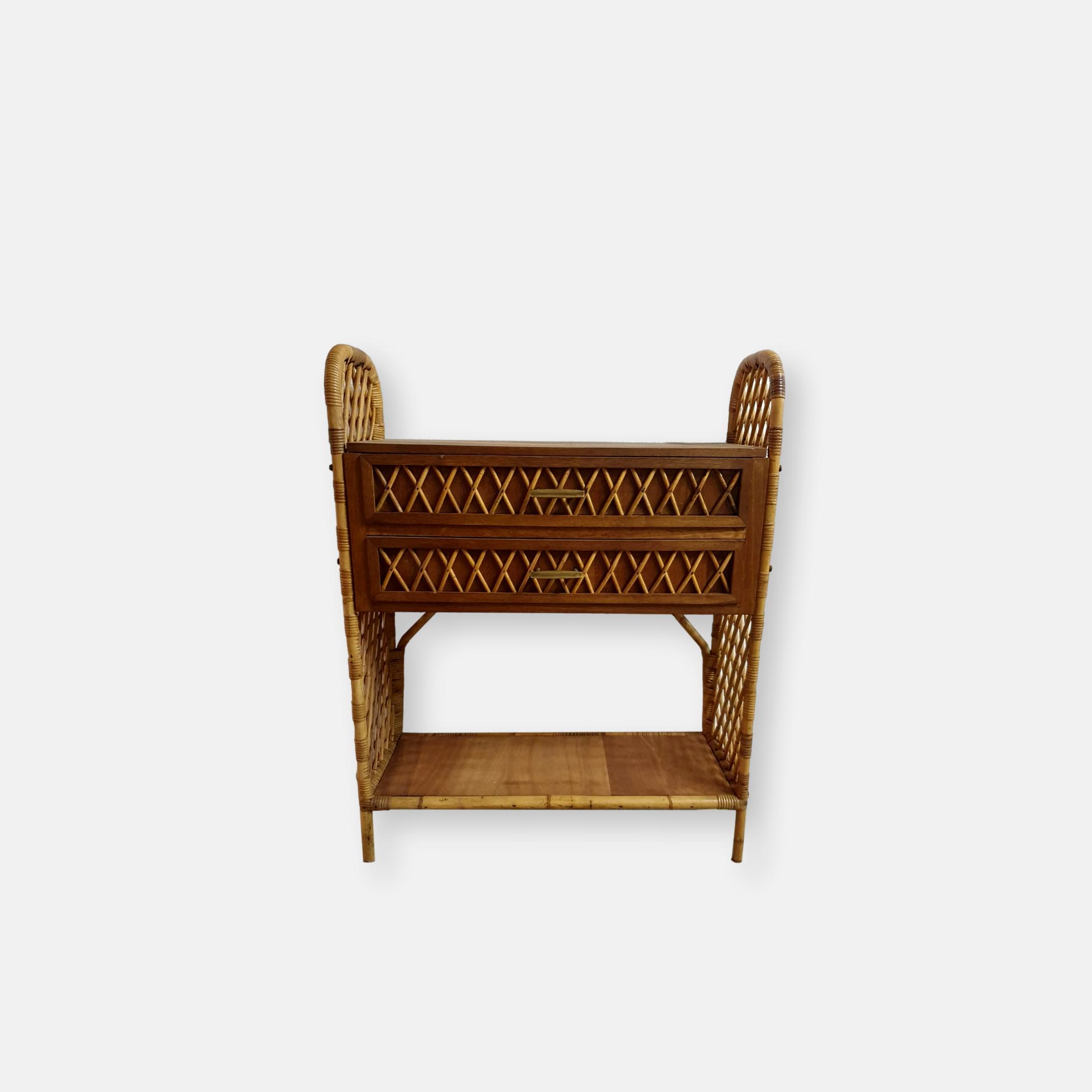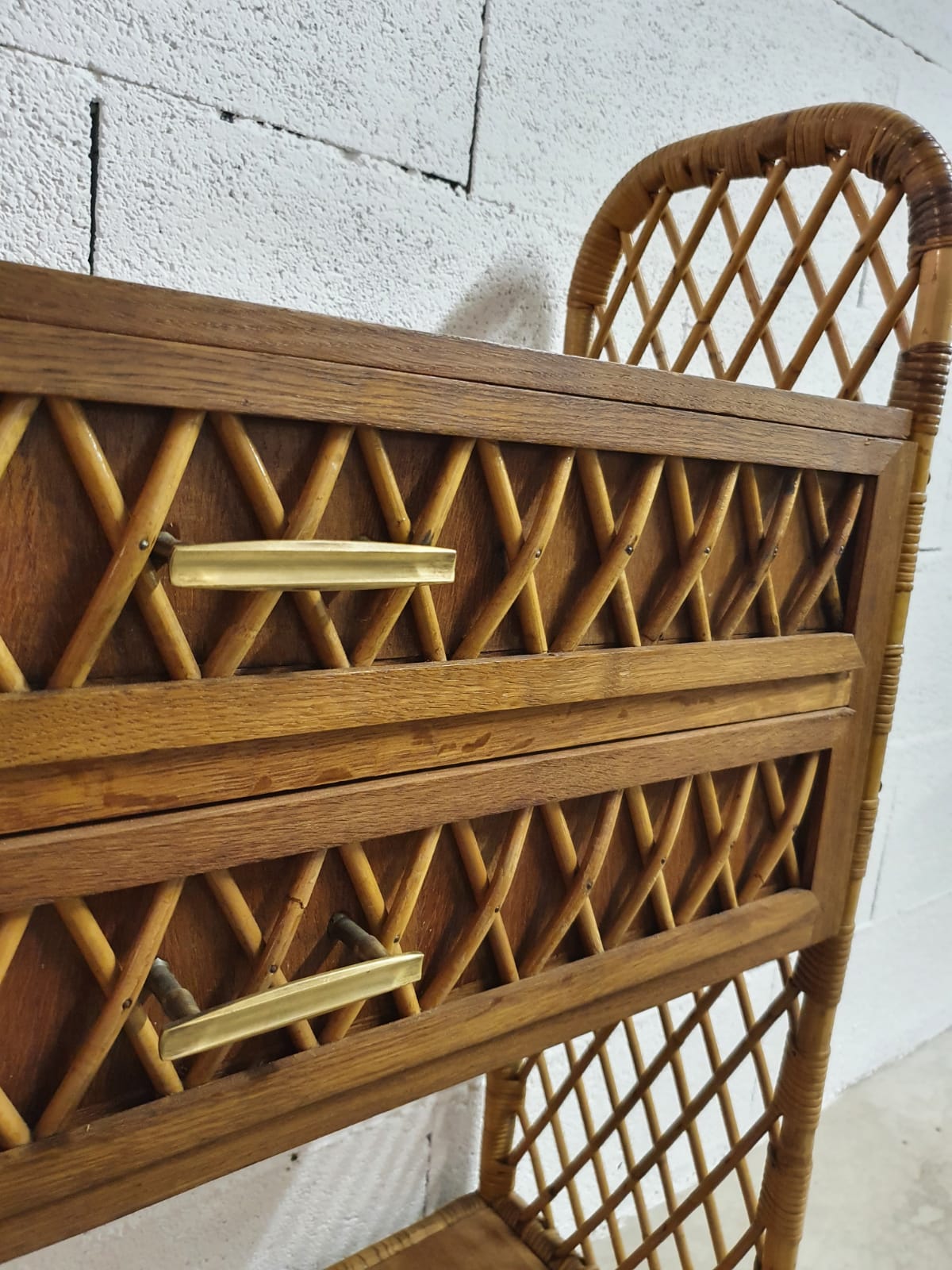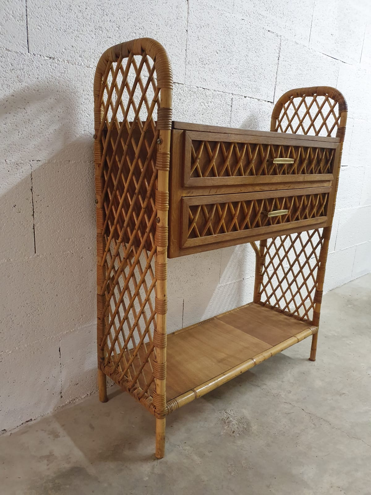 Produit venduMeuble étagère en rotin des années 60. Avec deux tiroirs et un plateau inférieur.