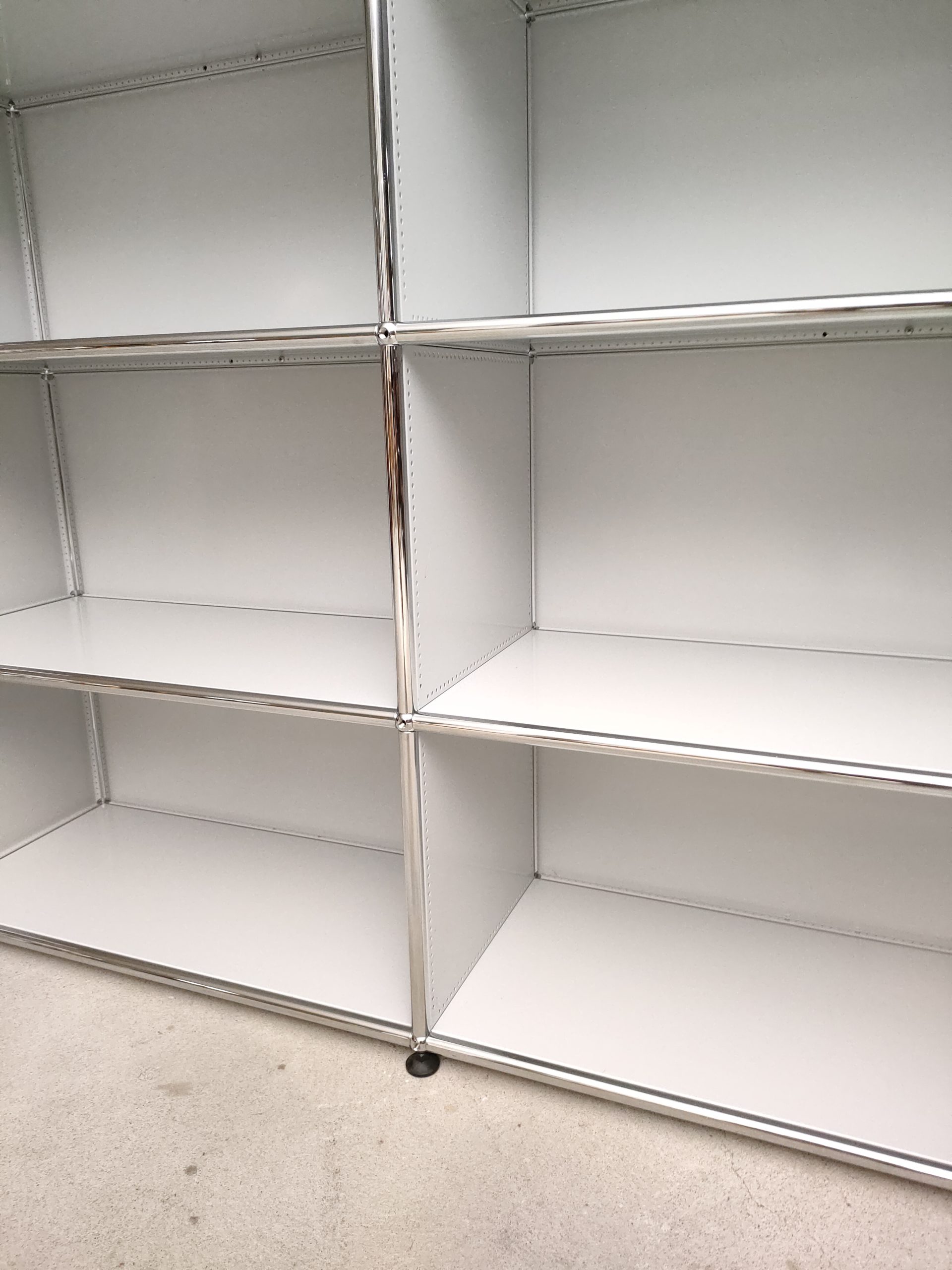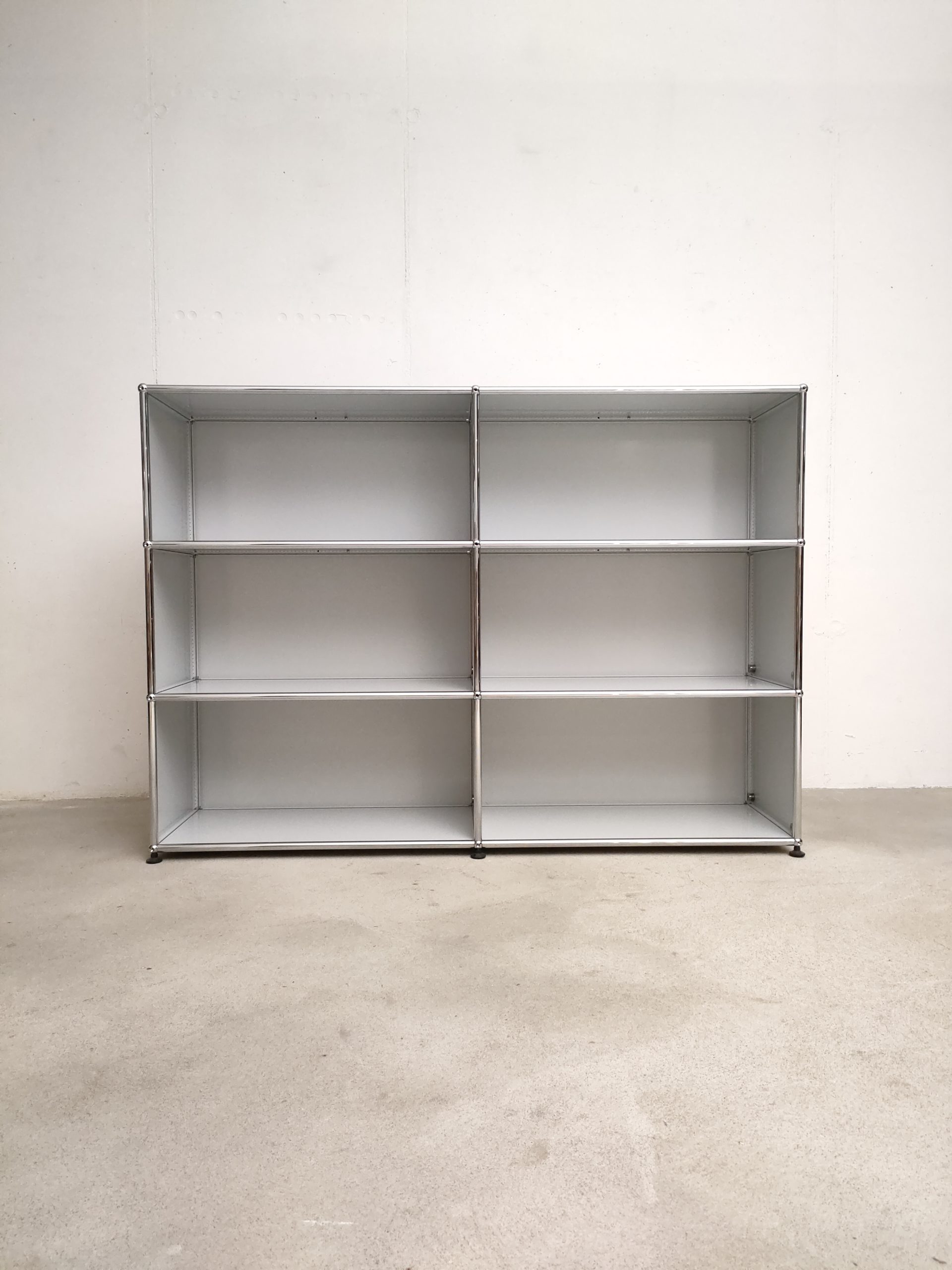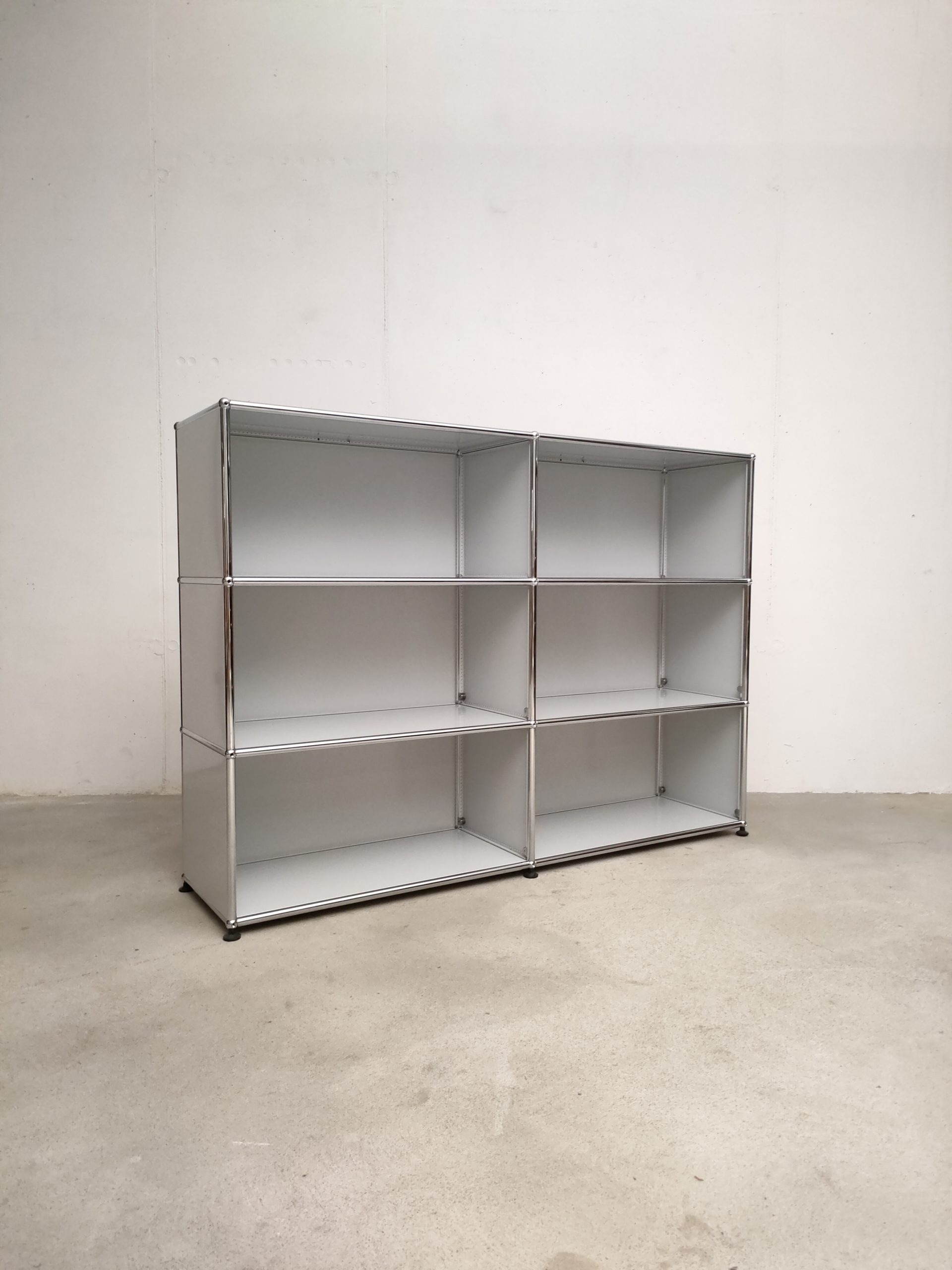 Produit venduSystème de rangement USM dessiné par Fritz Haller & Paul Schärer doté de 6 compartiments ouverts. Structure en acier chromé et métal laqué de couleur blanc-gris. Stable et solide et parfaitement fonctionnel.