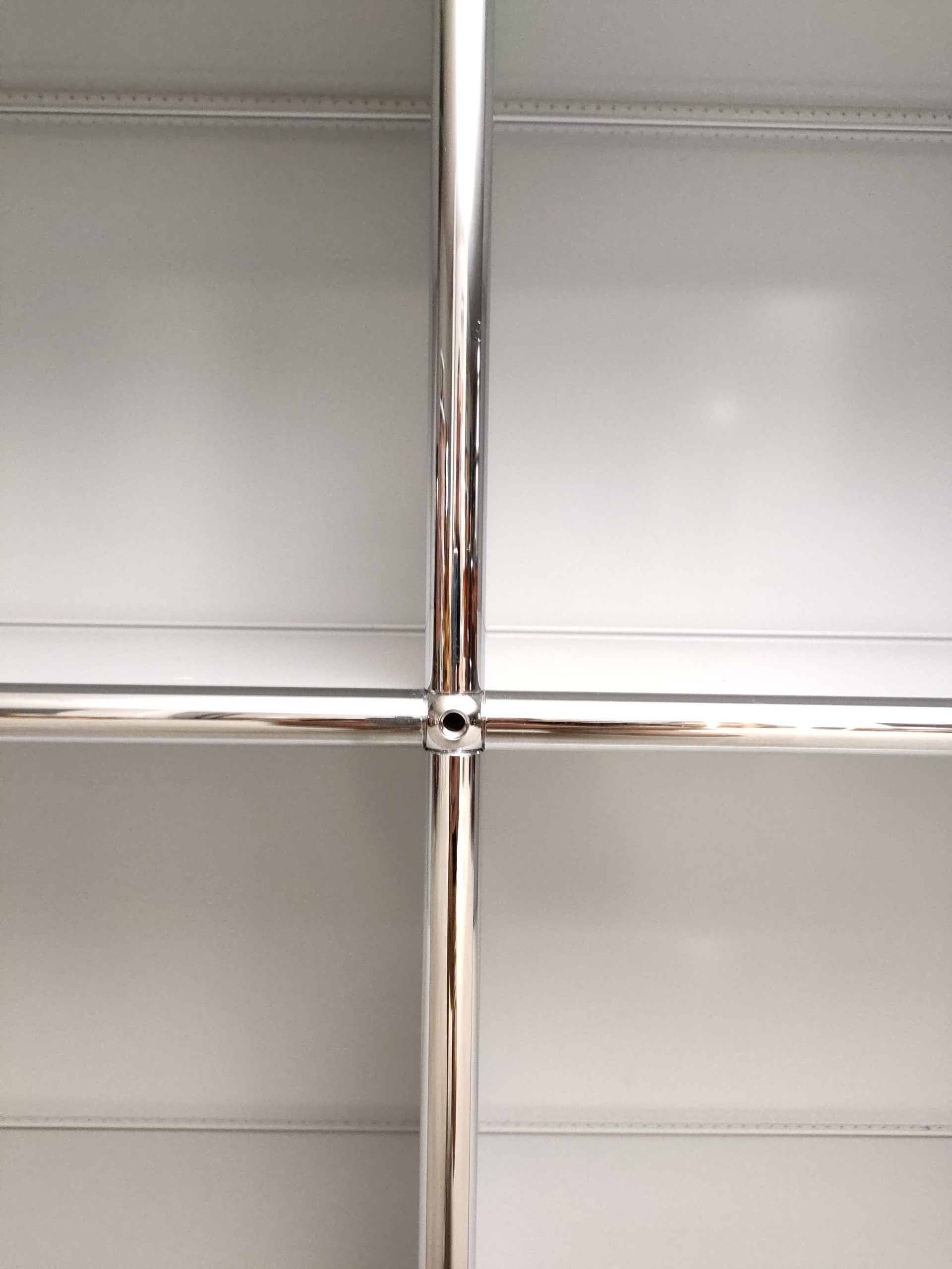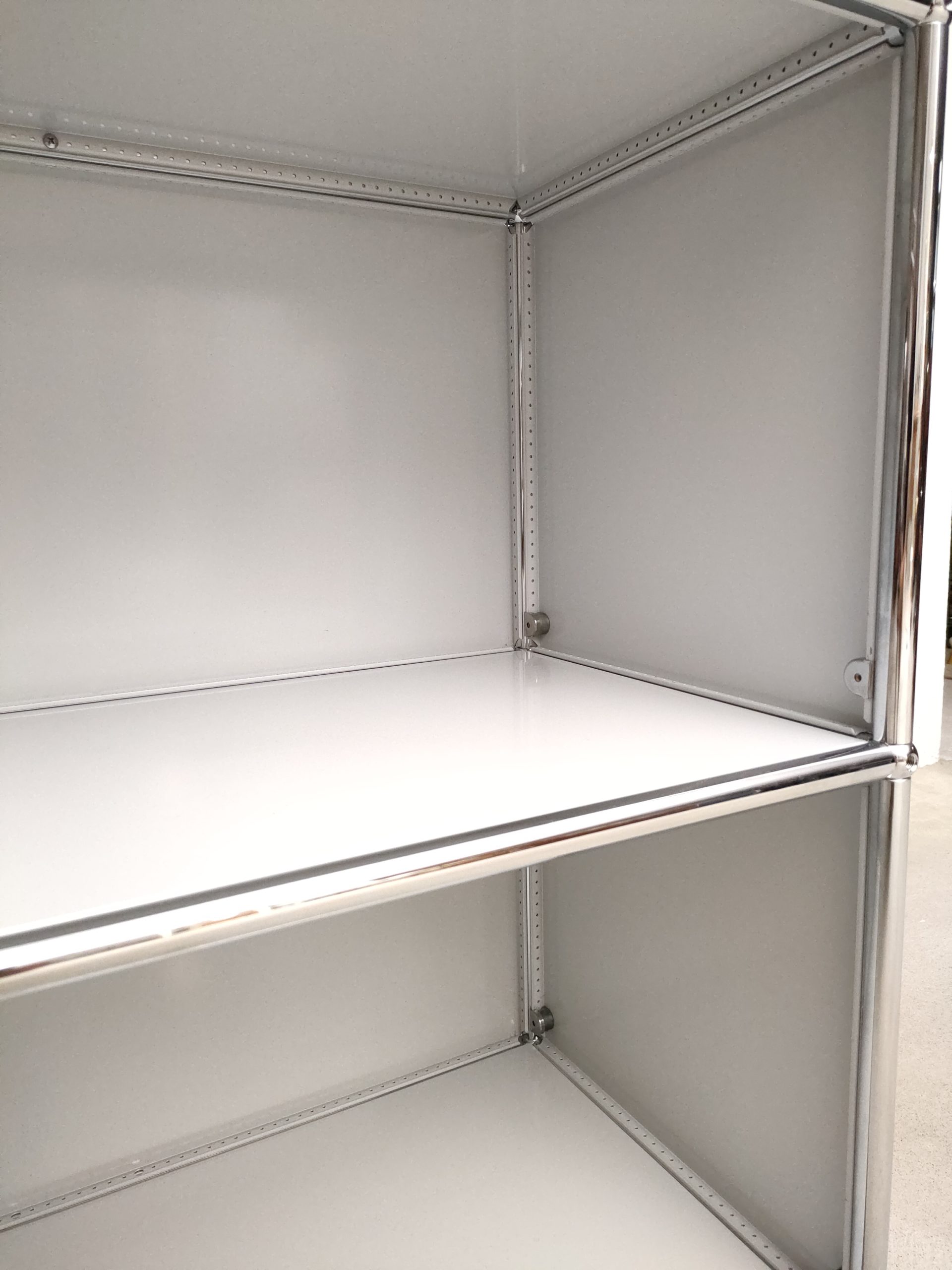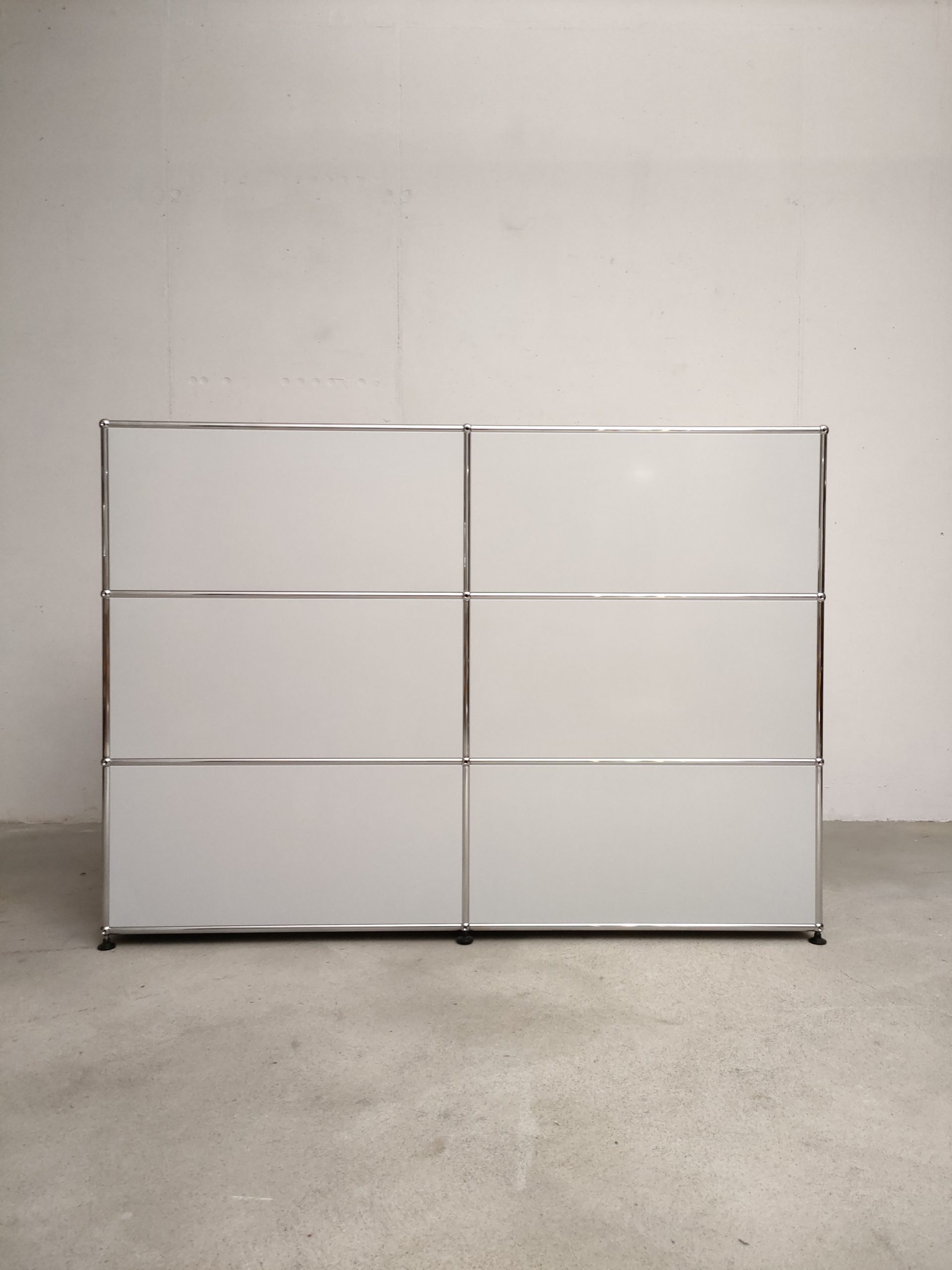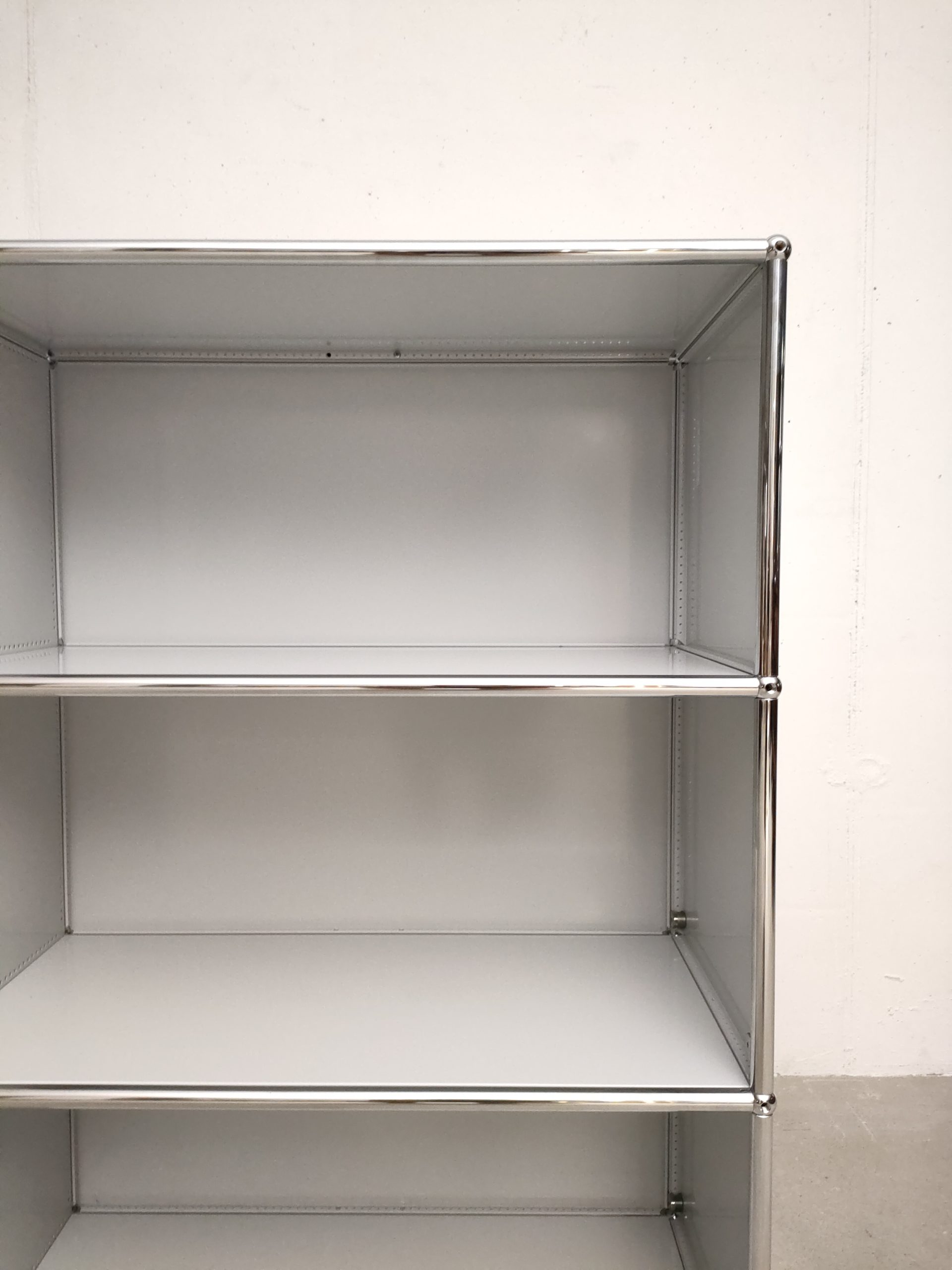 Produit venduSystème de rangement USM dessiné par Fritz Haller & Paul Schärer doté de 6 compartiments ouverts. Structure en acier chromé et métal laqué de couleur blanc-gris. Stable et solide et parfaitement fonctionnel.