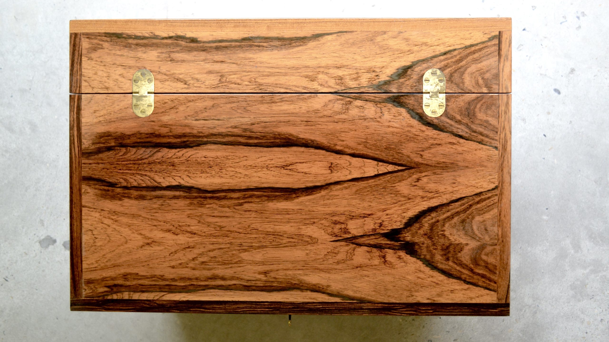 Trapu, ludique mais raffiné, ce meuble cubique fourmille de détails. On remarquera les assemblages à queues droites sur la porte, le choix du laiton pour les charnières se mariant à merveille avec sa robe palissandre, ou encore le petit tapis vert qui accueille whisky, cognac et rhum d’au moins 20 ans d’âge, précisons le !