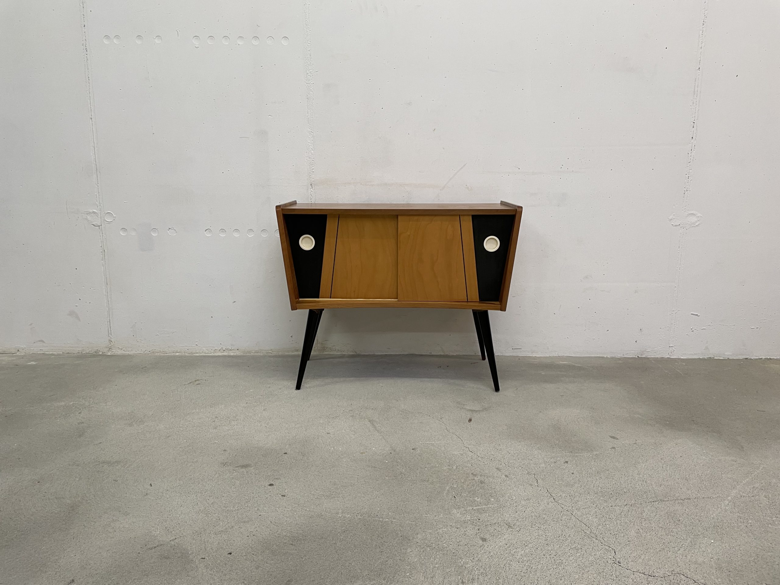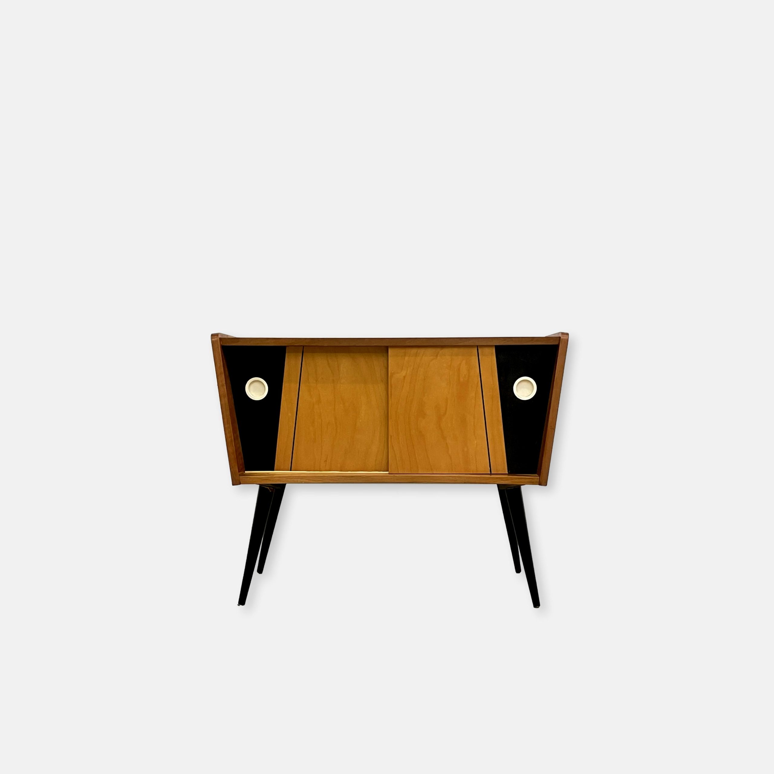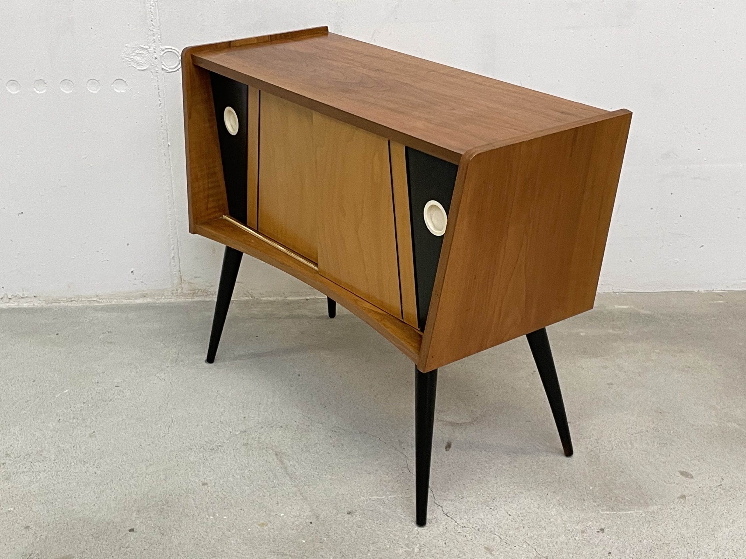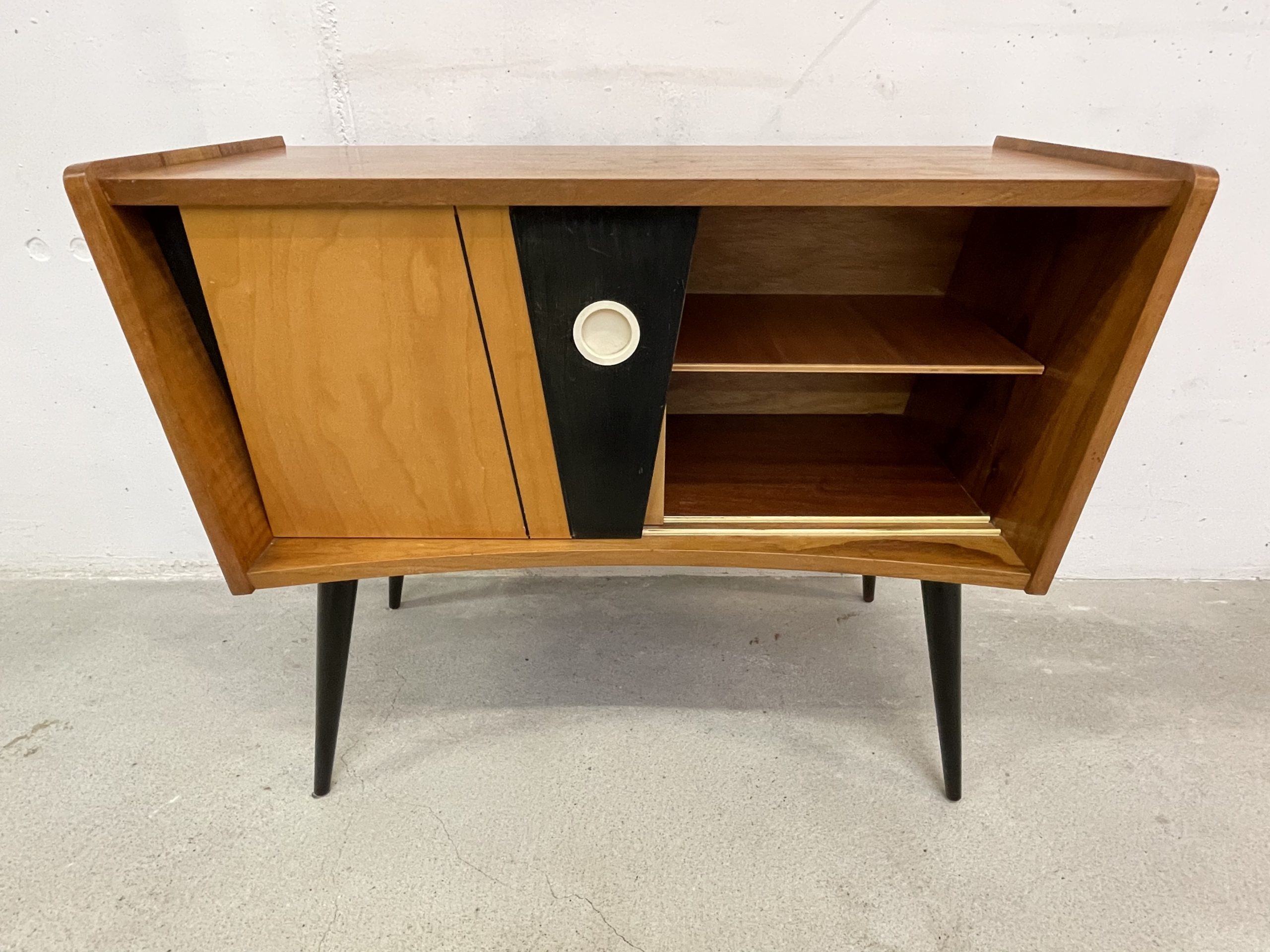 Produit venduPetite commode de fabrication allemande datée de 1959 aux formes typiques de l’époque. Les portes sont coulissantes et ouvrent sur un (très) petit espace de rangement avec un tablar. Elles sont en partie peintes en noir.