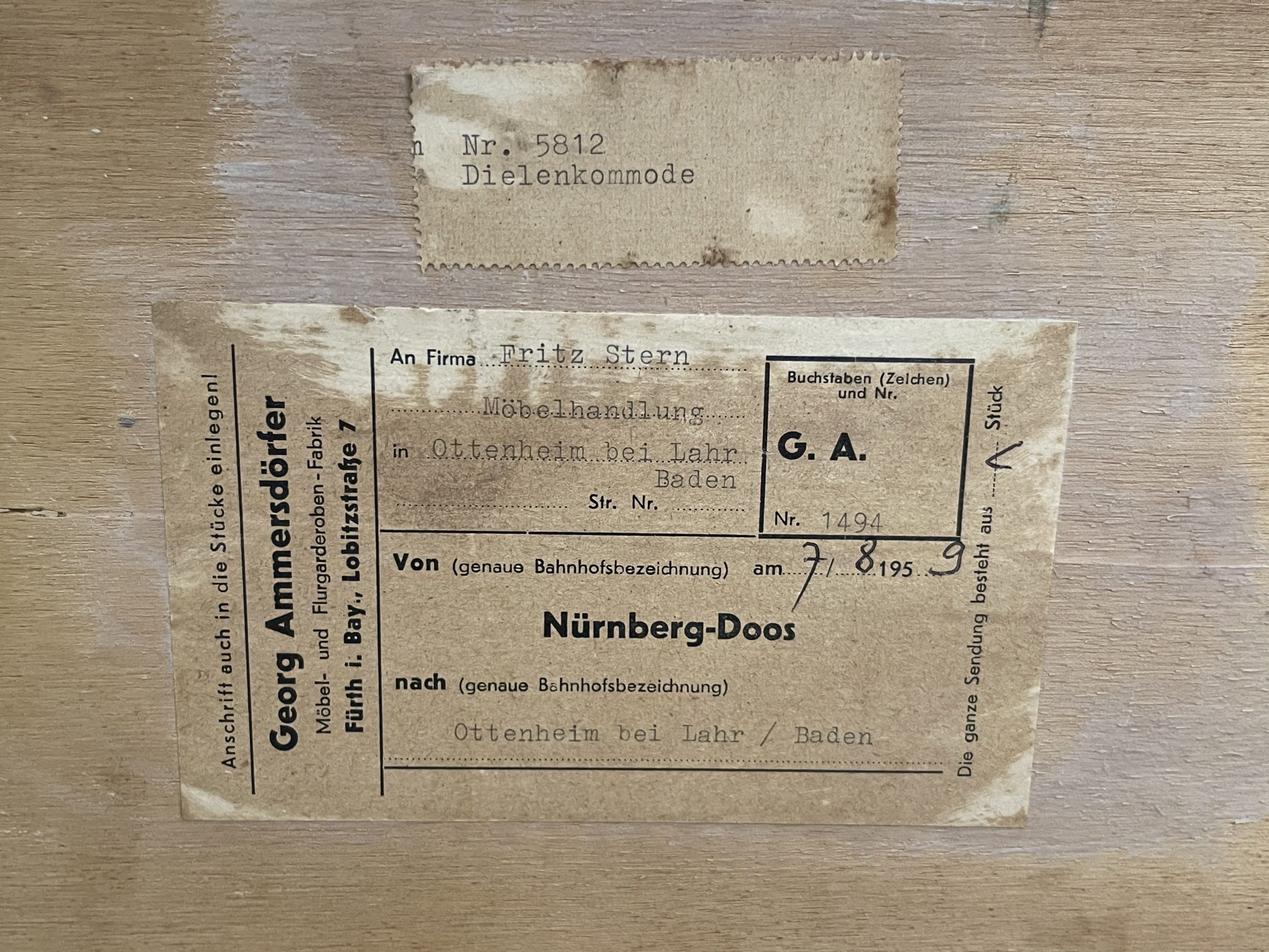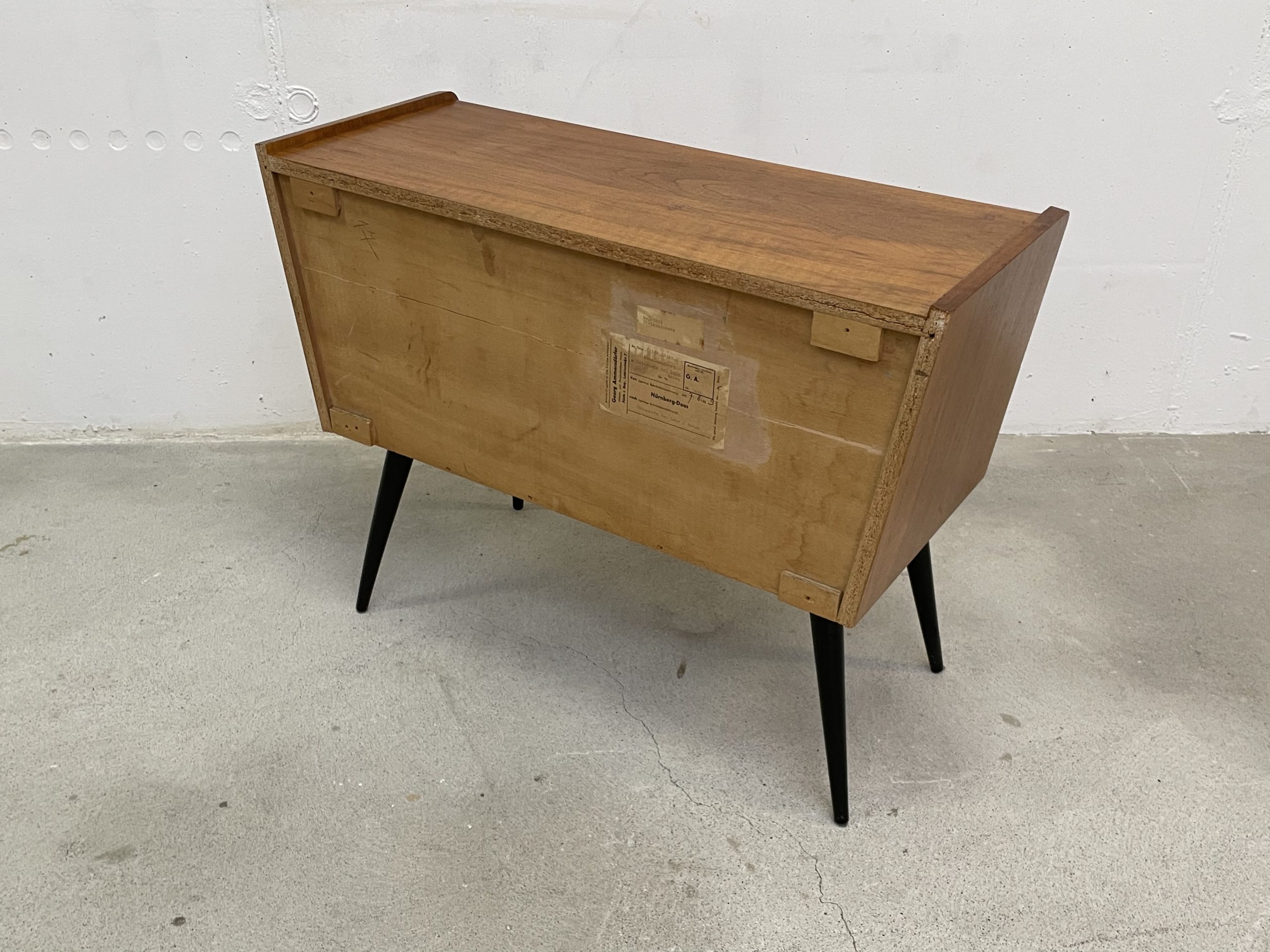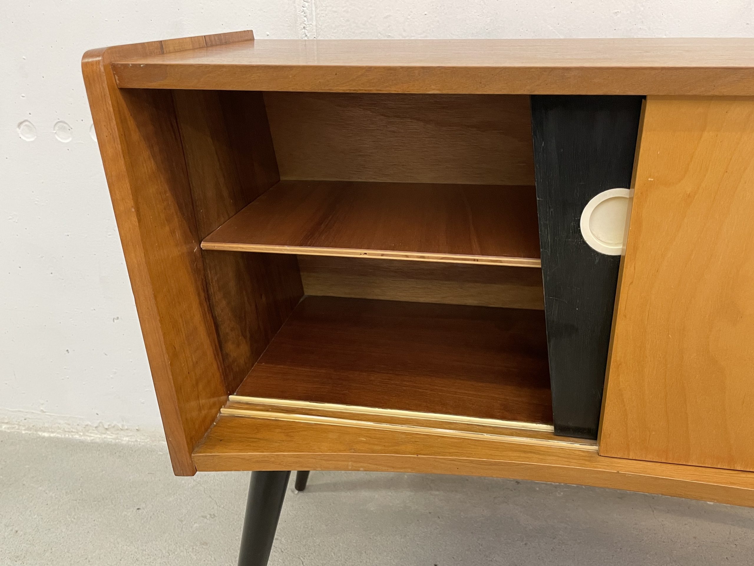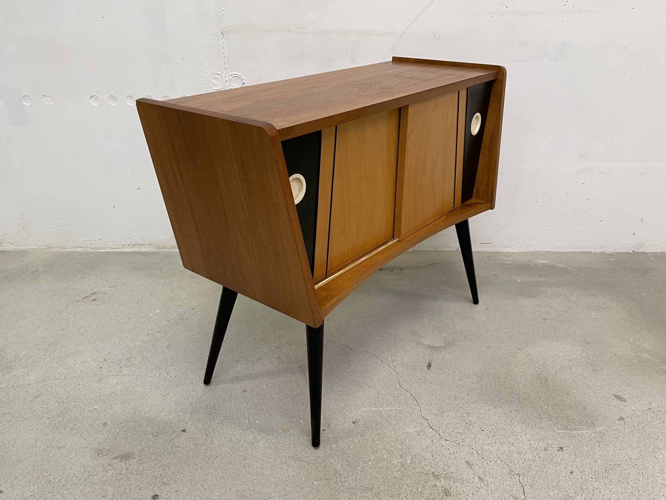 Produit venduPetite commode de fabrication allemande datée de 1959 aux formes typiques de l’époque. Les portes sont coulissantes et ouvrent sur un (très) petit espace de rangement avec un tablar. Elles sont en partie peintes en noir.