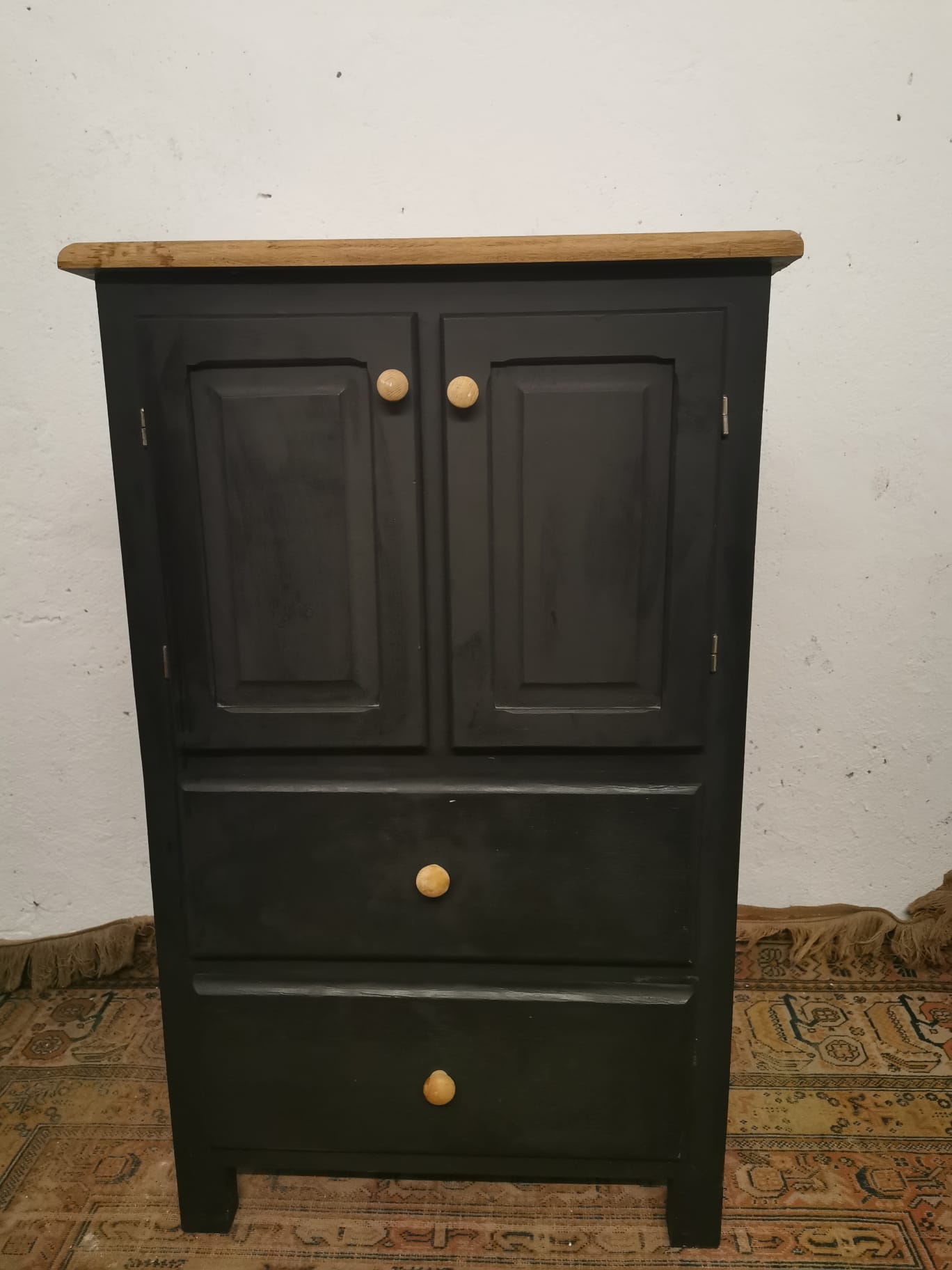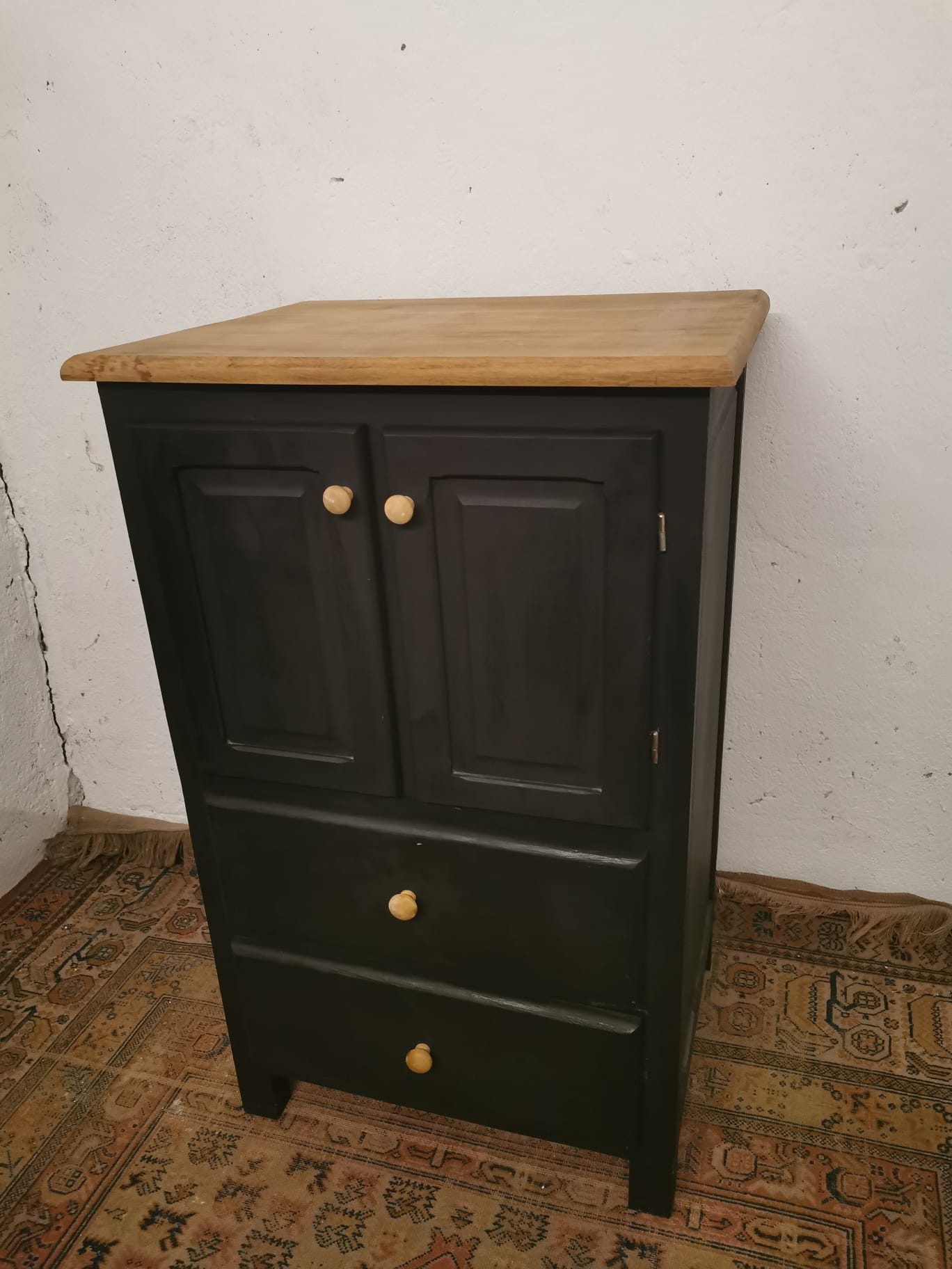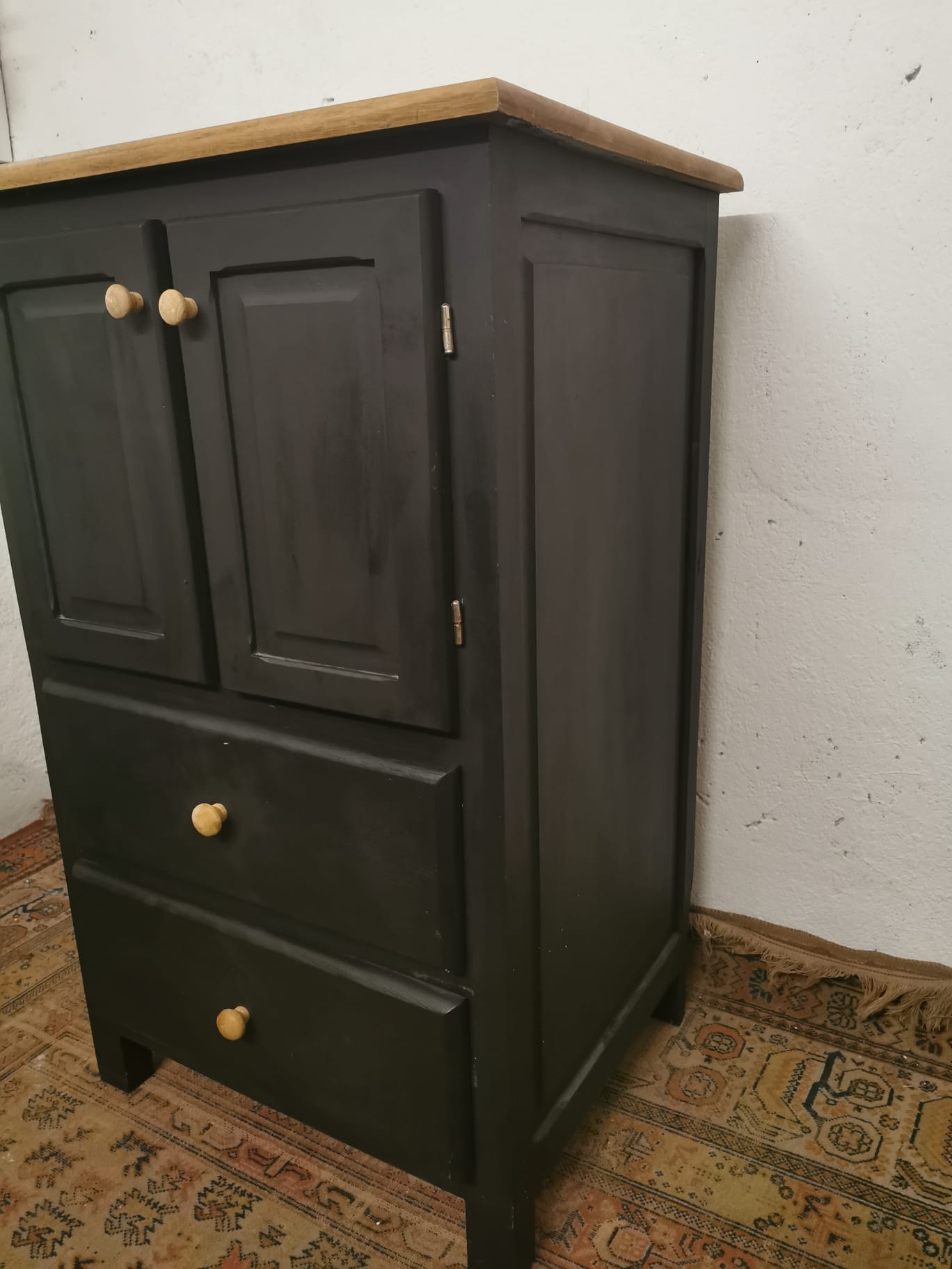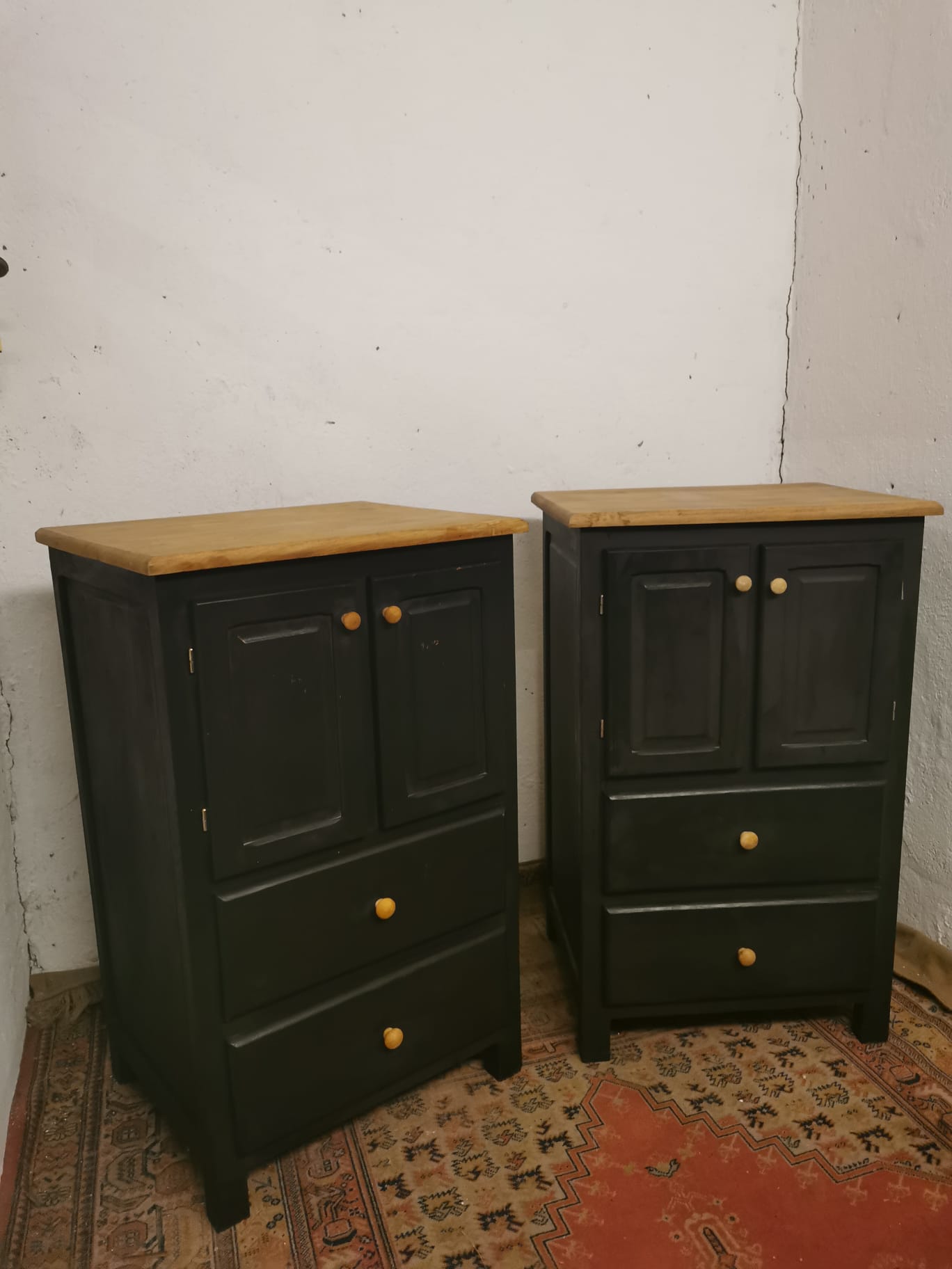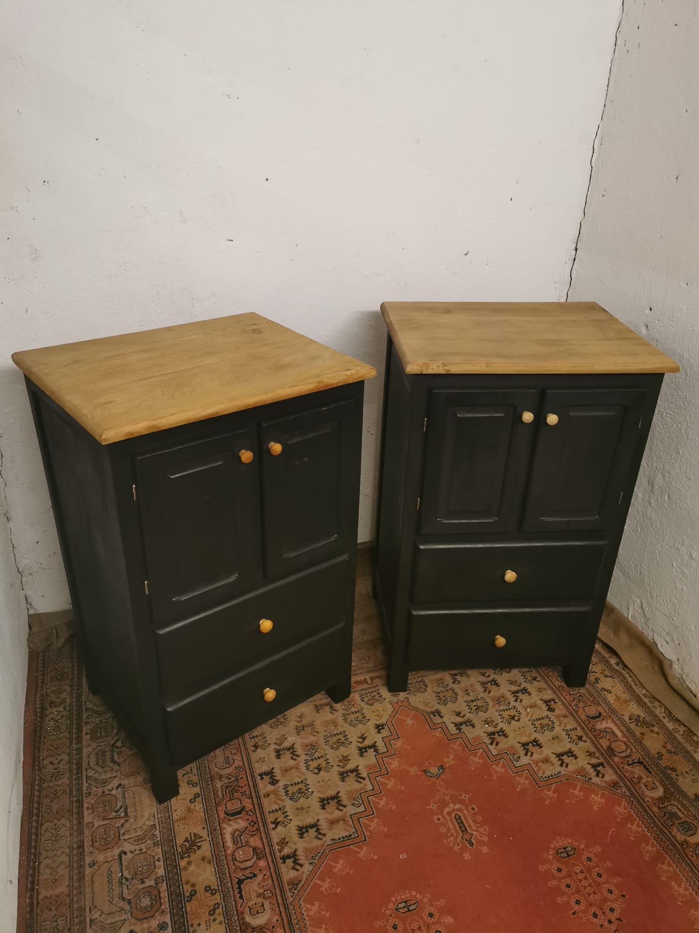 Deux anciens meubles en chêne massif relookés en noir avec 2 tiroirs et un espace placard avec 2 portes.