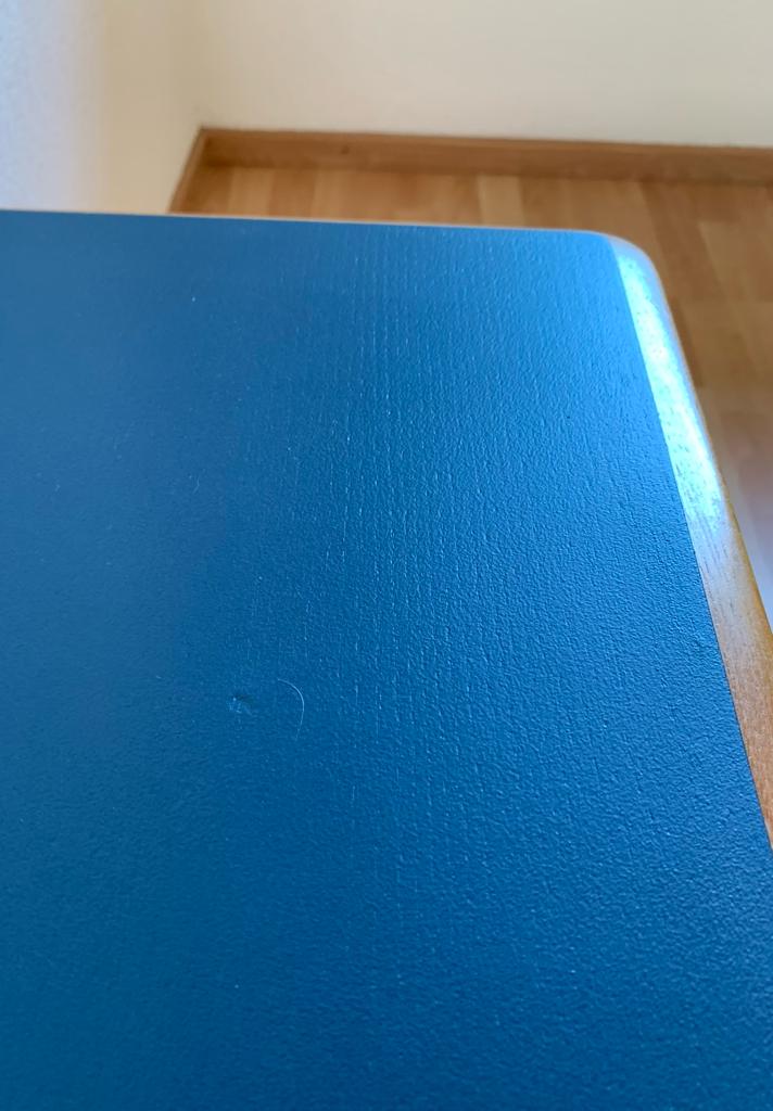 Les plateaux sont recouverts d’une peinture bleu foncé. De légères marques sont visibles sur le bord des plateaux ainsi que sur les plateaux peints (voir les deux dernières photos)