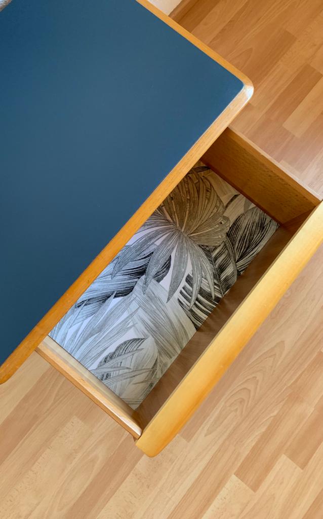 L’intérieur des rangements est recouvert d’un papier végétal noir et blanc.