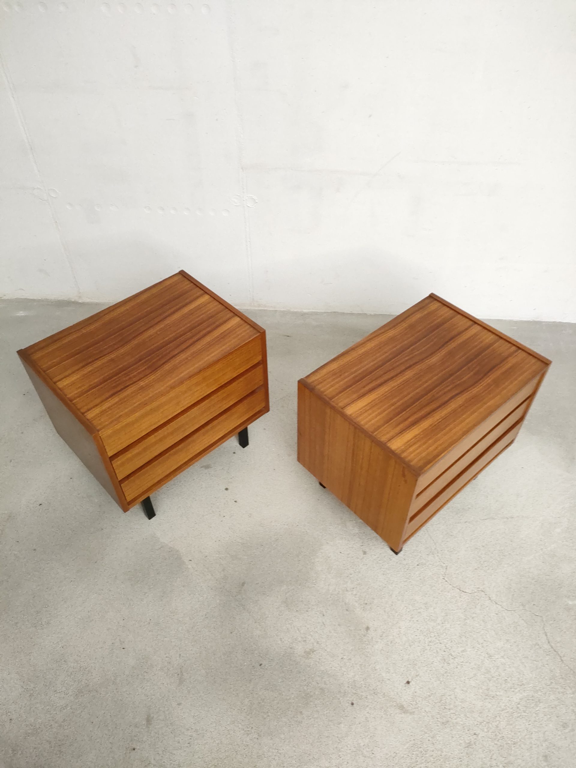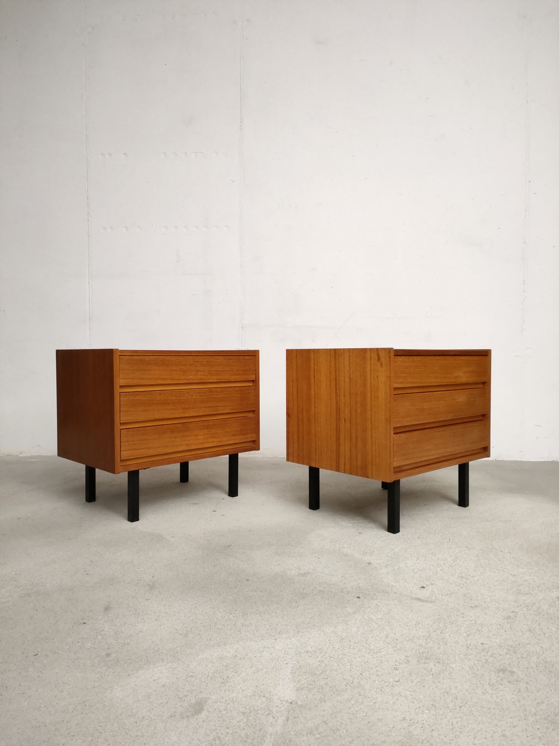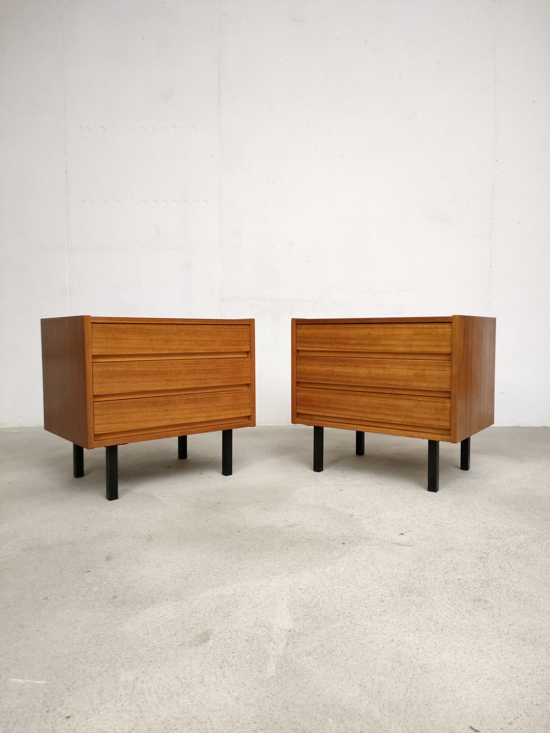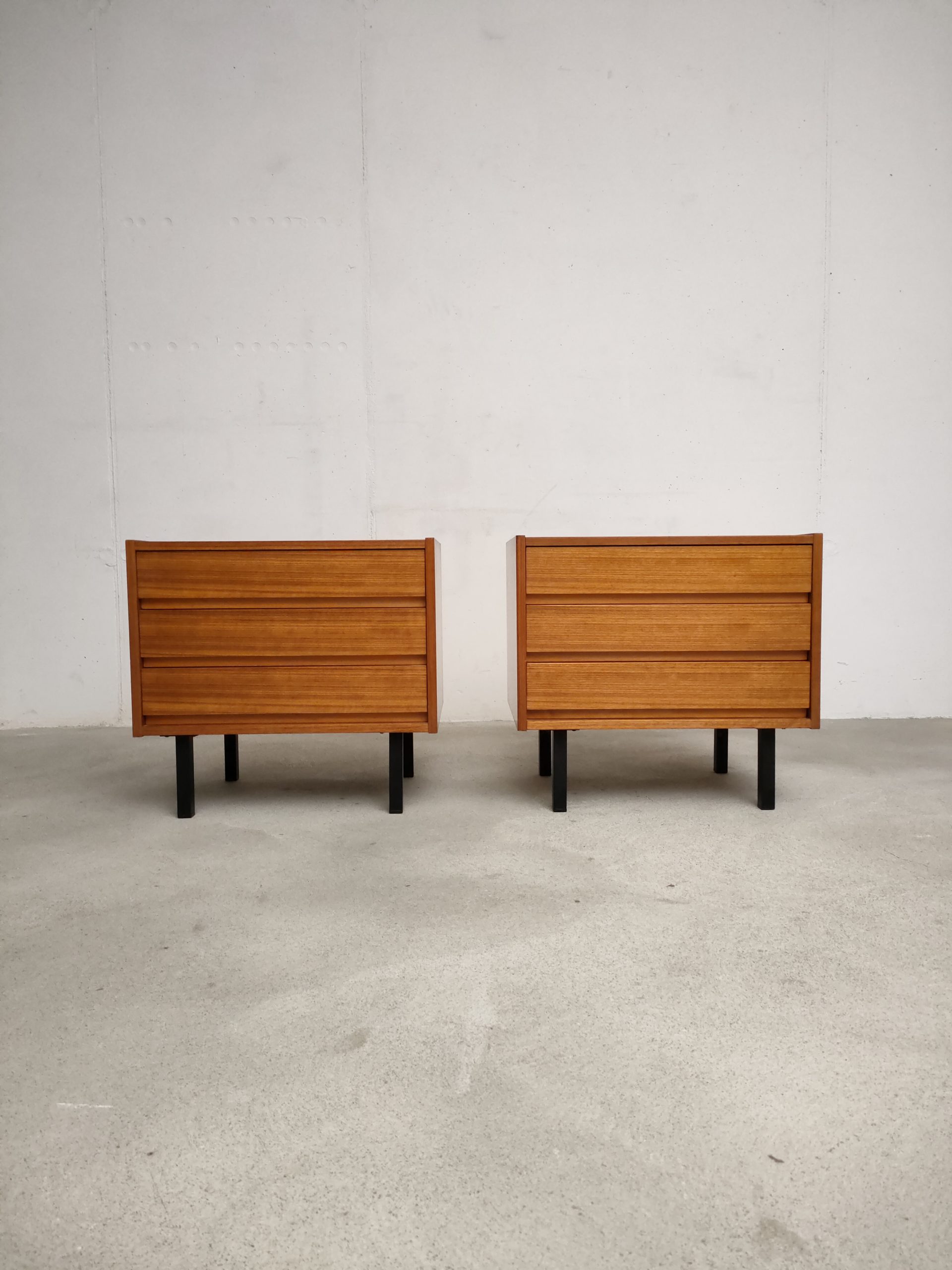 Produit venduPaire de tables de nuit vintage en bois avec pieds en métal noirs et 3 tiroirs. Quelques traces sont présentes sur le bois (voir photos). Elles sont stables et solides et très élégantes avec leurs lignes minimalistes.